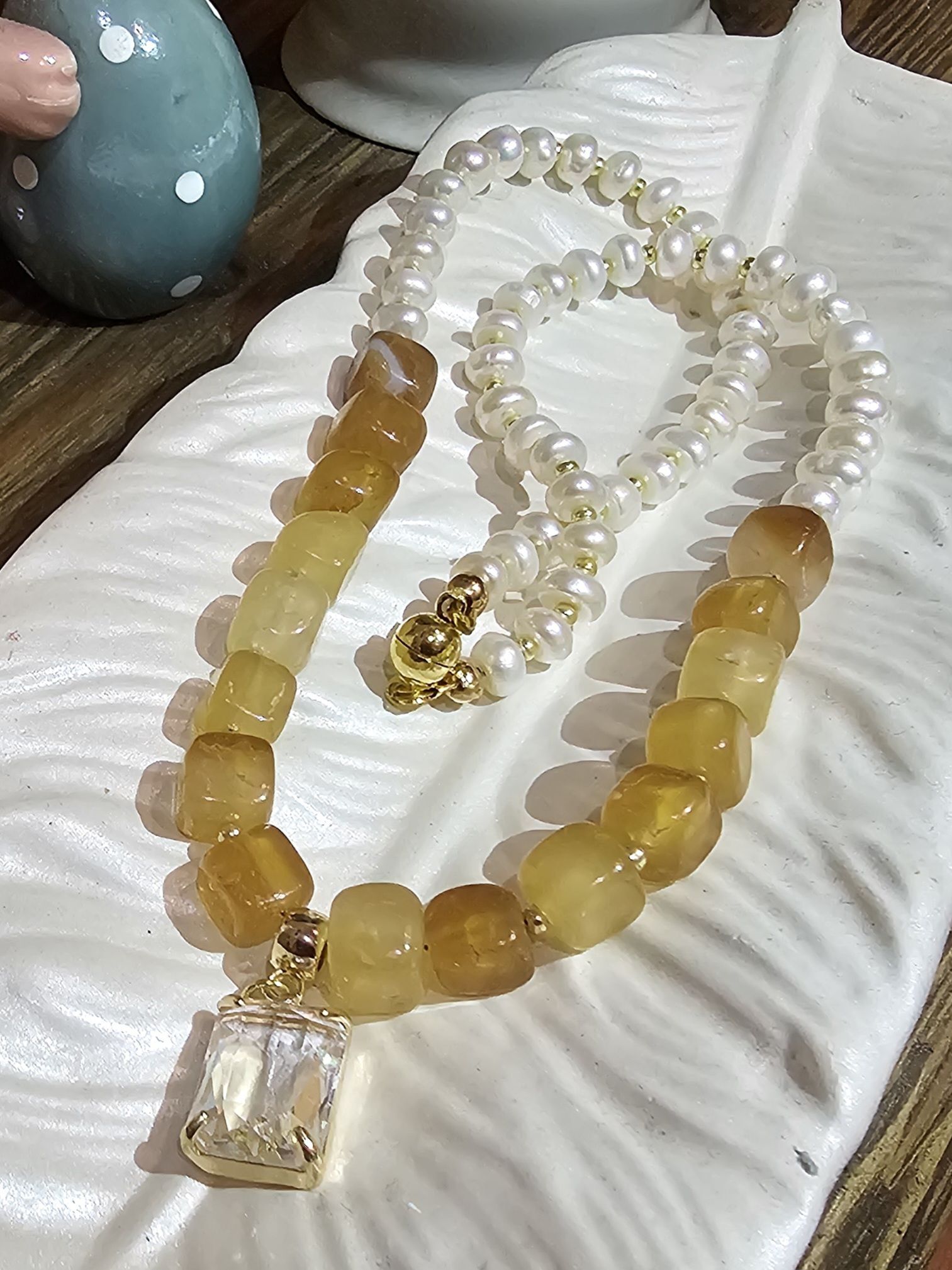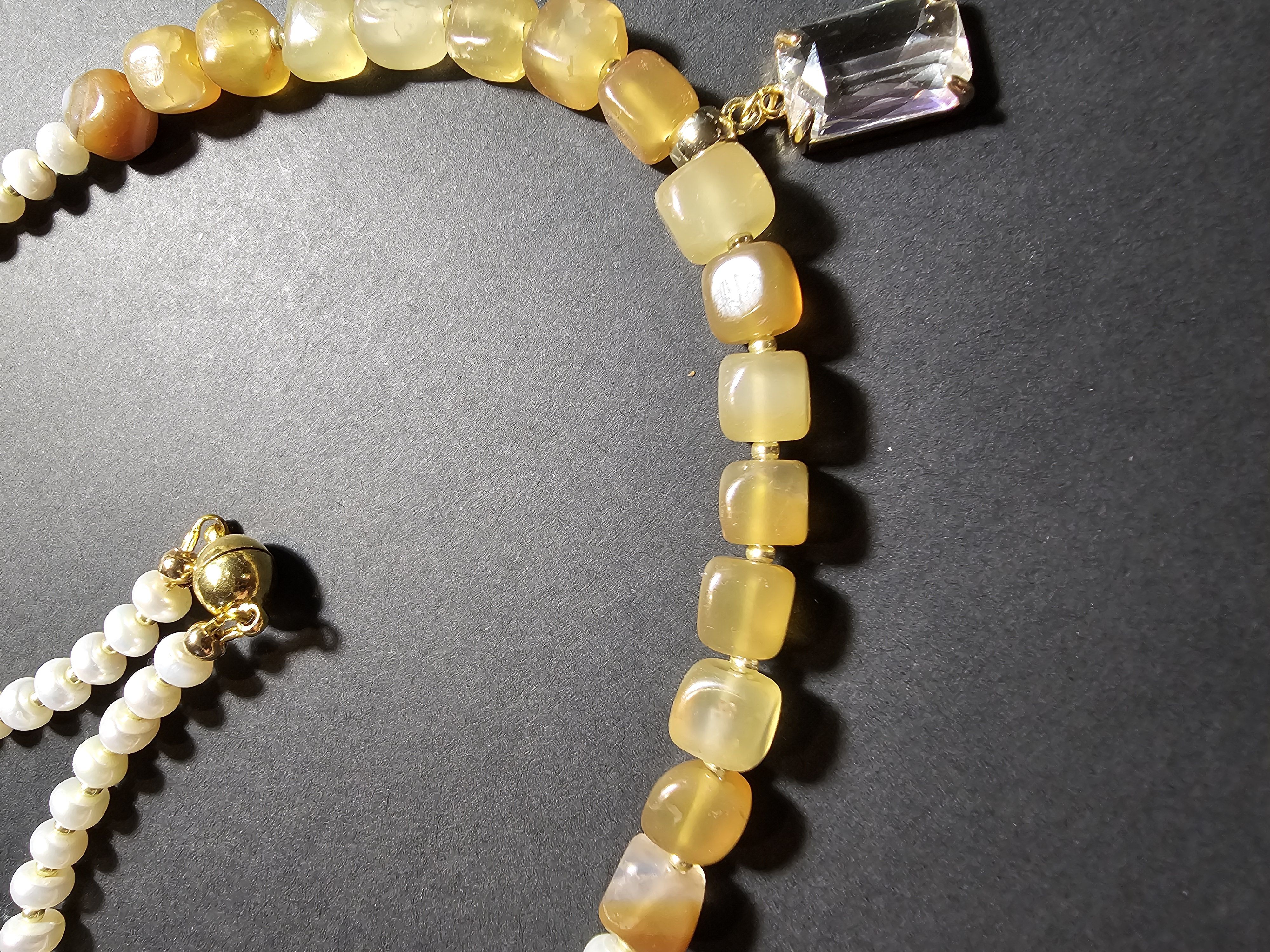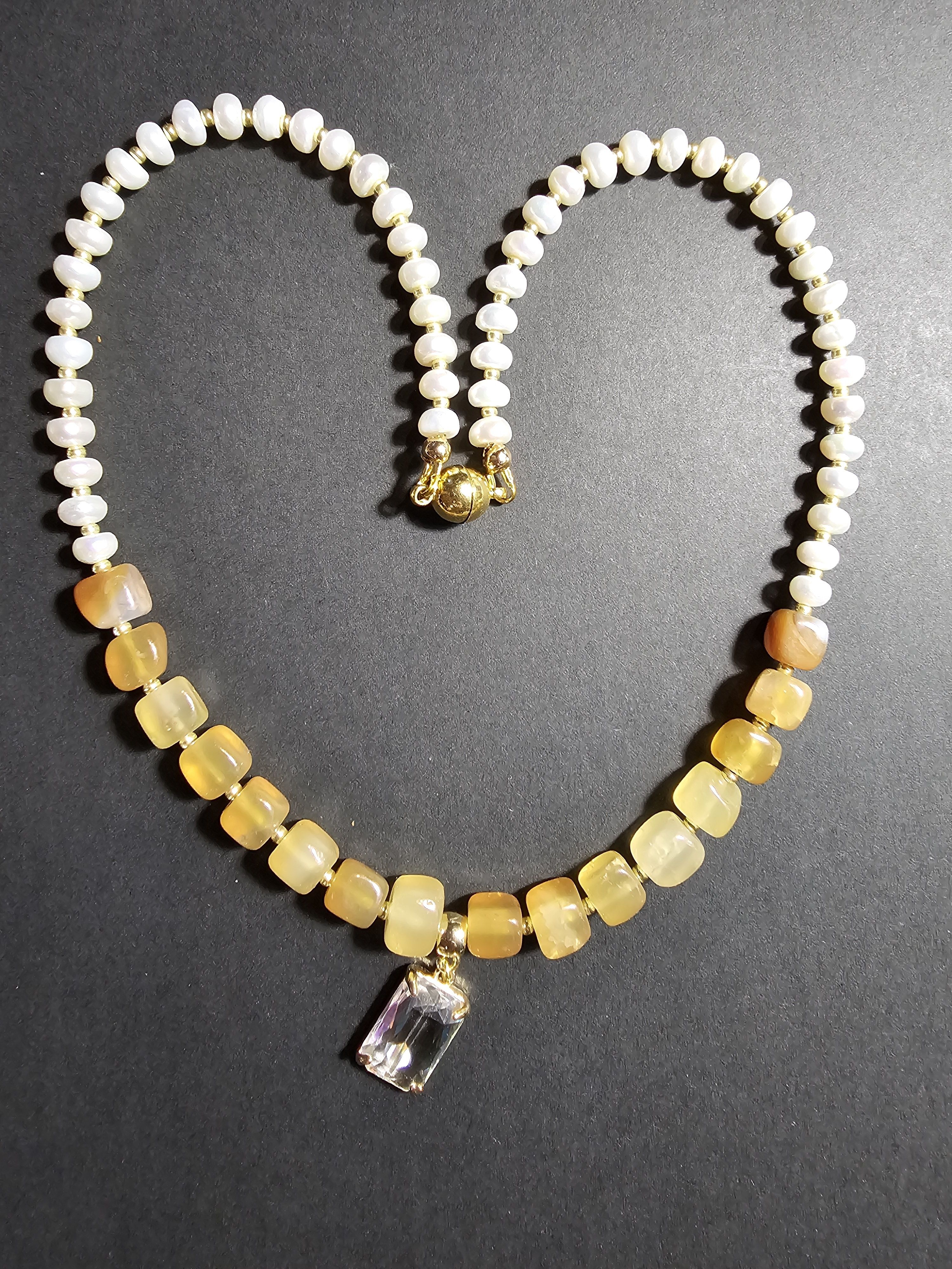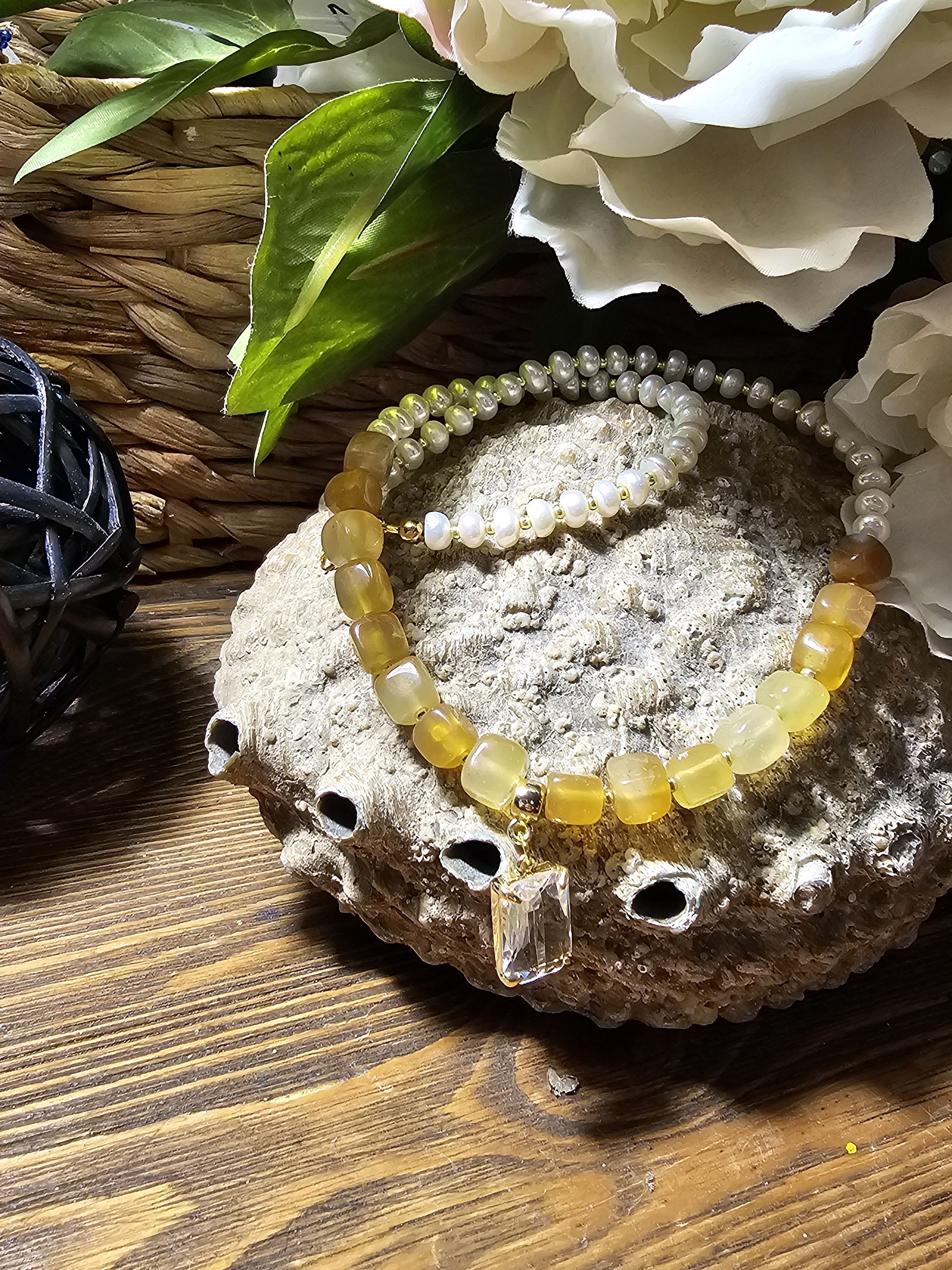 Ожерелье состоит из небольших бусин натурального жемчуга и квадратных бусин агата кракле желтого цвета, которые расположены ближе к центру. По центру ожерелья прикреплен прозрачный прямоугольный кулон, выполненный в золотистом цвете. Фурнитура ожерелья выполнена в золотистом цвете, что придает украшению особый шик.