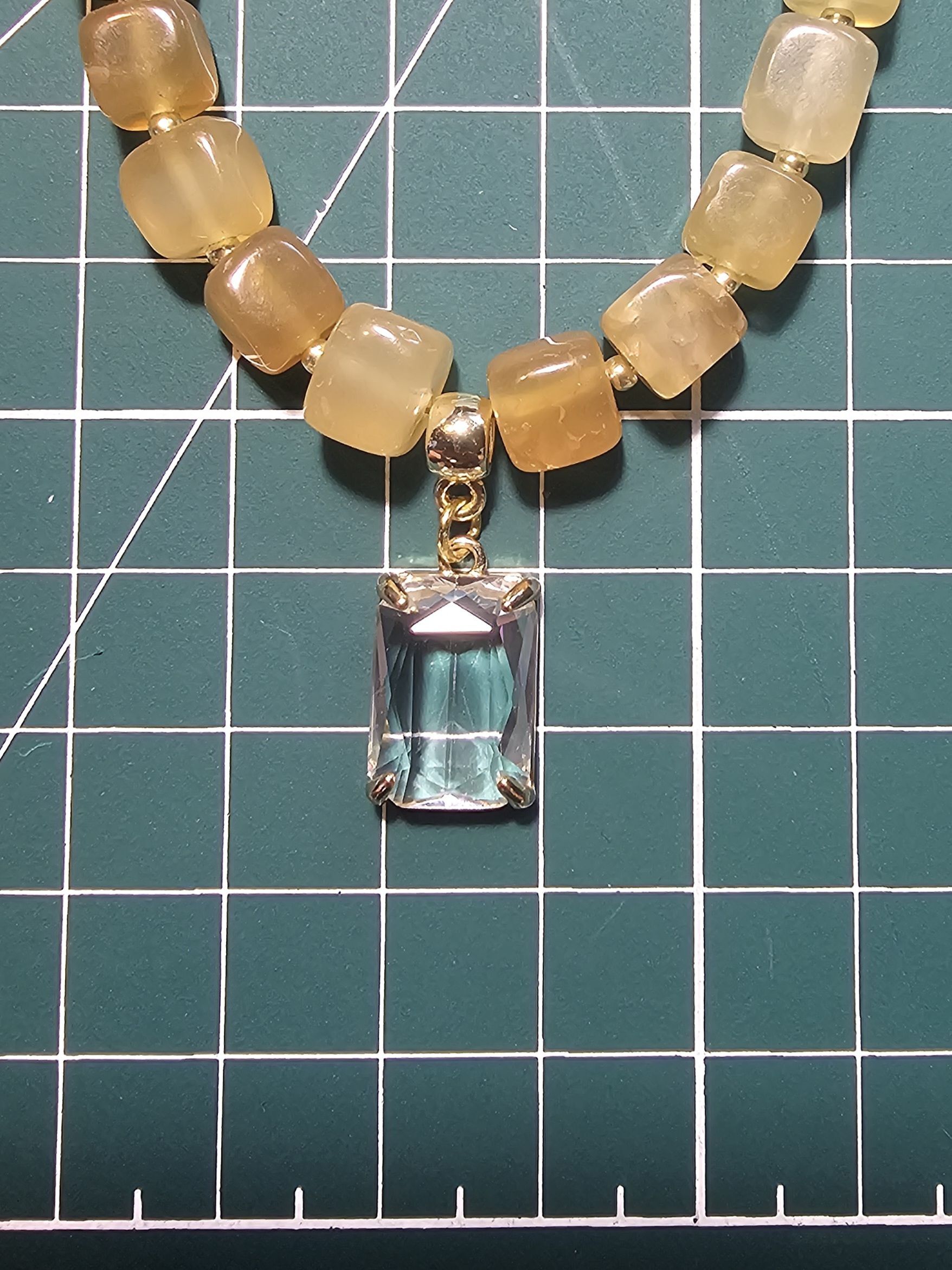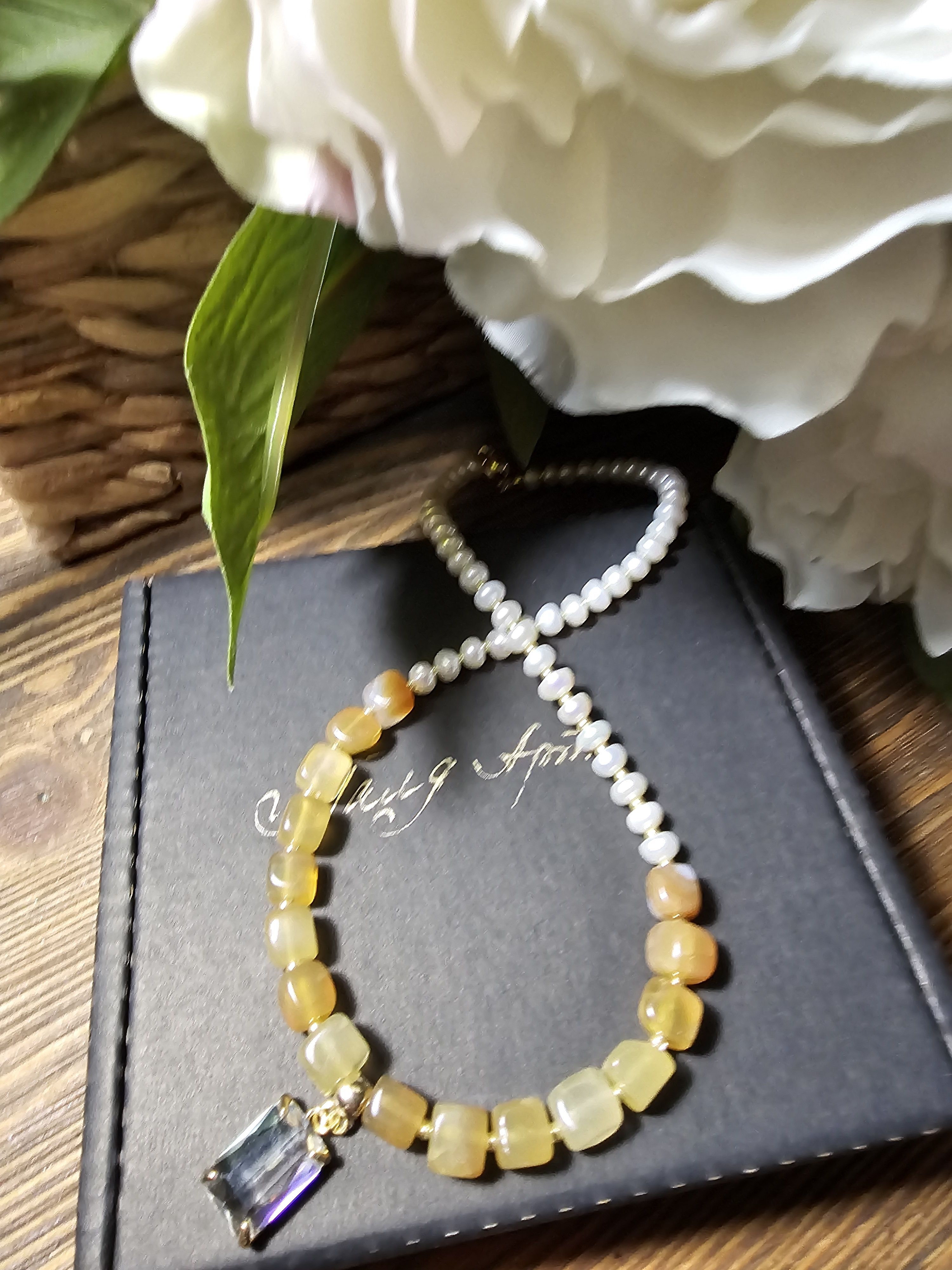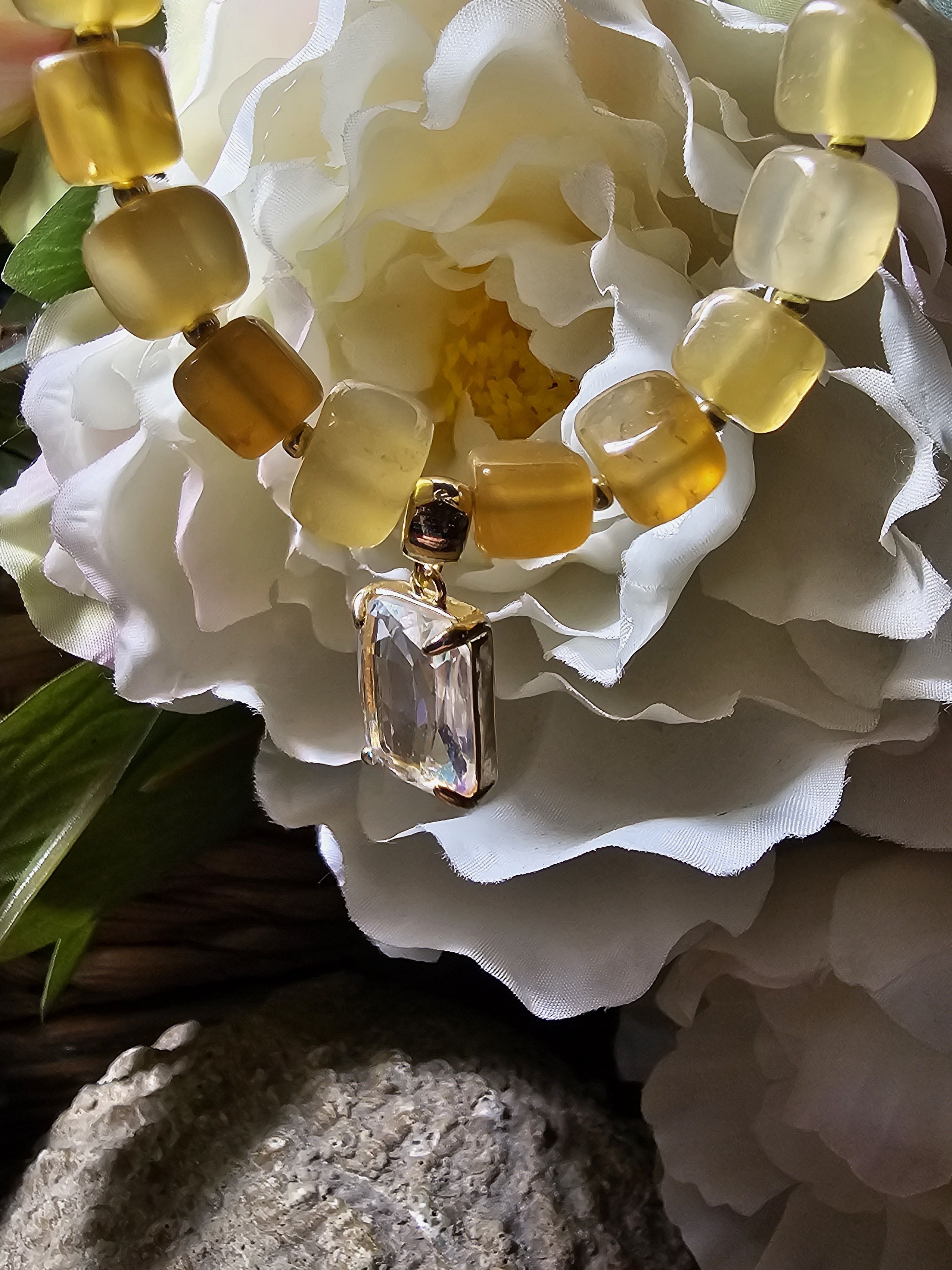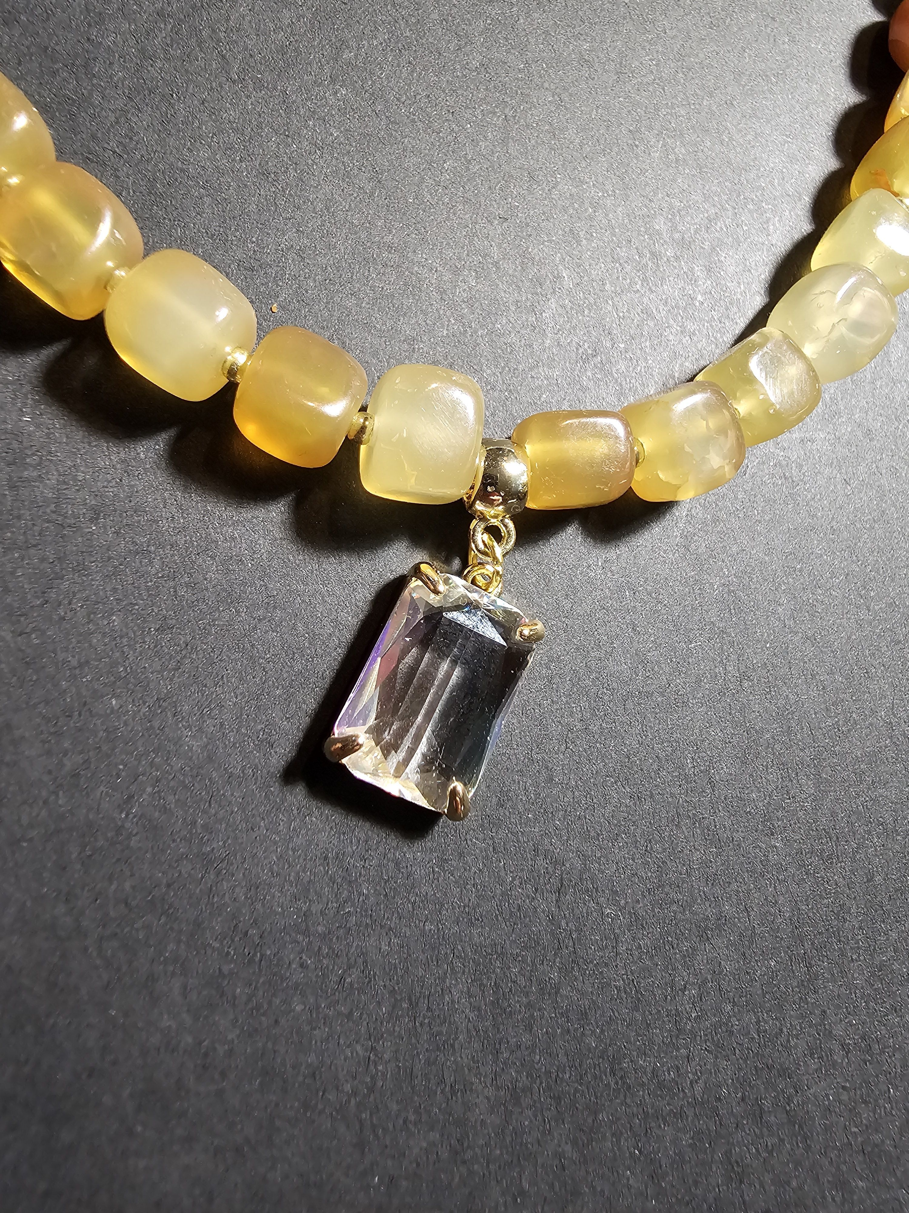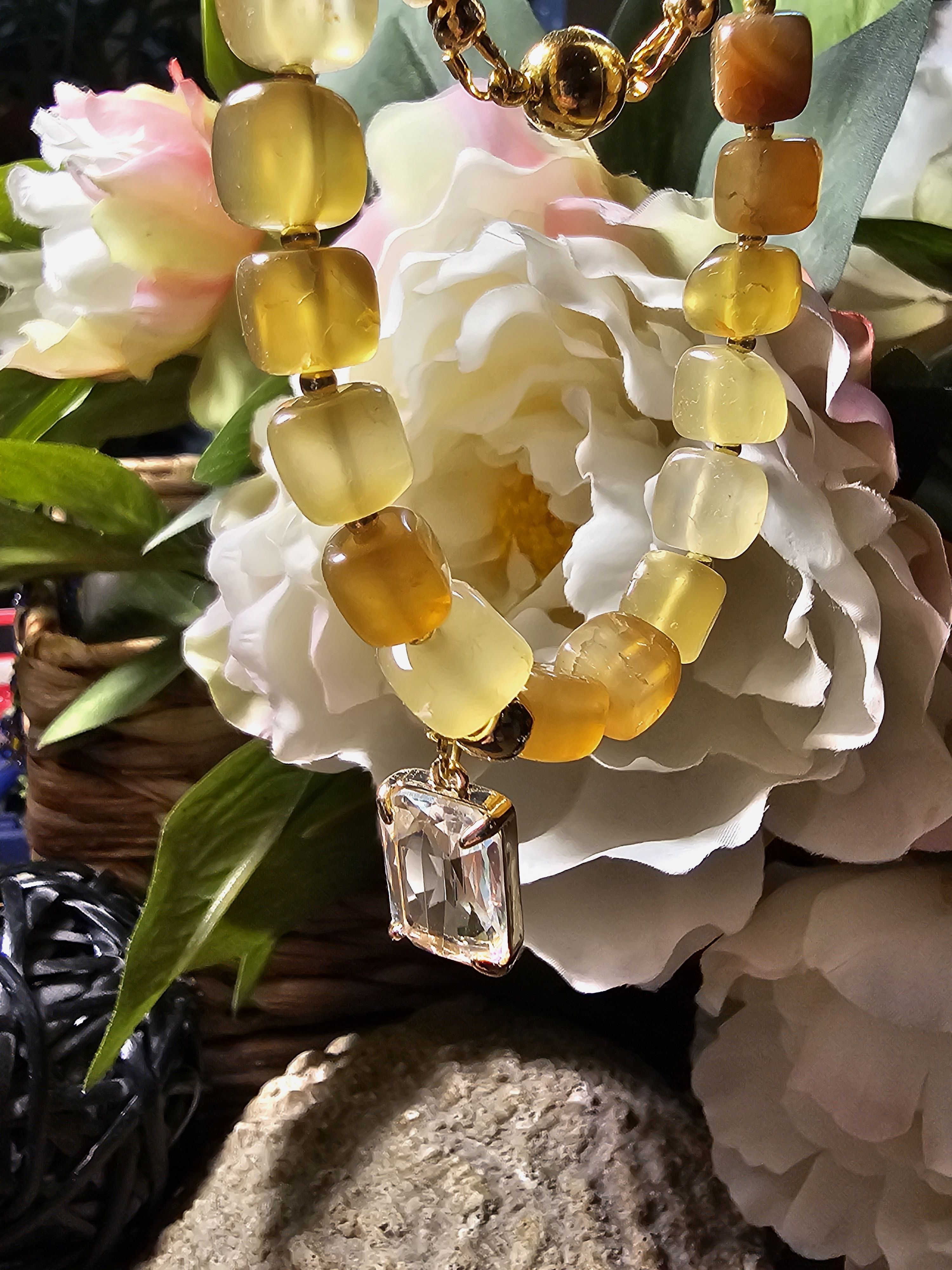 Ожерелье состоит из небольших бусин натурального жемчуга и квадратных бусин агата кракле желтого цвета, которые расположены ближе к центру. По центру ожерелья прикреплен прозрачный прямоугольный кулон, выполненный в золотистом цвете. Фурнитура ожерелья выполнена в золотистом цвете, что придает украшению особый шик.
