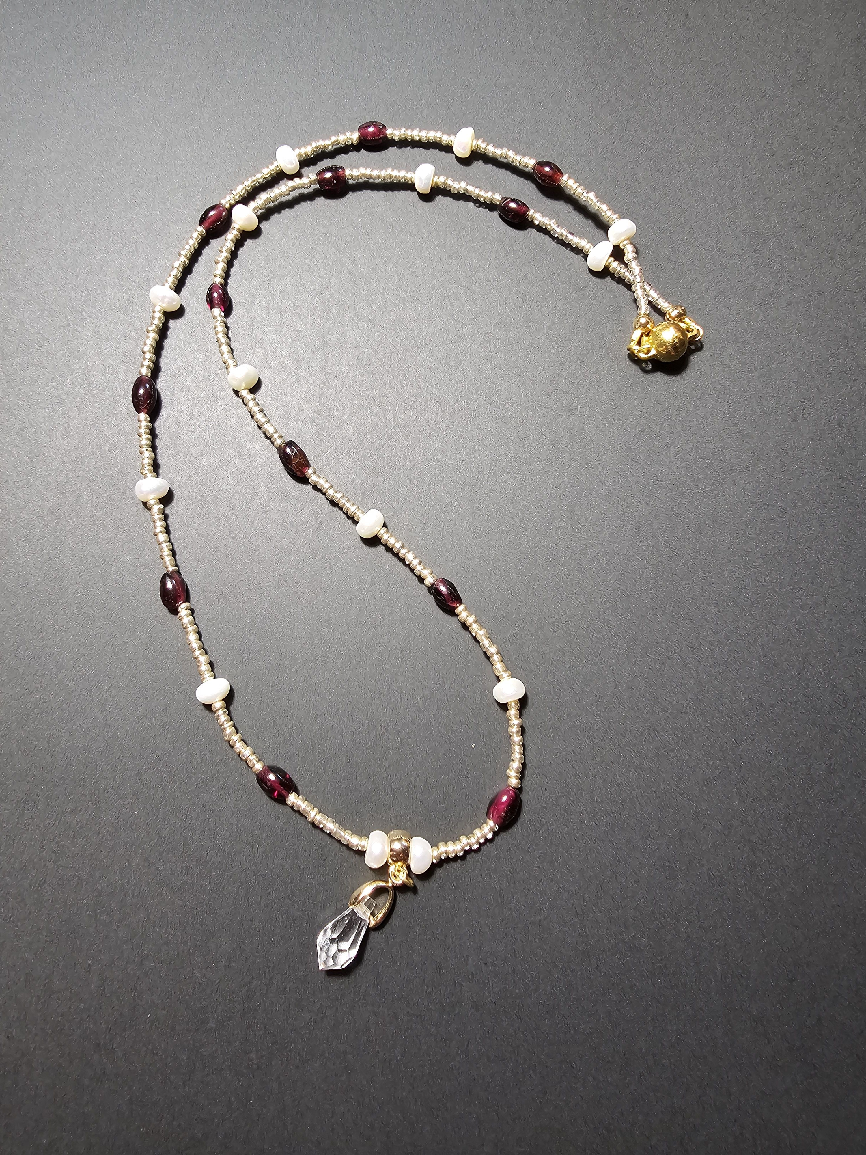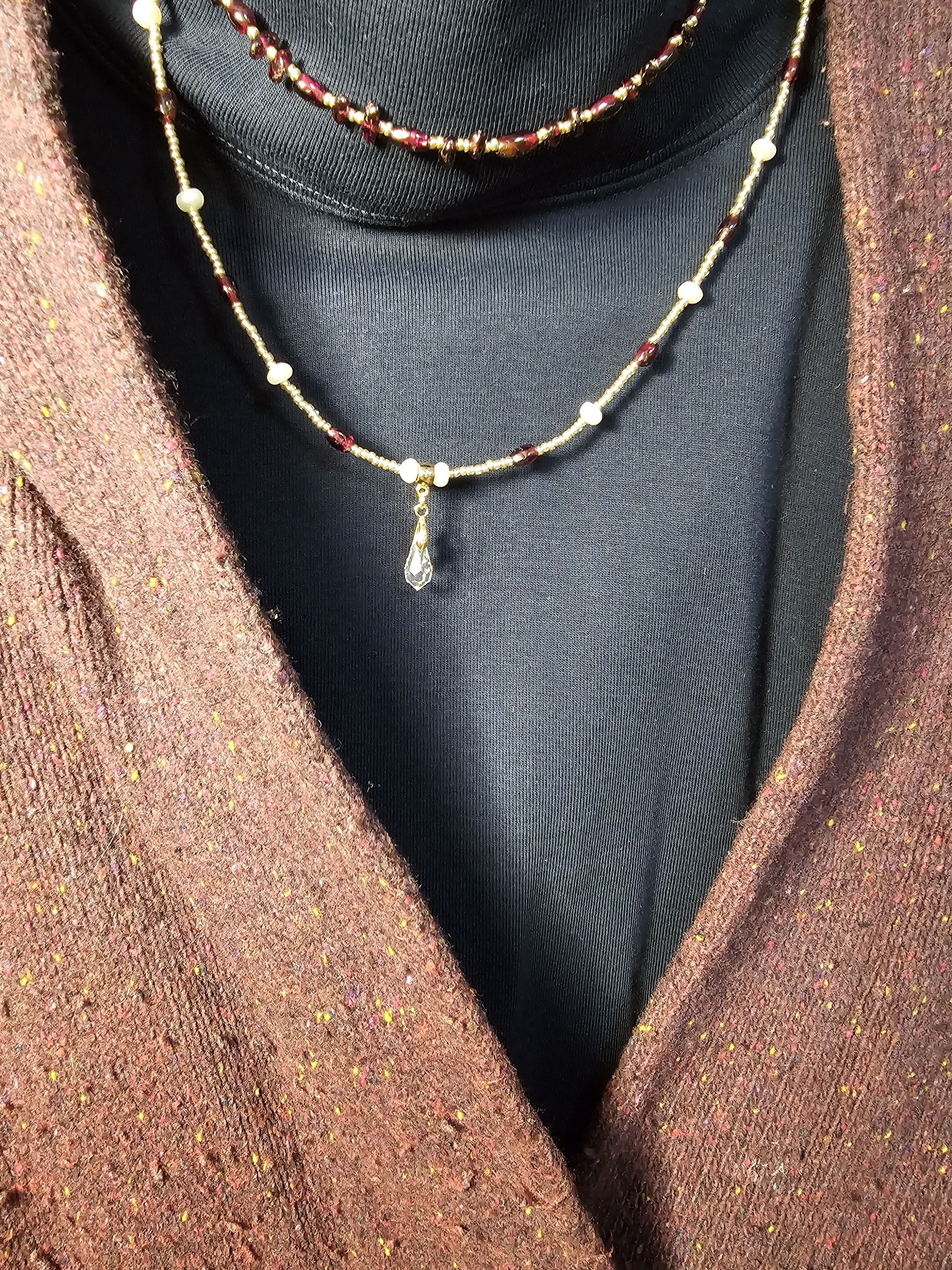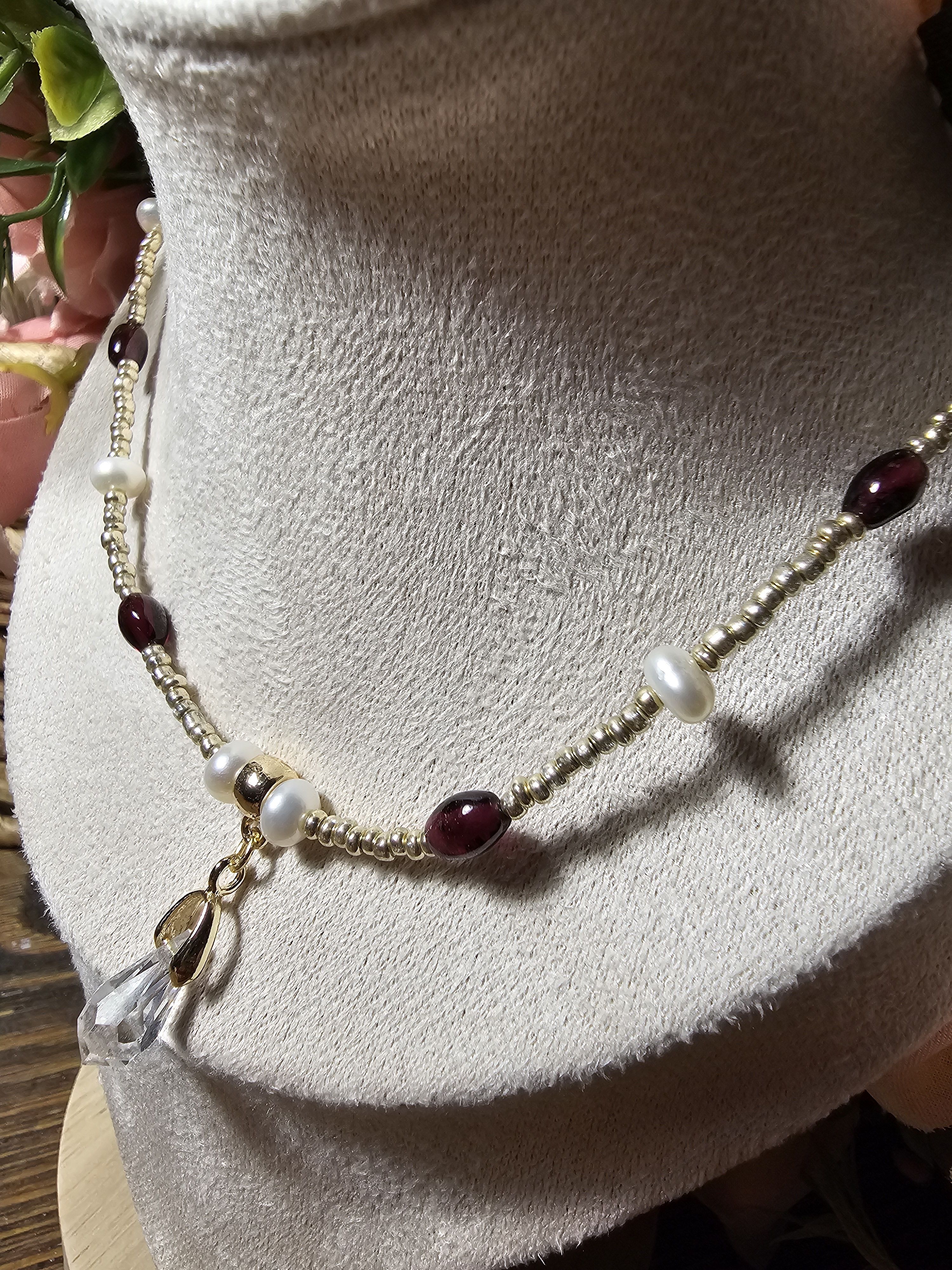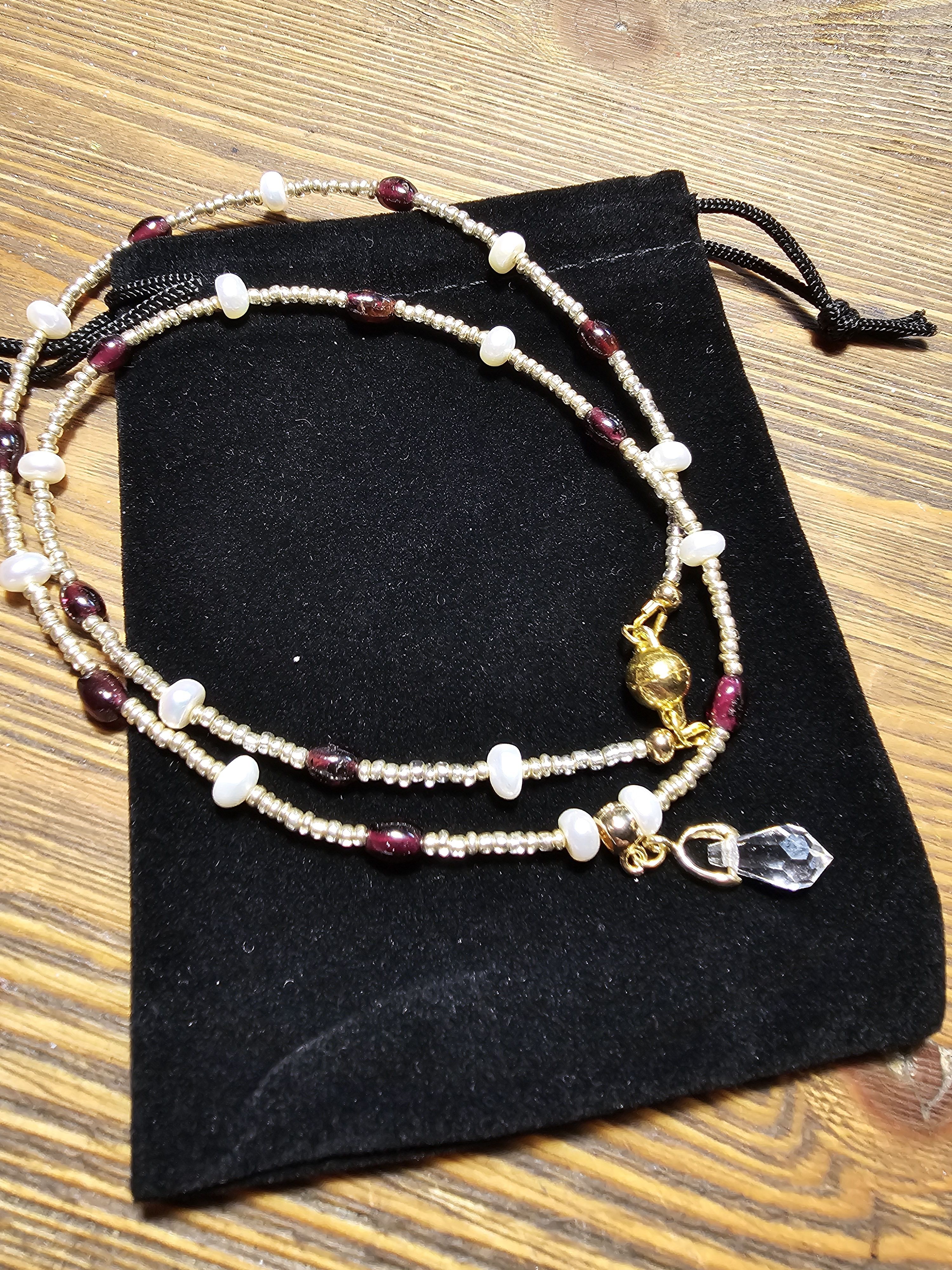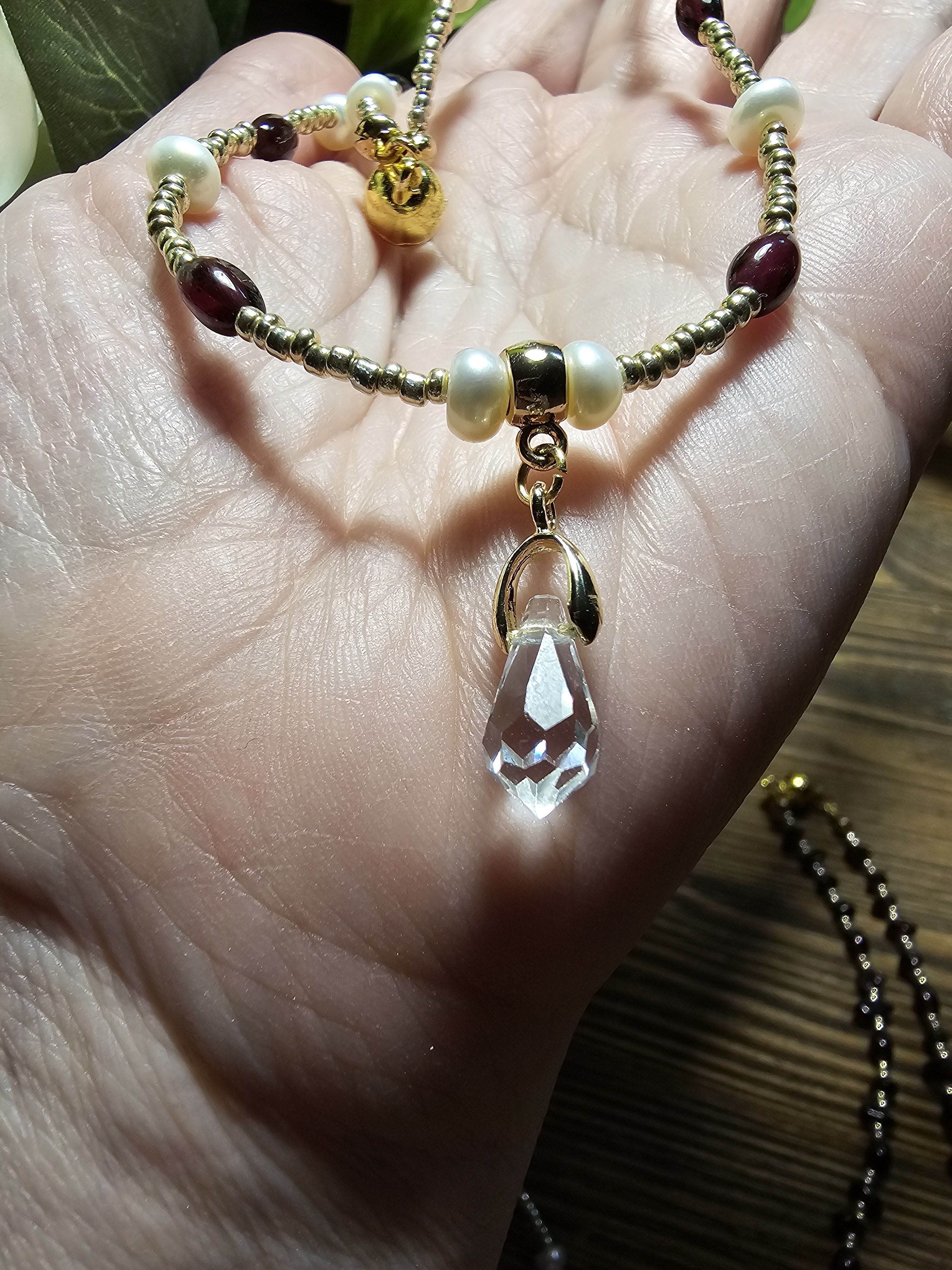 Начнем новый год с магии и красоты: Колье из благородного граната, сияющего натурального жемчуга и с защитой от негативных сил! Эти натуральные камни разрежены золотистым некалиброванным Чешским бисером и украшены кулоном капля из граненого Австрийского стекла Магнитная застёжка золотистого цвета позволит одеть и снять колье за секунды.