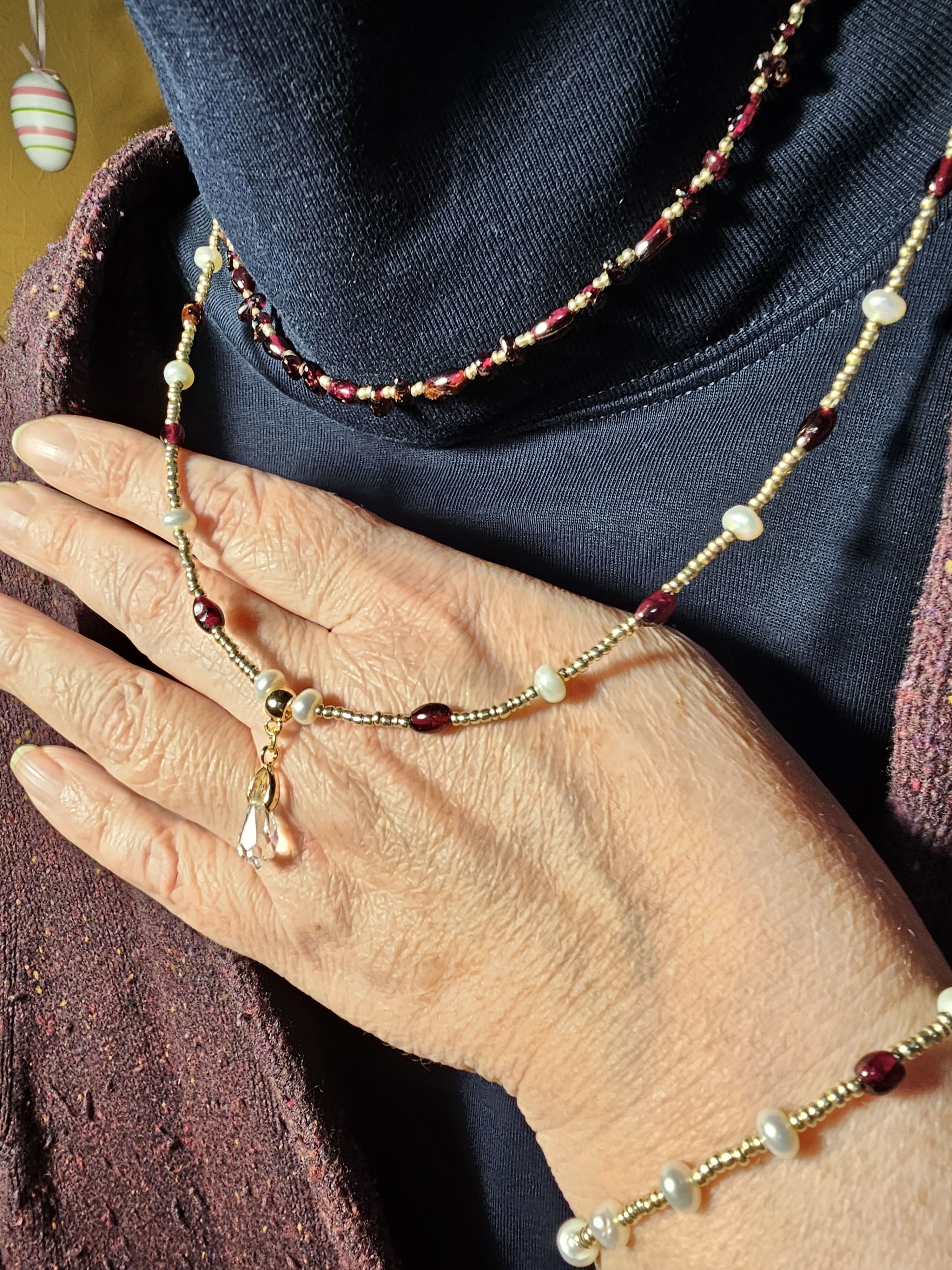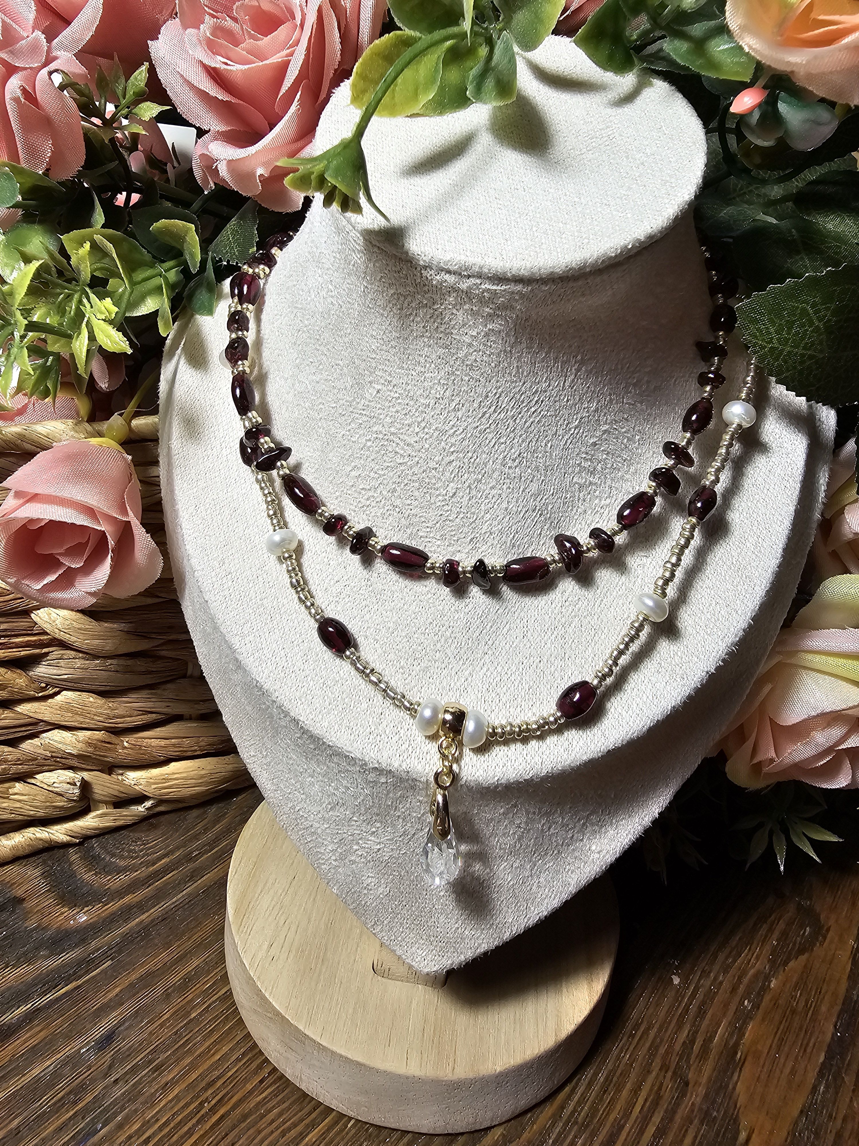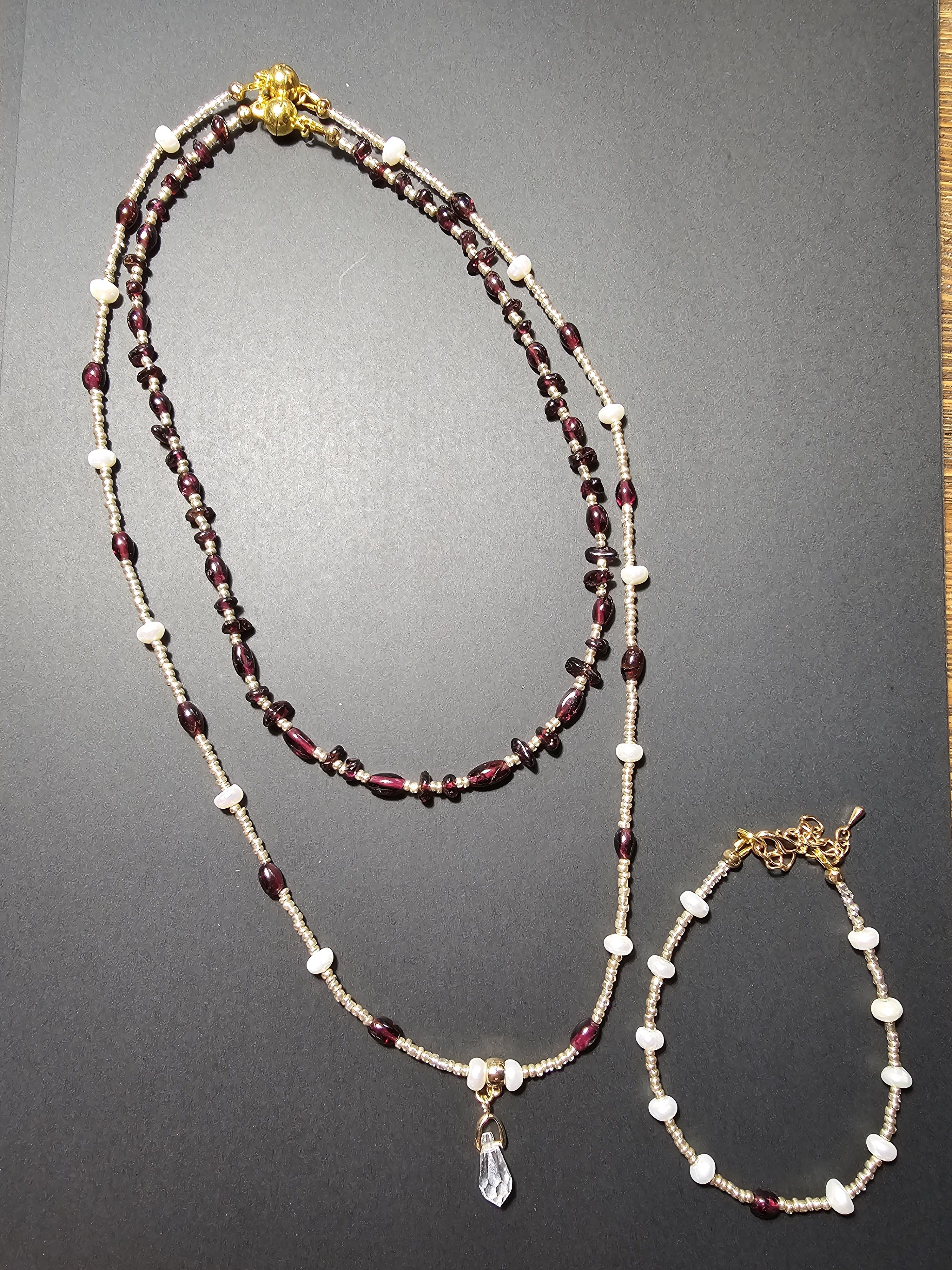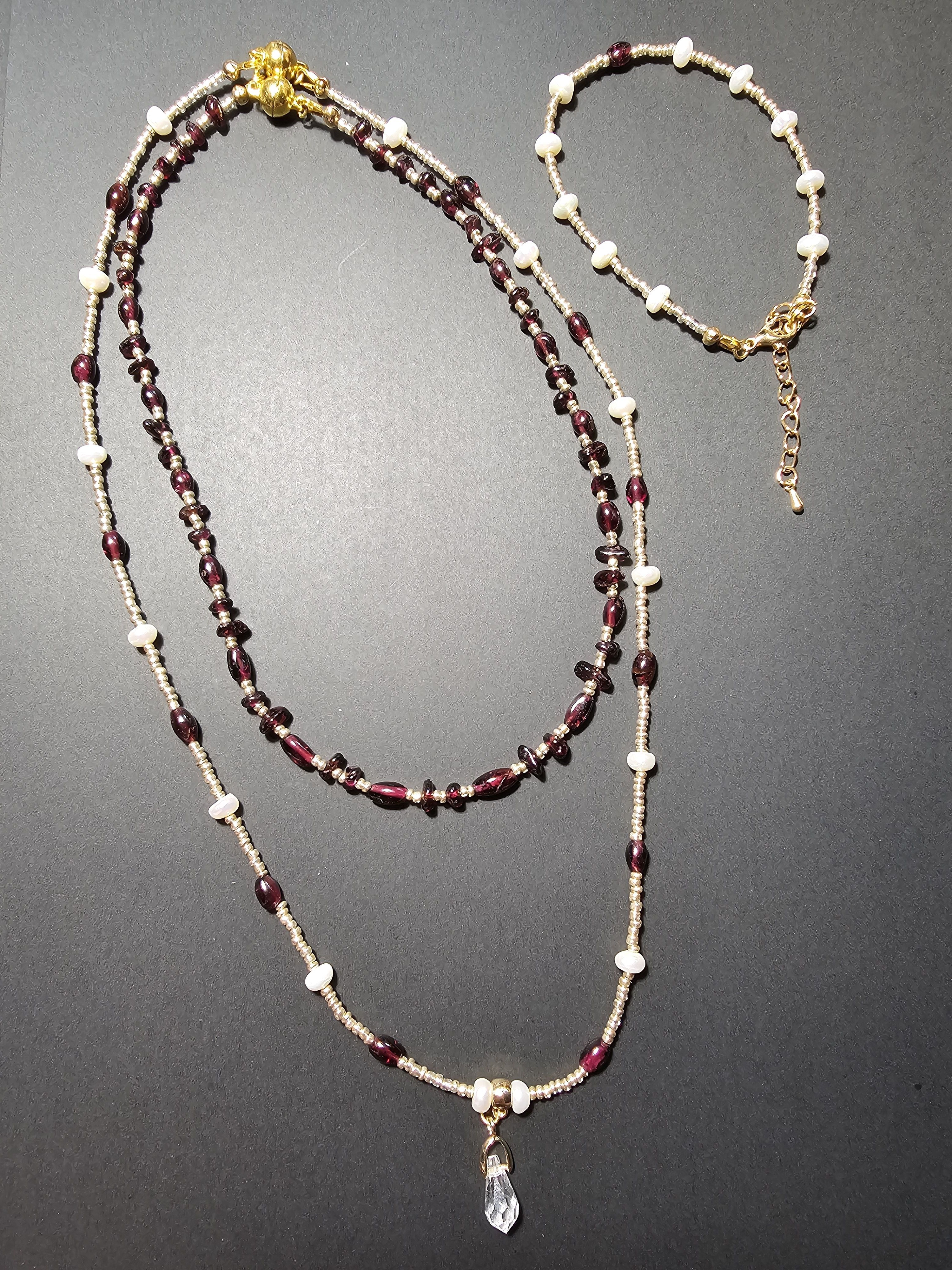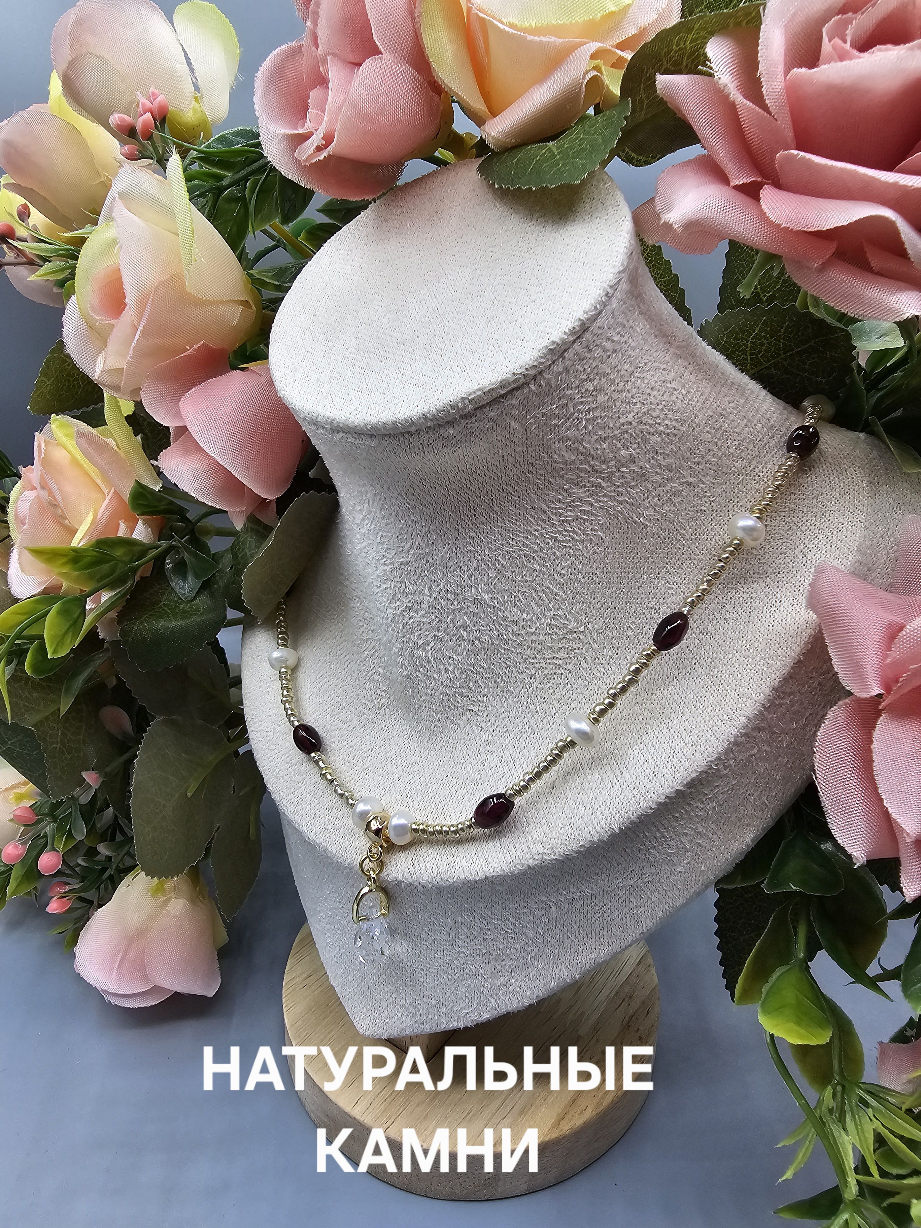 Начнем новый год с магии и красоты: Колье из благородного граната, сияющего натурального жемчуга и с защитой от негативных сил! Эти натуральные камни разрежены золотистым некалиброванным Чешским бисером и украшены кулоном капля из граненого Австрийского стекла Магнитная застёжка золотистого цвета позволит одеть и снять колье за секунды.