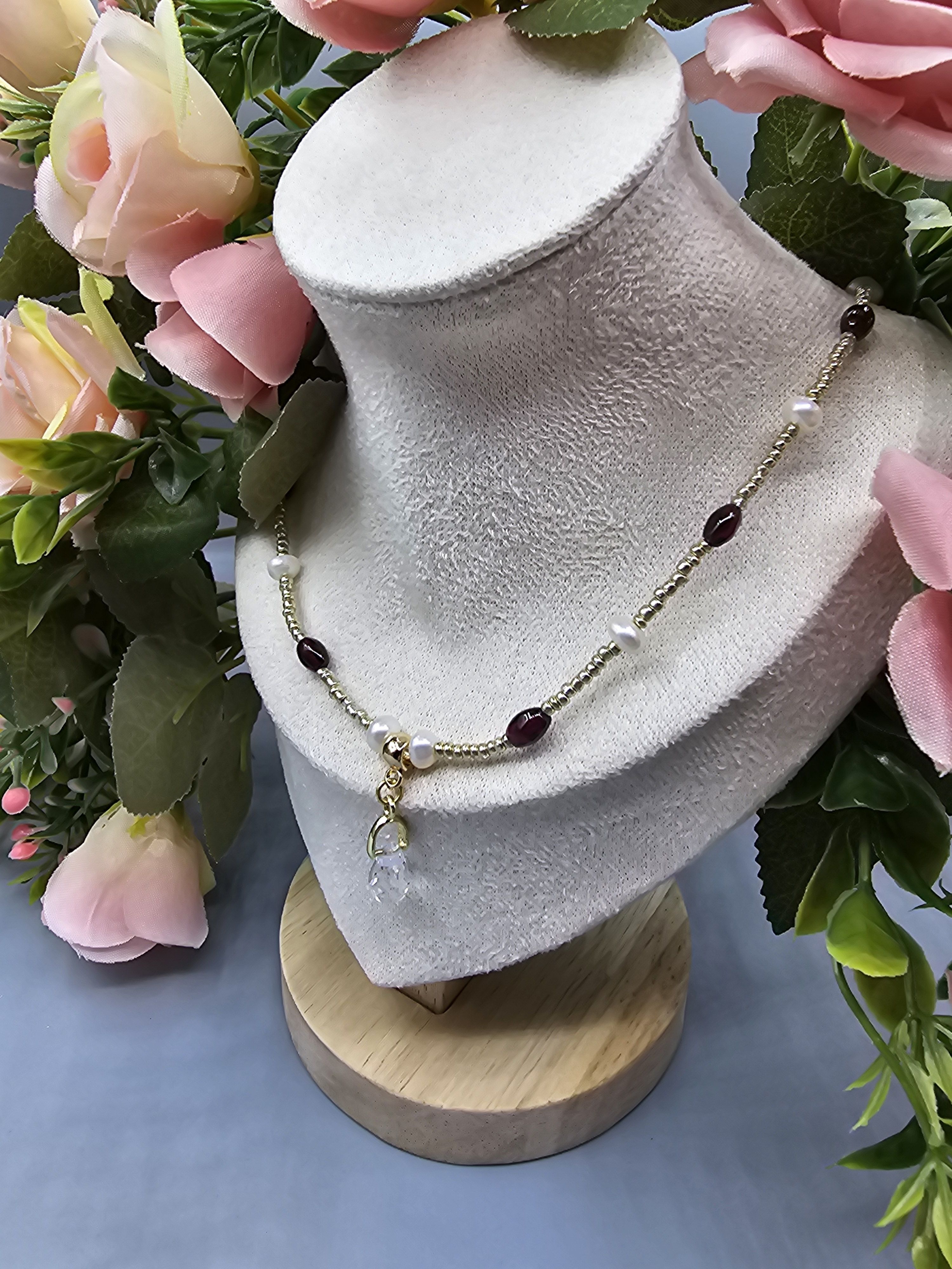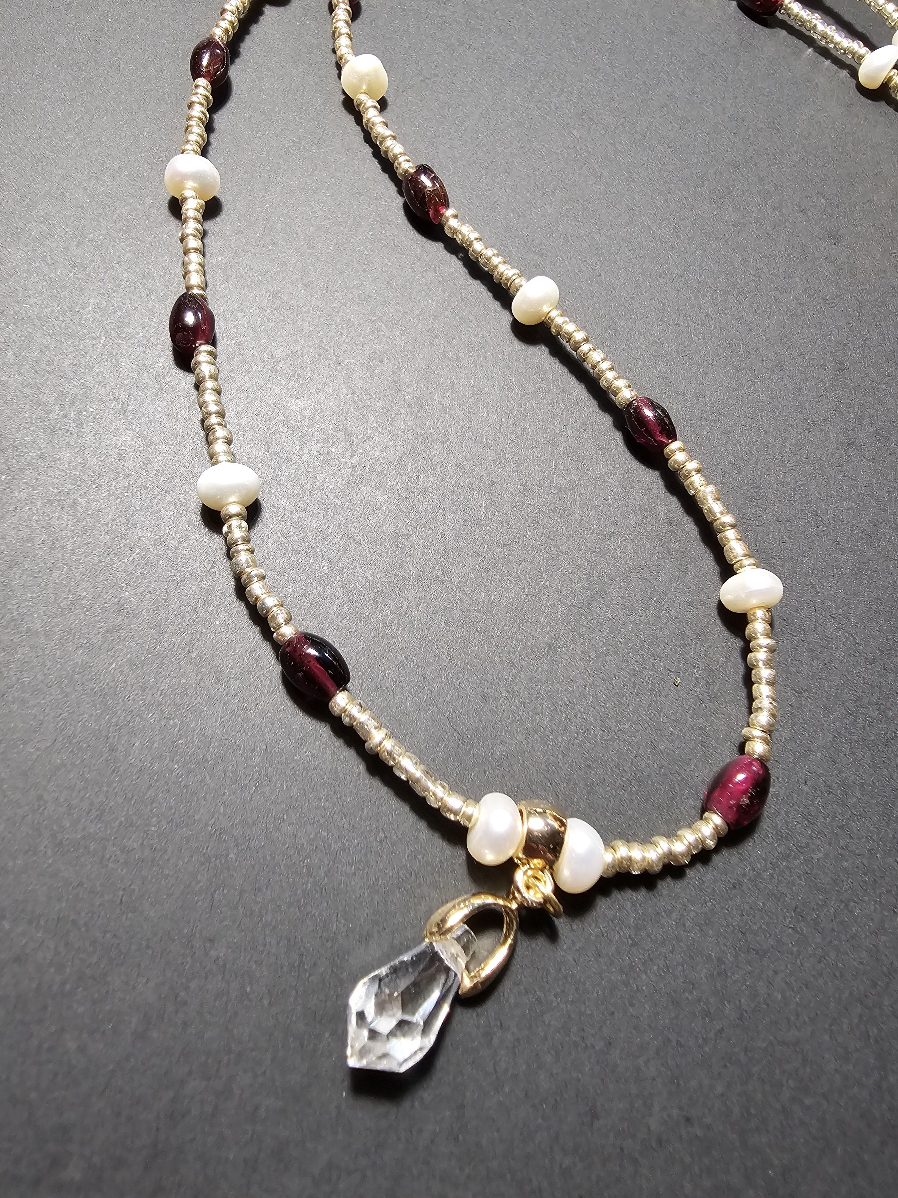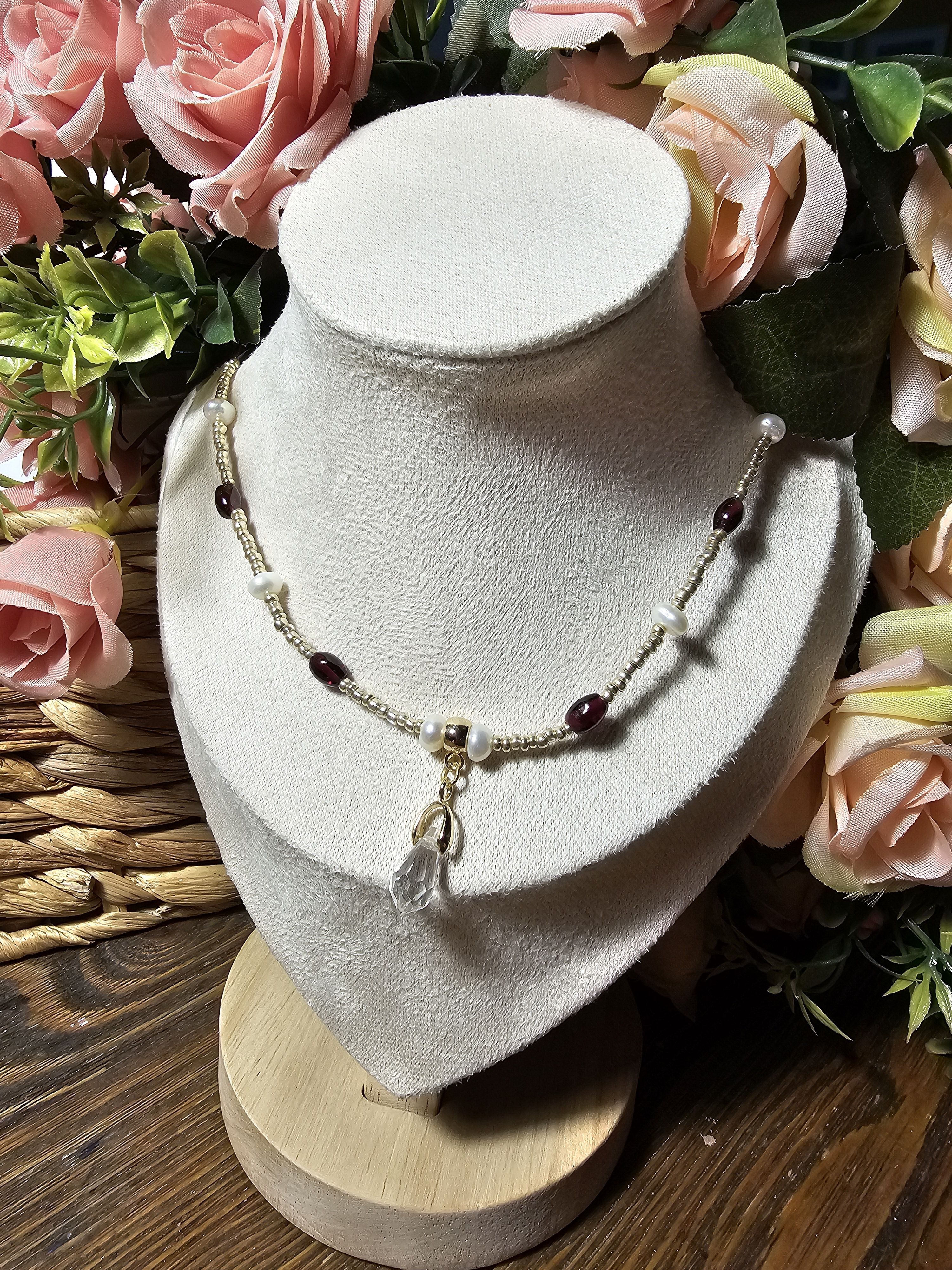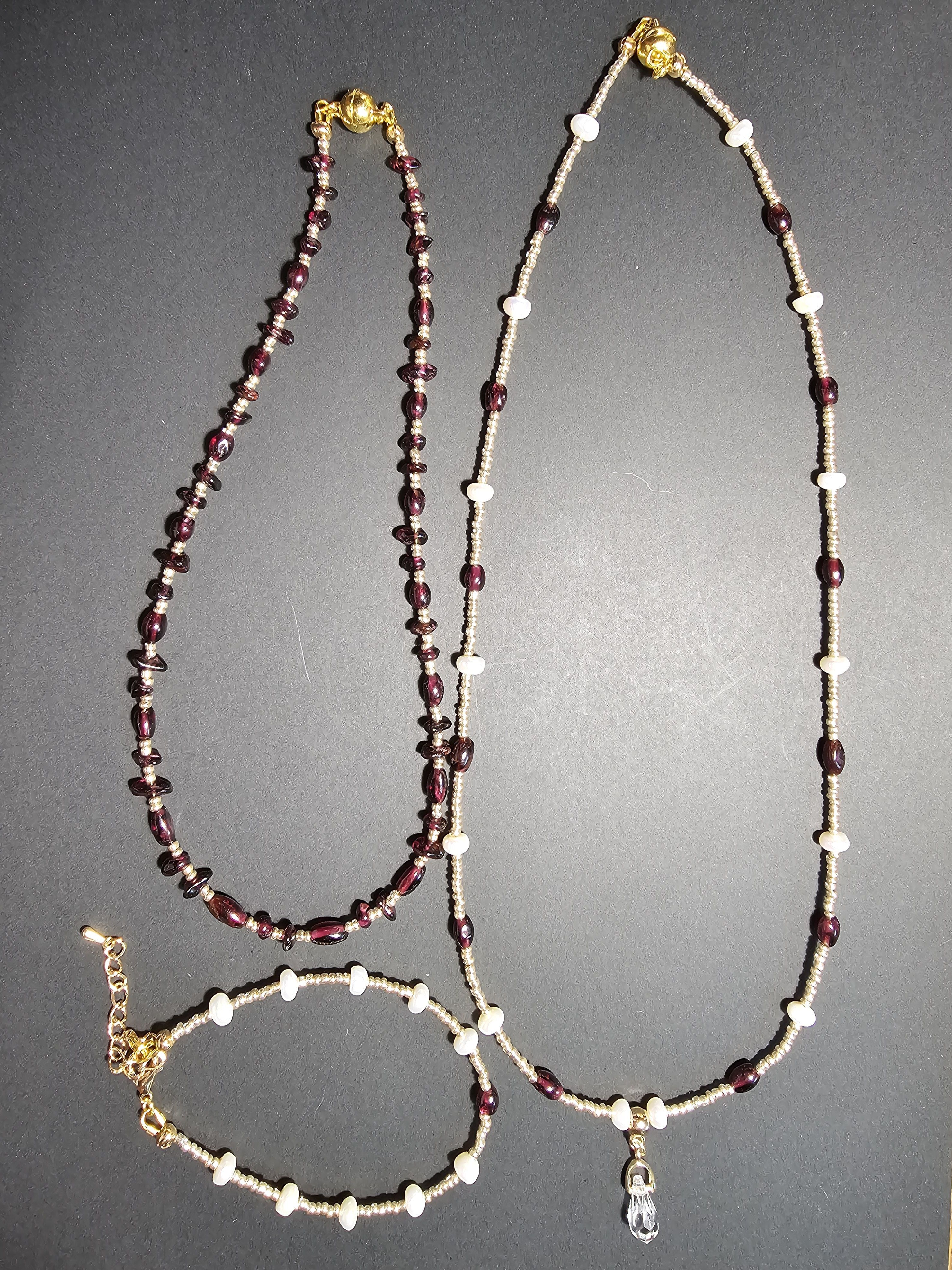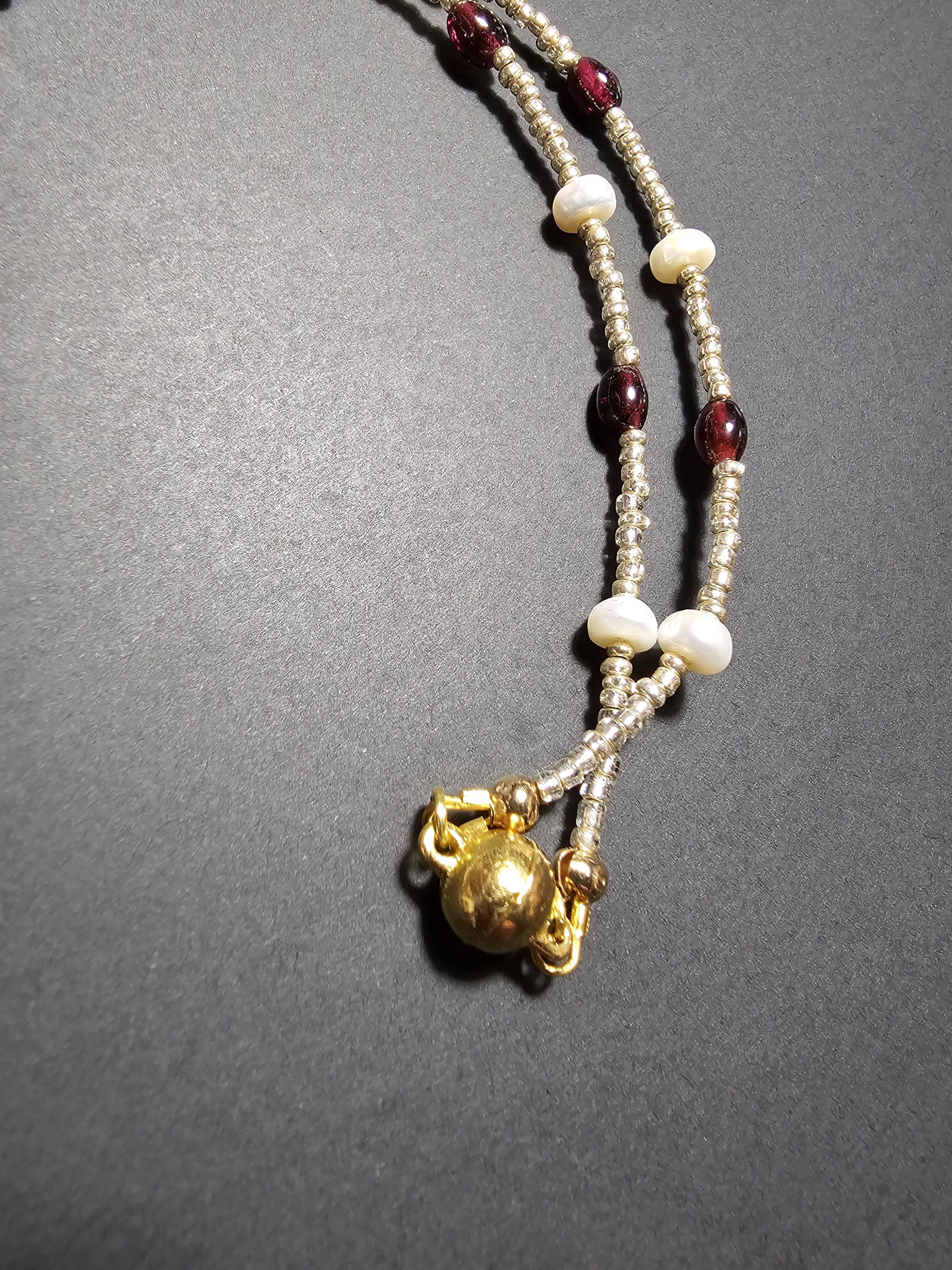 Начнем новый год с магии и красоты: Колье из благородного граната, сияющего натурального жемчуга и с защитой от негативных сил! Эти натуральные камни разрежены золотистым некалиброванным Чешским бисером и украшены кулоном капля из граненого Австрийского стекла Магнитная застёжка золотистого цвета позволит одеть и снять колье за секунды.