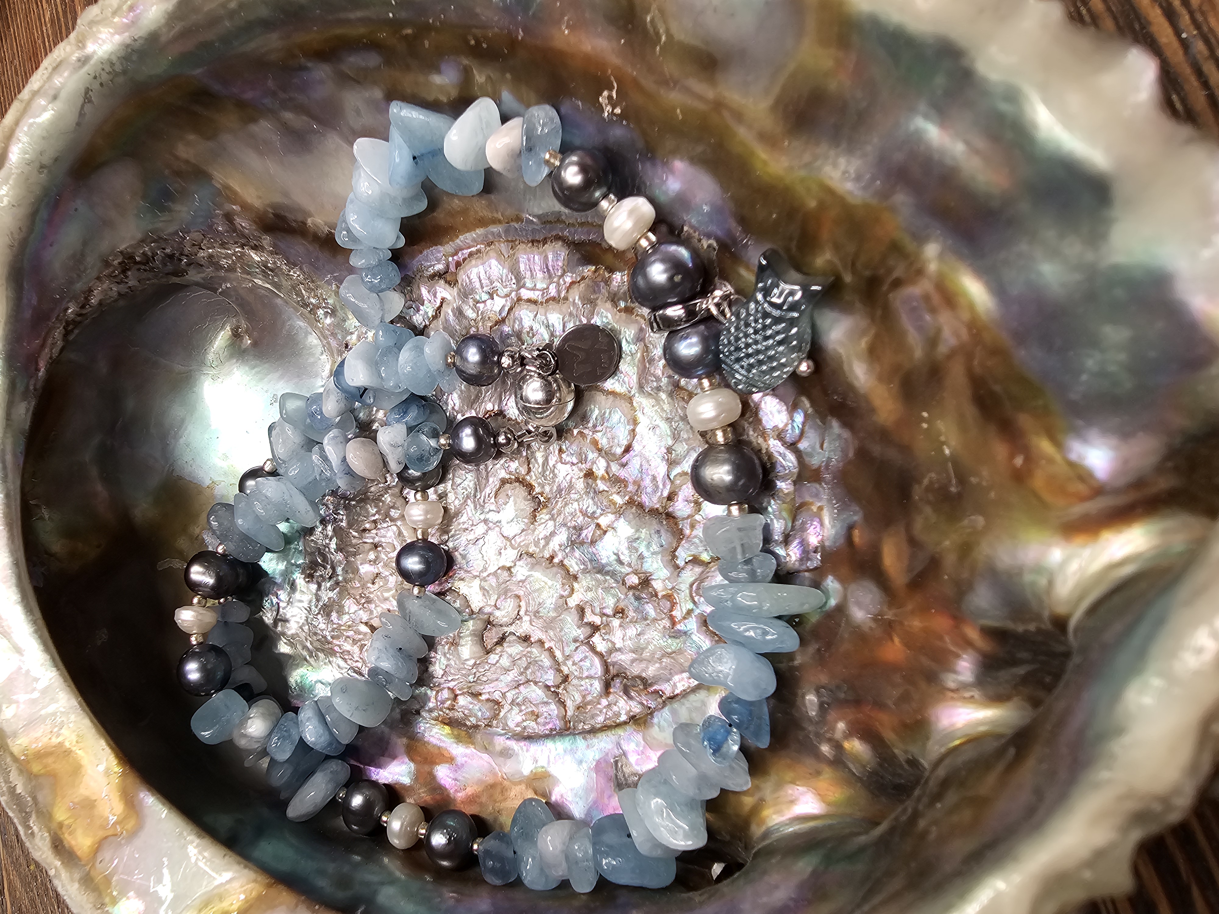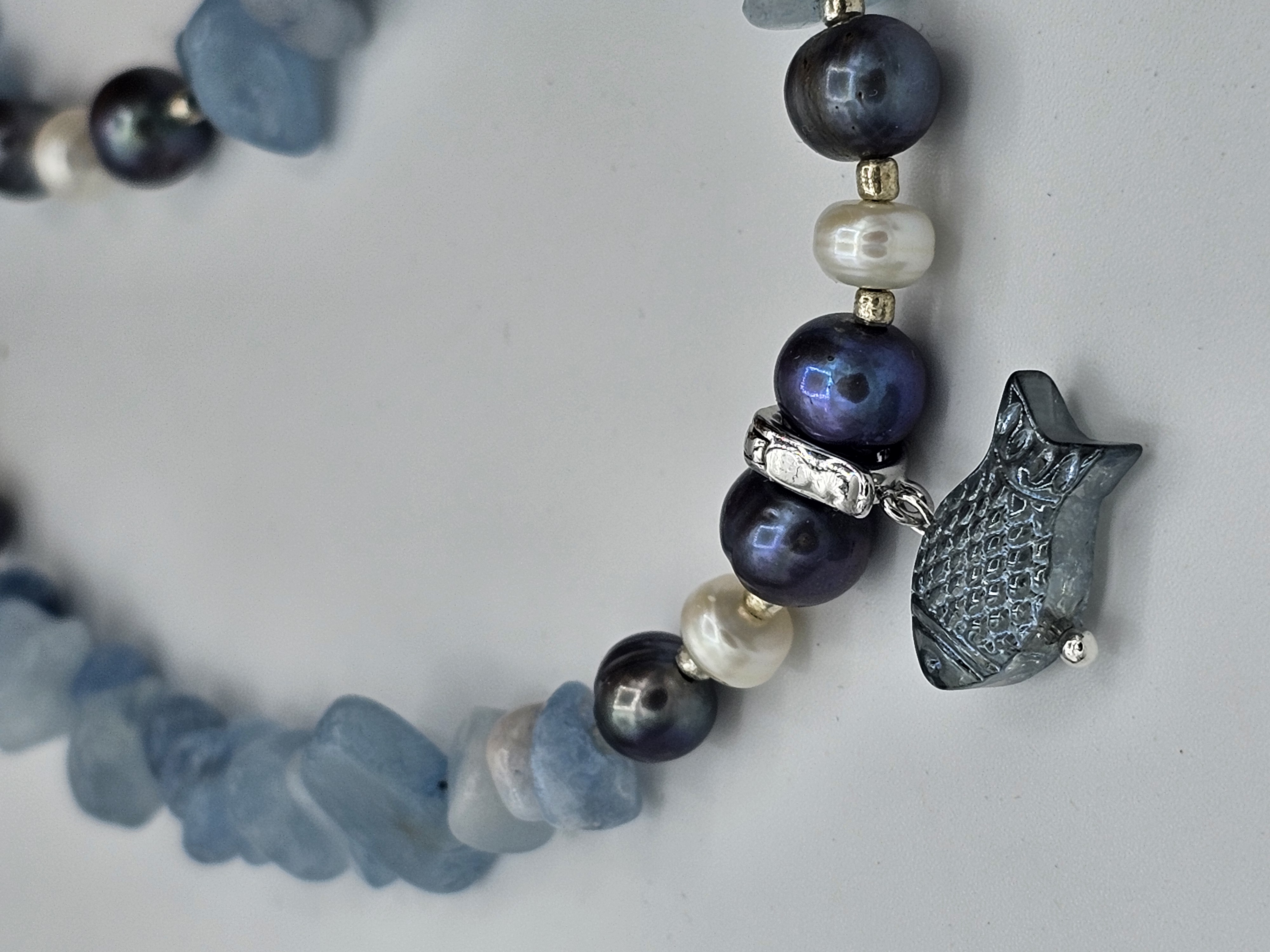 Колье ручной работы из речного жемчуга двух цветов и аквамарина "Рыбка" - это стильное и оригинальное украшение, которое станет прекрасным подарком для себя или близкого человека.