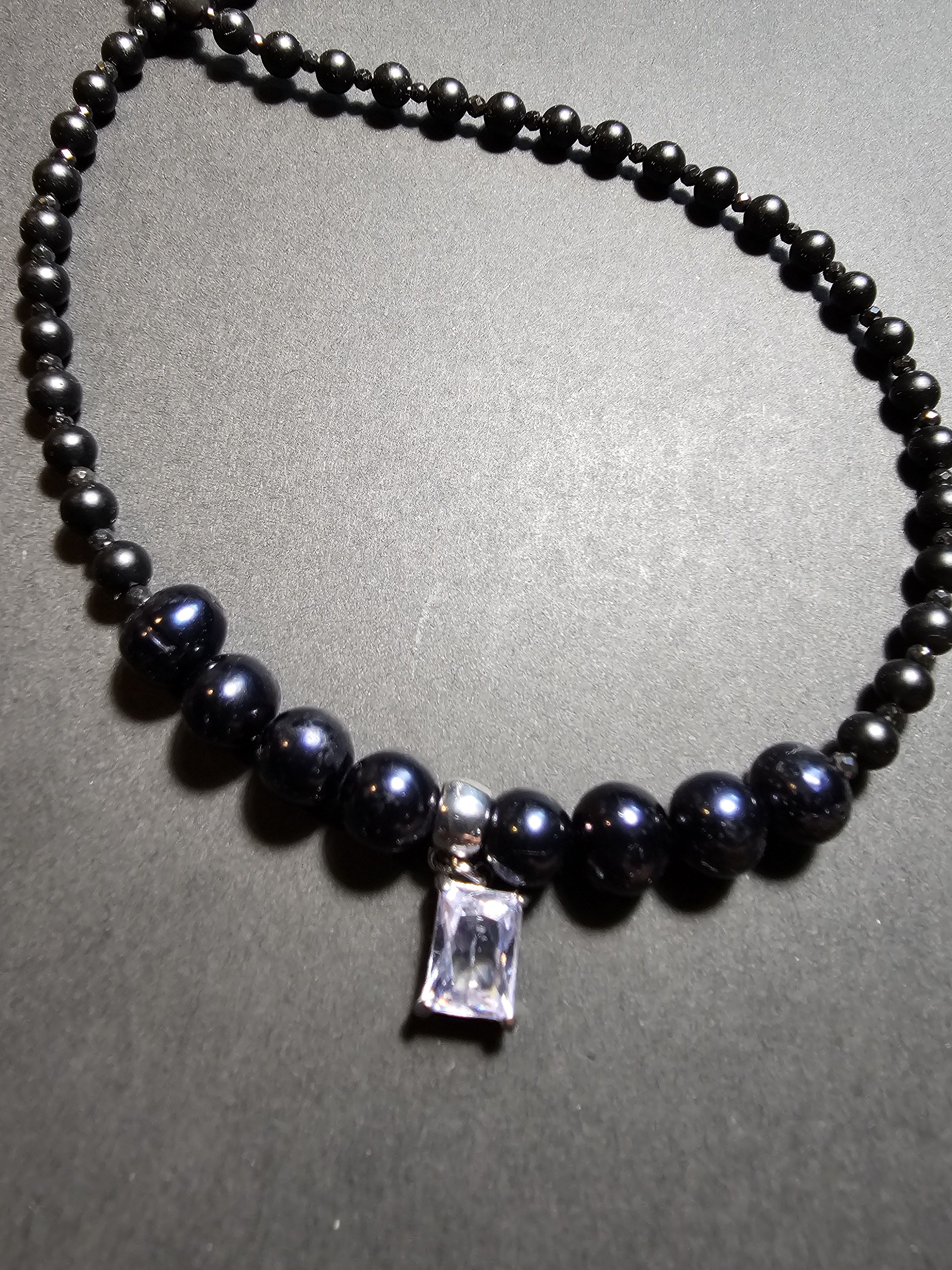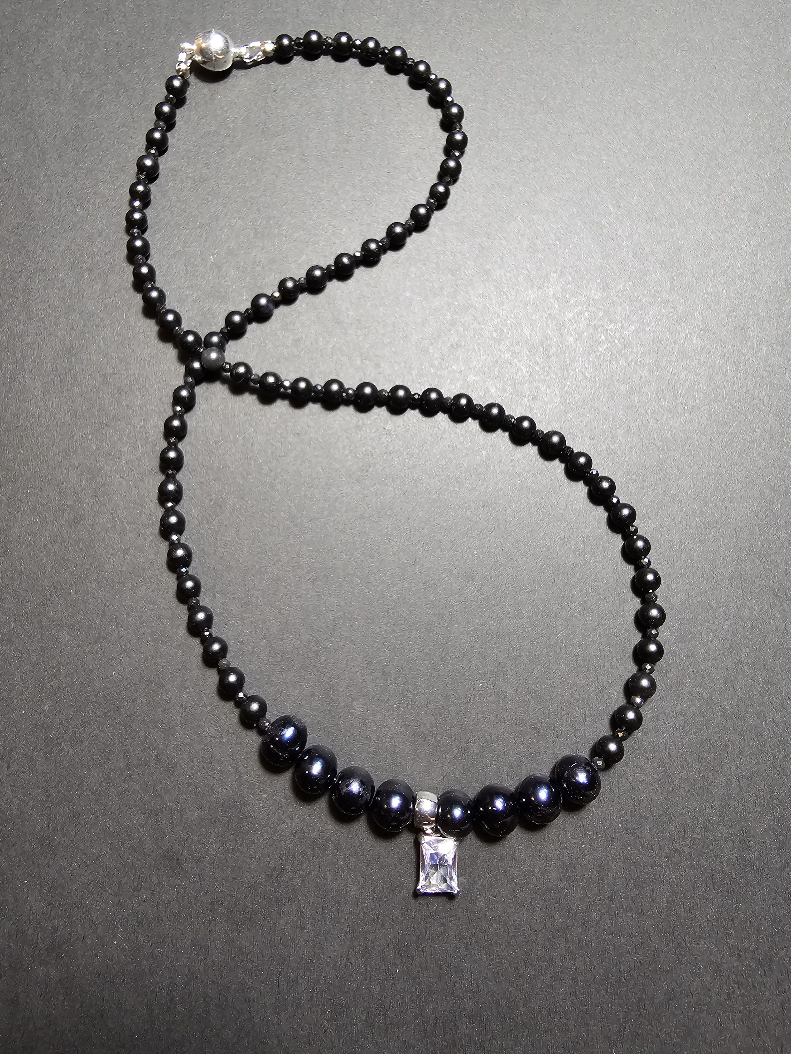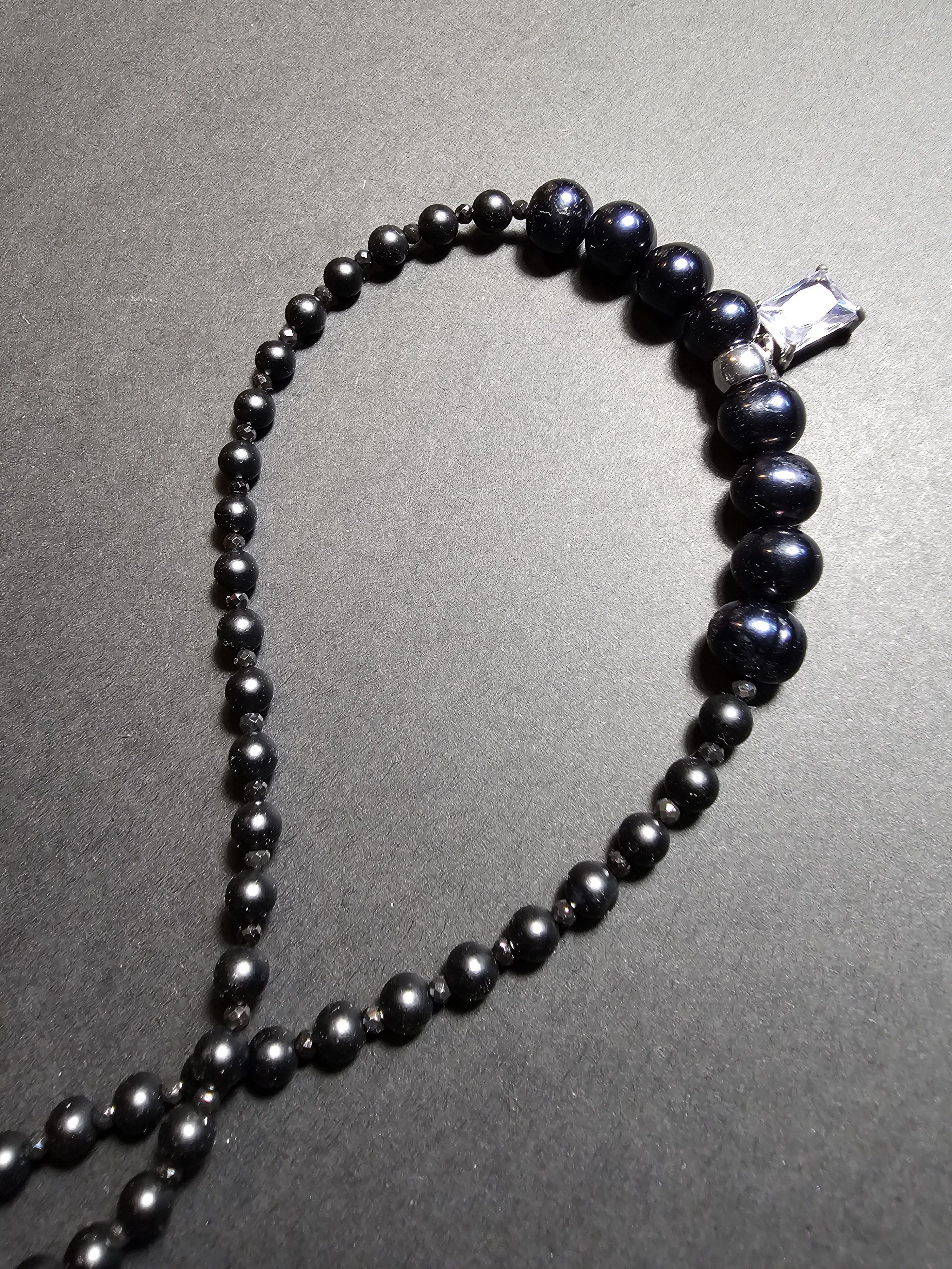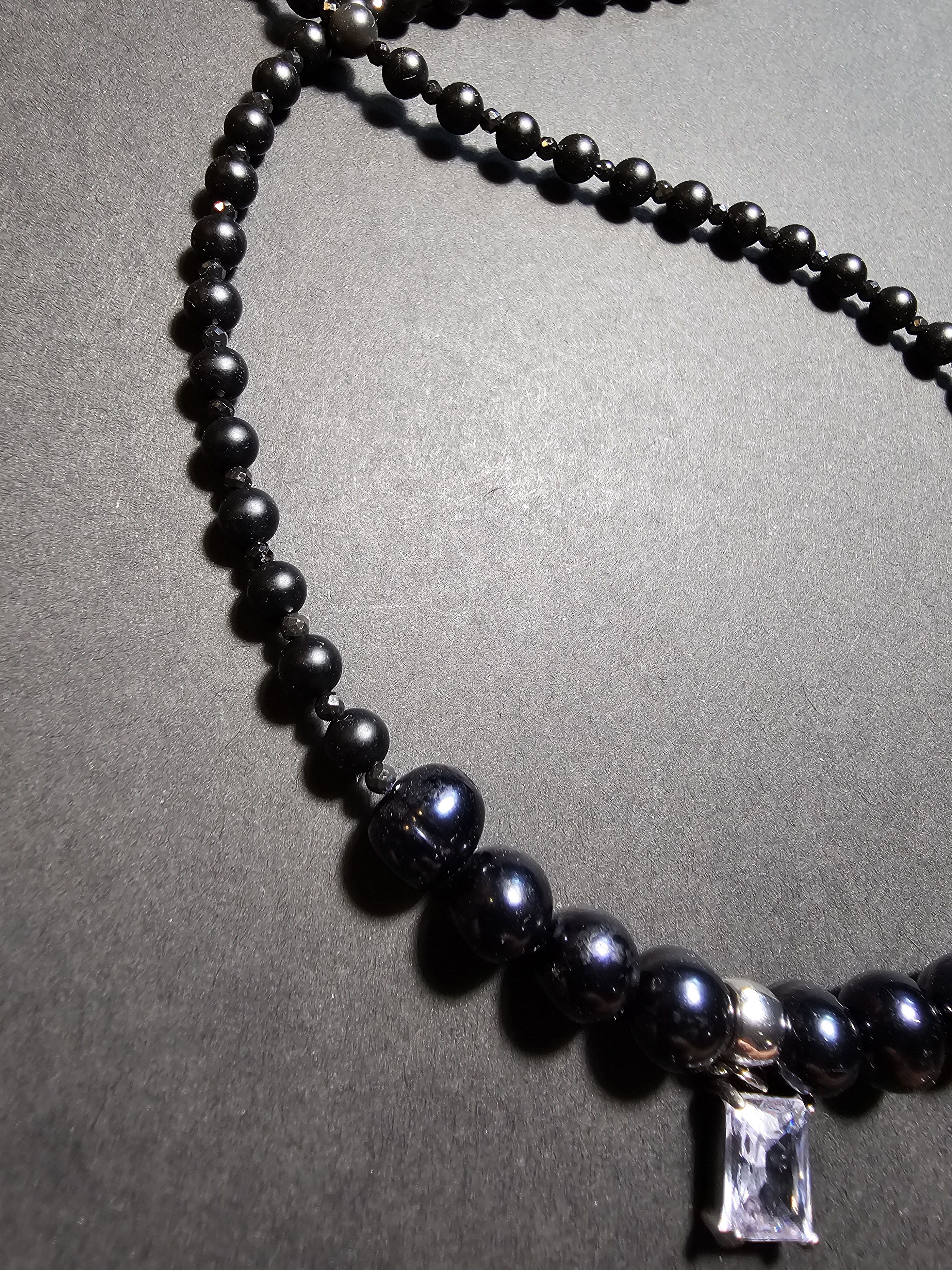 Ожерелье состоит из маленьких бусин матового агата, больших бусин в центре натурального жемчуга, образуя узор. Агат разряжен "искорками" кварца, а центр ожерелья на круглой бусине висит небольшая хрустальная квадратная подвеска.
