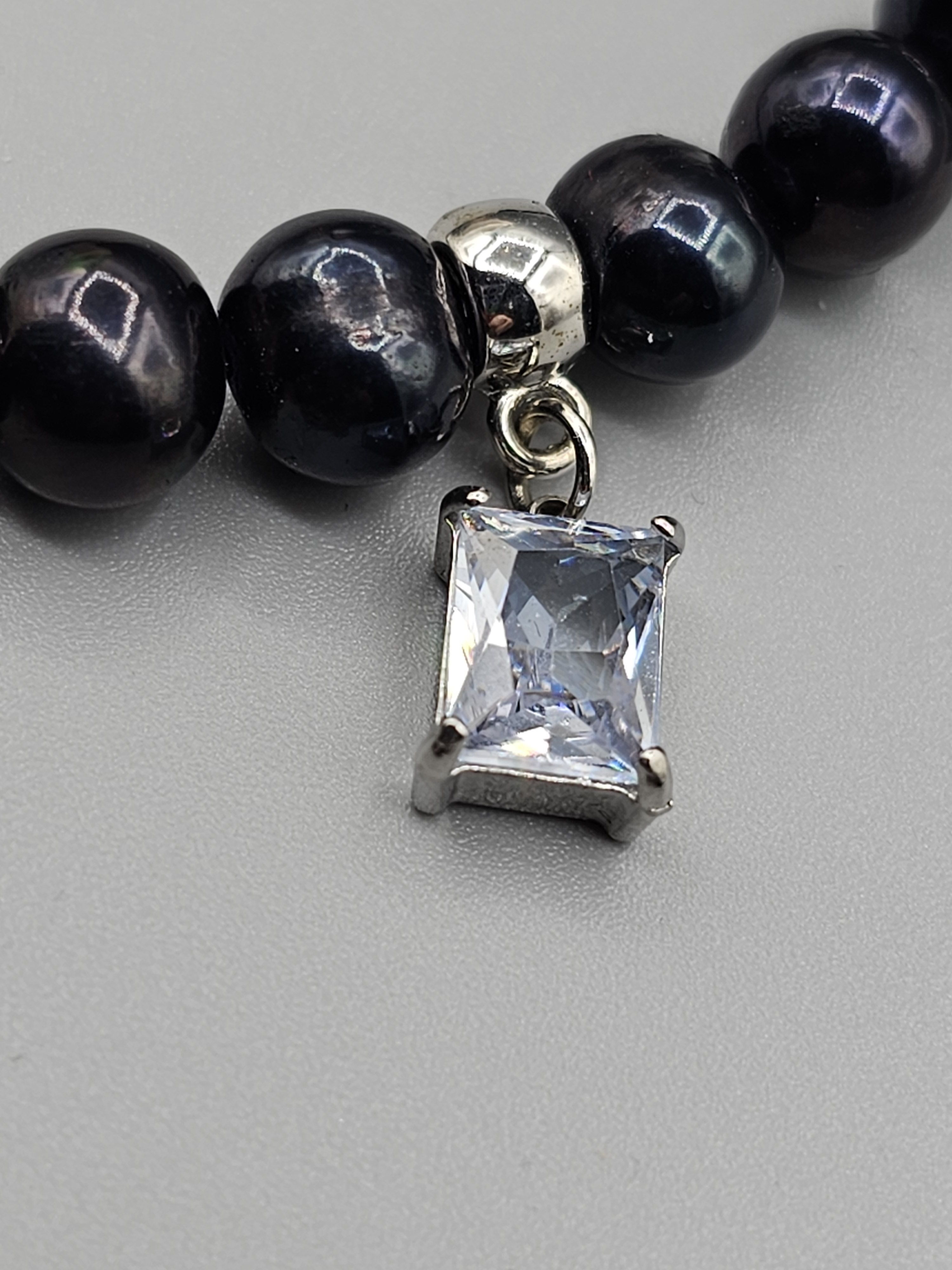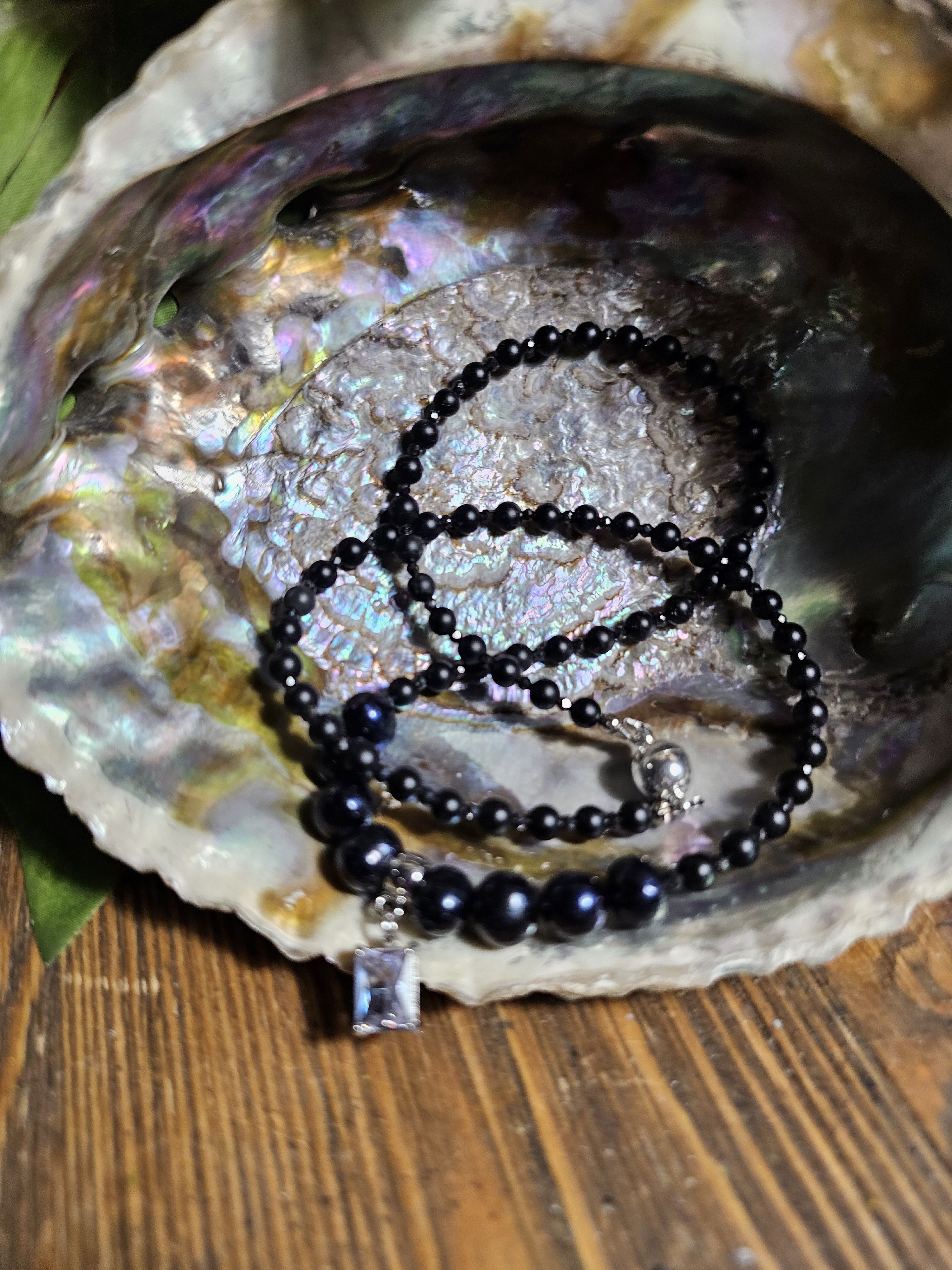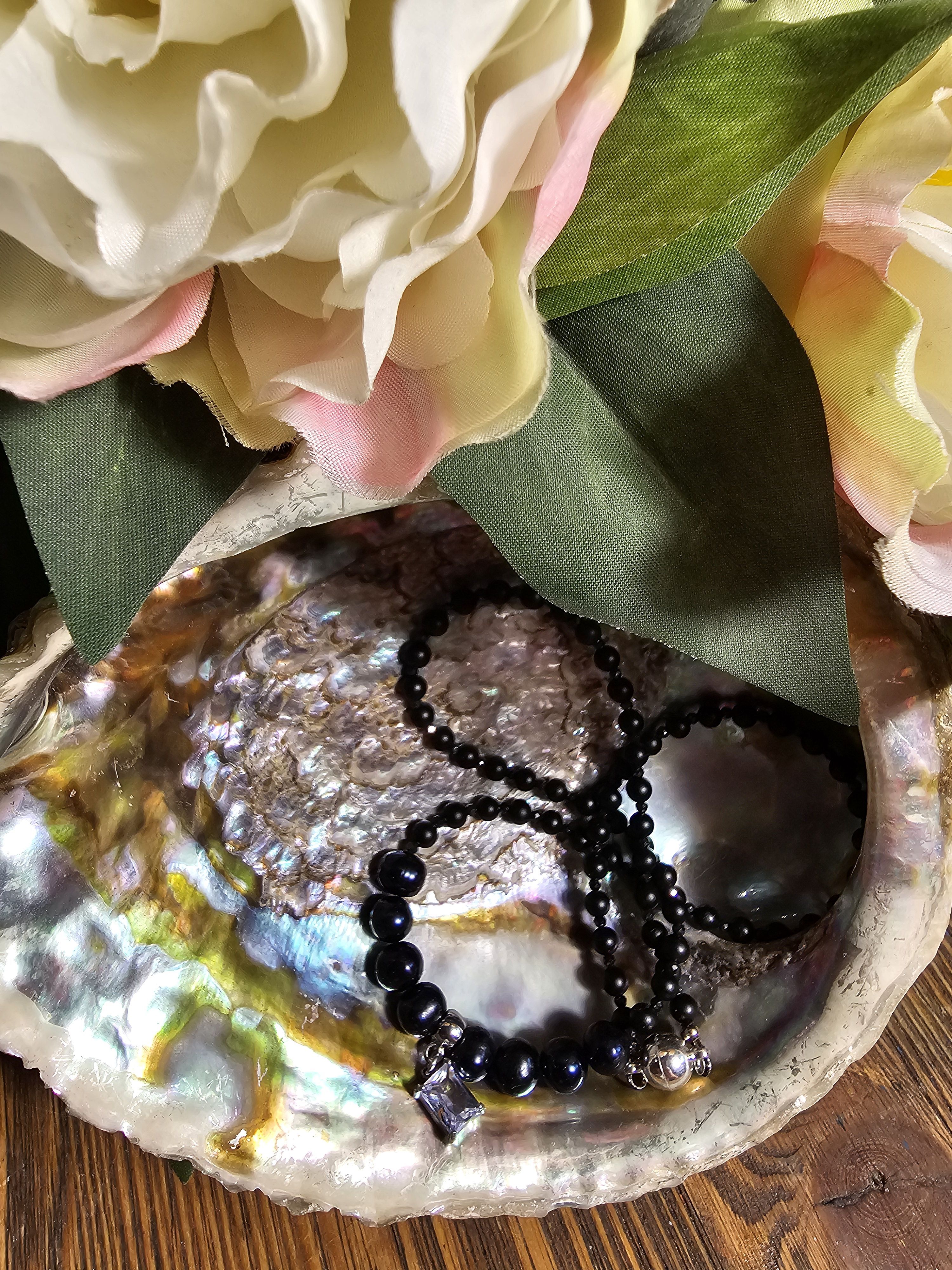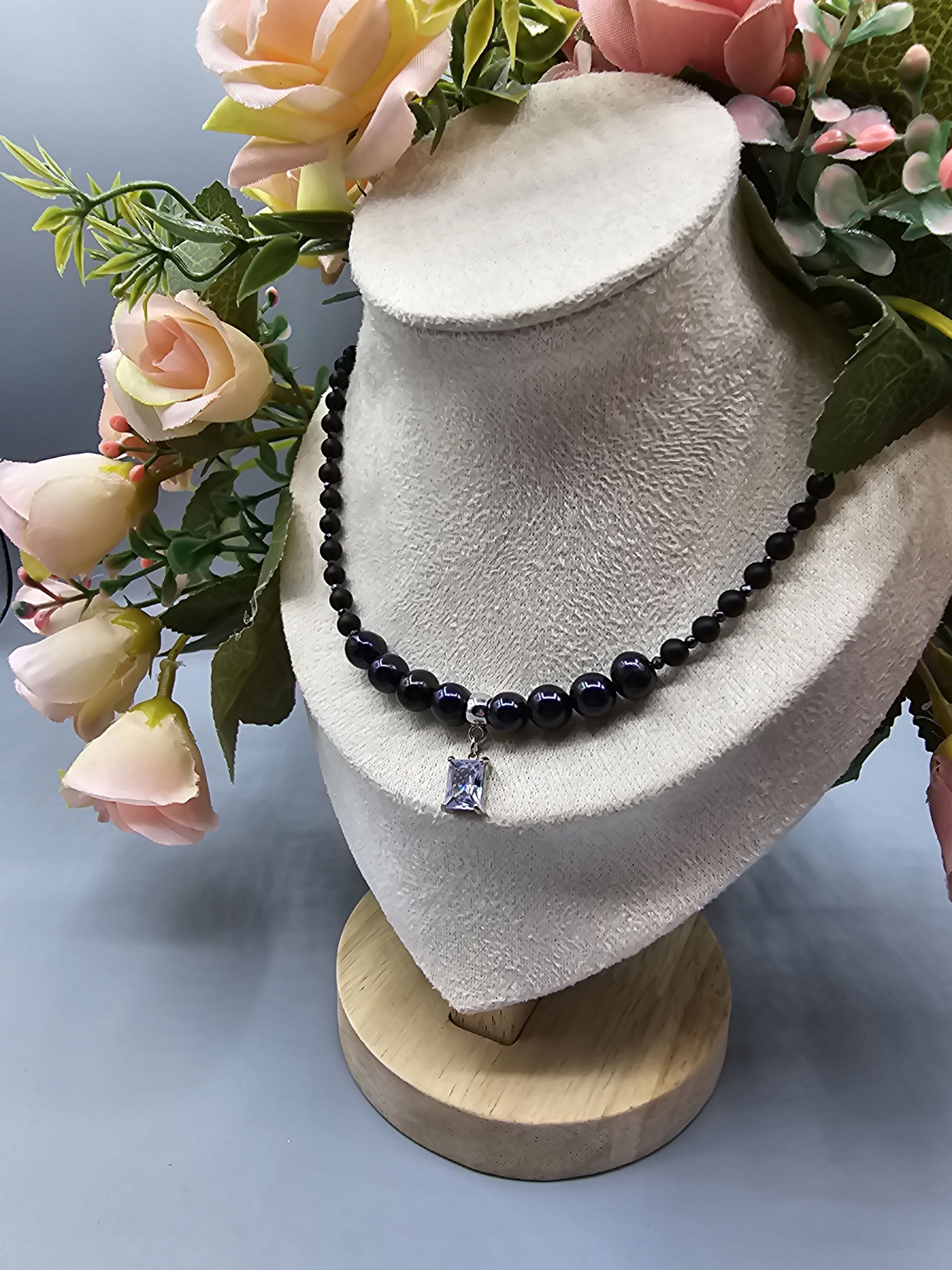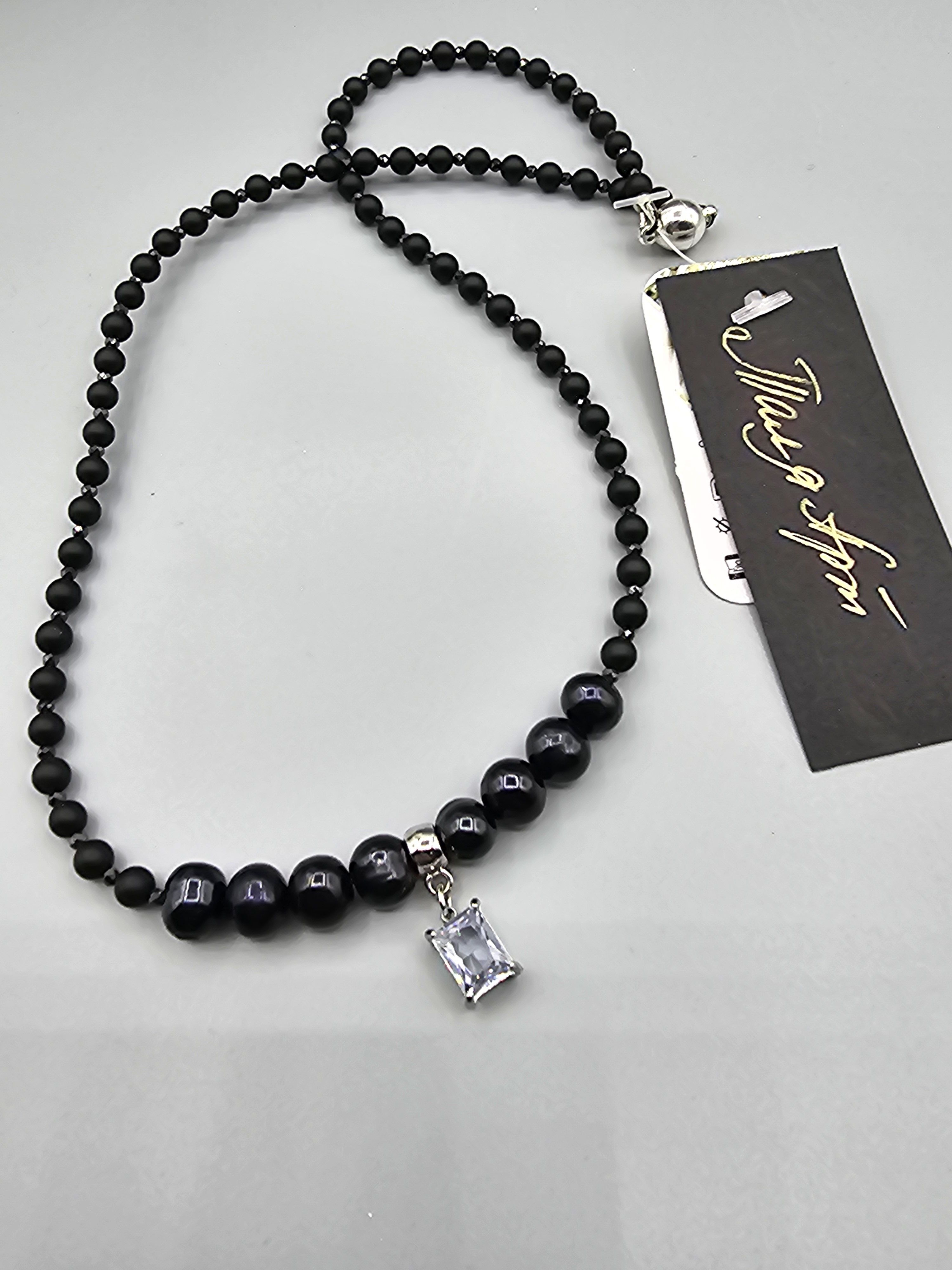 Ожерелье состоит из маленьких бусин матового агата, больших бусин в центре натурального жемчуга, образуя узор. Агат разряжен "искорками" кварца, а центр ожерелья на круглой бусине висит небольшая хрустальная квадратная подвеска.
