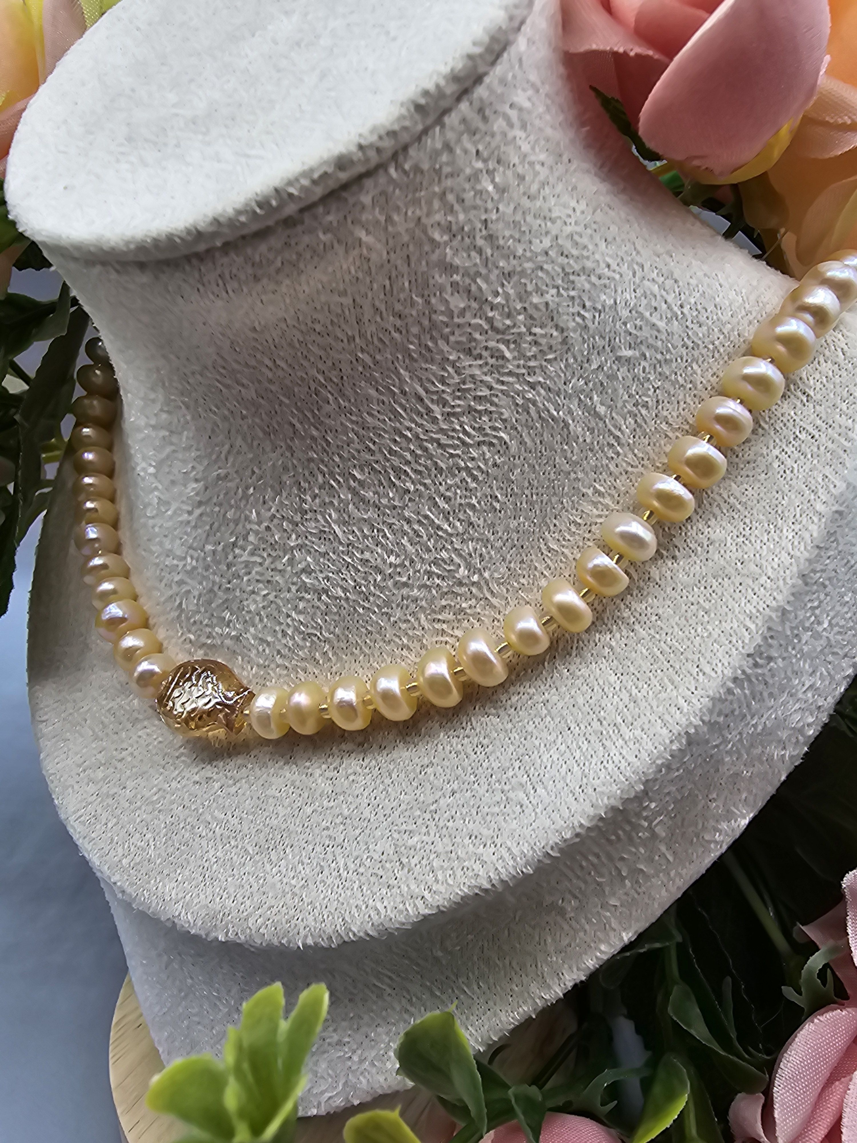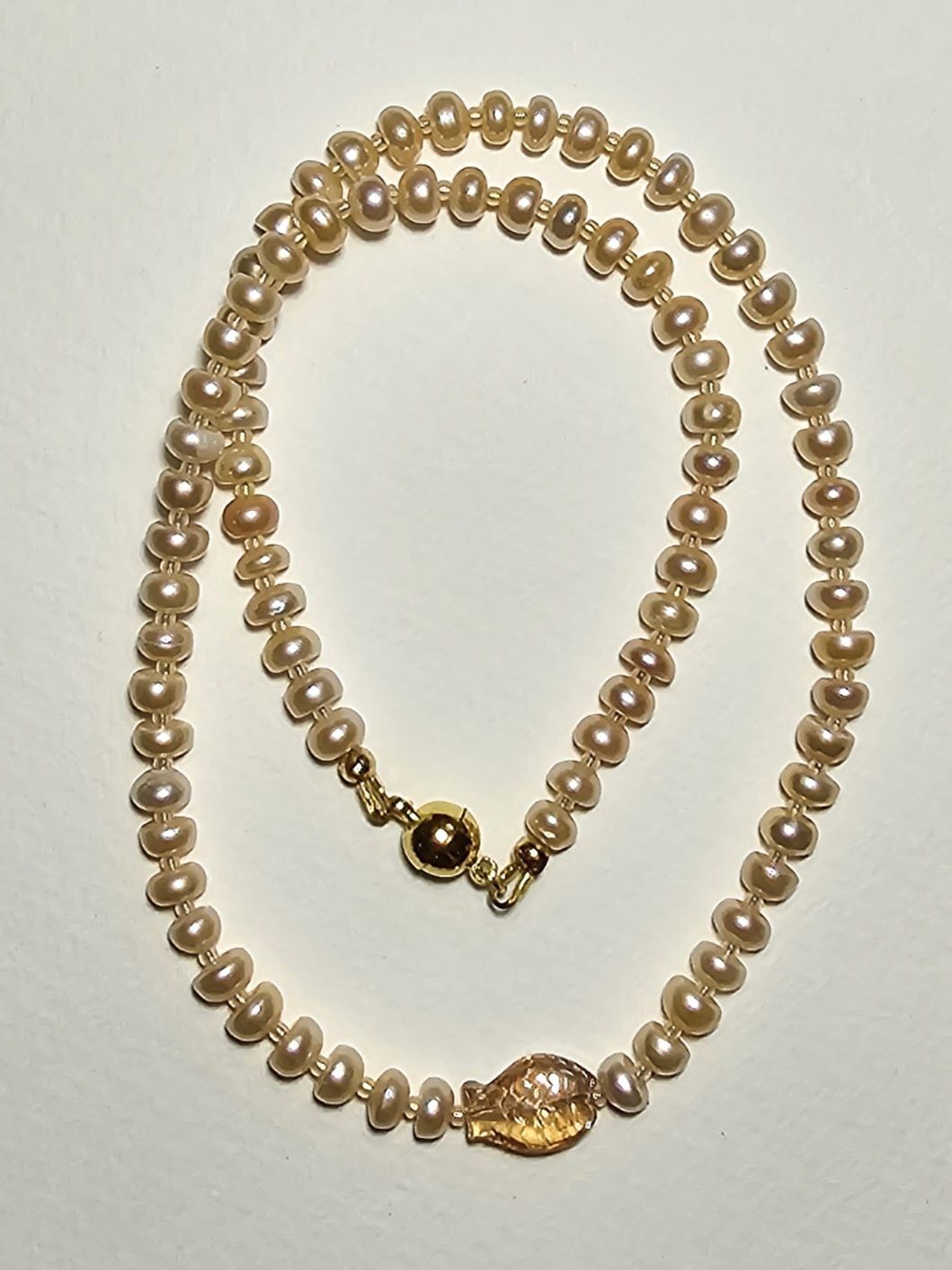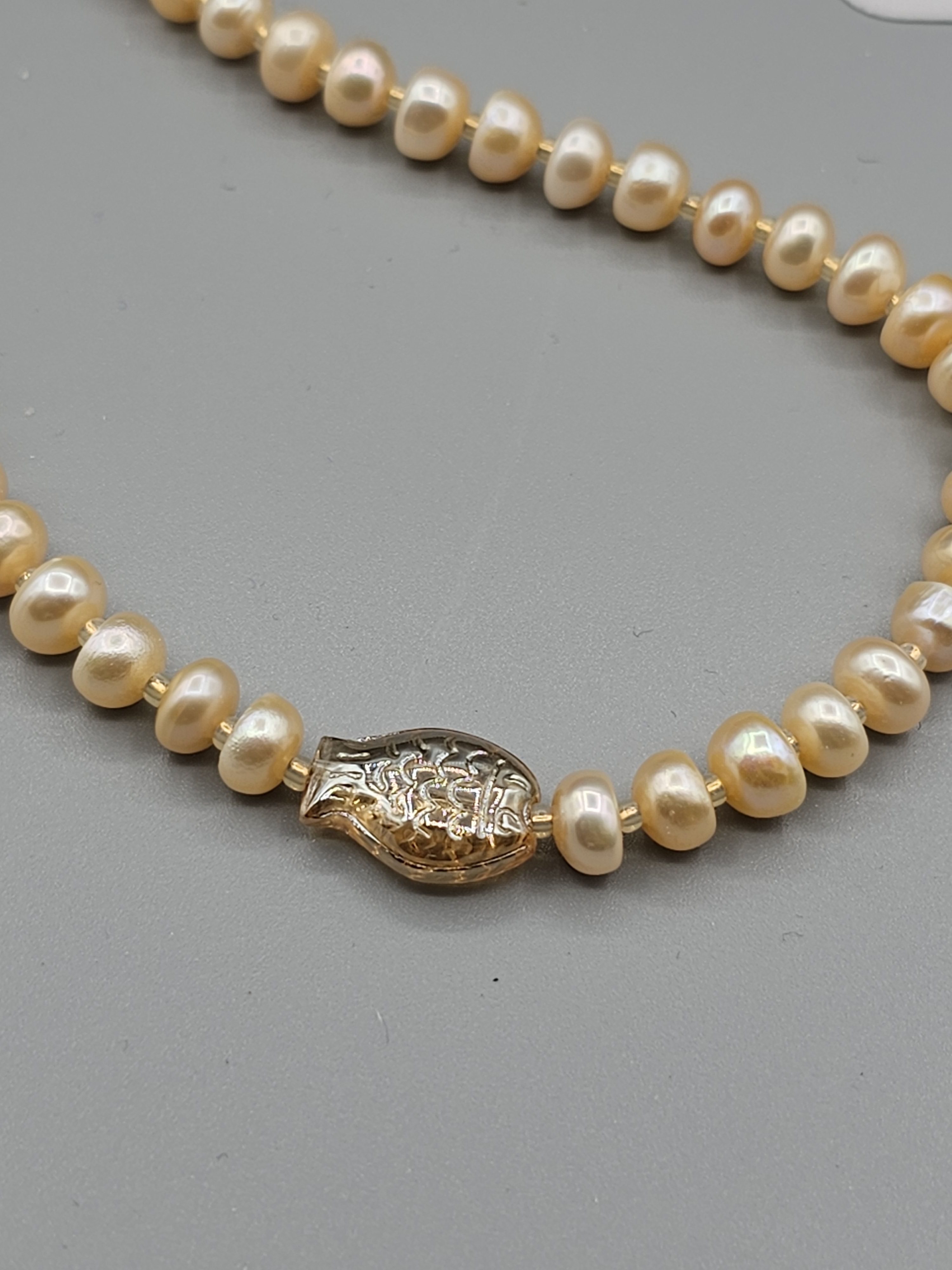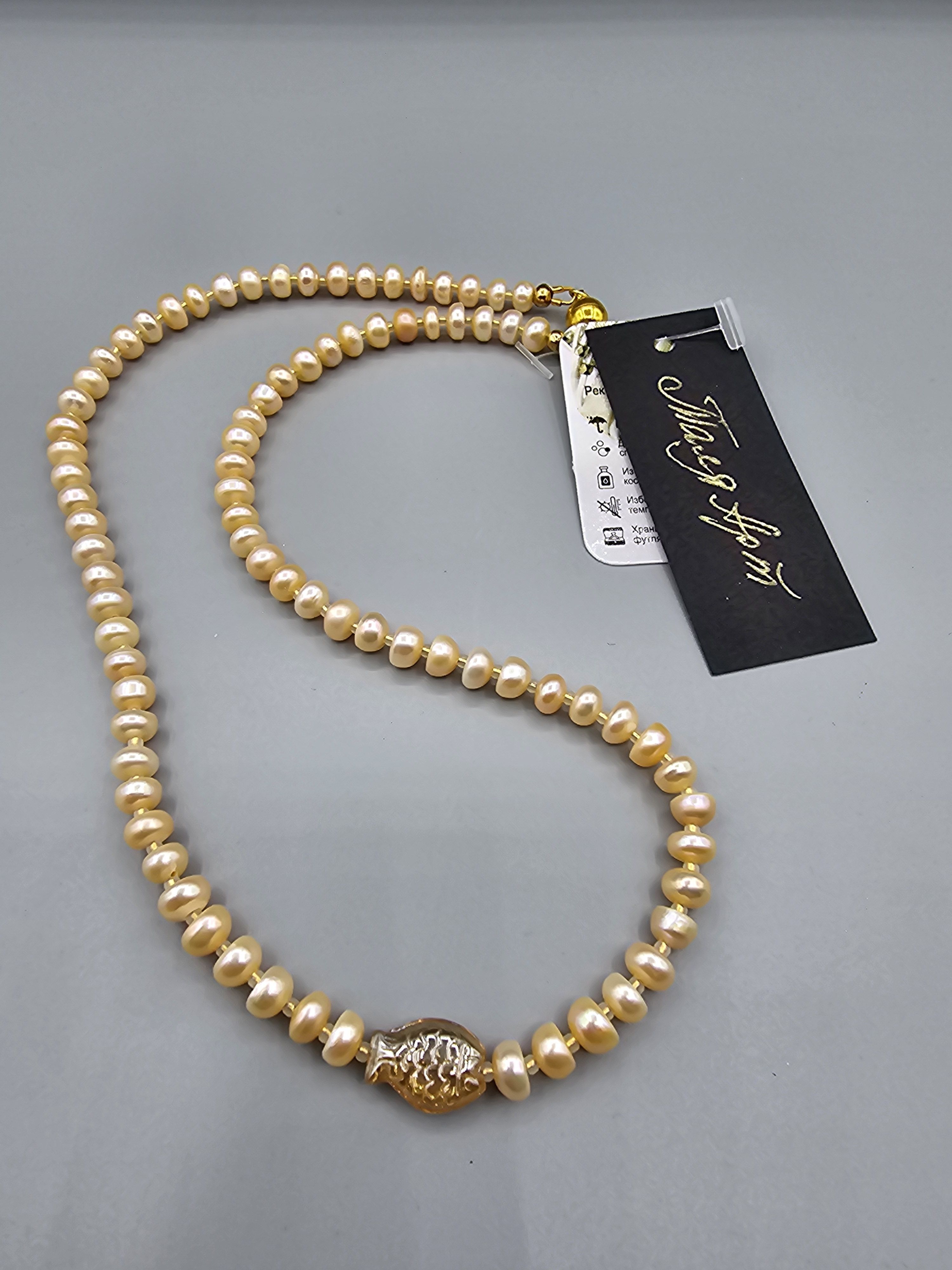 Рыбка из Австрийского стекла дополнена японским бисером и натуральным жемчугом розовато-оранжевого или даже абрикосового цвета и необычной формы. Магнитная застёжка золотистого цвета позволит одеть и снять колье за секунды.