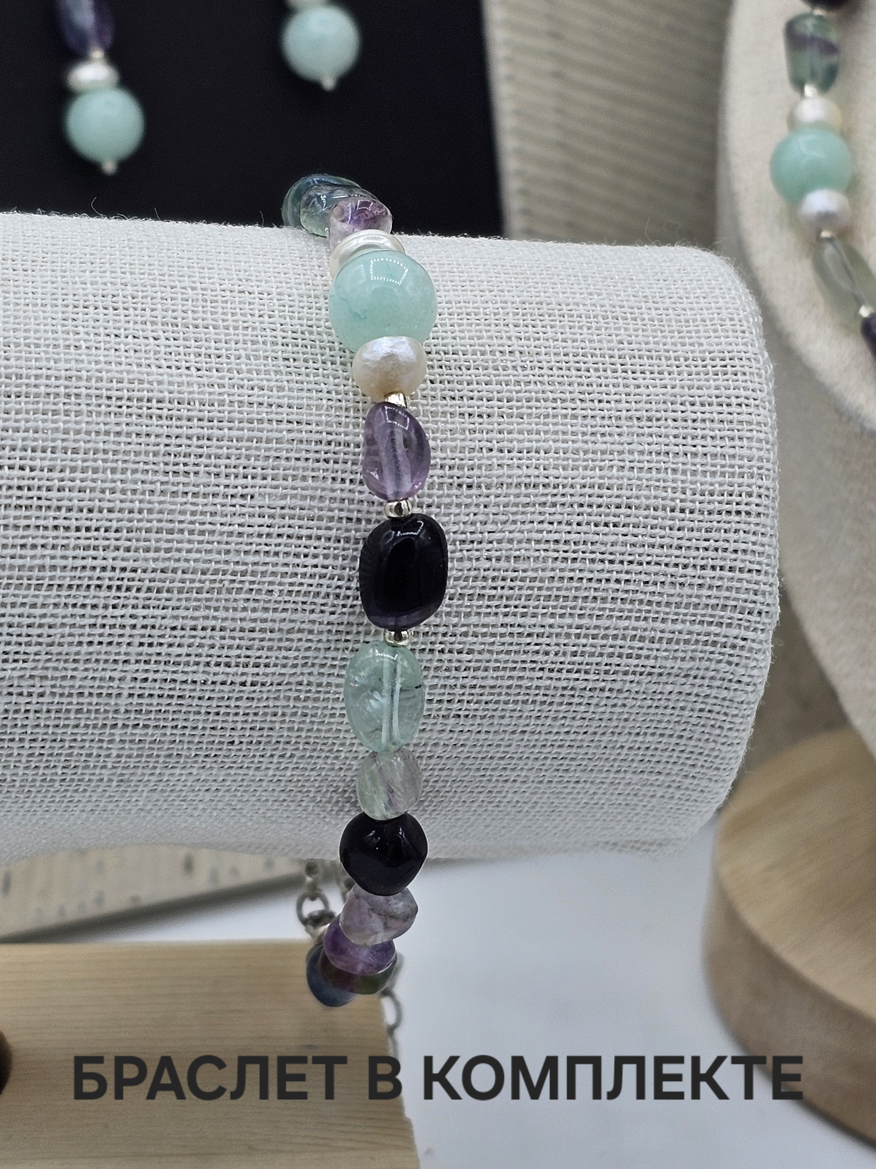 Благородные оттенки переливаются мягкими бликами света, создавая эффект невидимости рукоделия. Безупречное качество исполнения и внимание к деталям превращают каждую вещь в произведение искусства. В подарок к комплекту идет лаконичный браслет с акцентной барочной жемчужиной.