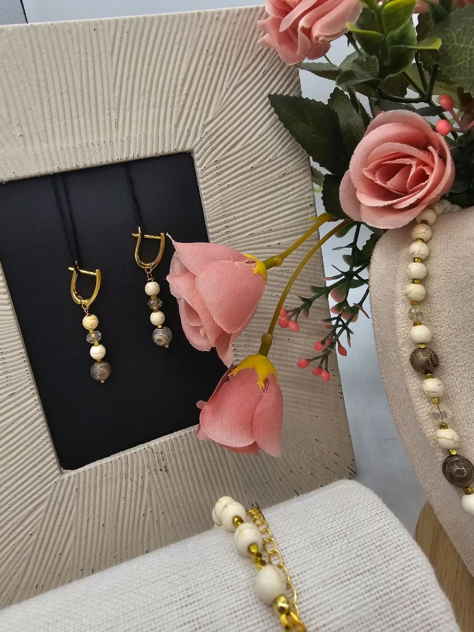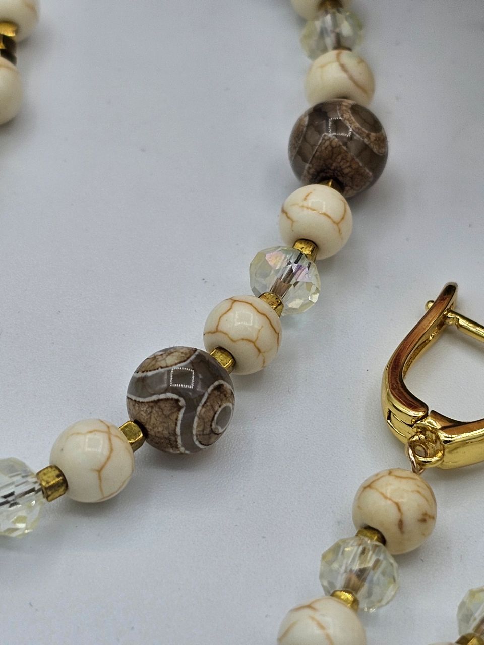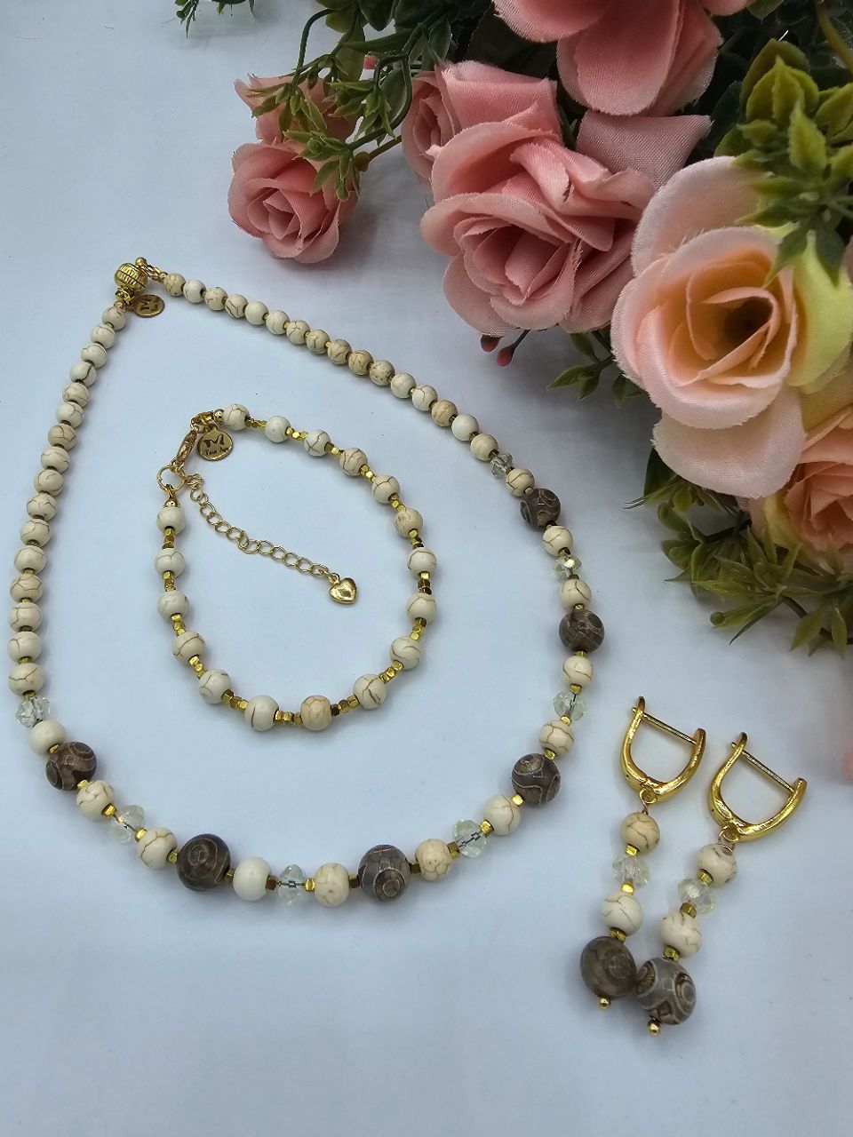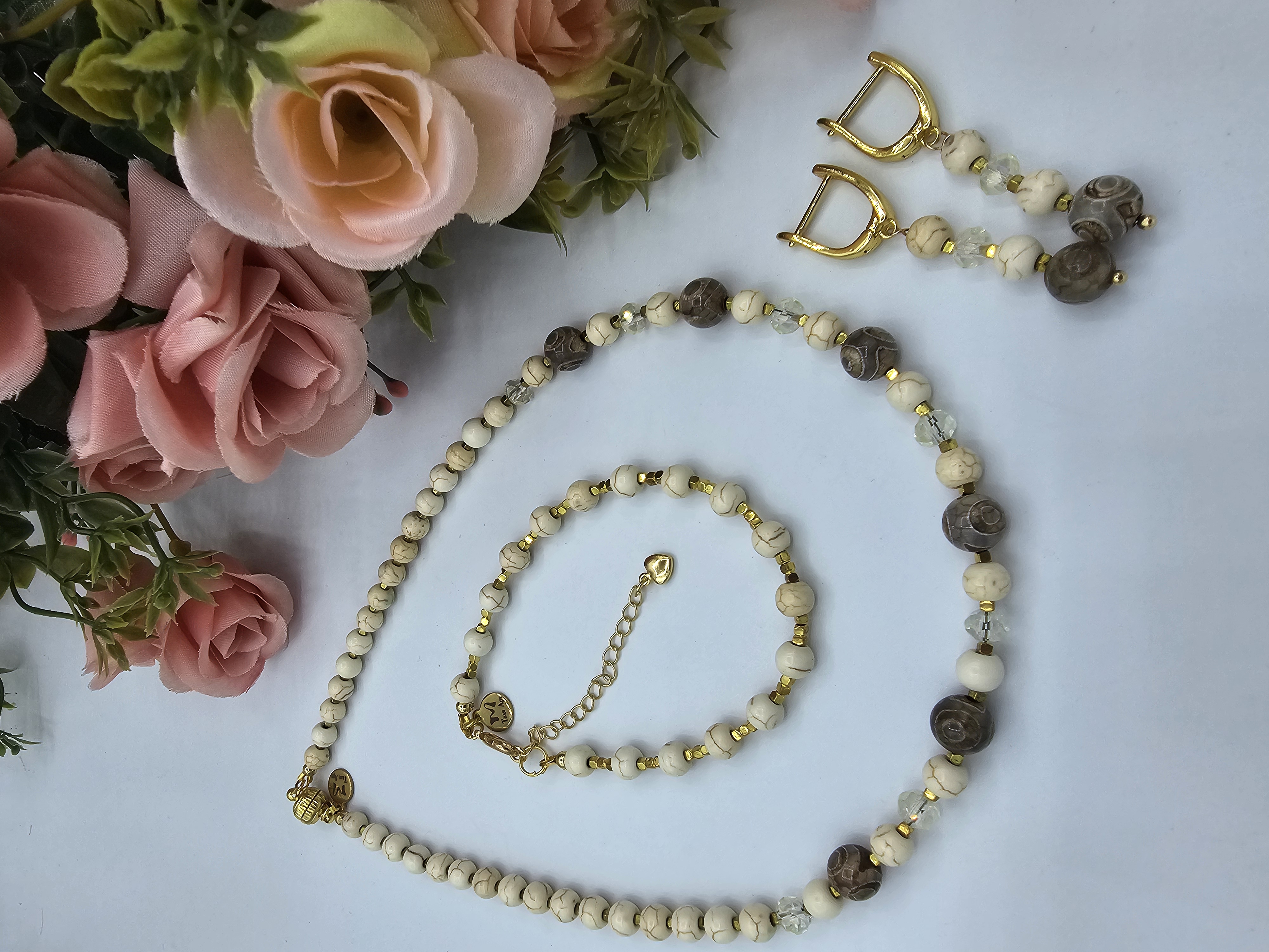 Авторский комплект «Сахара» — это стильное сочетание натуральных камней говлита, агата и солнечного хрусталя, подчеркивающее вашу индивидуальность. Строгий дизайн подчеркивает элегантность образа, а подарочные серьги в комплекте придадут вашему ансамблю завершенности. Носи вместе или сочетай с другими украшениями по настроению. Удобная длина колье – 42 см позволяет легко комбинировать его с любой одеждой.