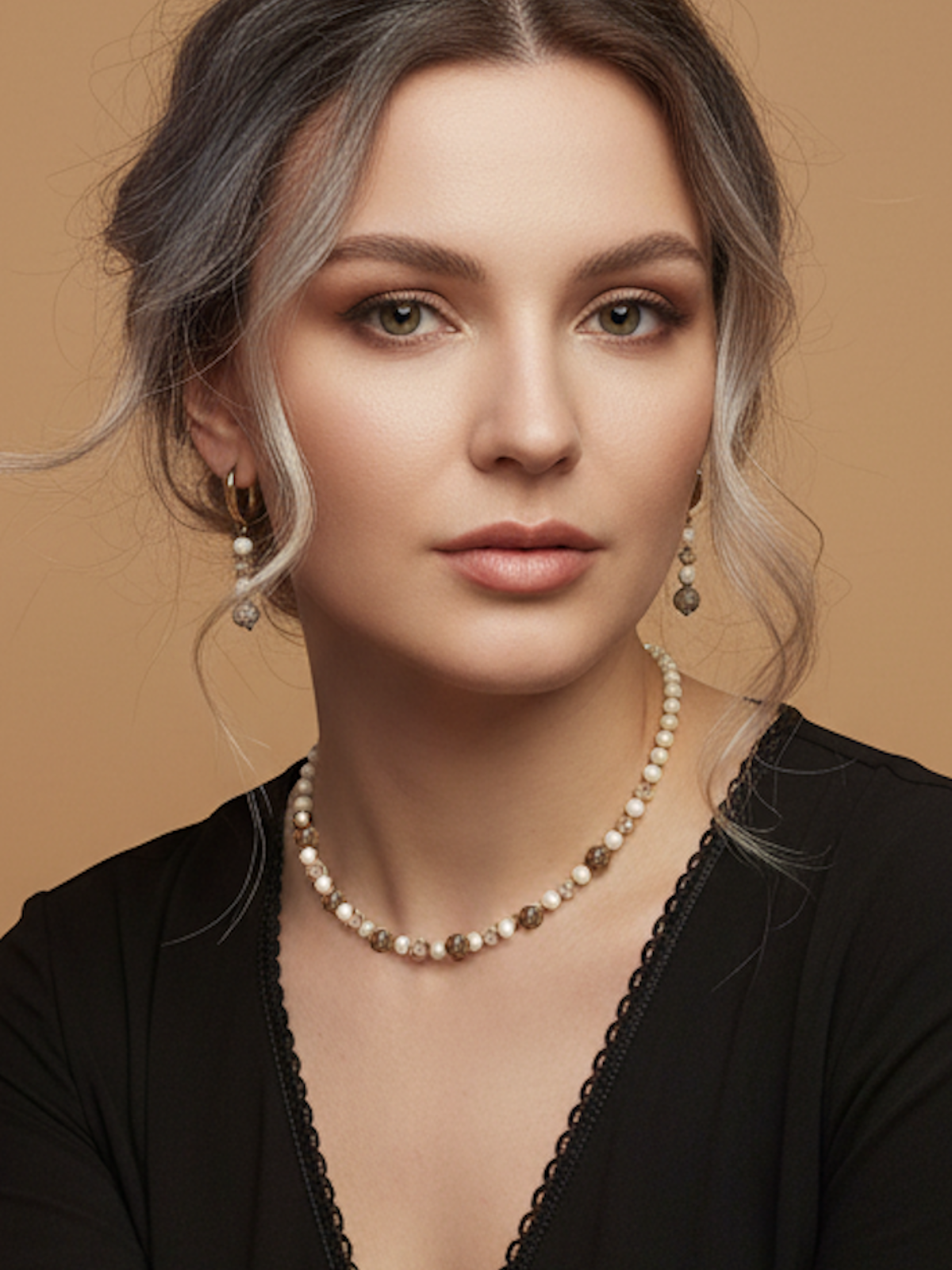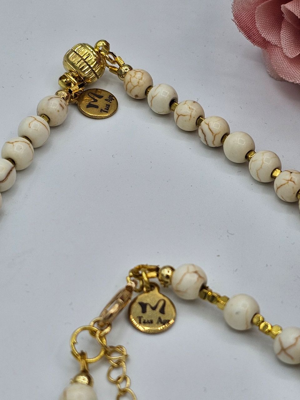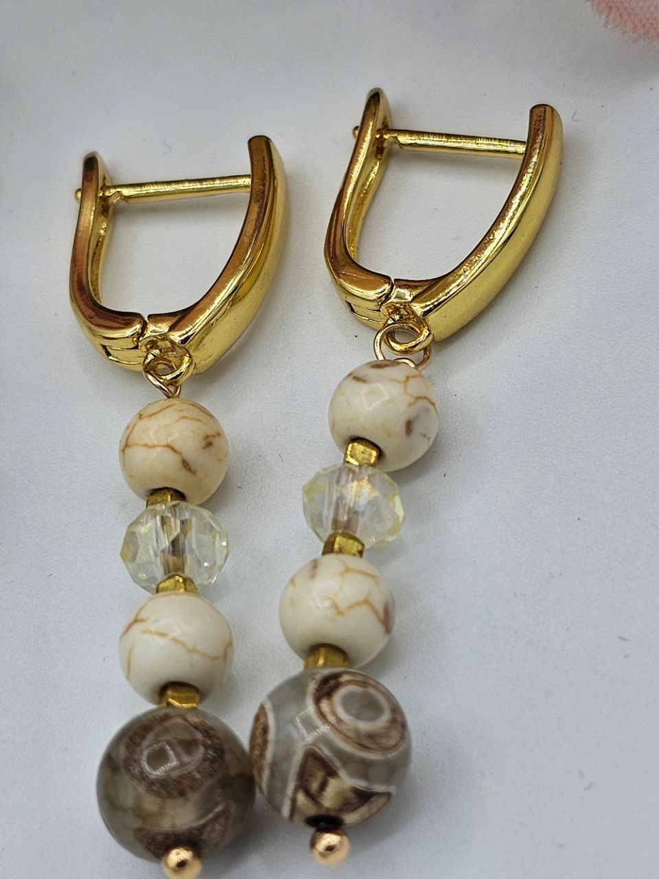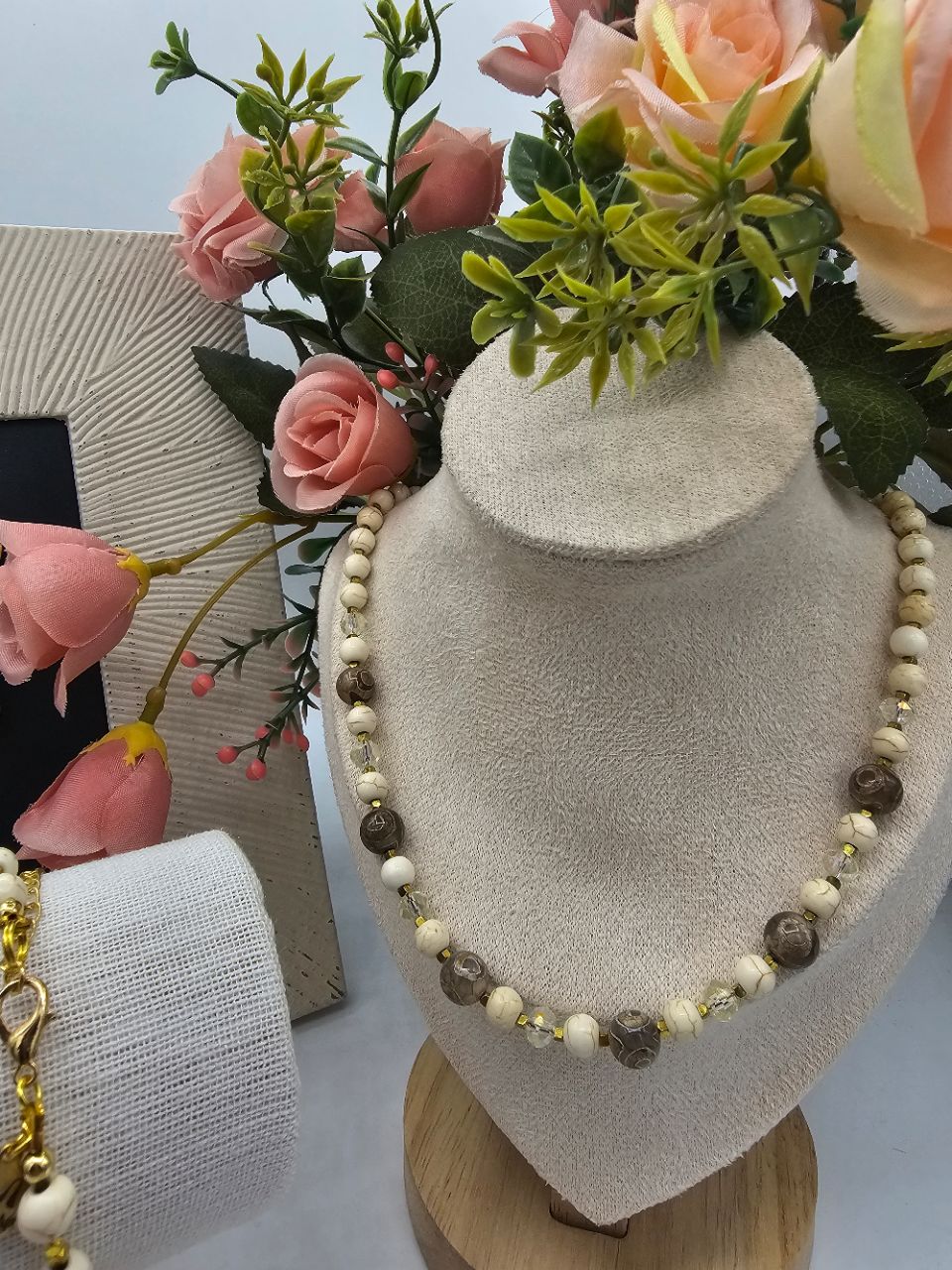 Авторский комплект «Сахара» — это стильное сочетание натуральных камней говлита, агата и солнечного хрусталя, подчеркивающее вашу индивидуальность. Строгий дизайн подчеркивает элегантность образа, а подарочные серьги в комплекте придадут вашему ансамблю завершенности. Носи вместе или сочетай с другими украшениями по настроению. Удобная длина колье – 42 см позволяет легко комбинировать его с любой одеждой.