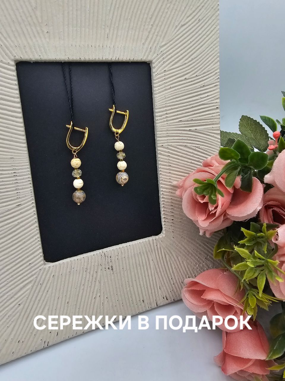 Комплект включает колье, браслет и серьги, выполненные вручную. Для надежности браслет и колье собран на ювелирный тросик.