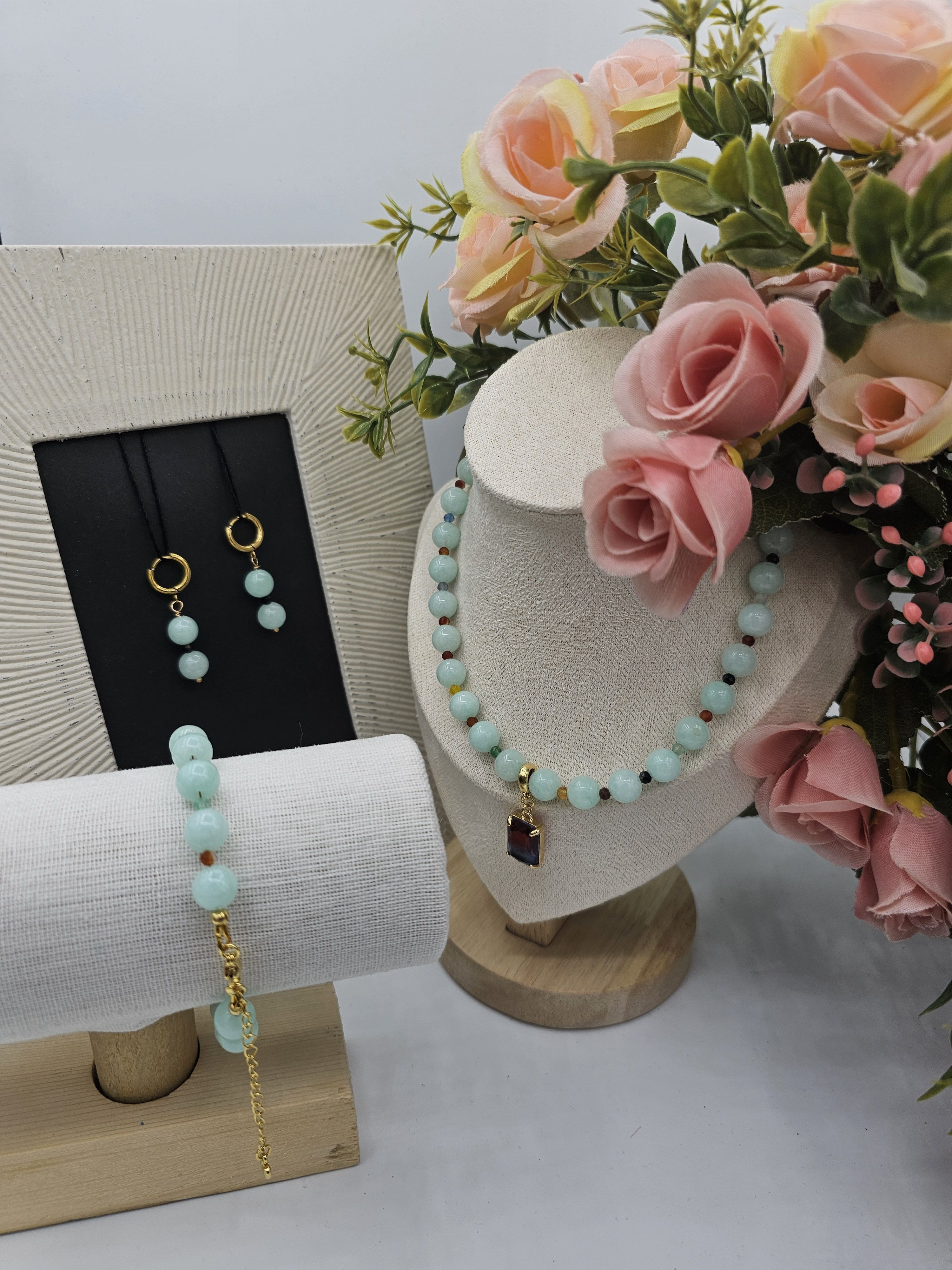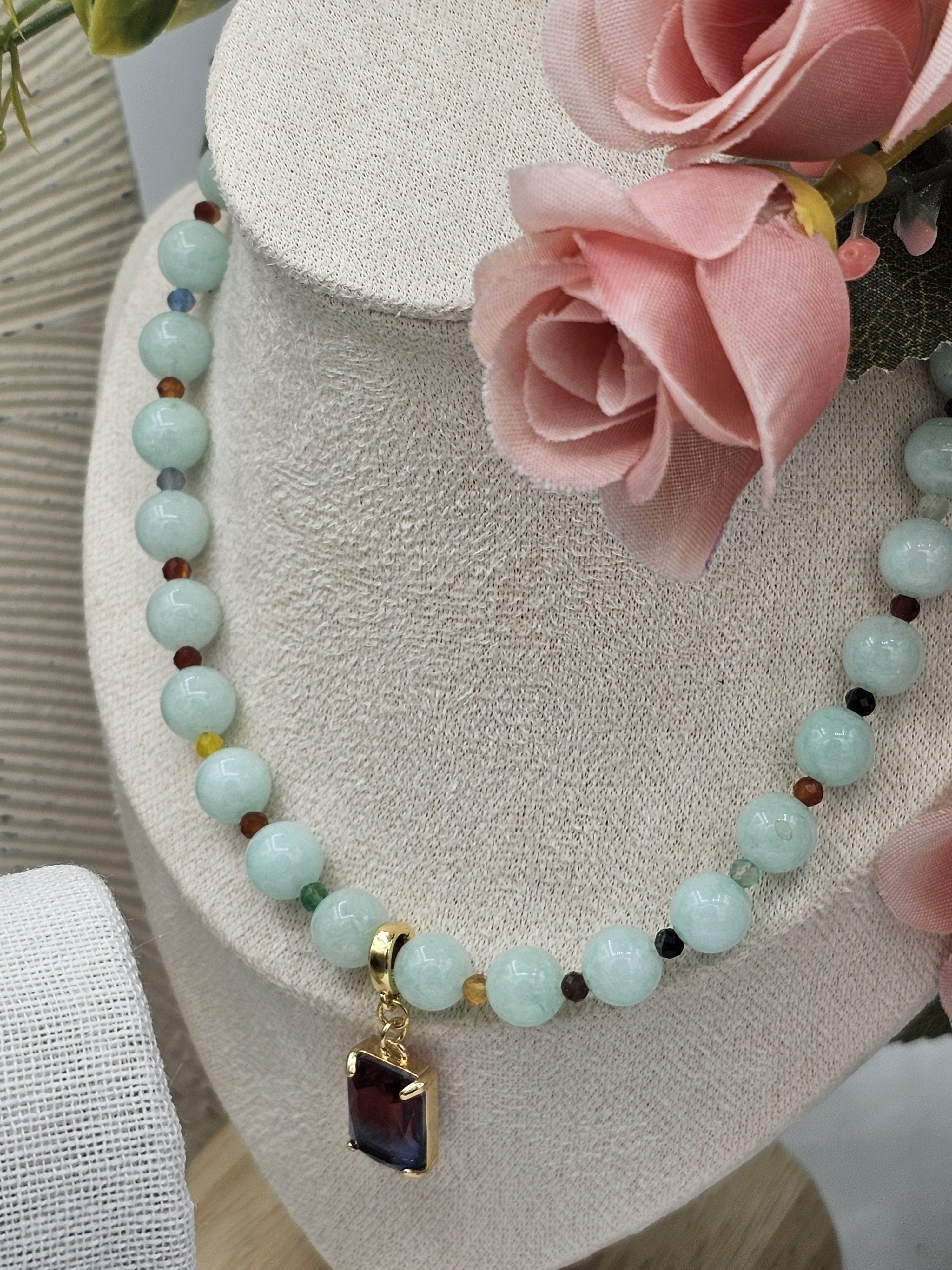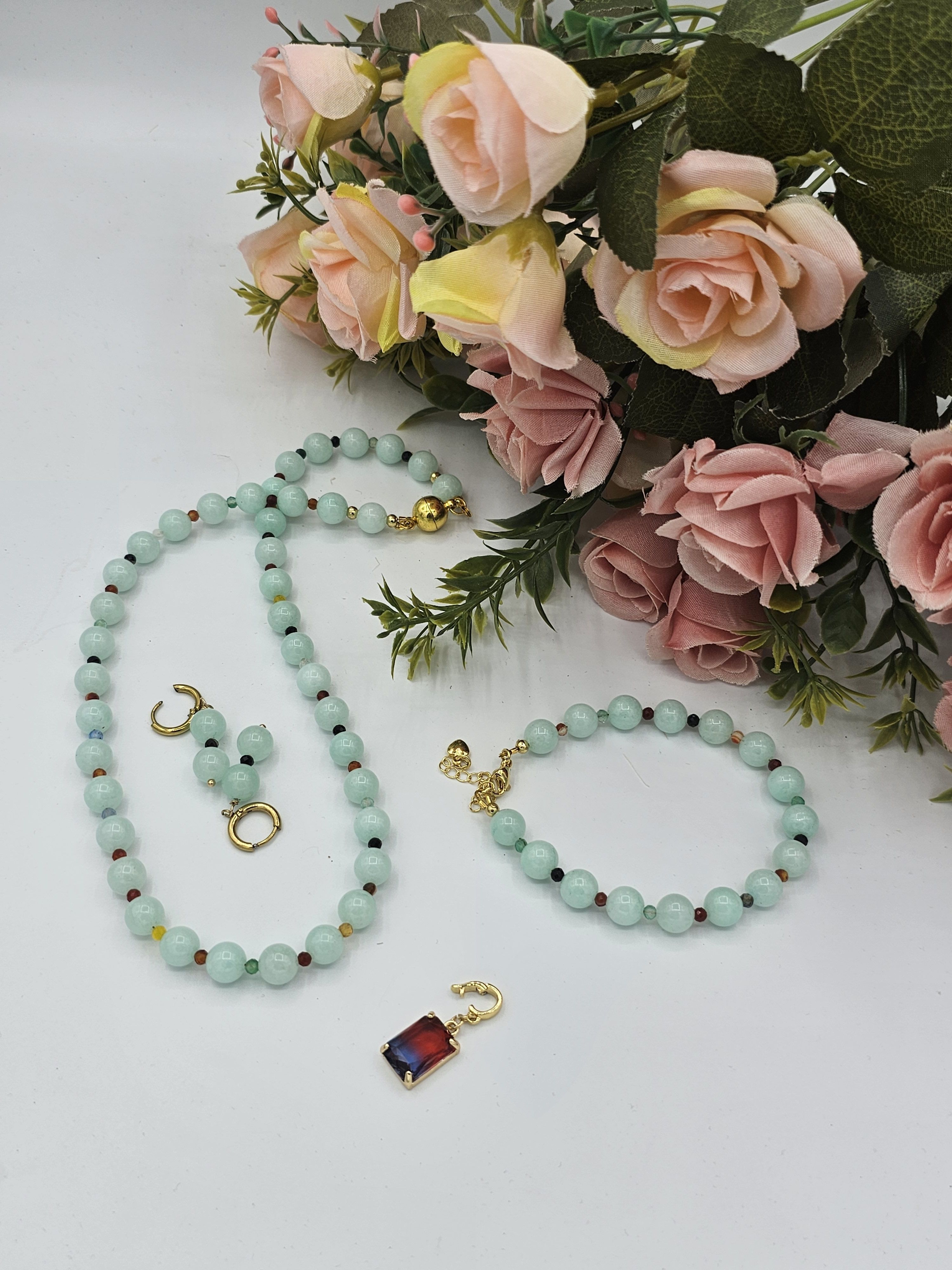 Колье и браслет ручной работы из круглого крупного Халцедона и граненых разноцветных Агатов. Двухцветный кулон из Австрийского стекла - сьемный.