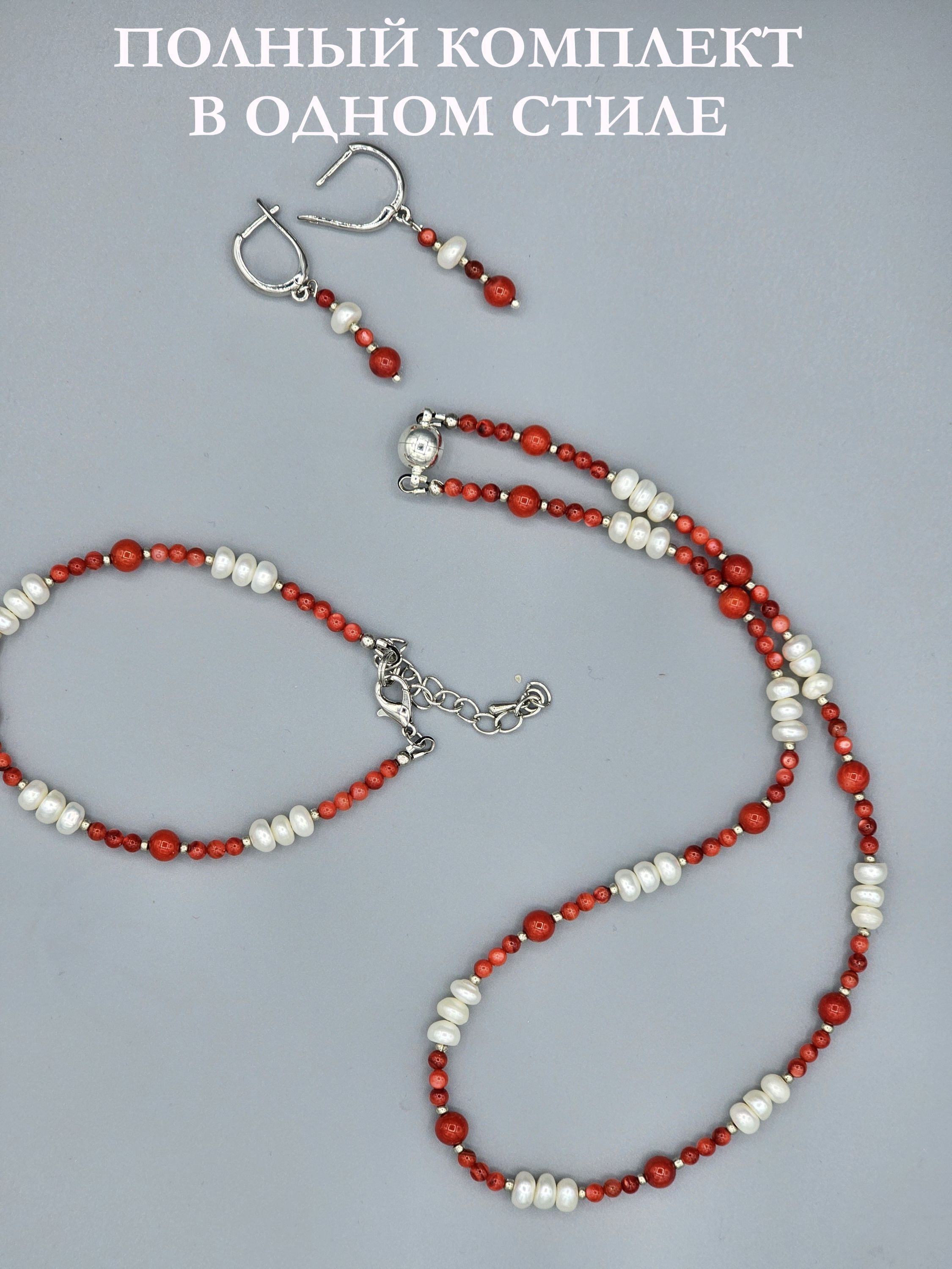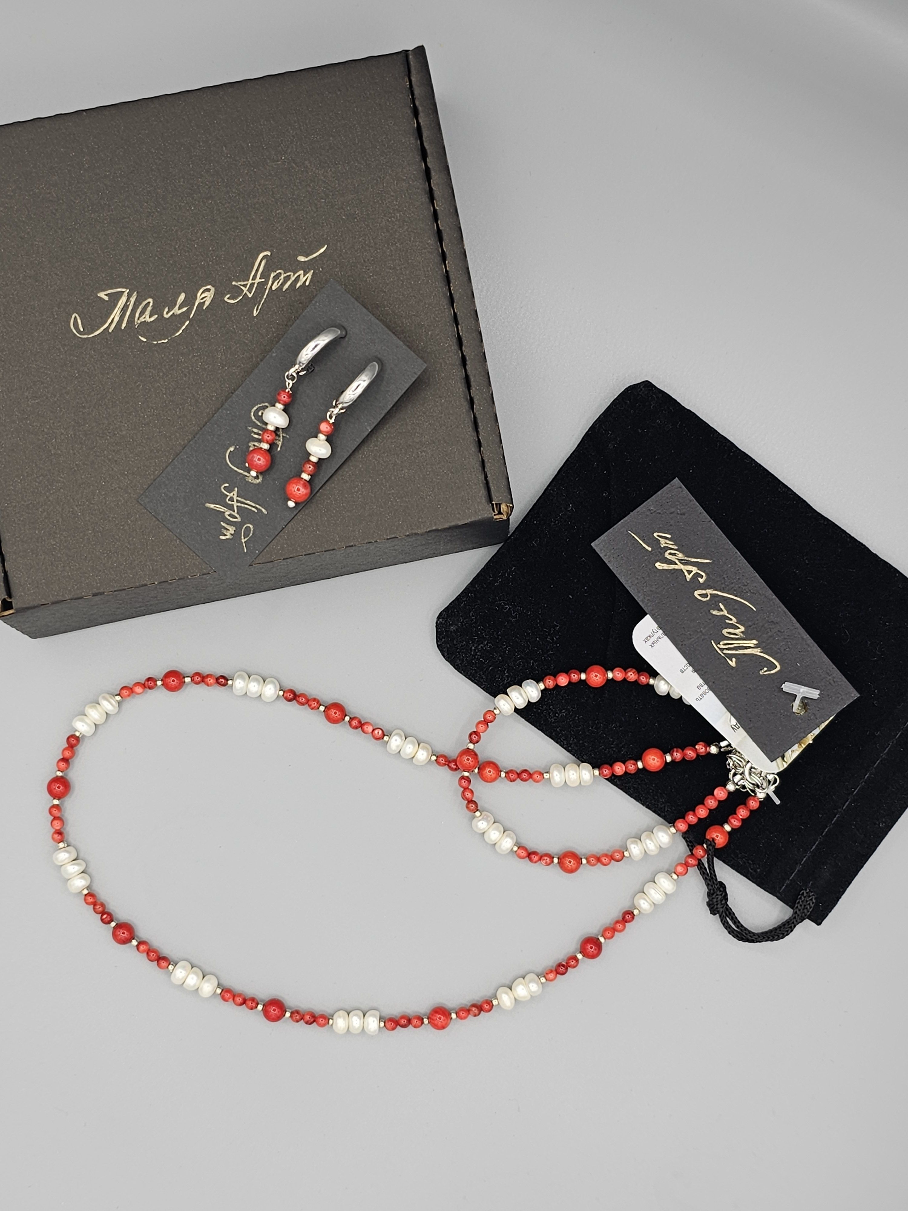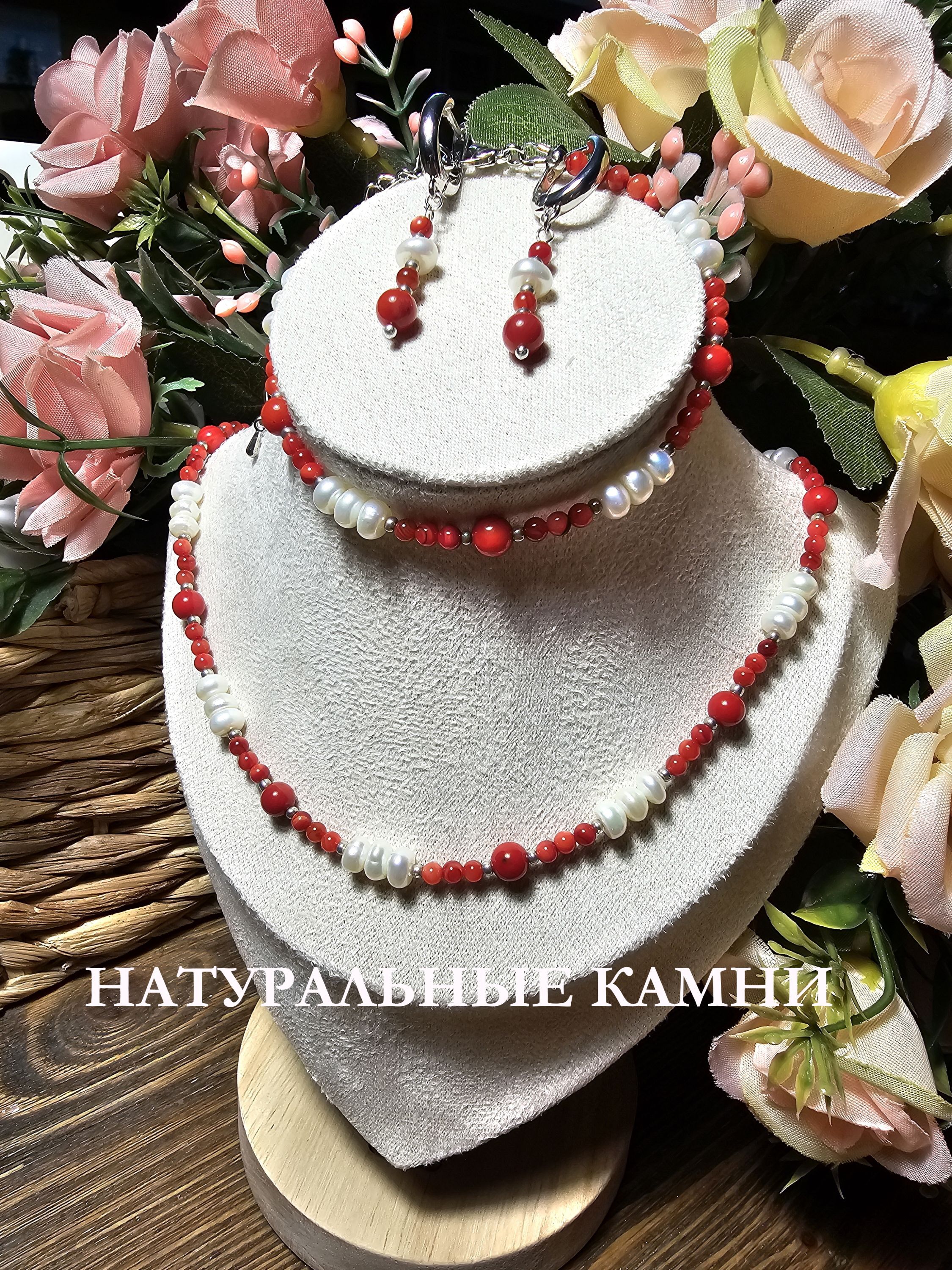 Колье и браслет ручной работы из натурального жемчуга, алого Коралла и бисера. Яркий, дерзкий и в тоже время очень нежный!