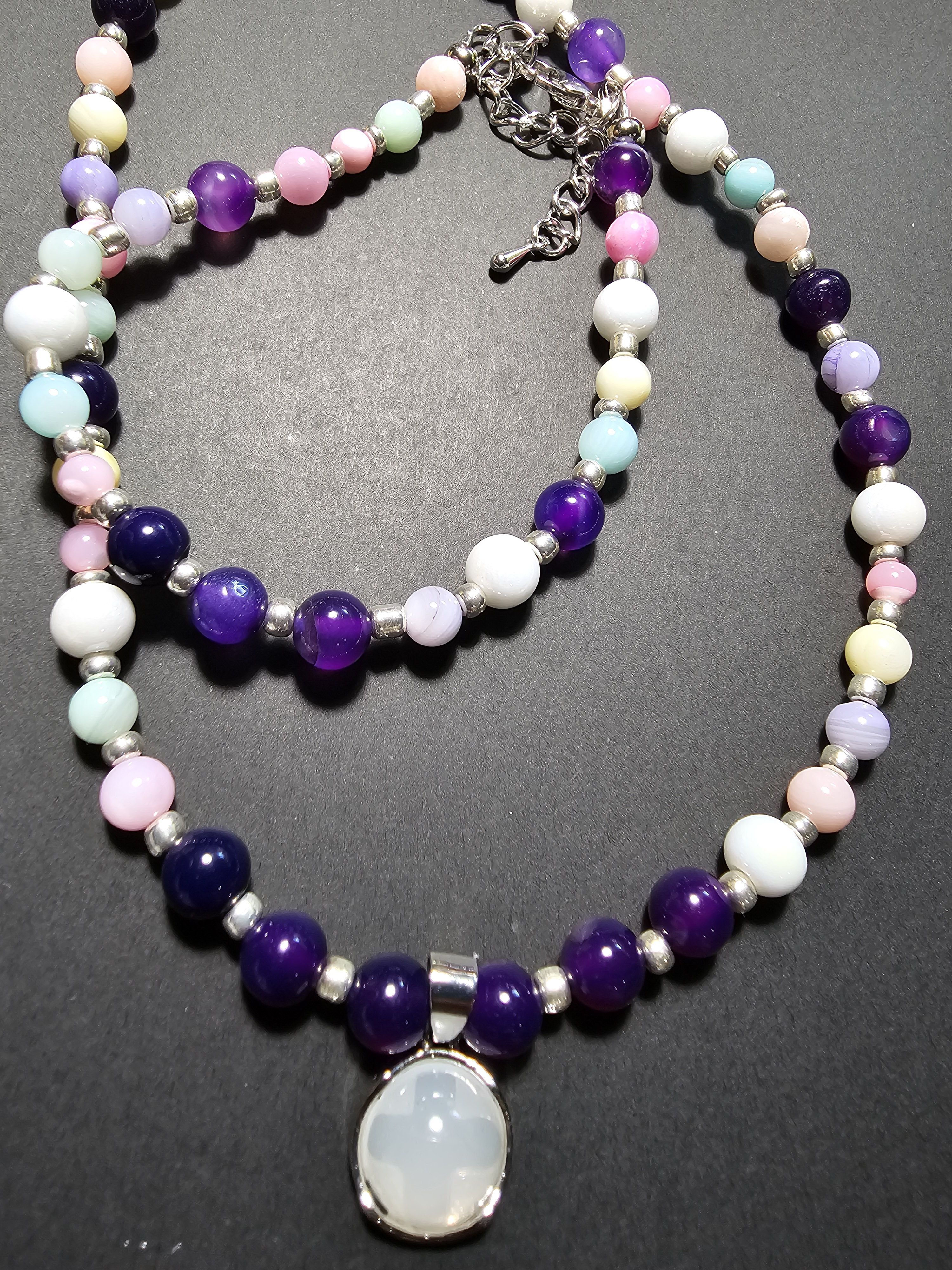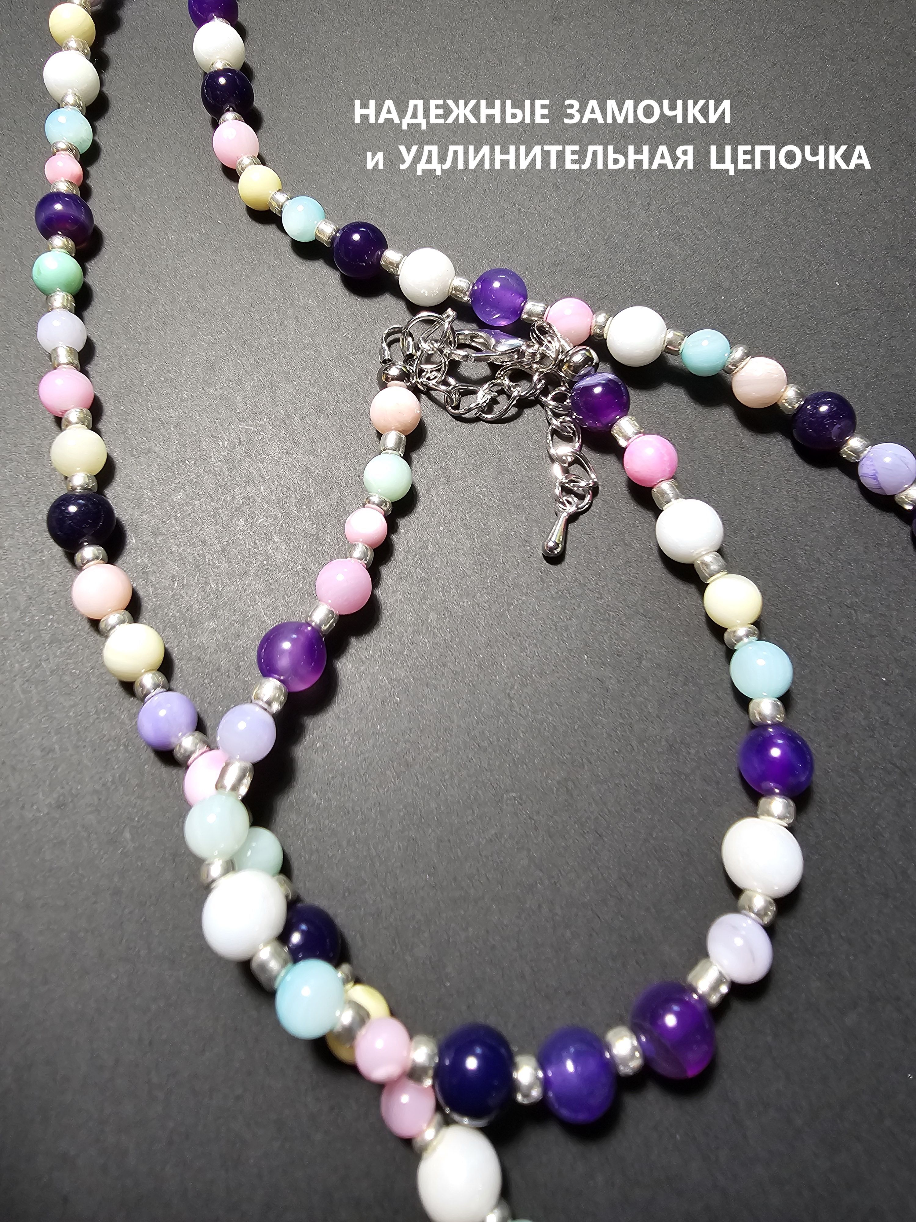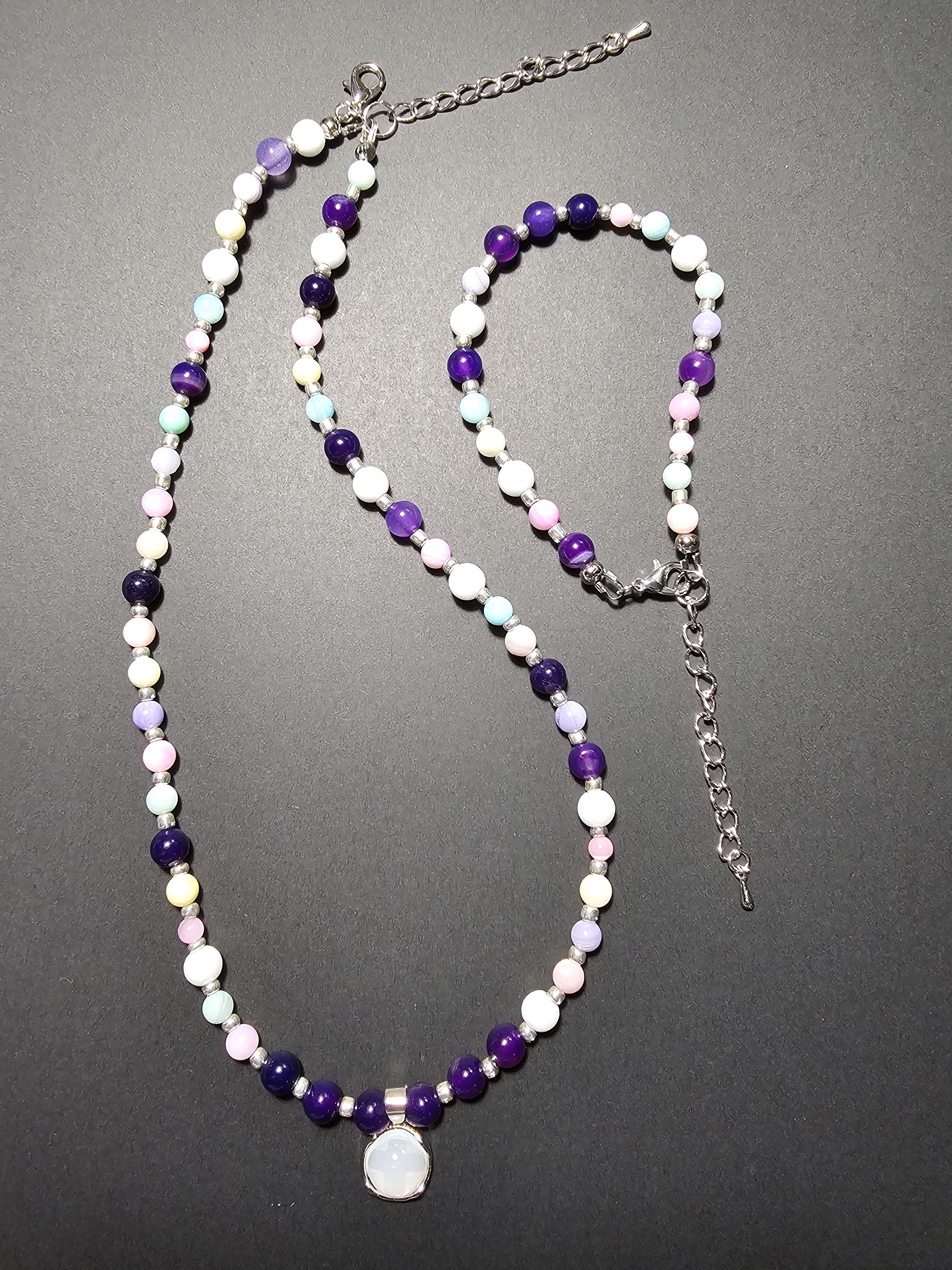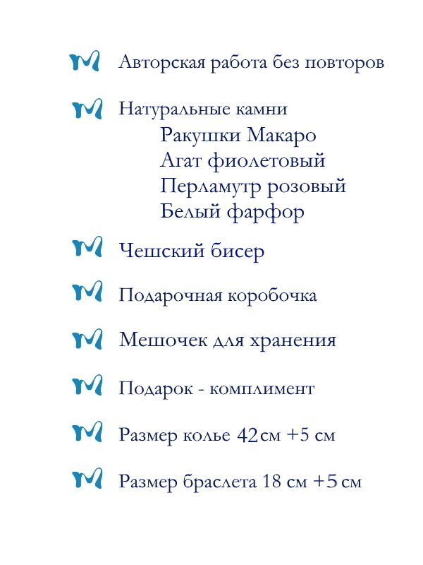 Колье и браслет ручной работы из бусин ракушек Макаро, фиолетового агата, розового перламутра с добавлением фарфоровых бусин и бисера. По центру колье украшено кулоном с искусственным лунным камнем.