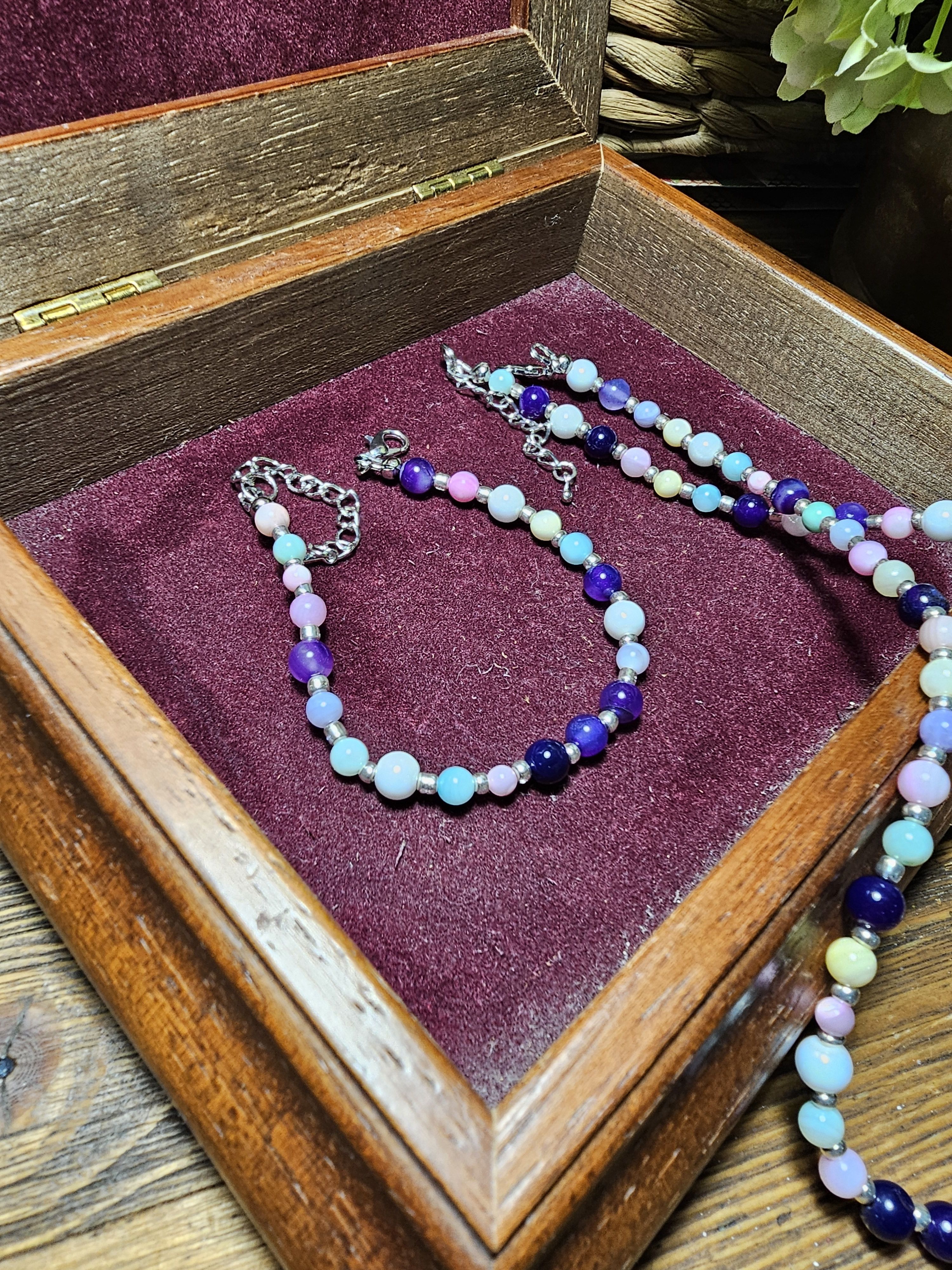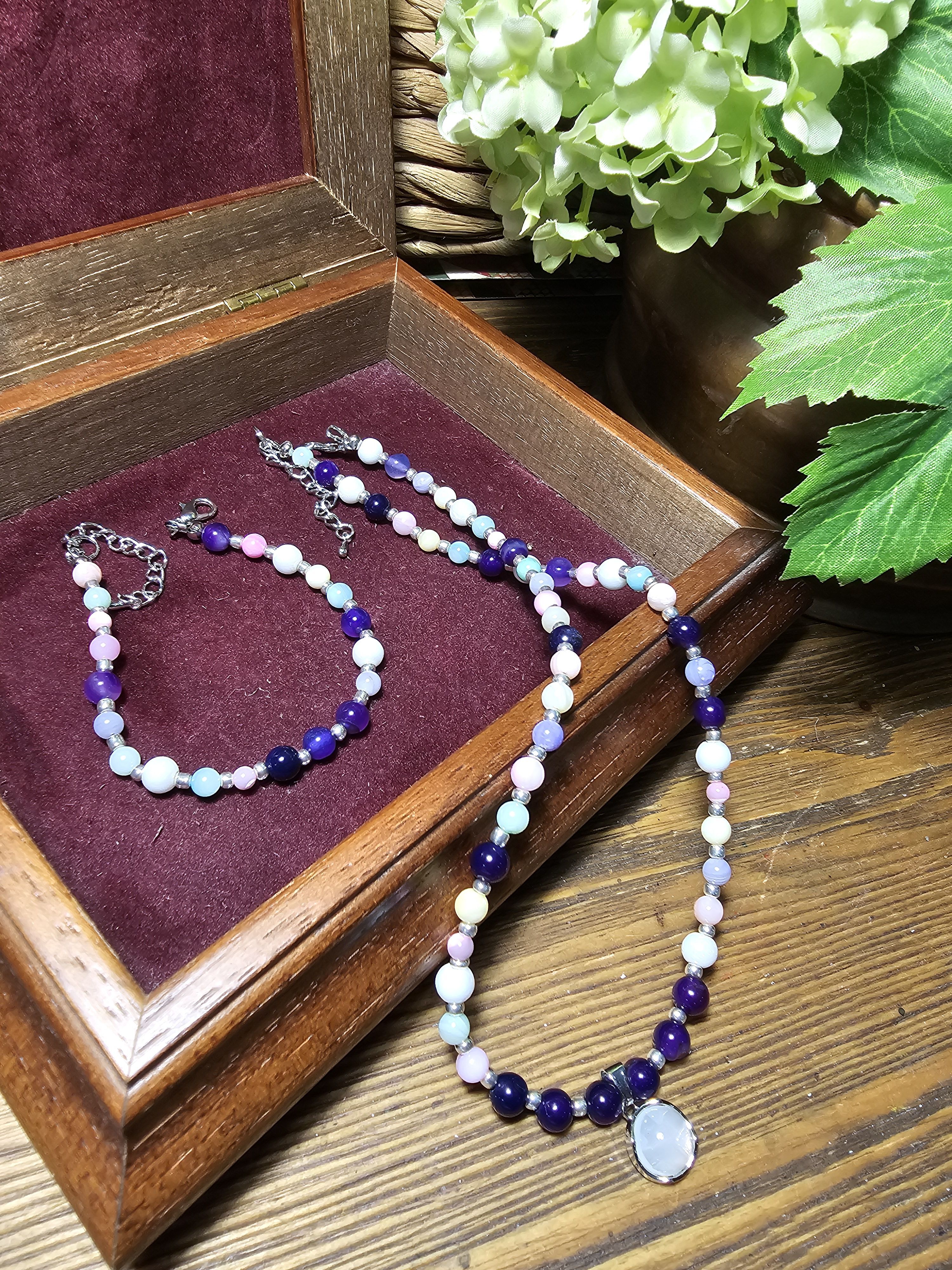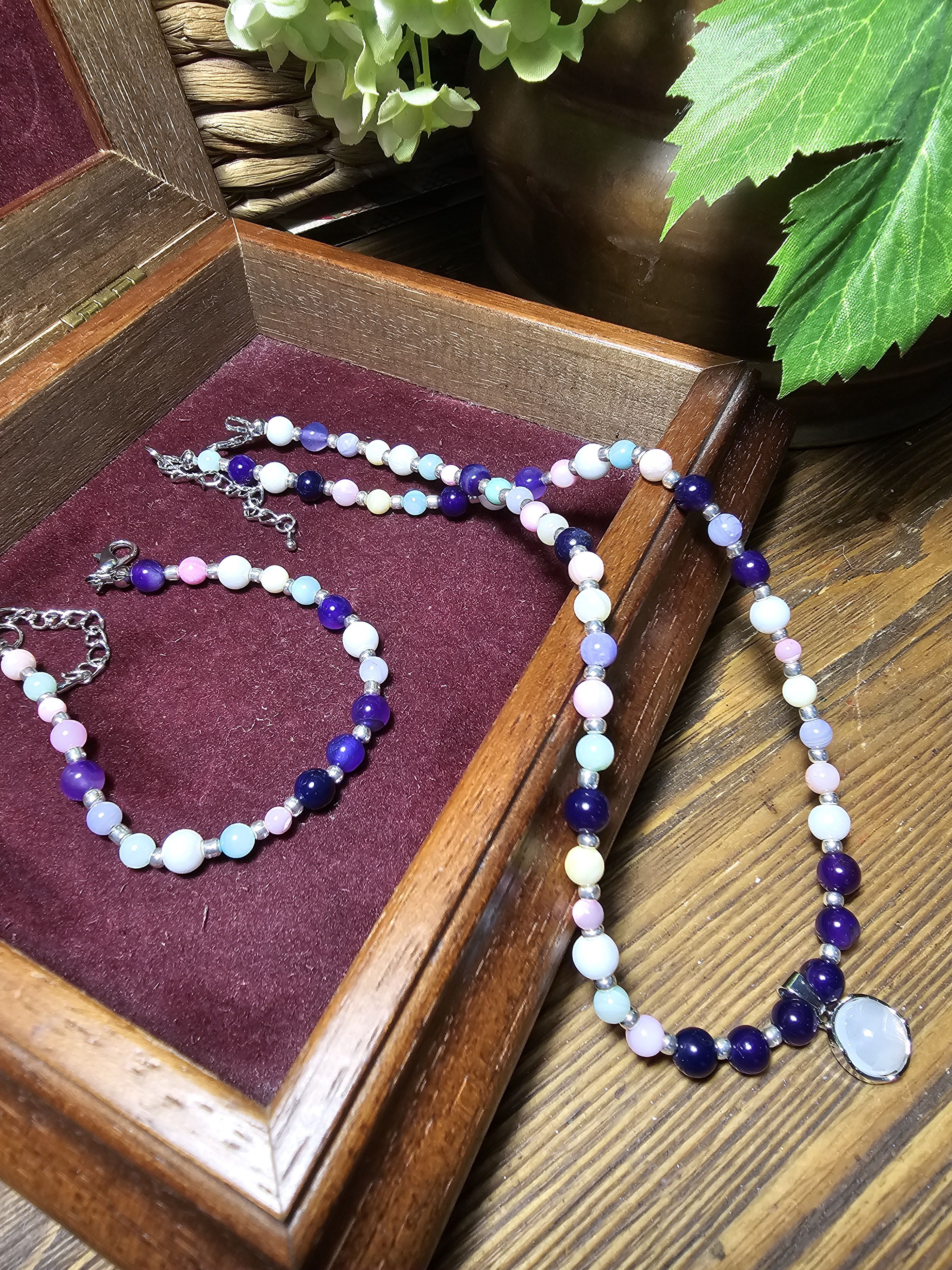 Колье и браслет ручной работы из бусин ракушек Макаро, фиолетового агата, розового перламутра с добавлением фарфоровых бусин и бисера. По центру колье украшено кулоном с искусственным лунным камнем.