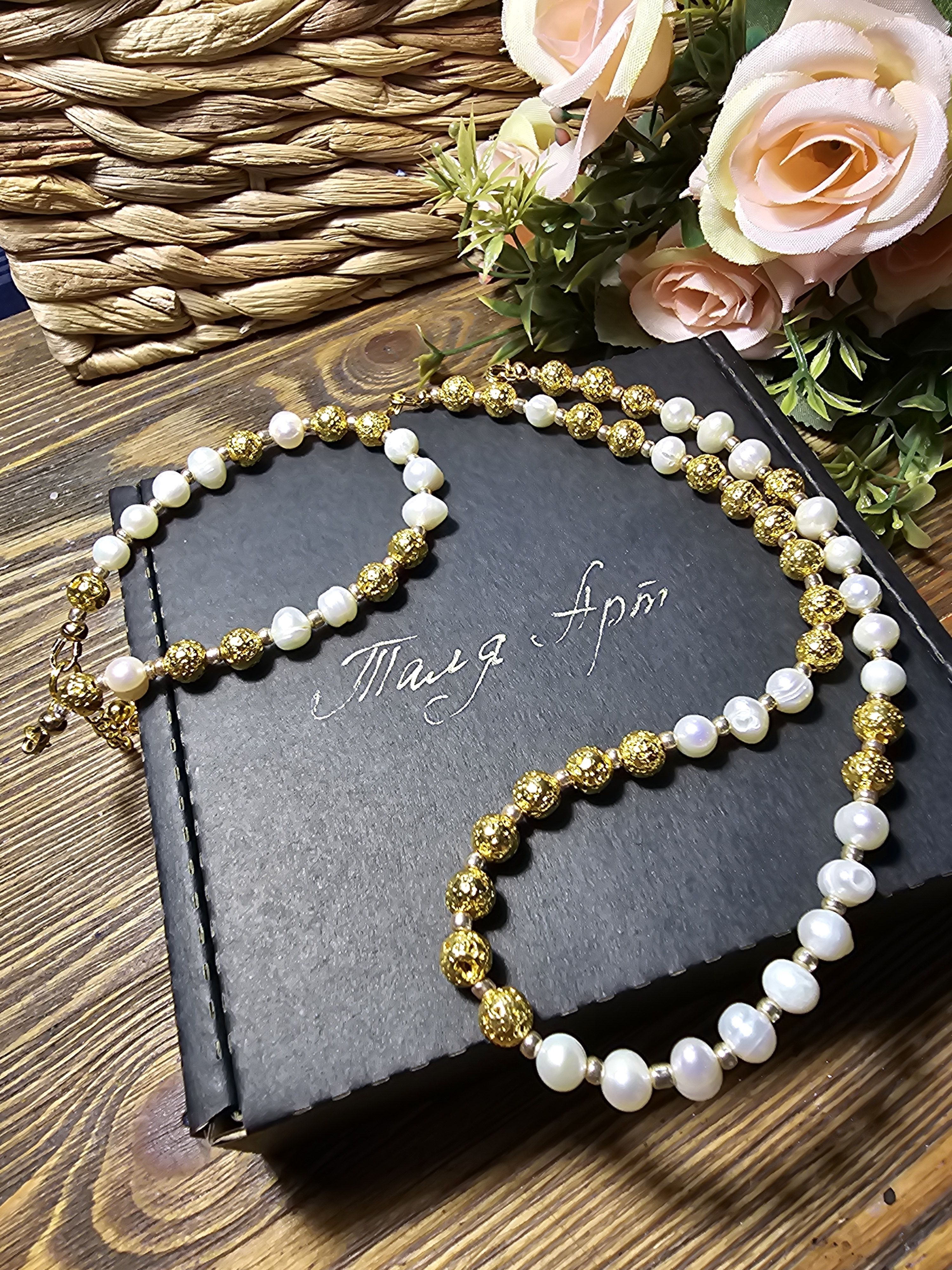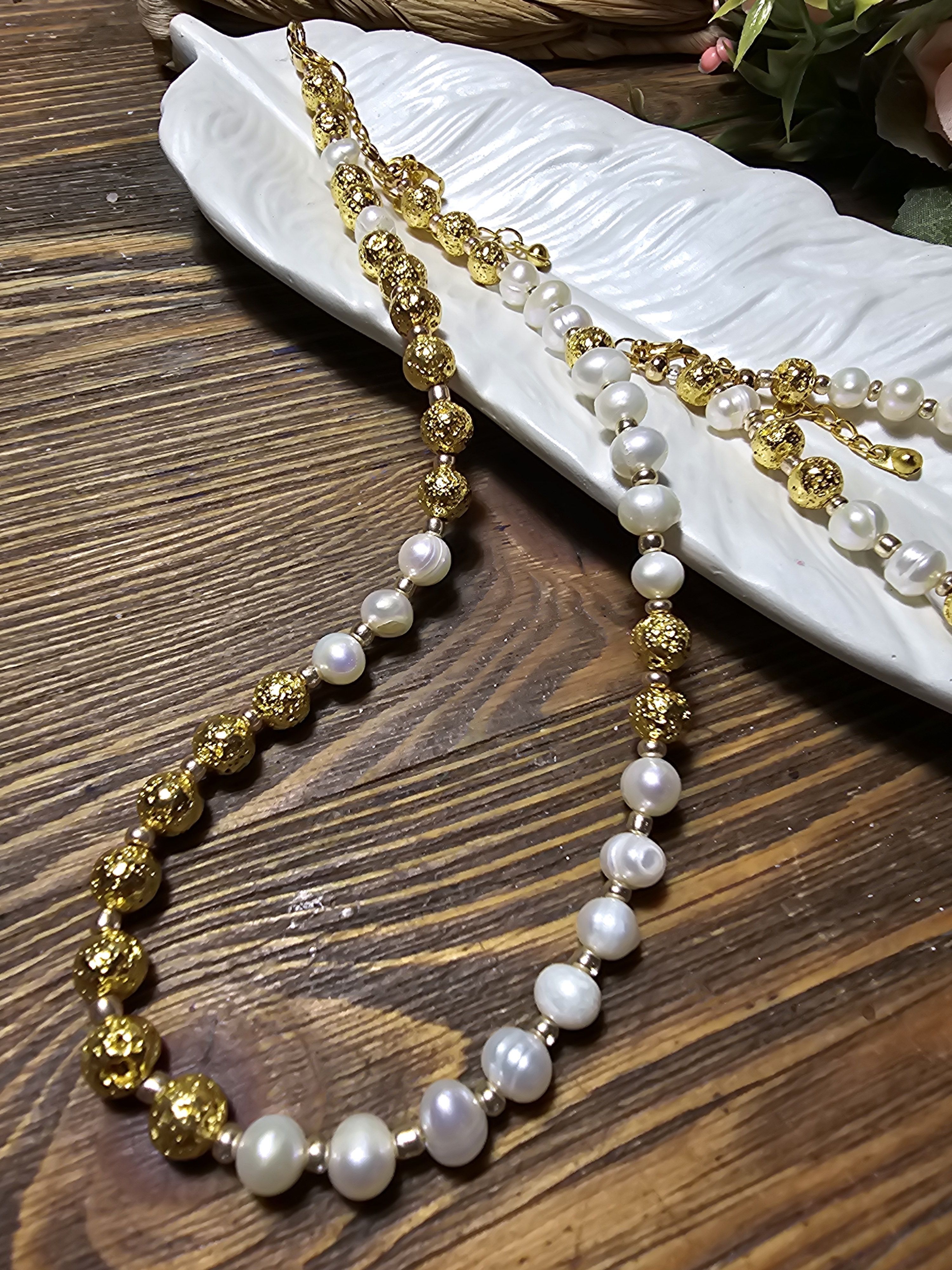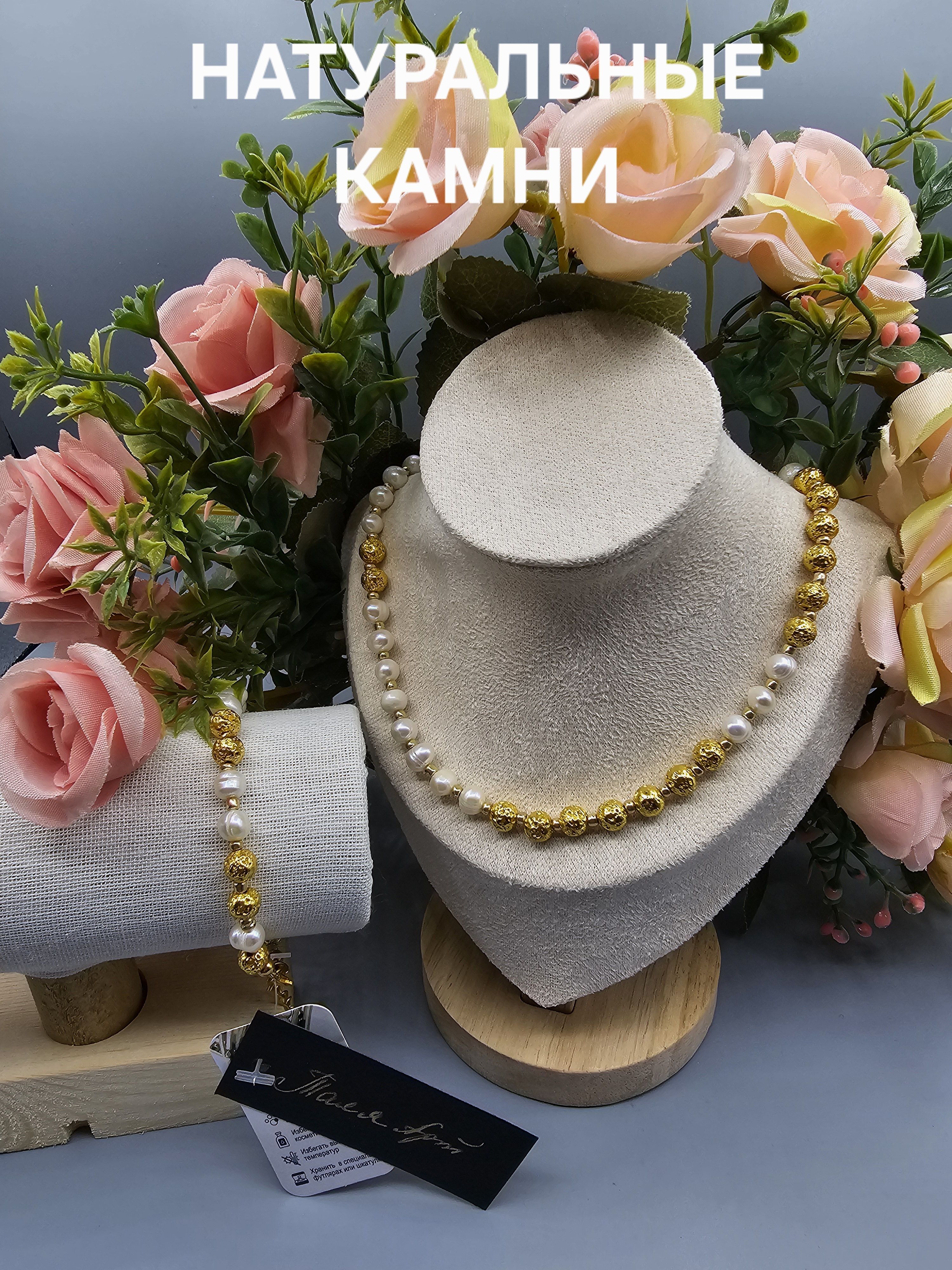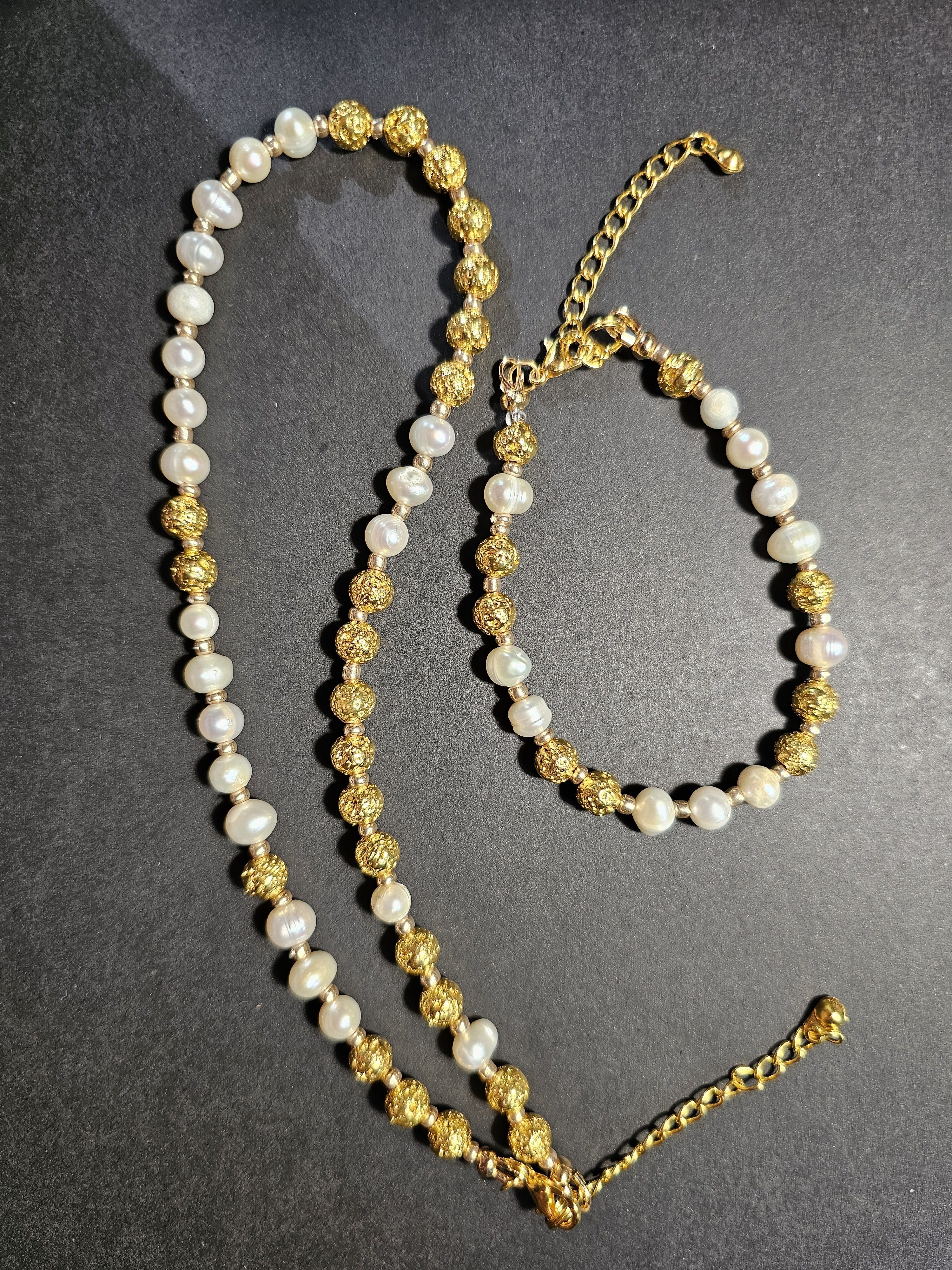 Колье и браслет ручной работы из круглого культивируемого пресноводного жемчуга и бусины вулканической лавы облагороженной с тонирующим эффектом под золото.