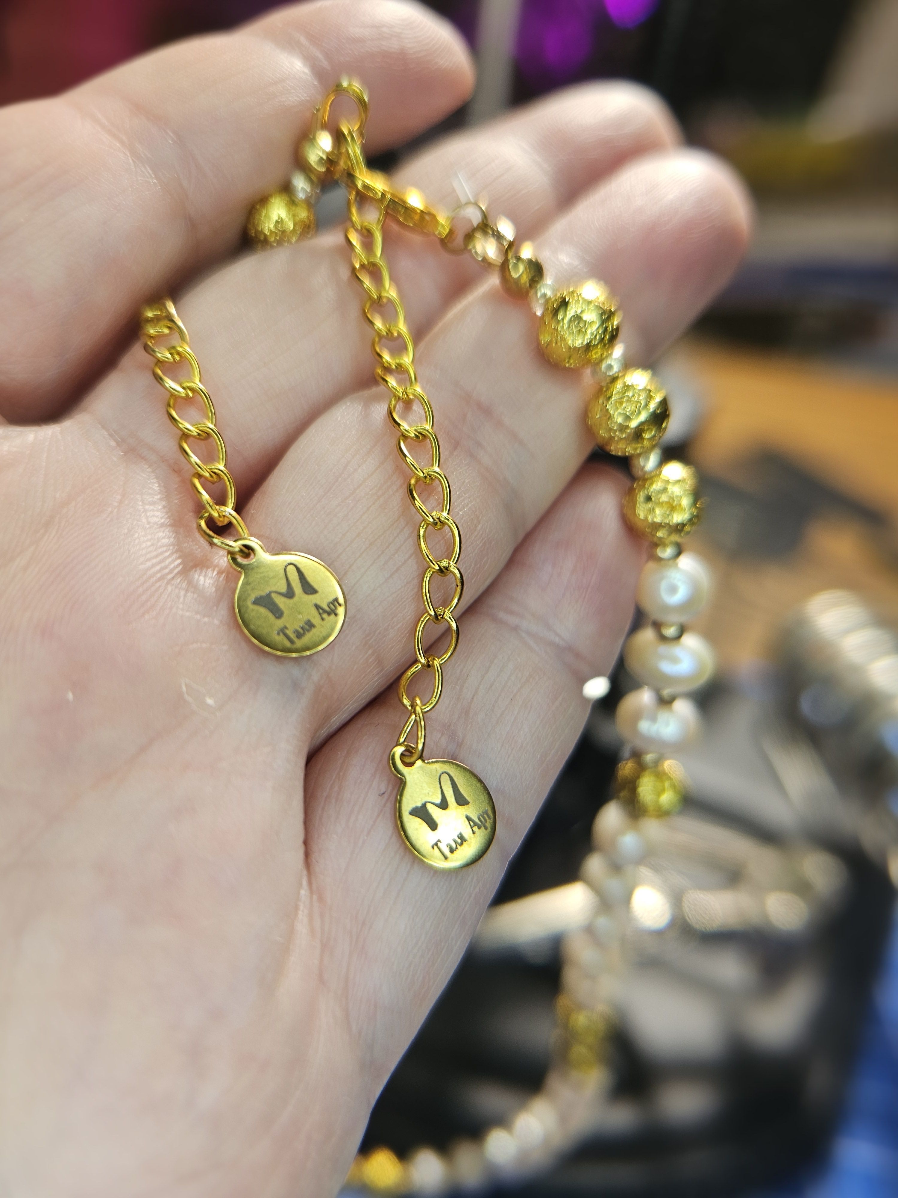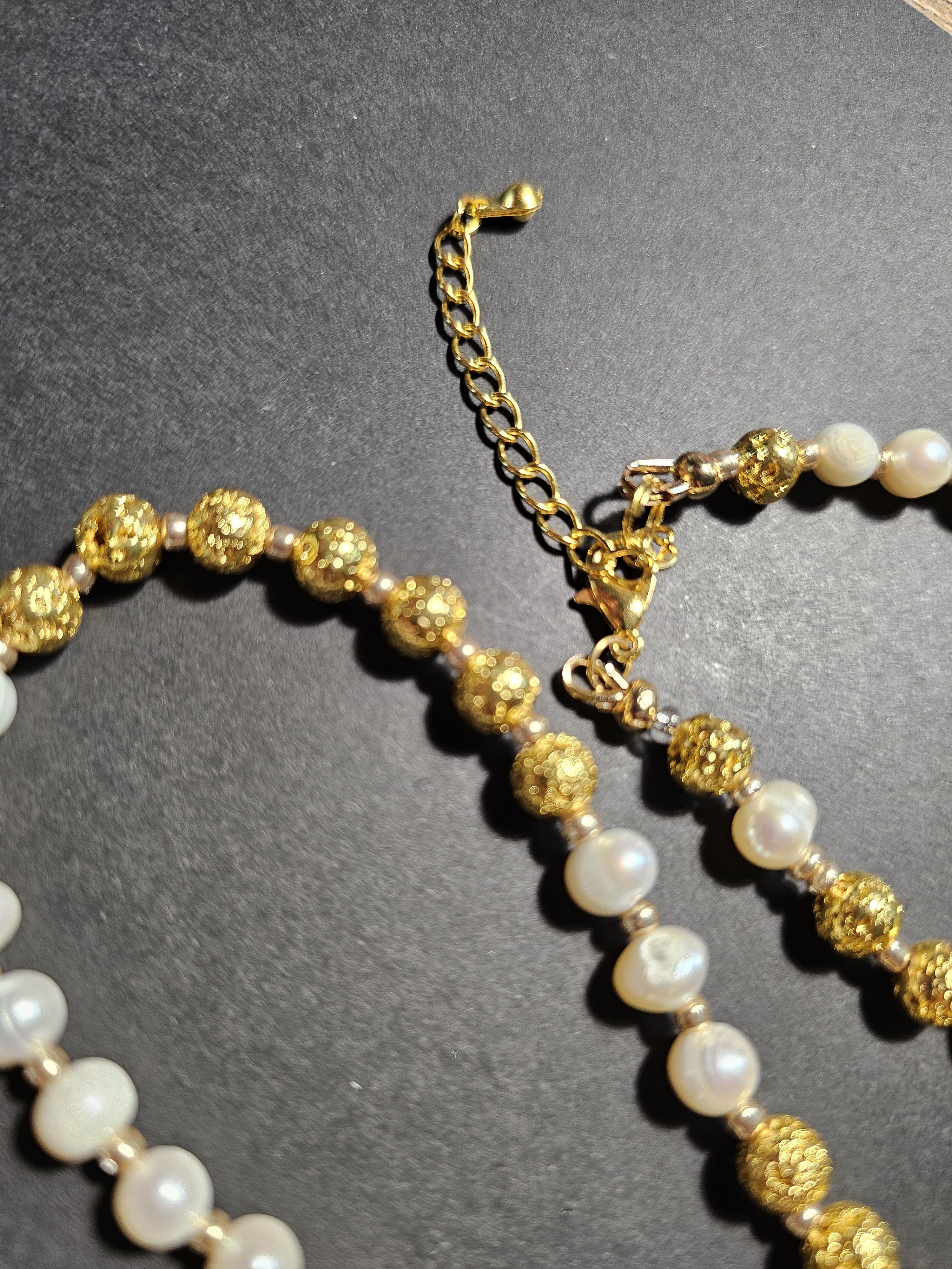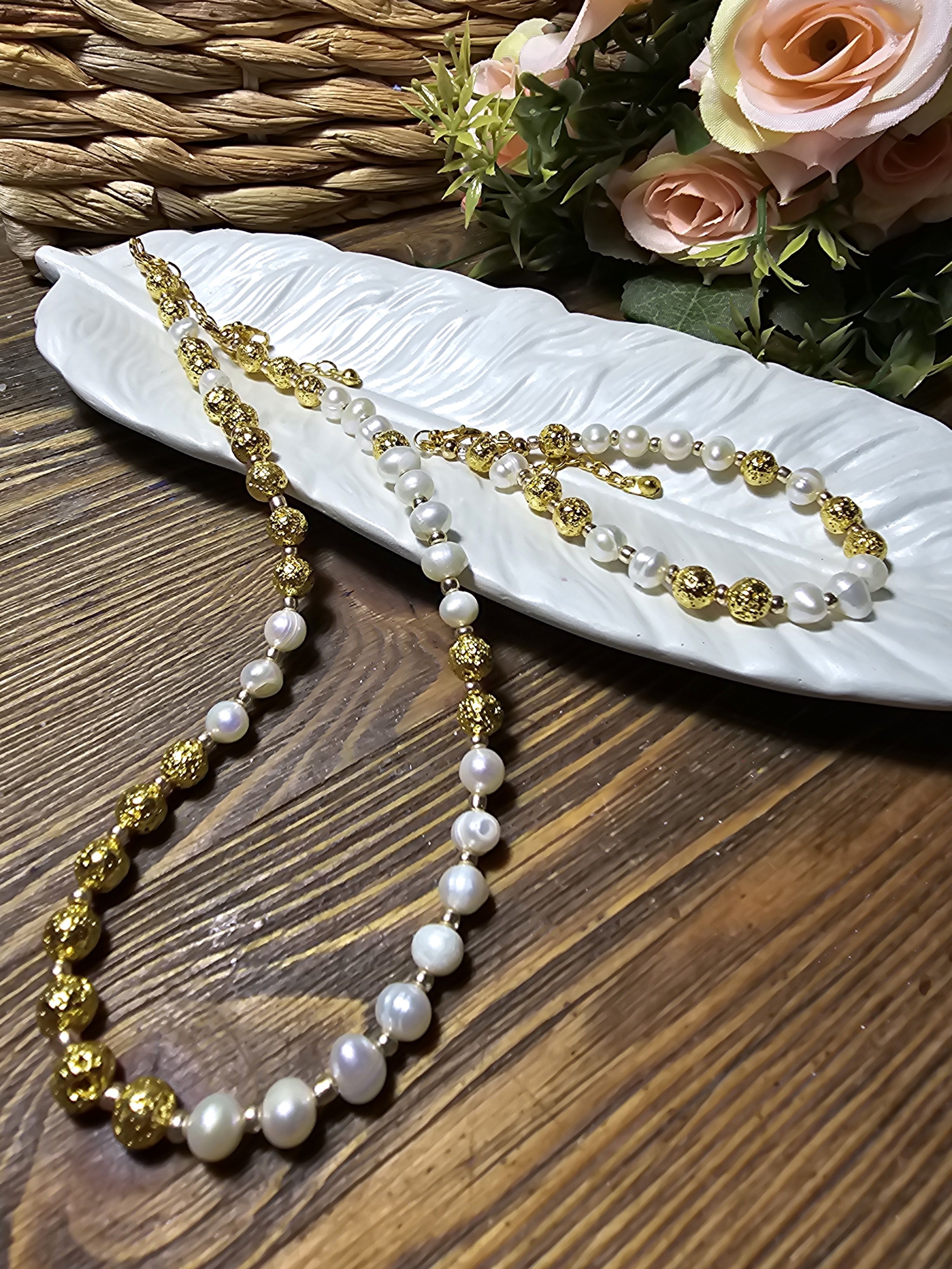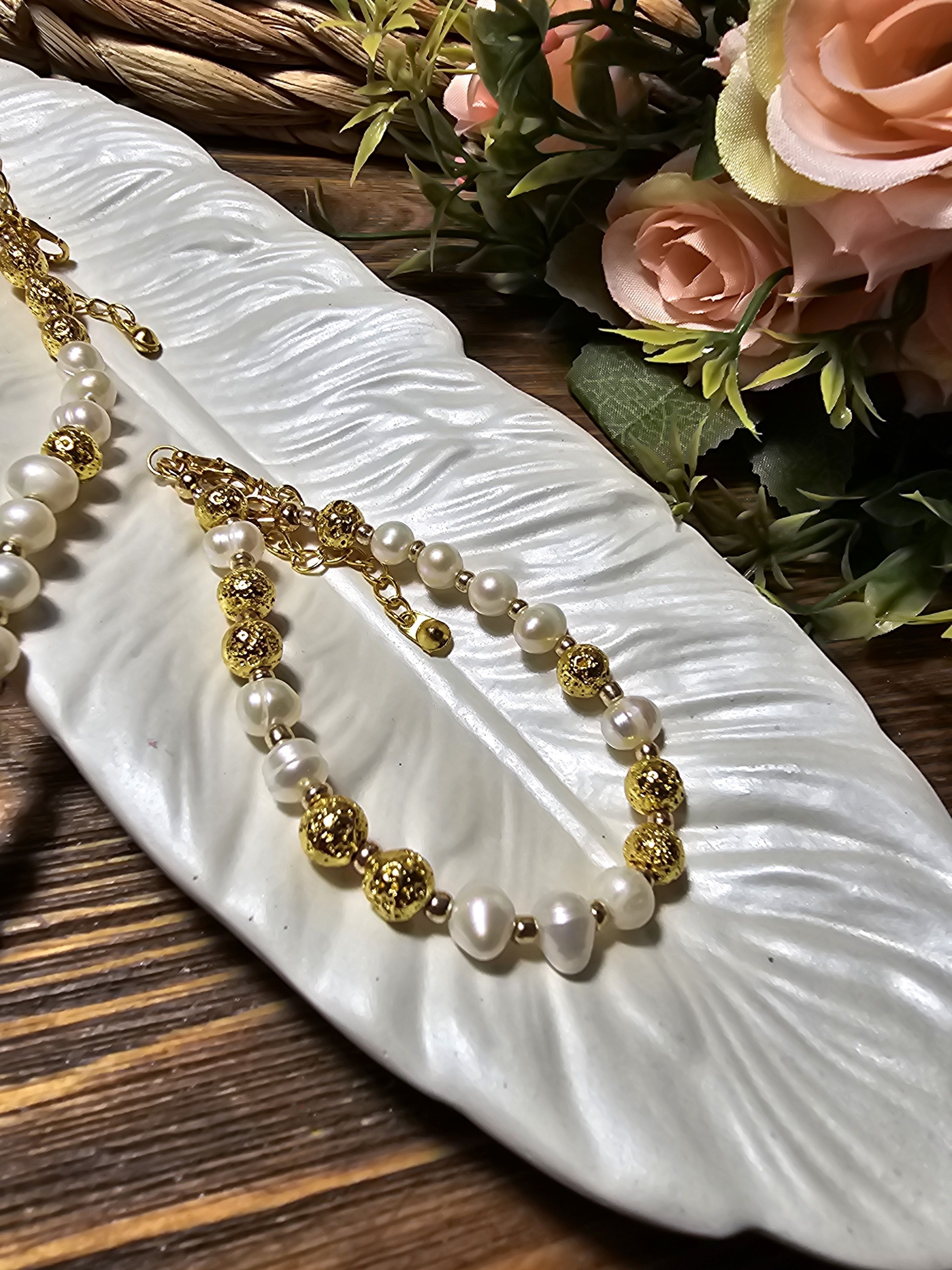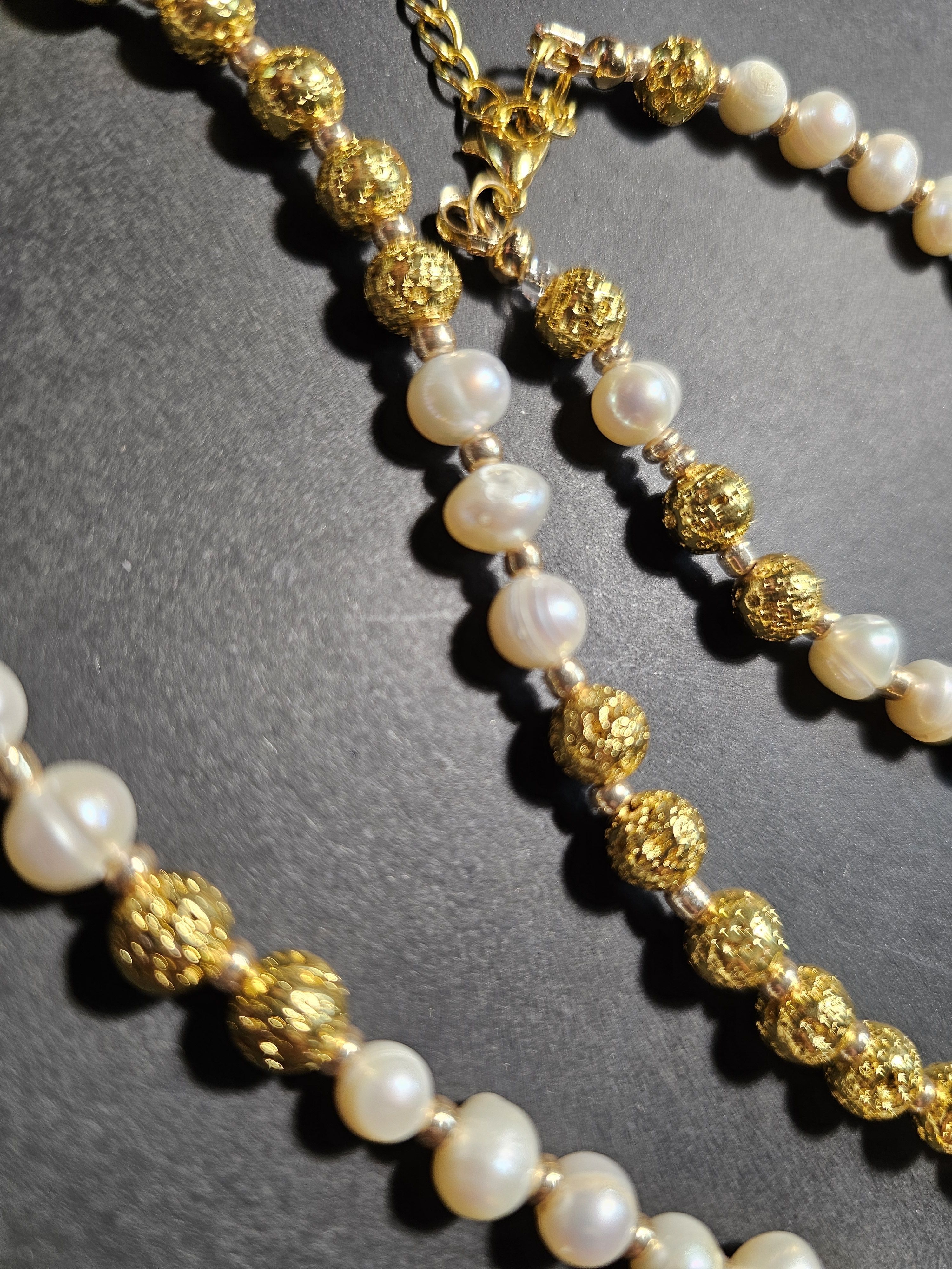 Колье и браслет ручной работы из круглого культивируемого пресноводного жемчуга и бусины вулканической лавы облагороженной с тонирующим эффектом под золото.