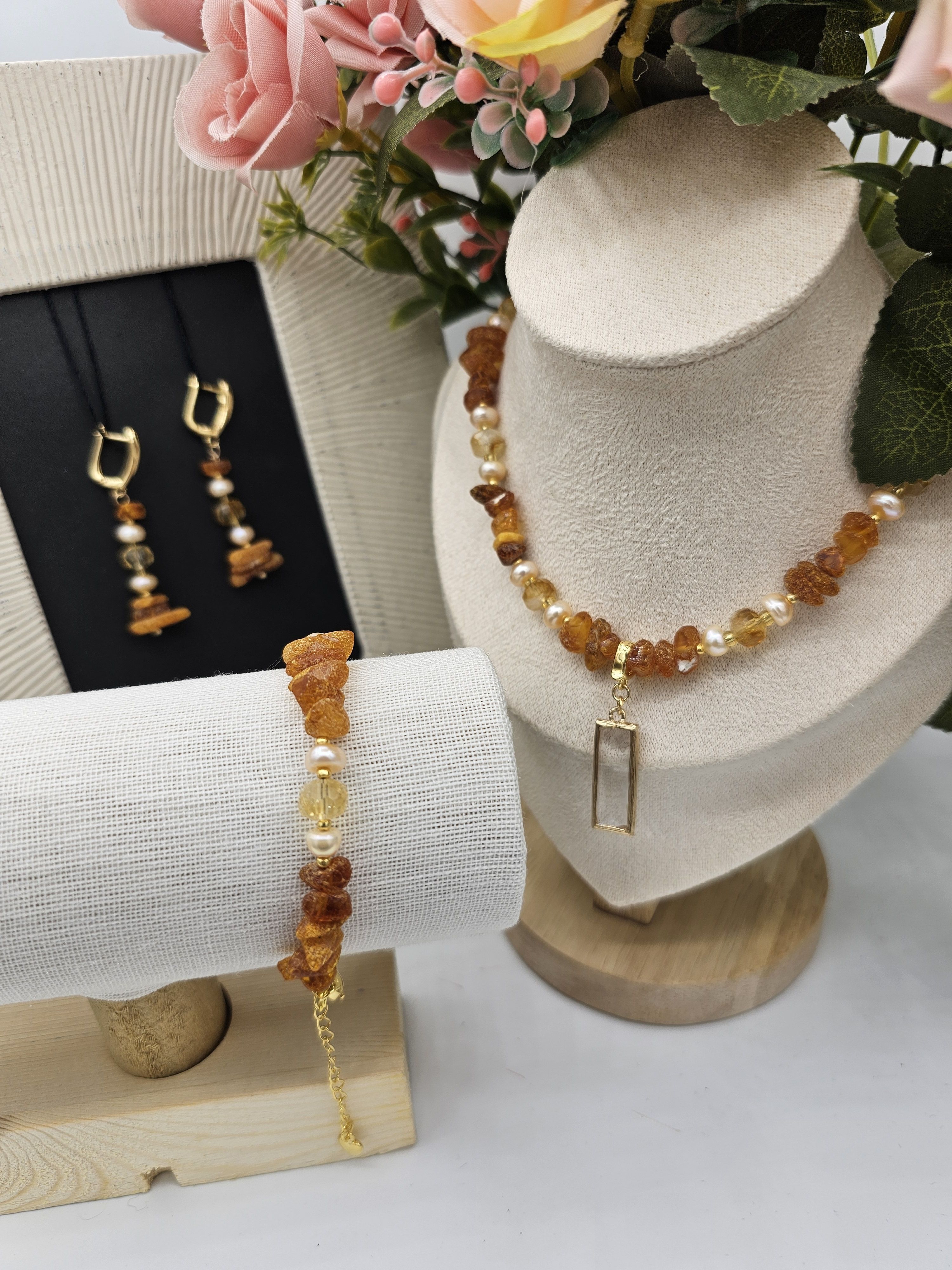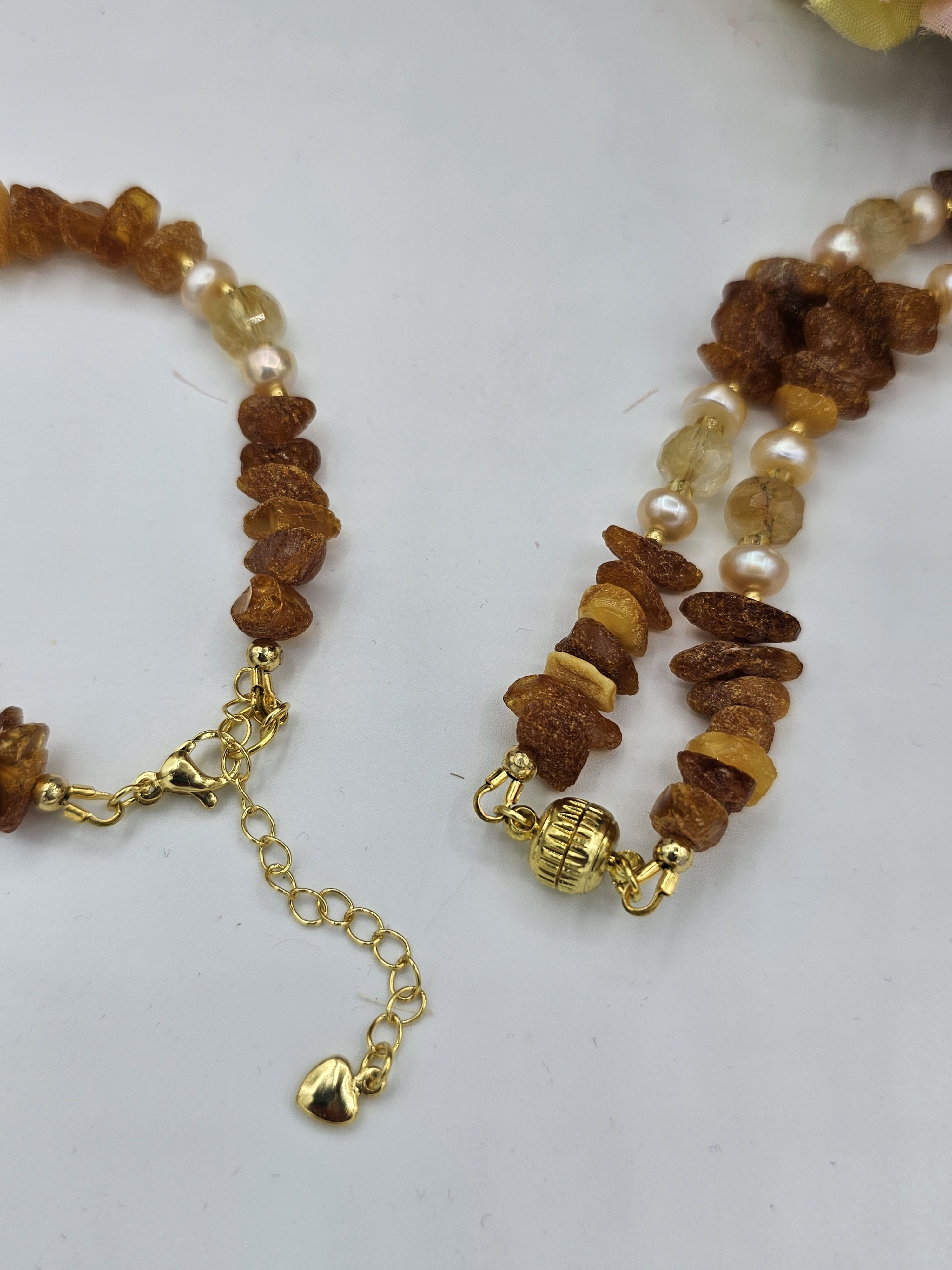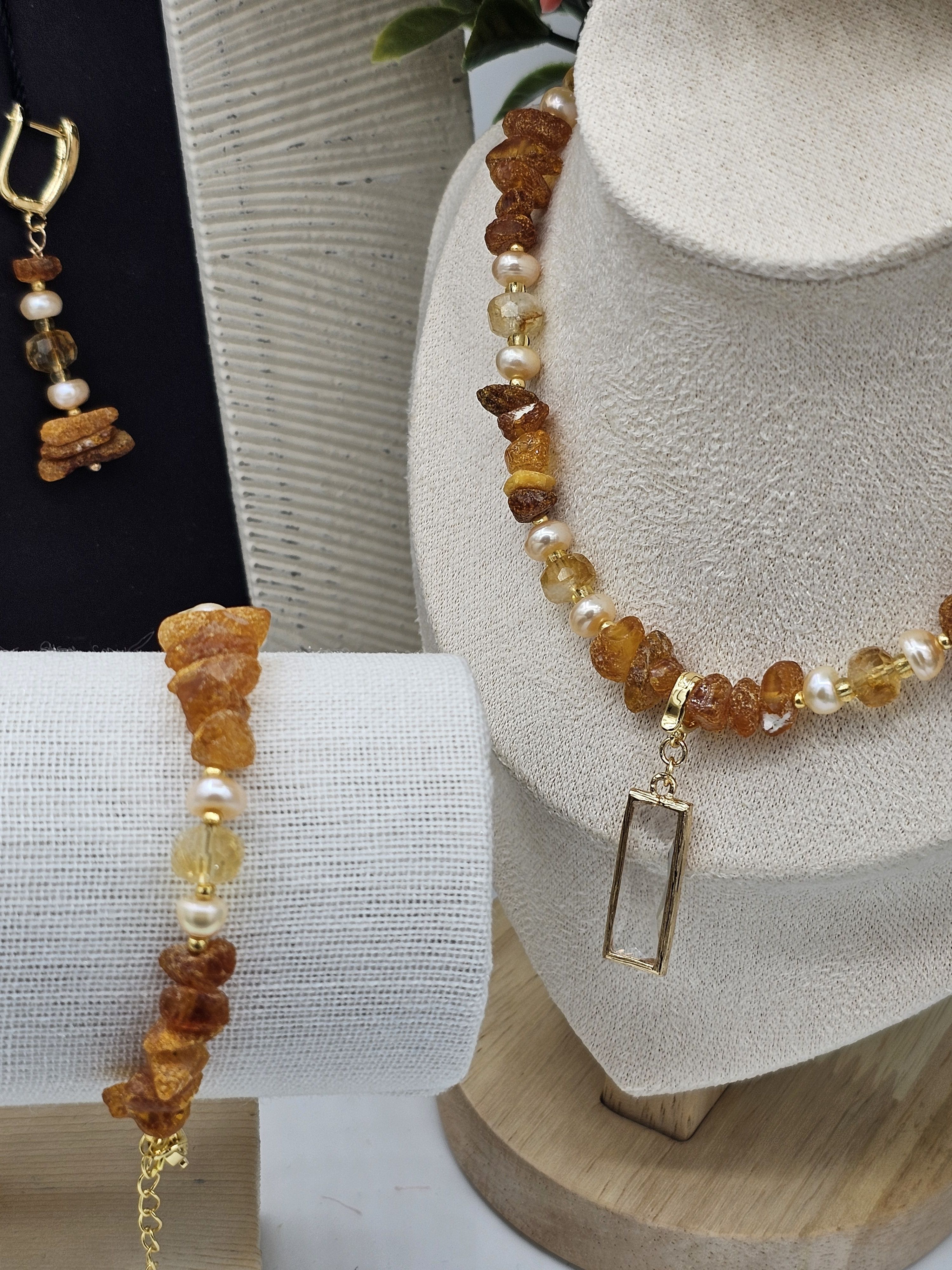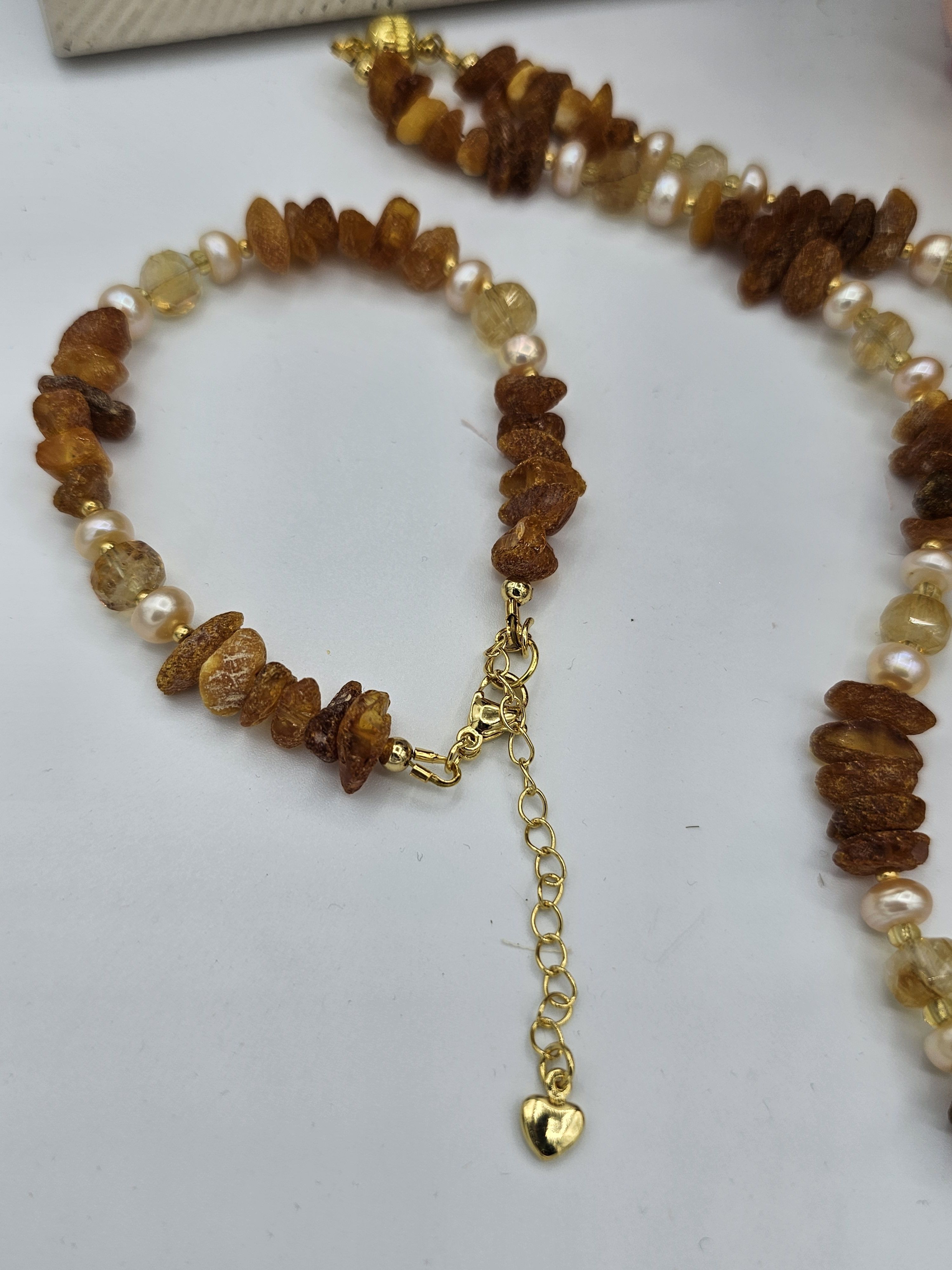 Колье и браслет ручной работы из шершавого, необработанного Янтаря, оранжево-розового культивируемого Жемчуга и граненых бусин Цитрина. Кулон из Австрийского стекла - съемный.