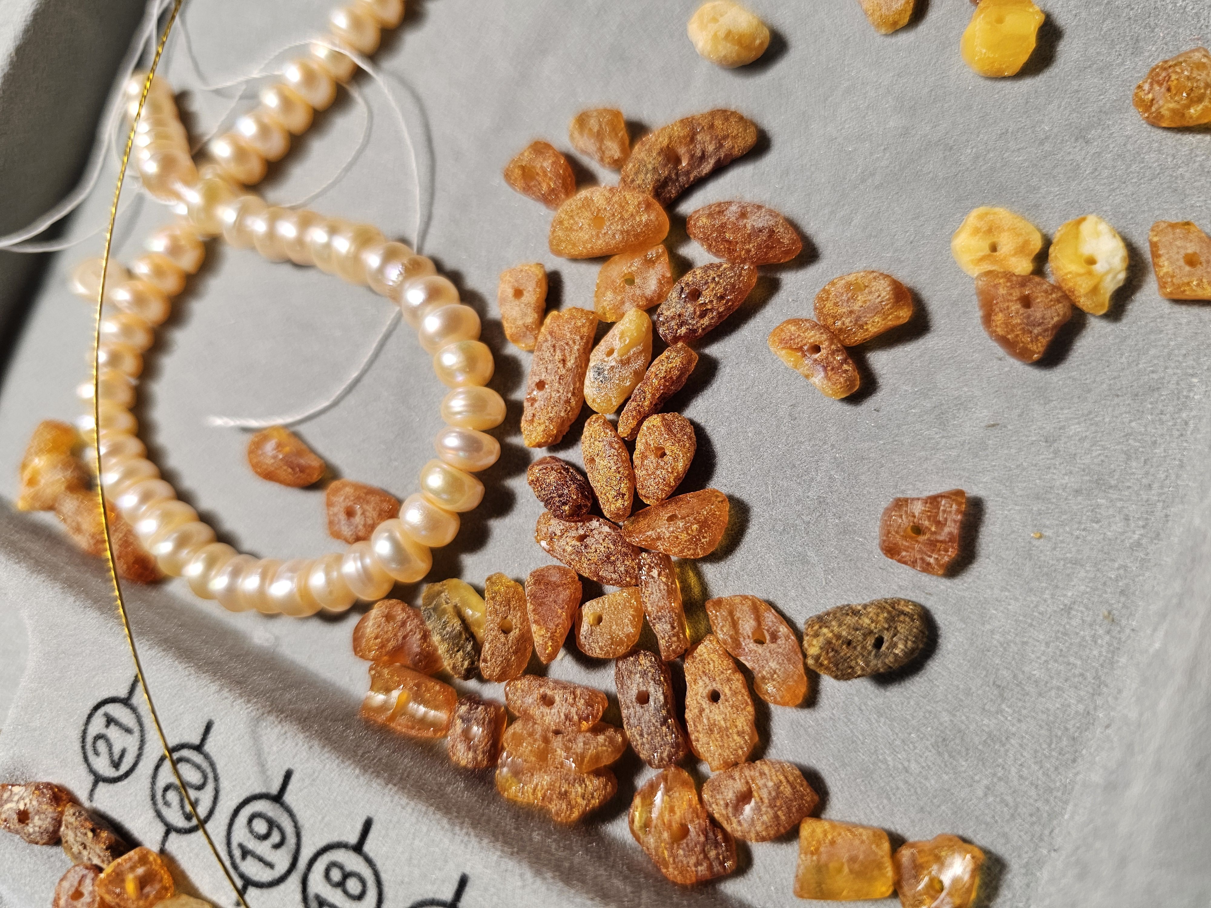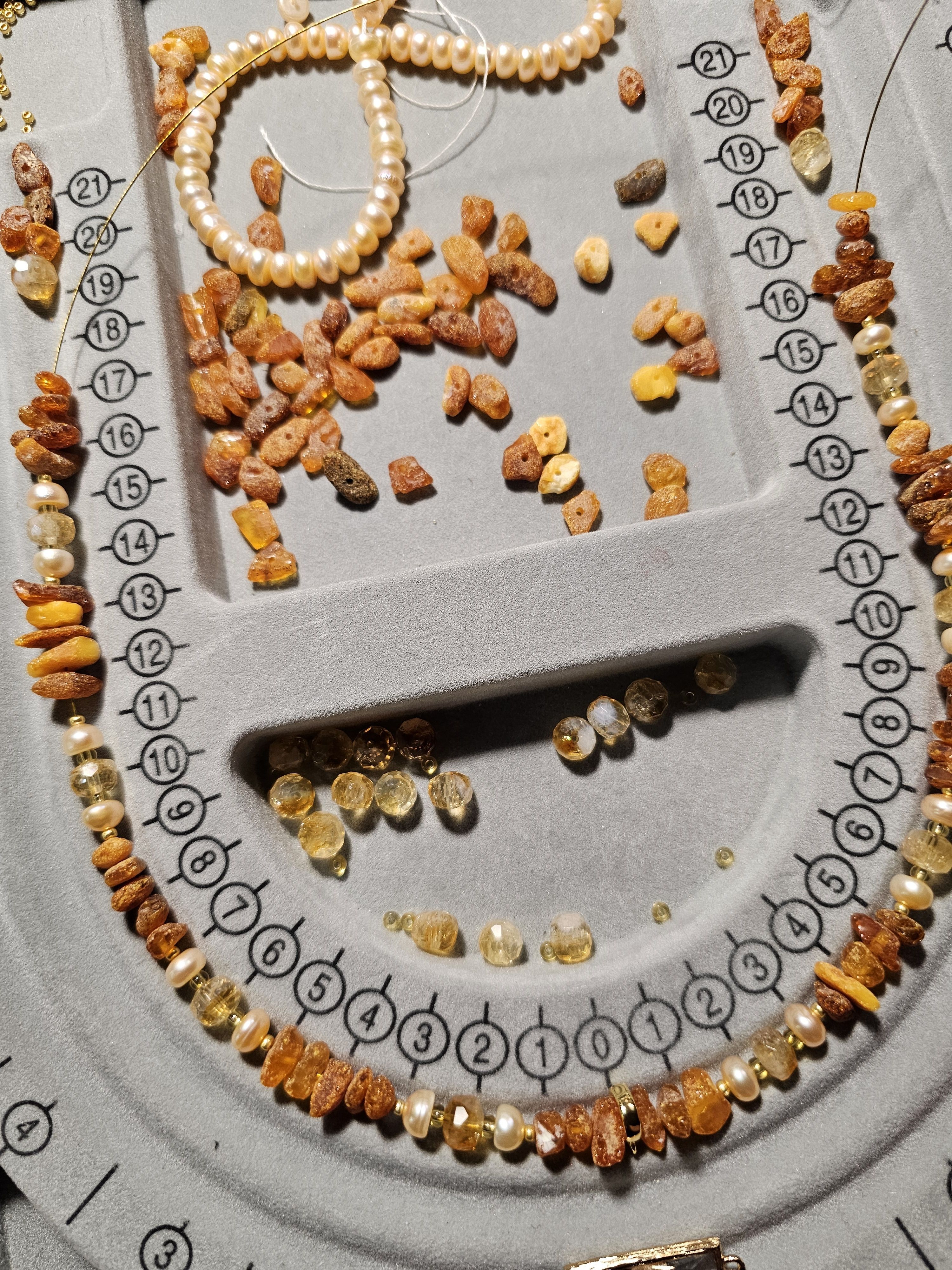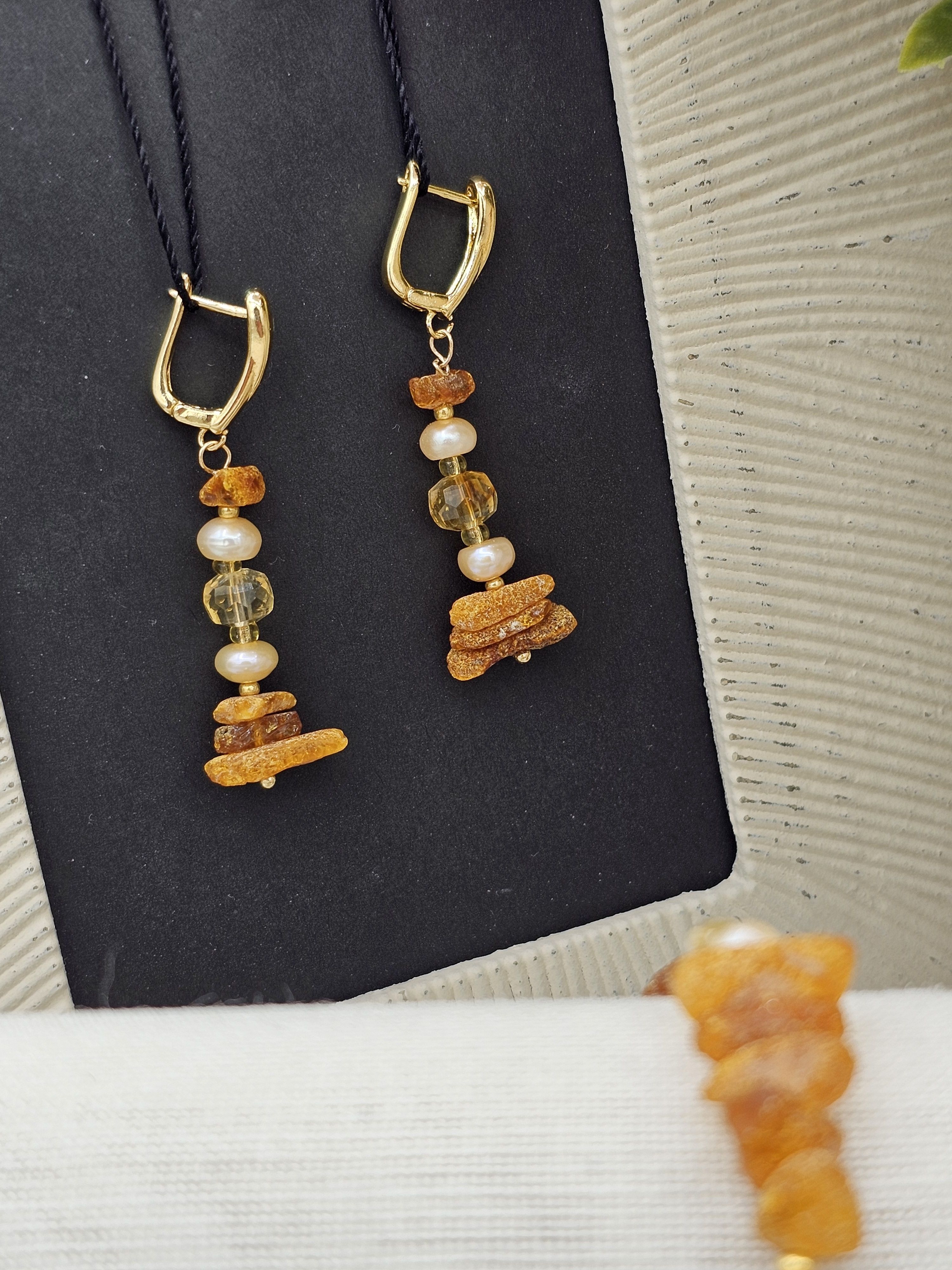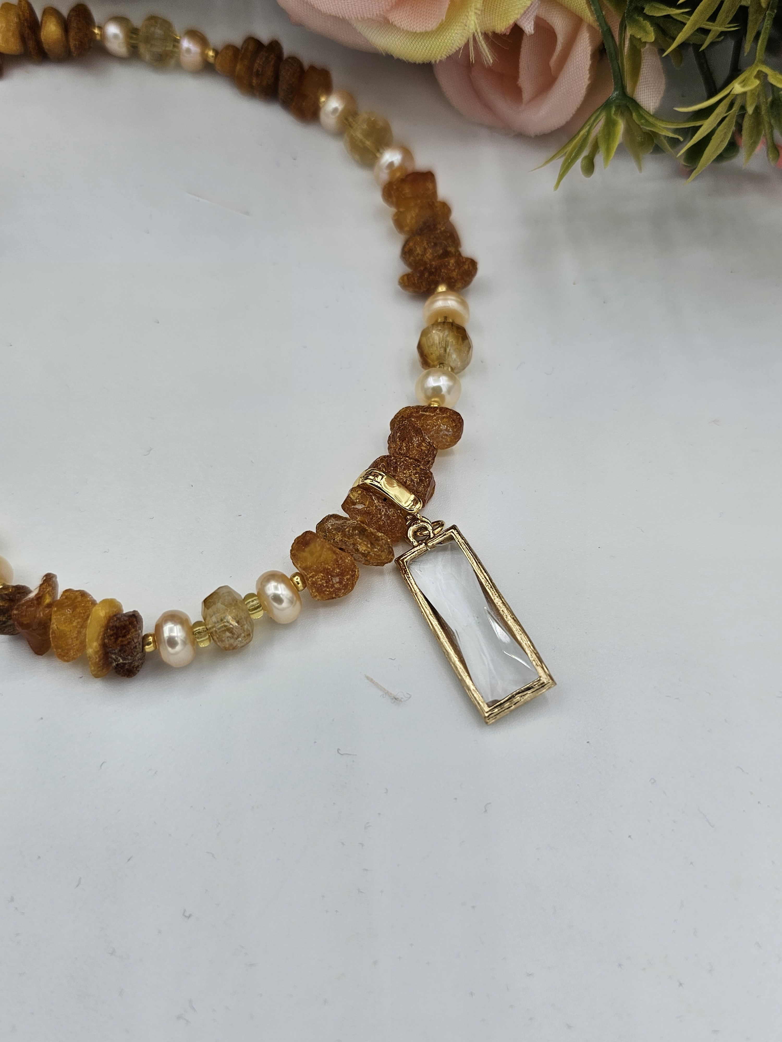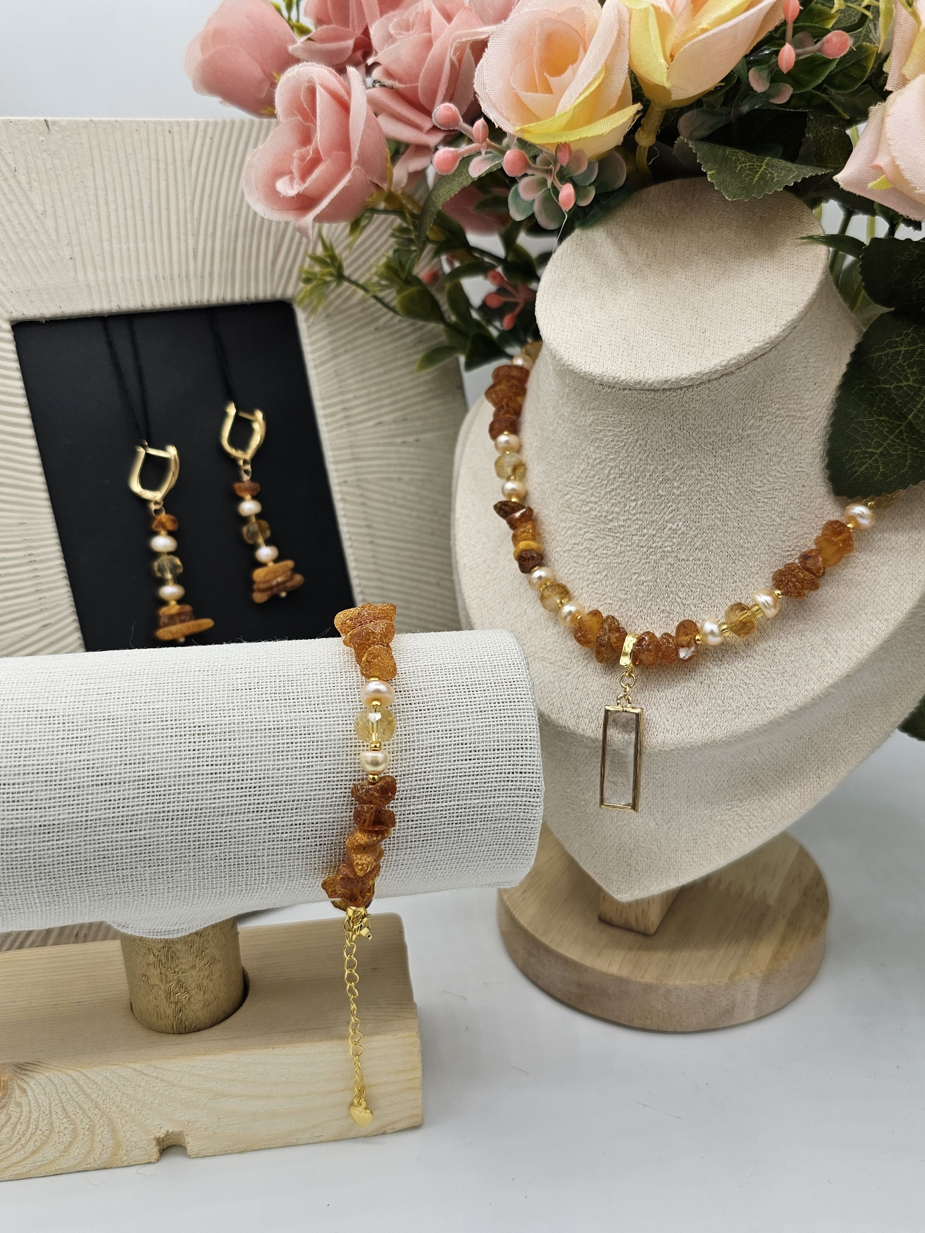 Колье и браслет ручной работы из шершавого, необработанного Янтаря, оранжево-розового культивируемого Жемчуга и граненых бусин Цитрина. Кулон из Австрийского стекла - съемный.