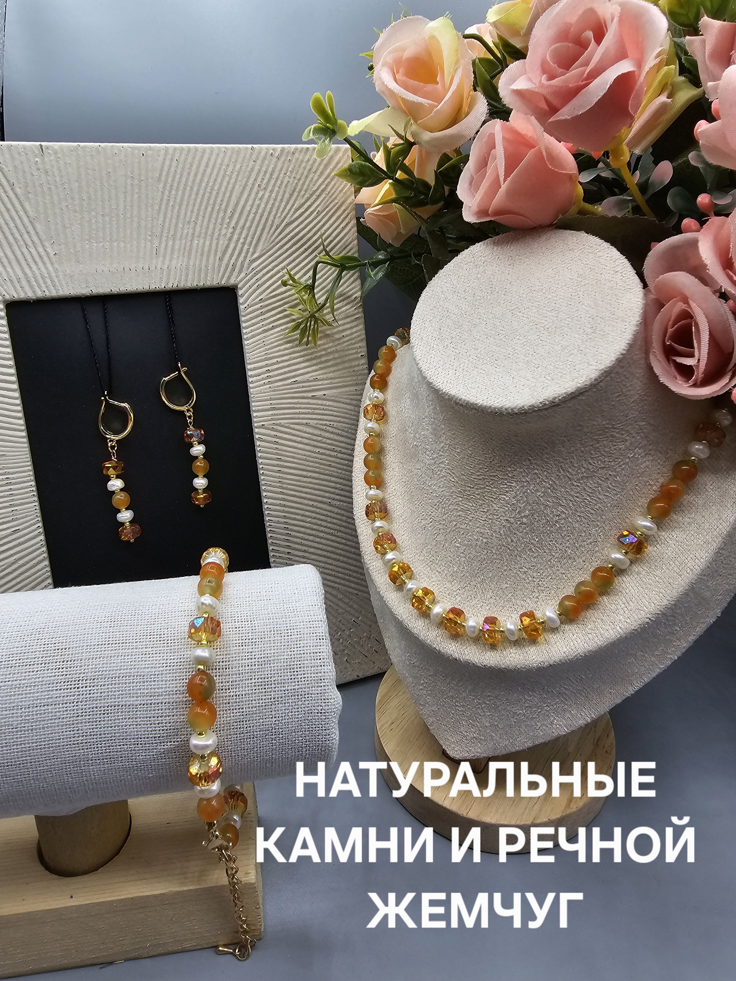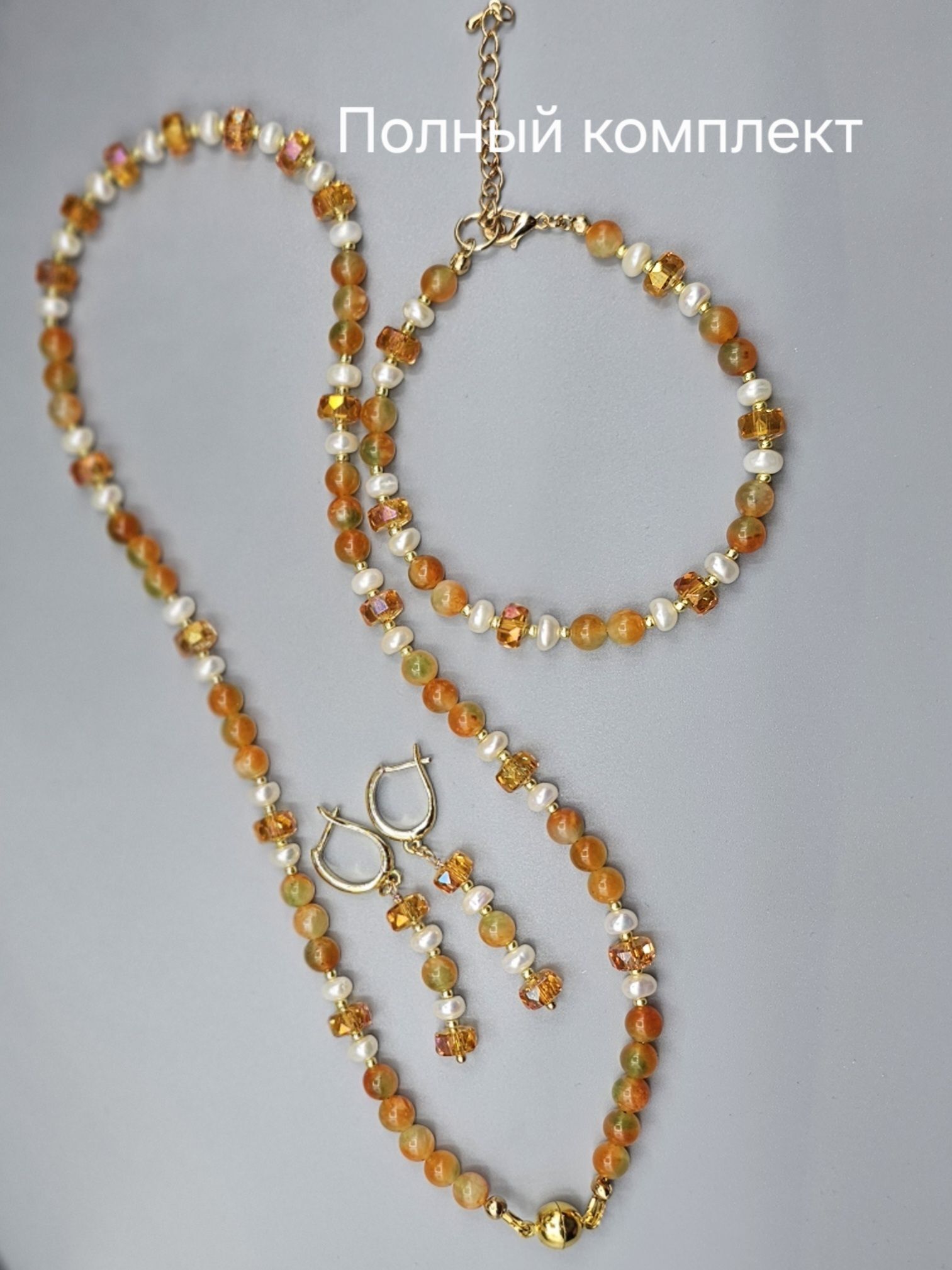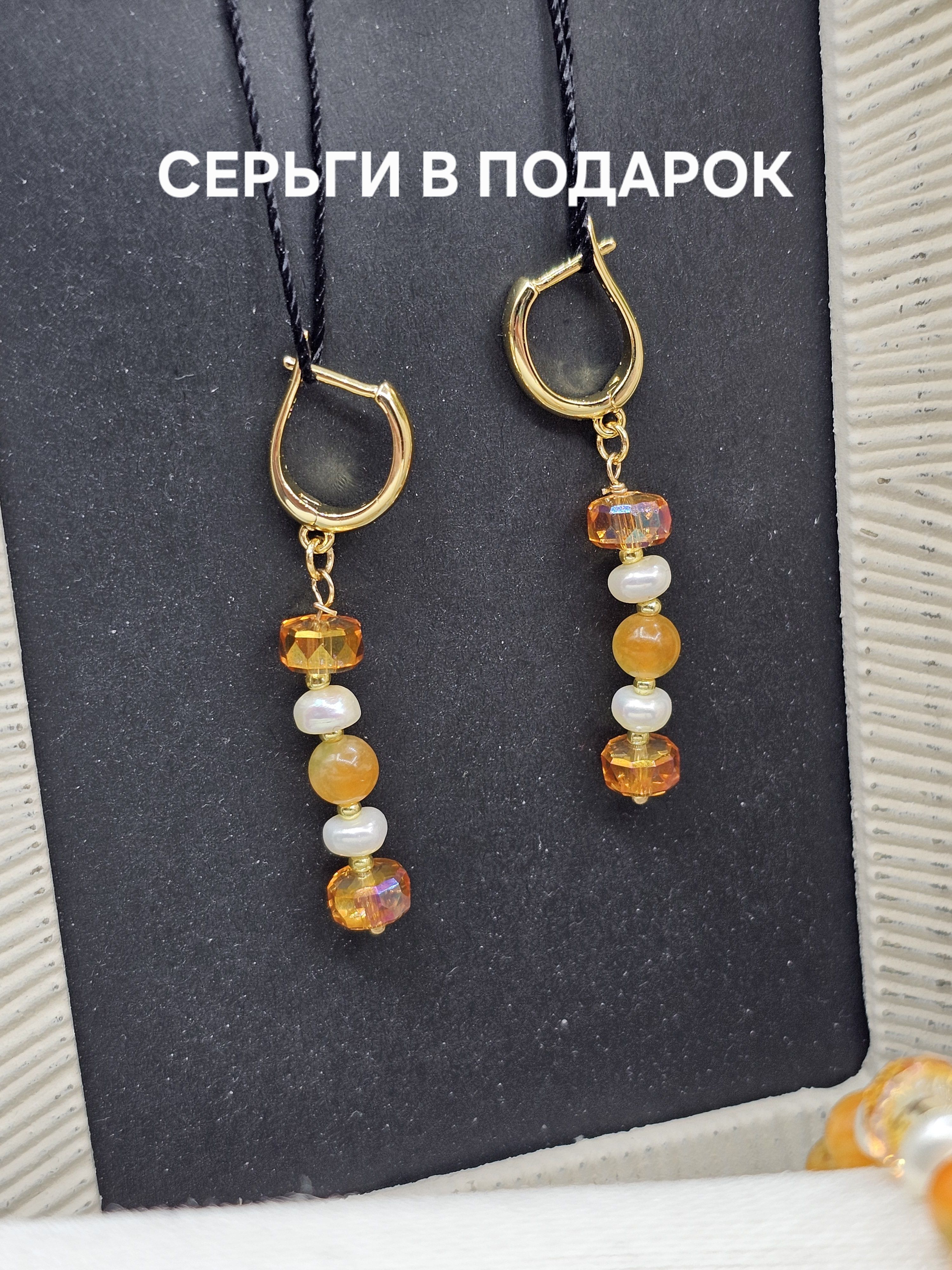 Украшения выполнены из агата, австрийского хрусталя, бисера и культивированного речного жемчуга. Оранжево-желтый цвет украшений придаст вашему образу яркость и оригинальность.