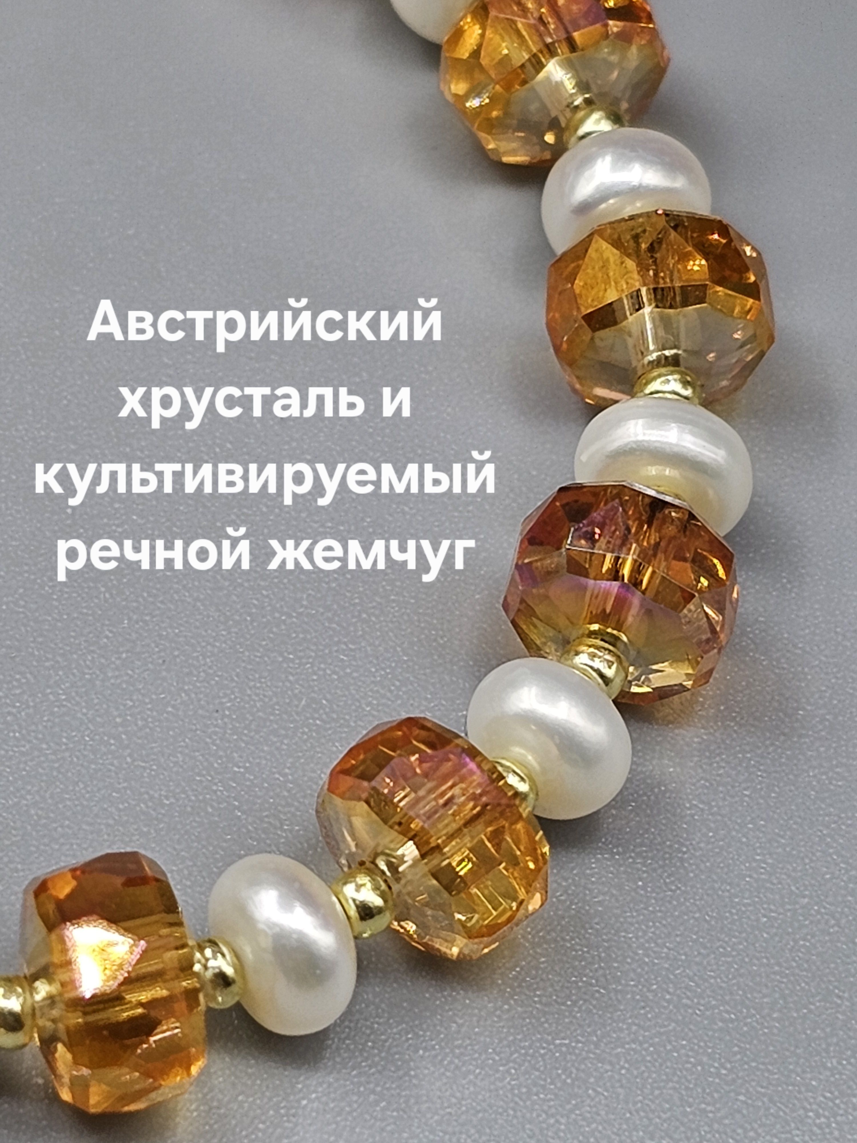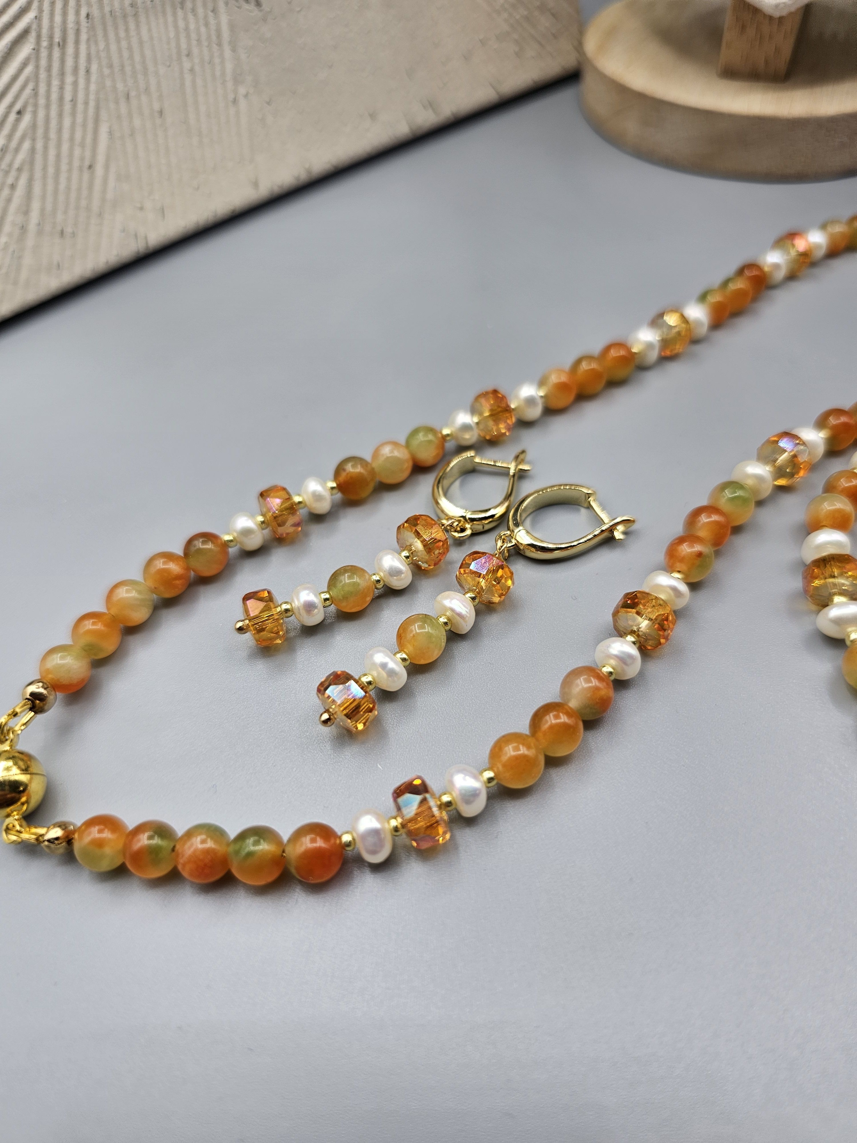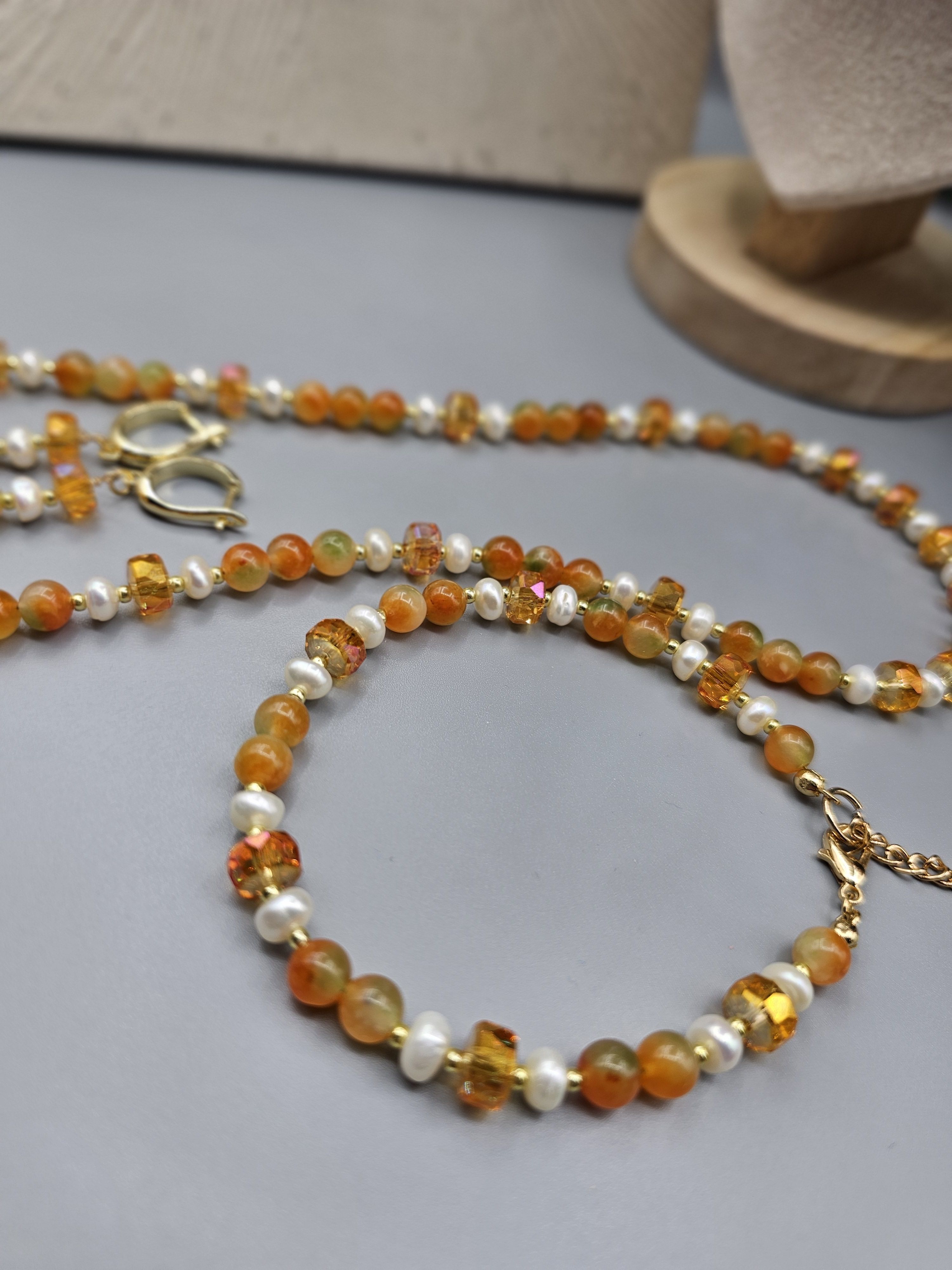Украшения выполнены из агата, австрийского хрусталя, бисера и культивированного речного жемчуга. Оранжево-желтый цвет украшений придаст вашему образу яркость и оригинальность.