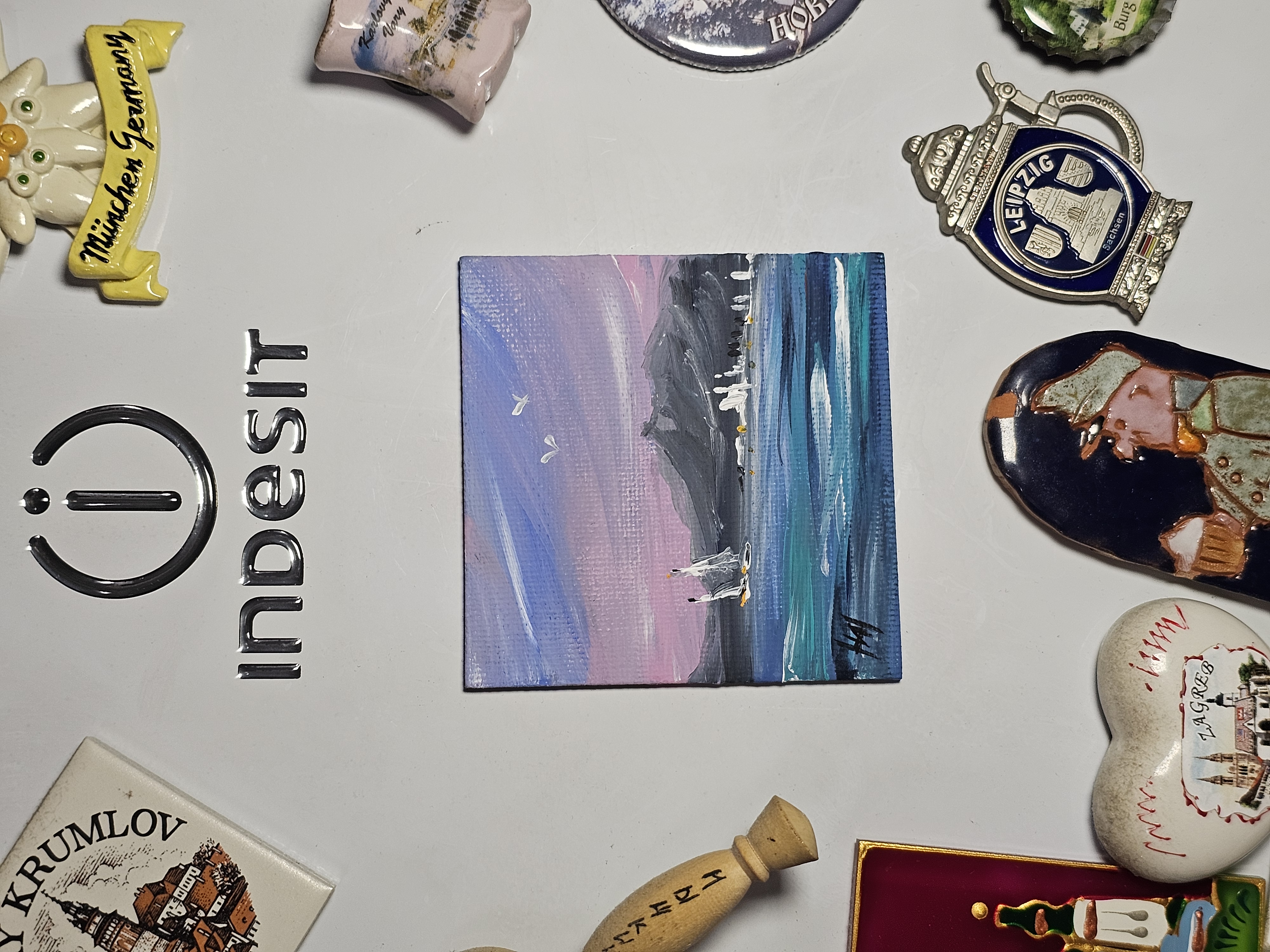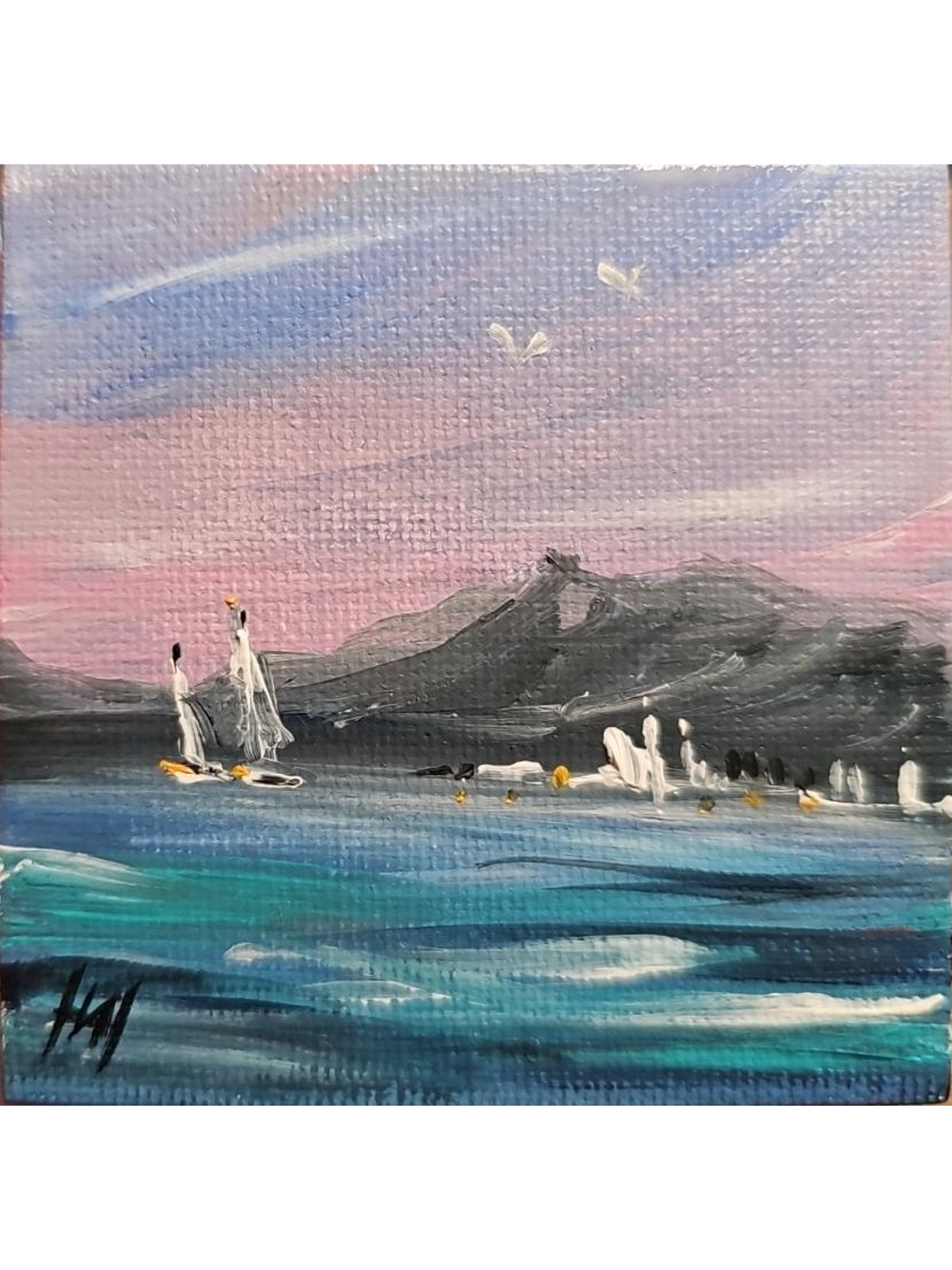 Нам представлена живописная сцена с морским пейзажем. В центре картины виднеется море, окрашенное в оттенки синего и бирюзового, с легкими белыми волнами. На горизонте расположены темные горы, создающие контраст с ярким небом. Небо окрашено в розовые и голубые тона, что придаёт картине атмосферу заката или рассвета. На фоне видны два парусника с белыми парусами, которые плывут по морю. В небе парят две белые птицы, добавляя динамики и жизни в композицию. Картина выполнена в стиле, который передает спокойствие и красоту природы.