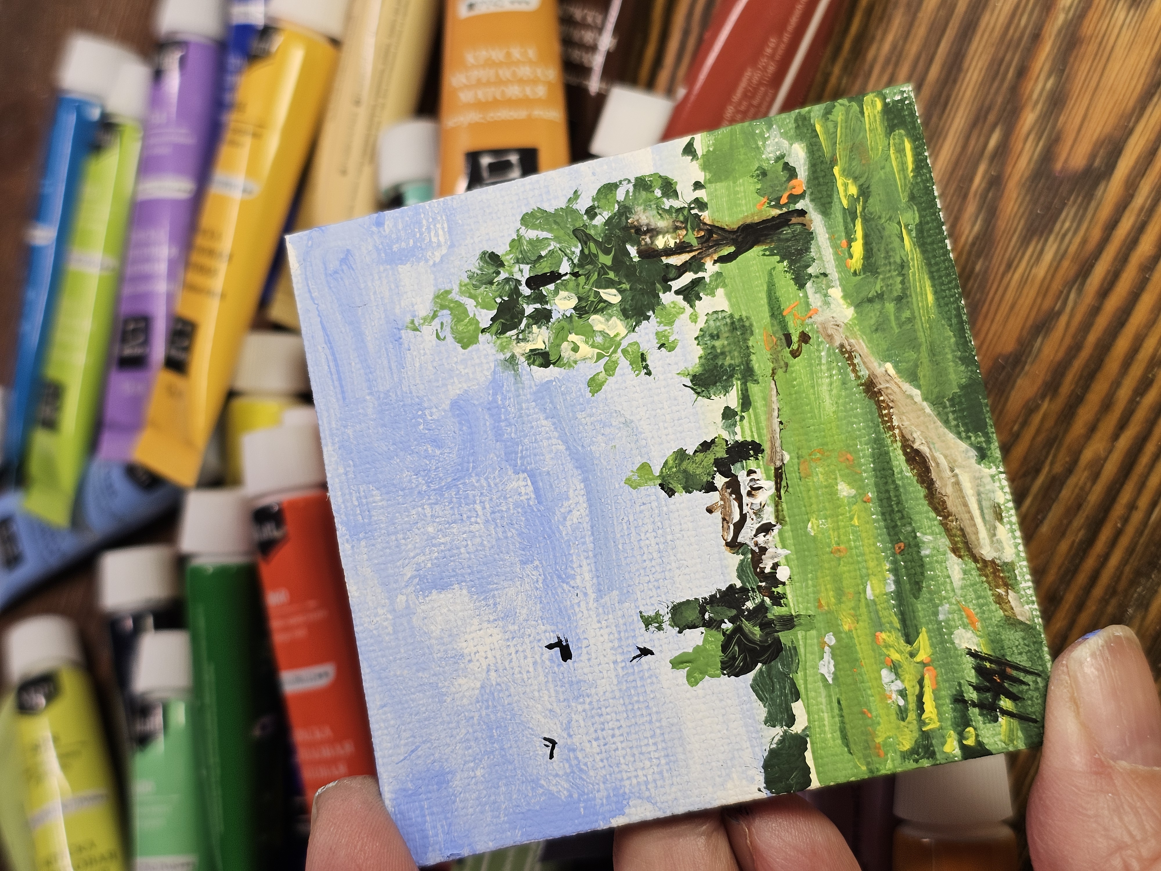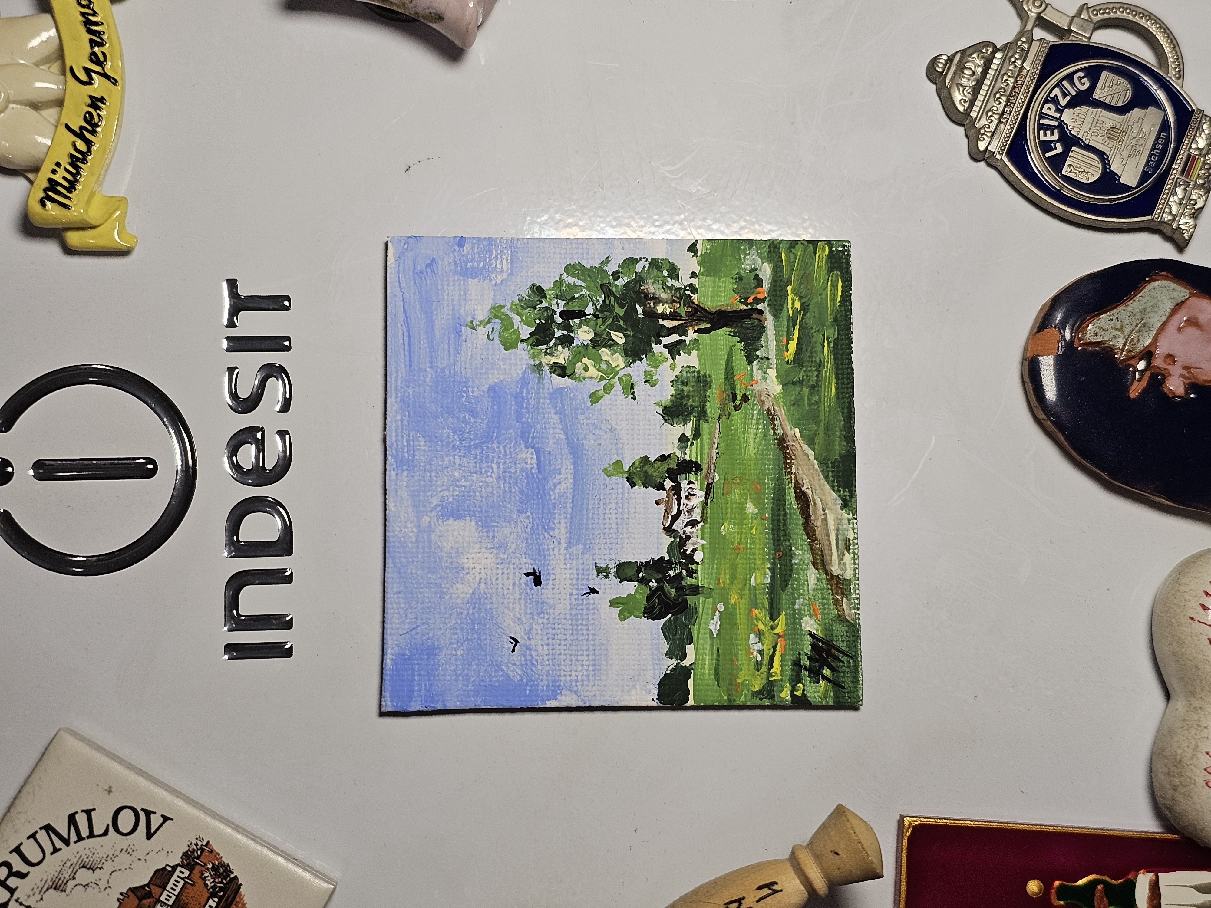 Нам представлена пейзаж с зелёным полем и деревьями. На переднем плане видна тропинка, ведущая к дому, который находится в центре картины. Дом окружён деревьями. На небе видны облака и несколько птиц, летящих в воздухе. Картина выполнена в ярких зелёных и голубых тонах, создавая атмосферу спокойствия и природы.