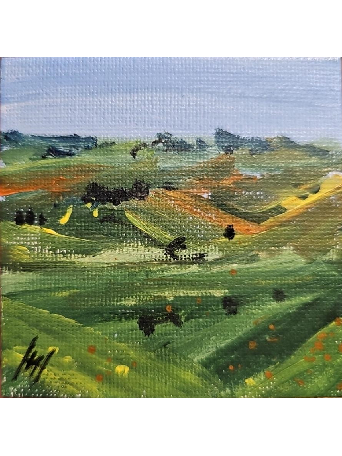 Нам представлена живописная картина с пейзажем. Видны зелёные холмы, плавно переходящие друг в друга, создавая ощущение глубины и простора. На переднем плане холмы покрыты яркой зелёной травой с вкраплениями жёлтых и оранжевых оттенков, что может указывать на цветы или солнечные блики. Вдали видны более тёмные силуэты деревьев или кустарников. Небо светло-голубое, без облаков, что создаёт ощущение ясной и спокойной погоды. Картина выполнена в стиле импрессионизма с использованием ярких и насыщенных цветов.