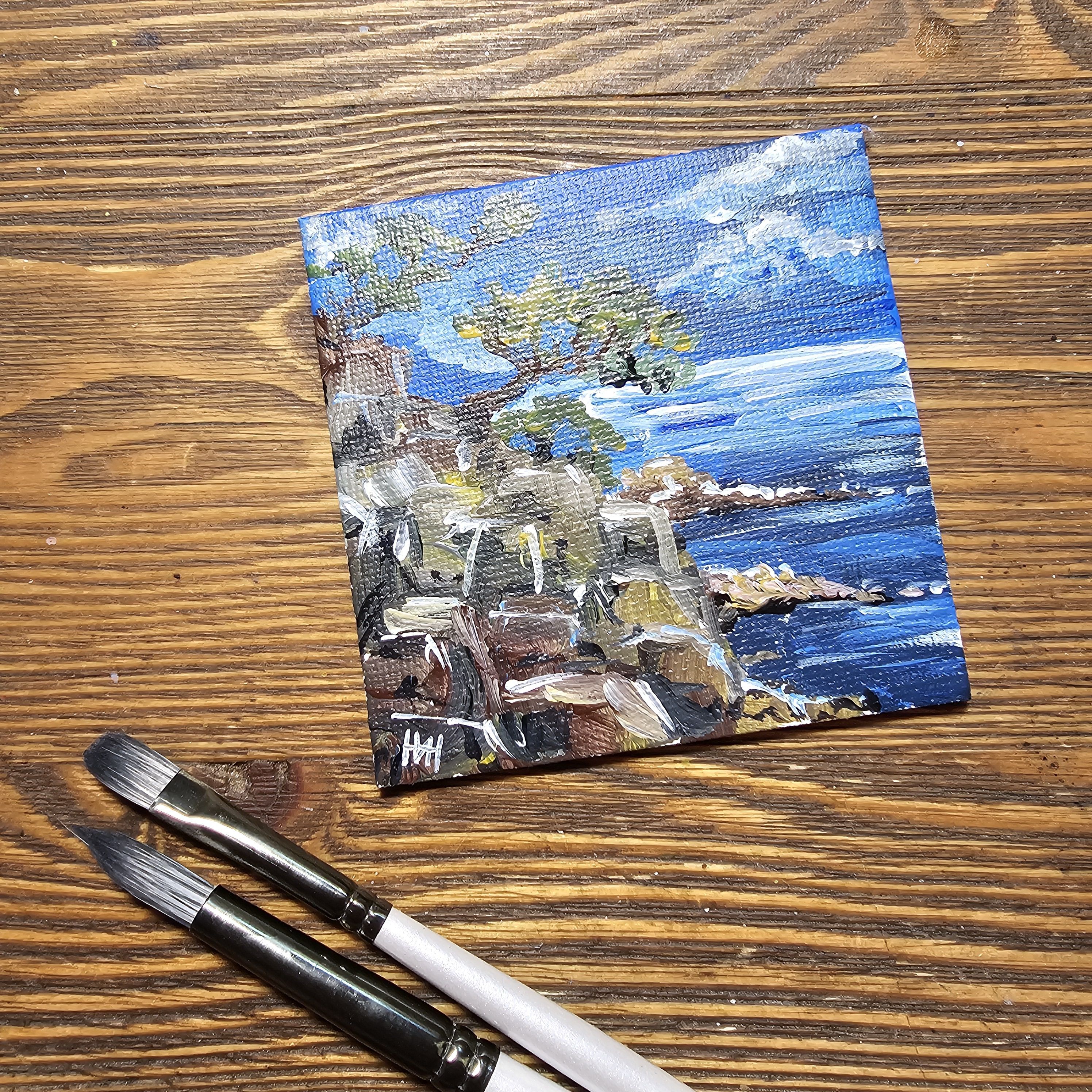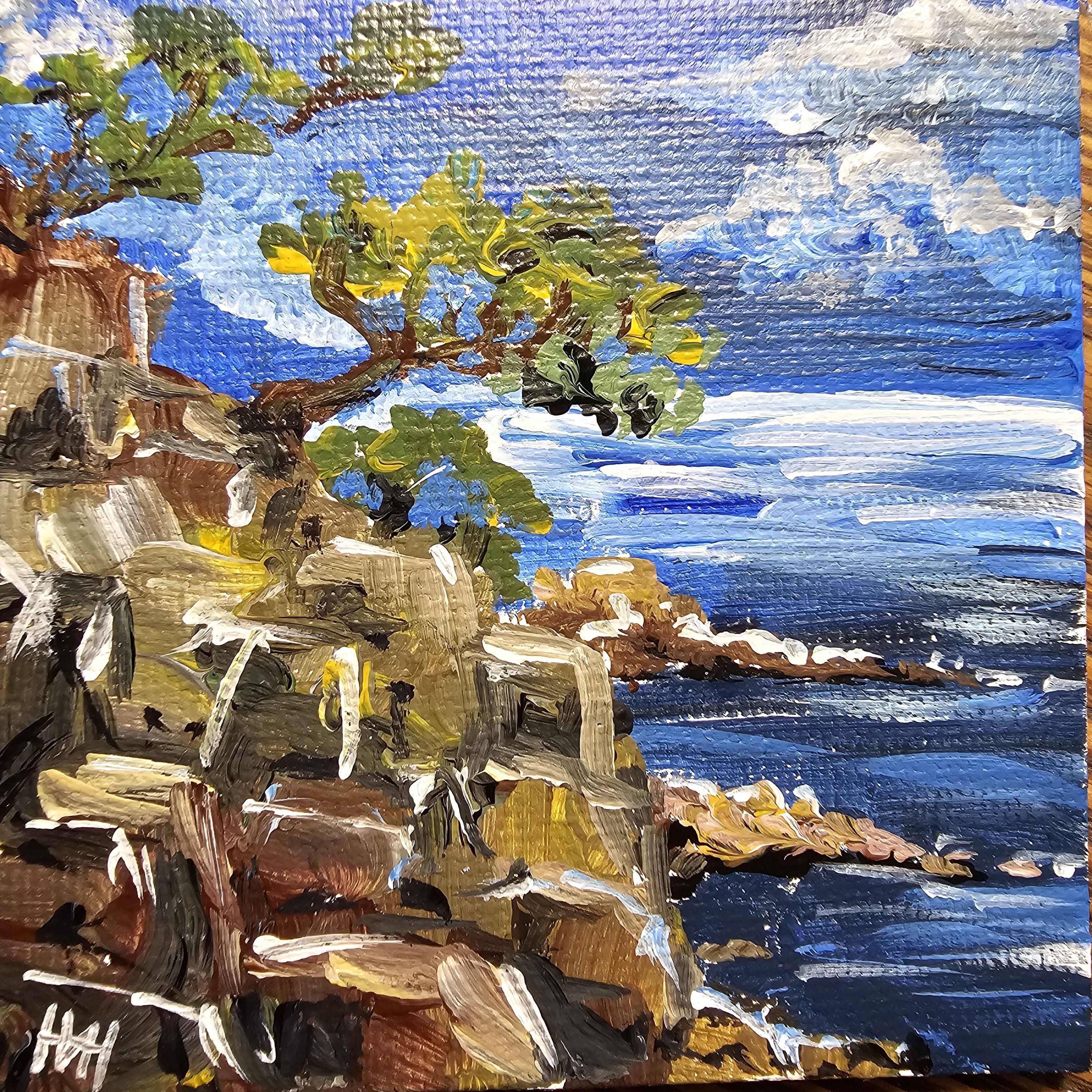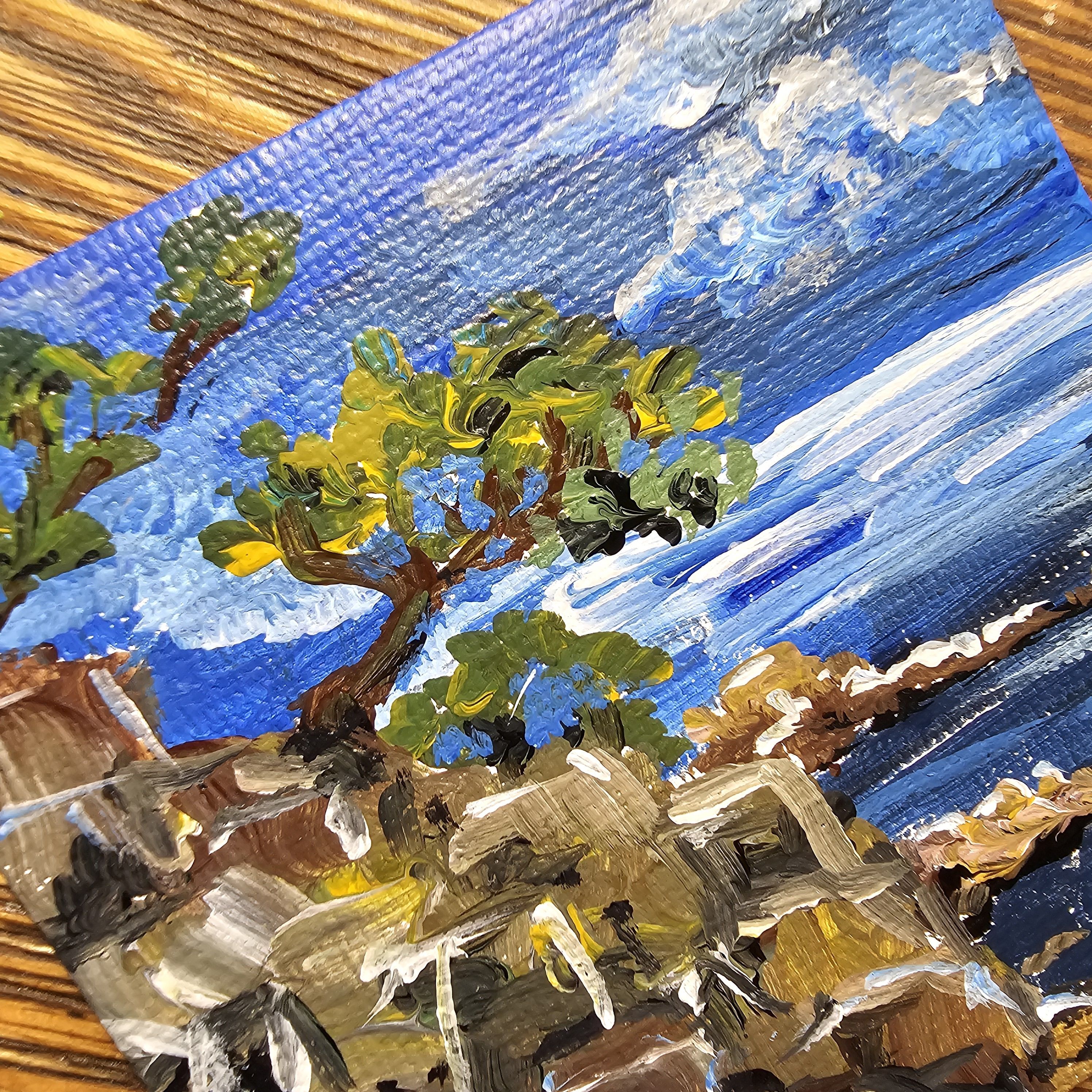 Нам представлена картина, выполненная в акриловой технике. На переднем плане изображены скалы с оттенками коричневого и серого, написанные широкими мазками. На скалах растут зелёные сосны. Фон картины занимает небо, выполненное в различных оттенках синего и белого, что создаёт впечатление движения облаков. Внизу справа гряды камней омываются морем. Общая композиция передаёт ощущение природного ландшафта, возможно, горного региона.