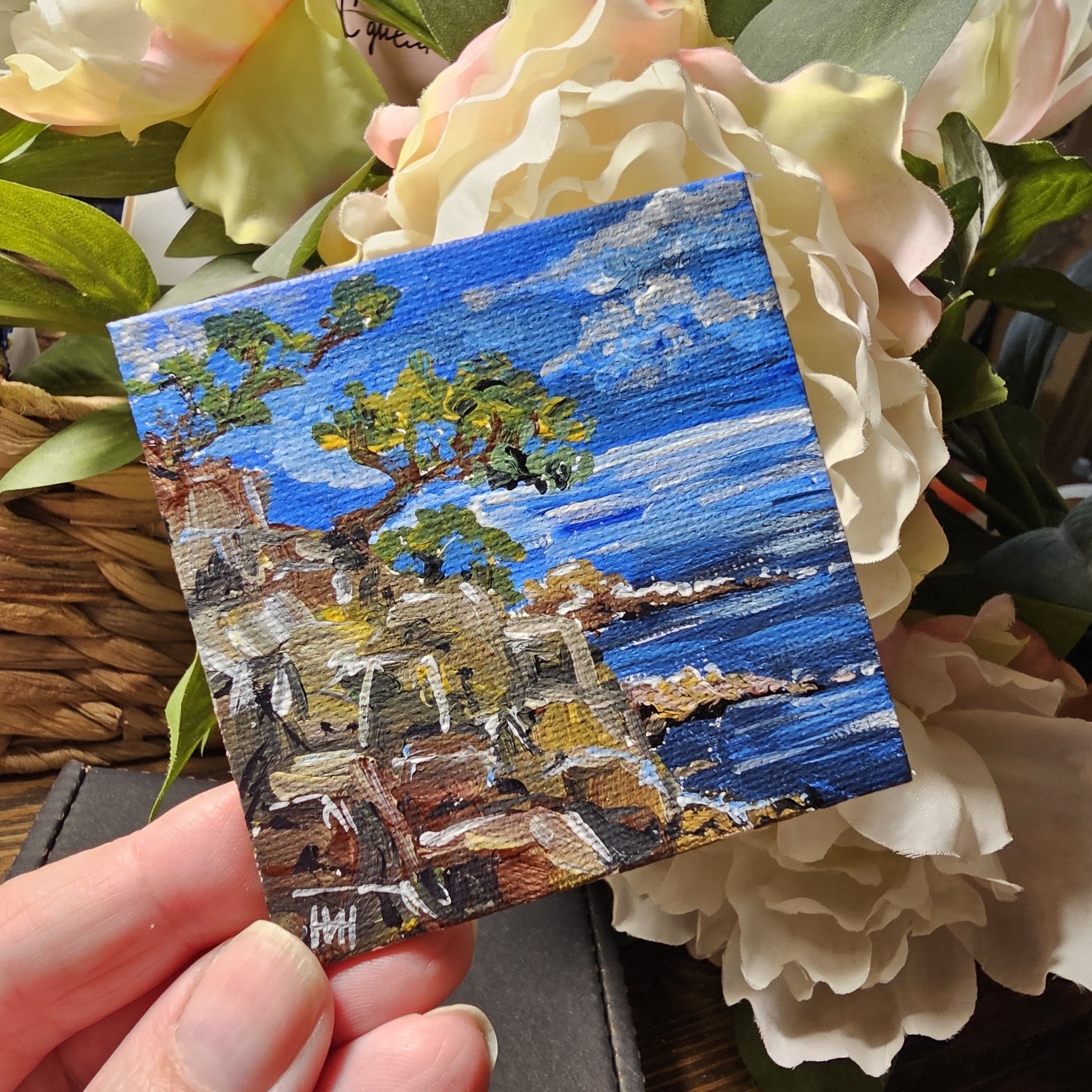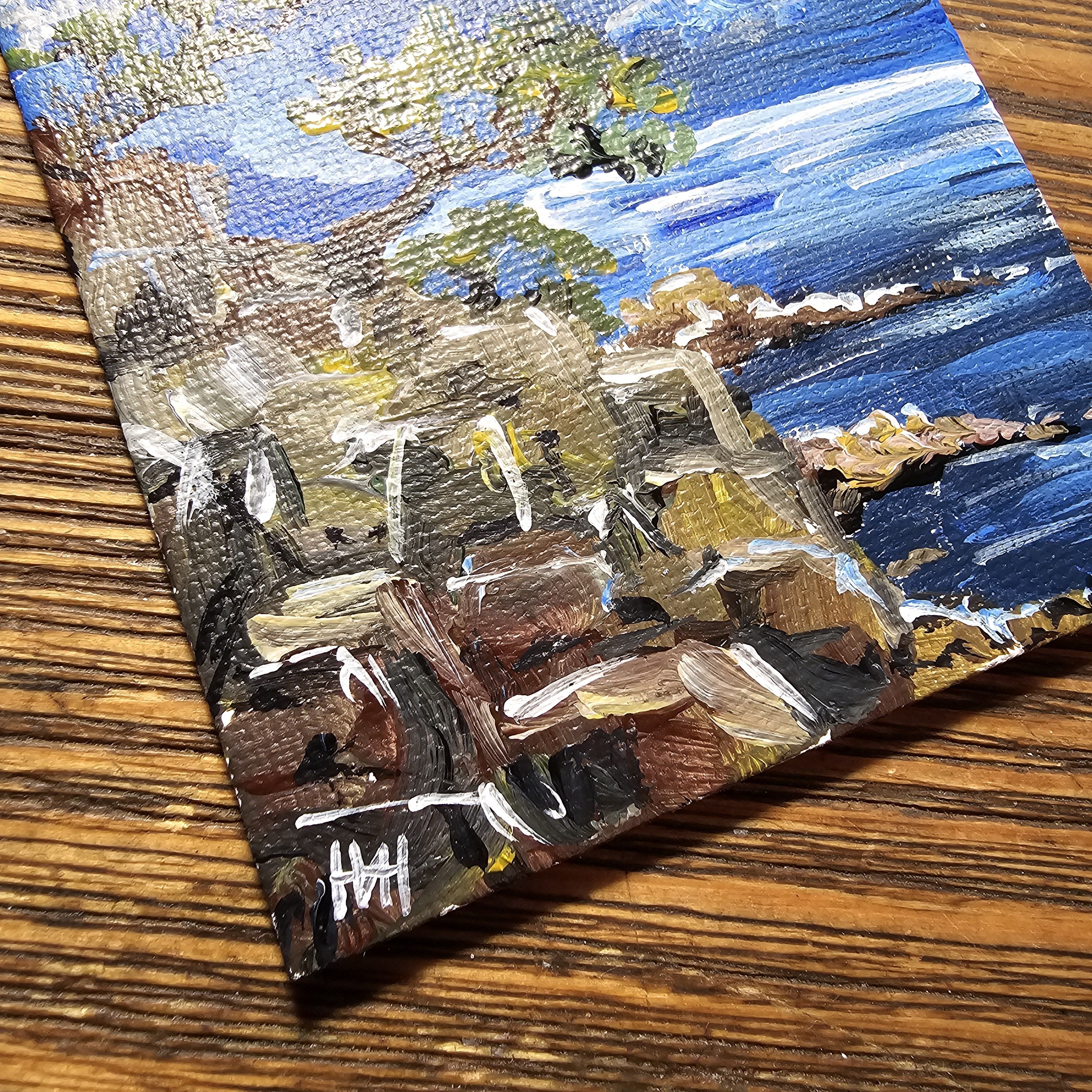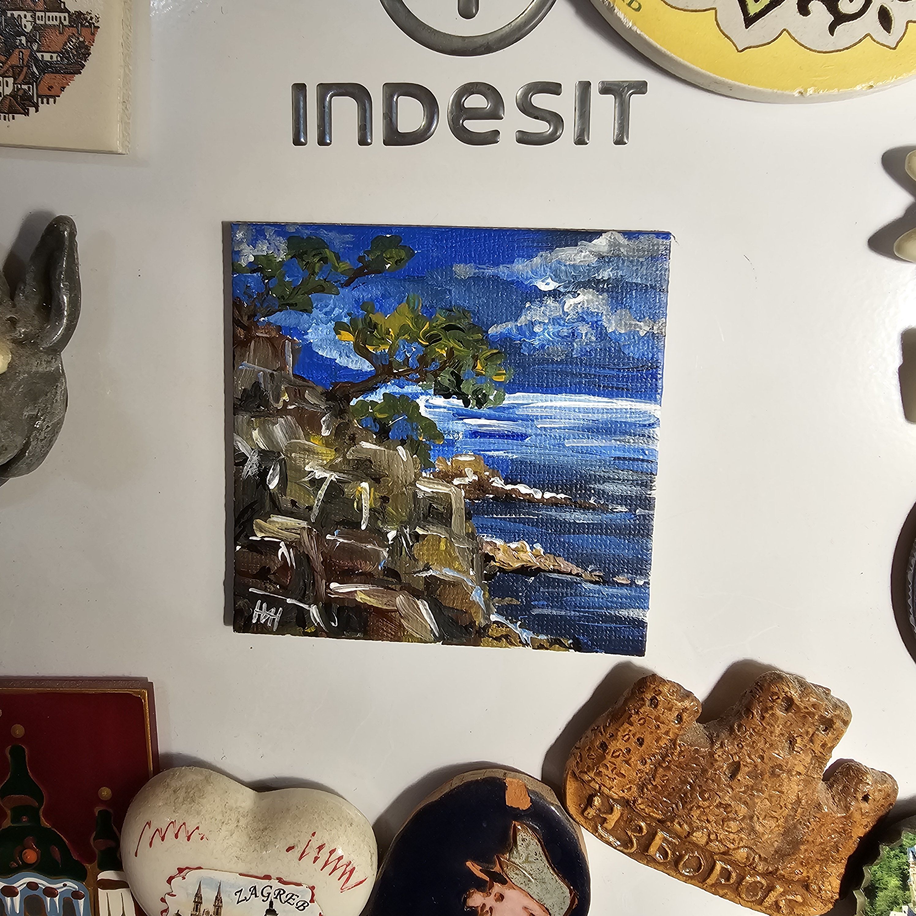 Нам представлена картина, выполненная в акриловой технике. На переднем плане изображены скалы с оттенками коричневого и серого, написанные широкими мазками. На скалах растут зелёные сосны. Фон картины занимает небо, выполненное в различных оттенках синего и белого, что создаёт впечатление движения облаков. Внизу справа гряды камней омываются морем. Общая композиция передаёт ощущение природного ландшафта, возможно, горного региона.