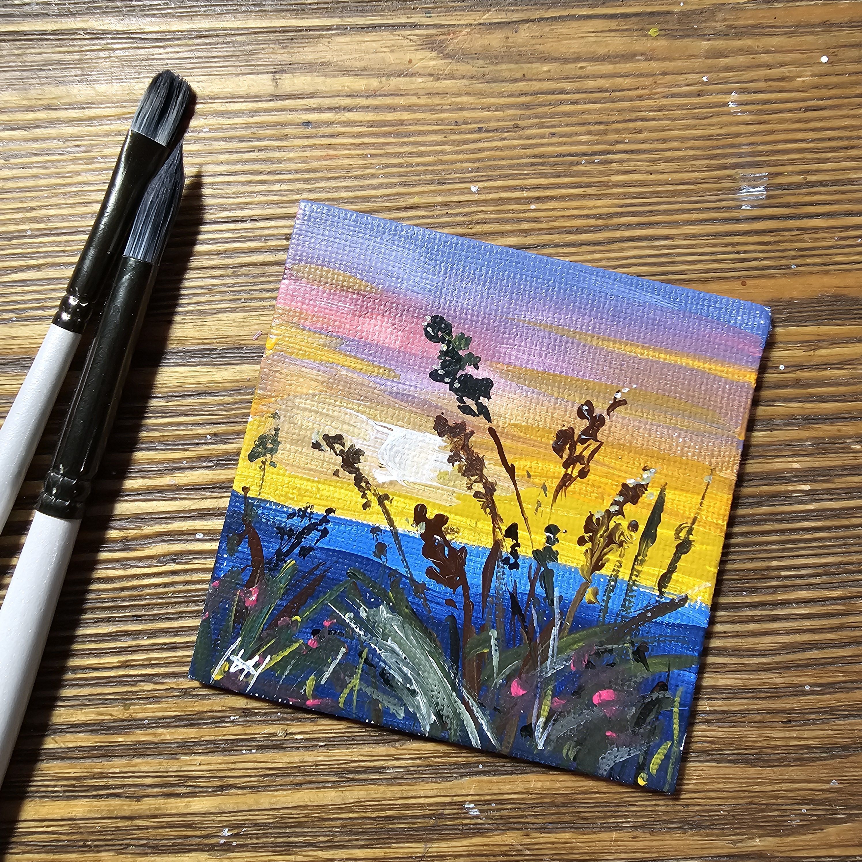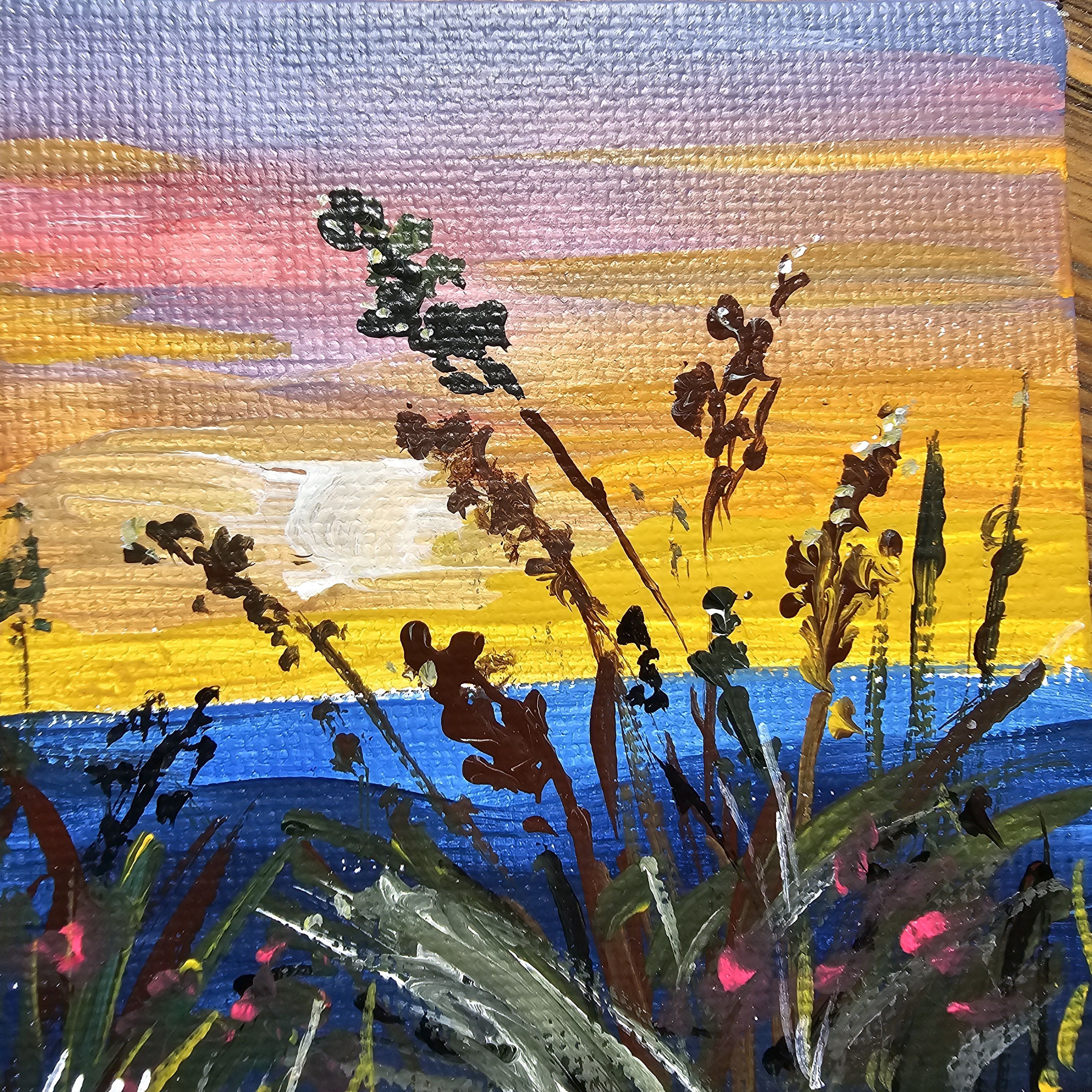 Это абстрактная картина выполненная акриловыми красками. На ней разноцветные мазки создают вечернее закатное небо из переходящих друг в друга оттенков жёлтого, синего, розового и фиолетового. На переднем плане видны тёмные стилизованные травы, которые нанесены хаотично. Общая композиция производит впечатление динамики и живости, сочетая яркие и насыщенные цвета.