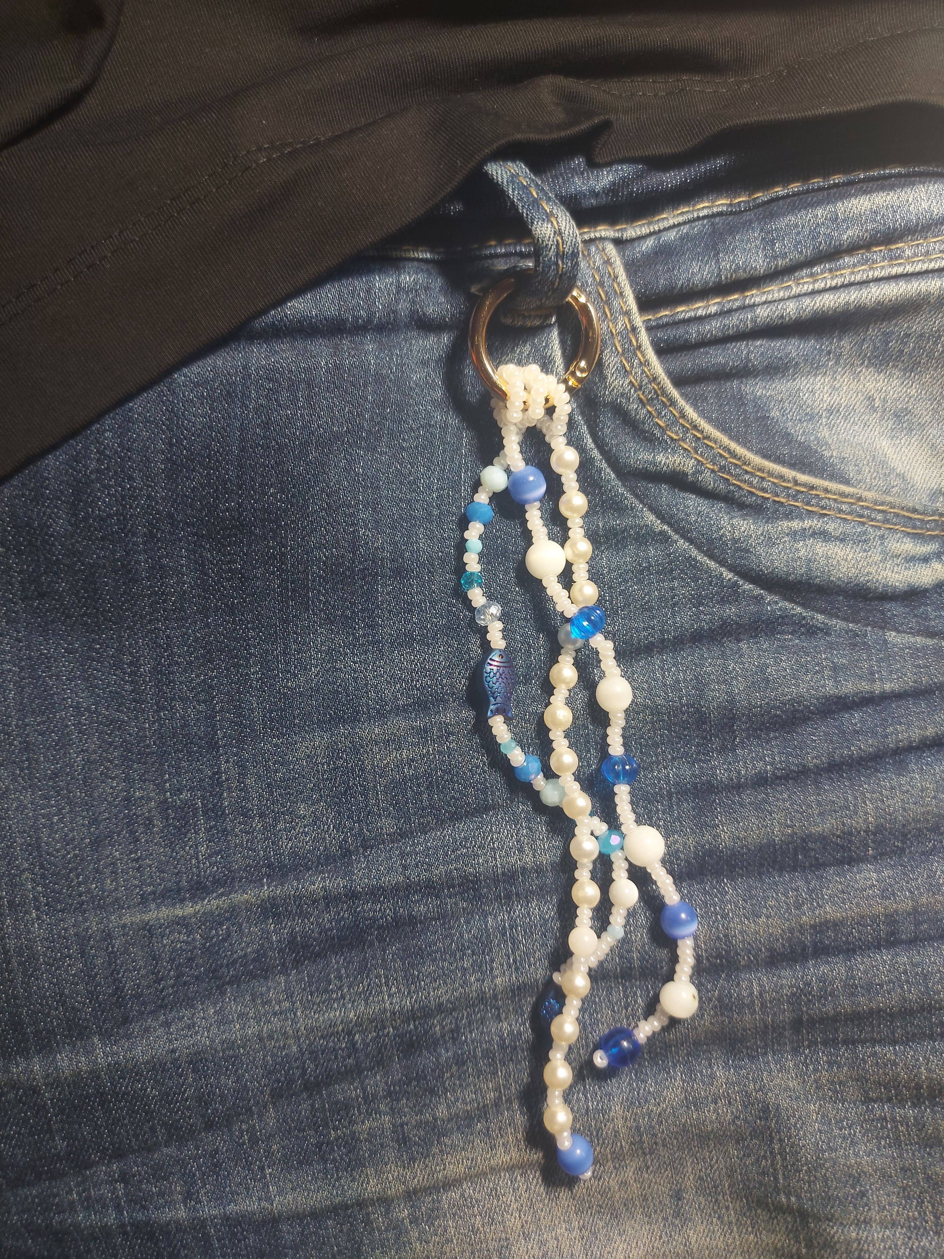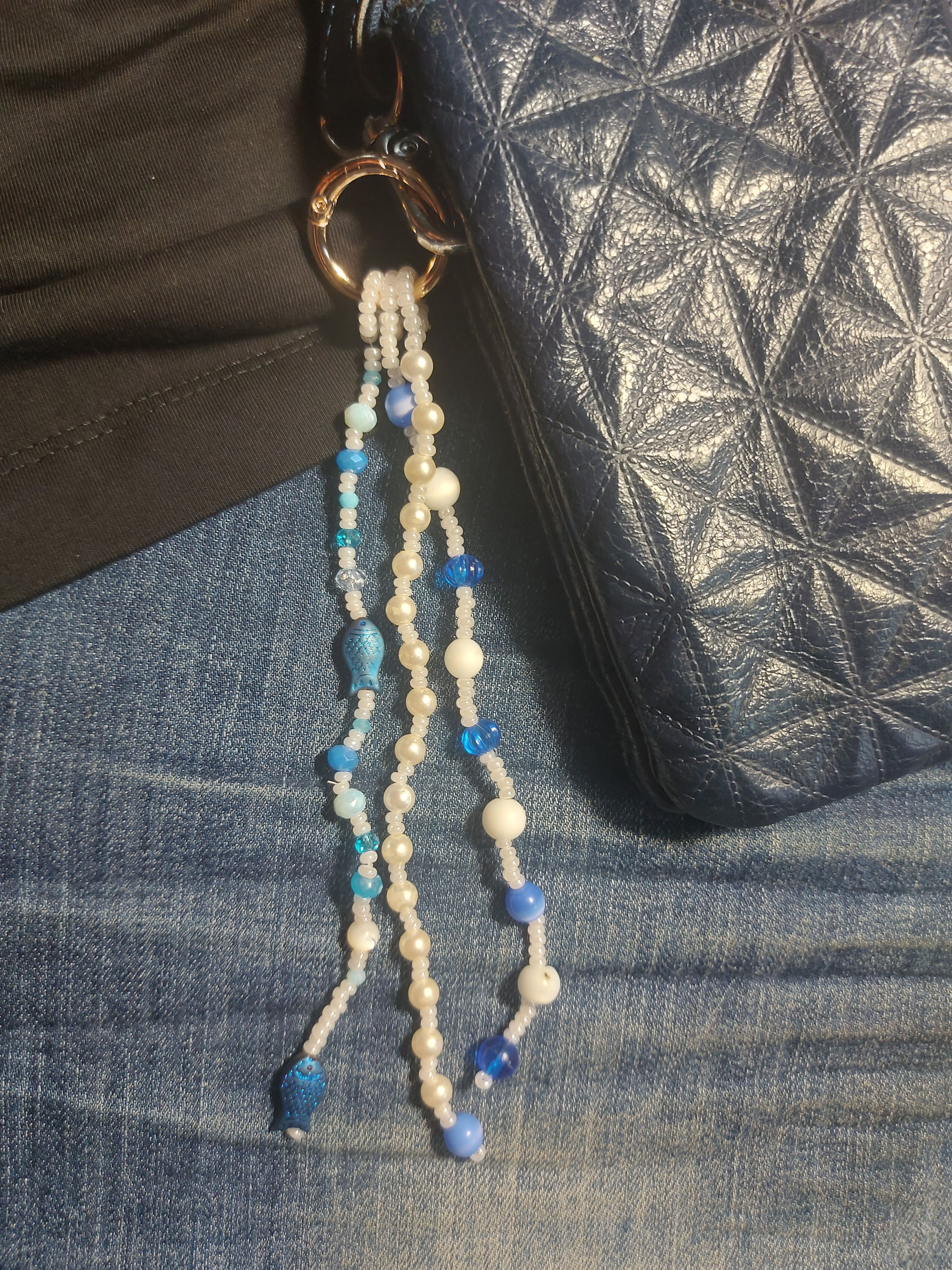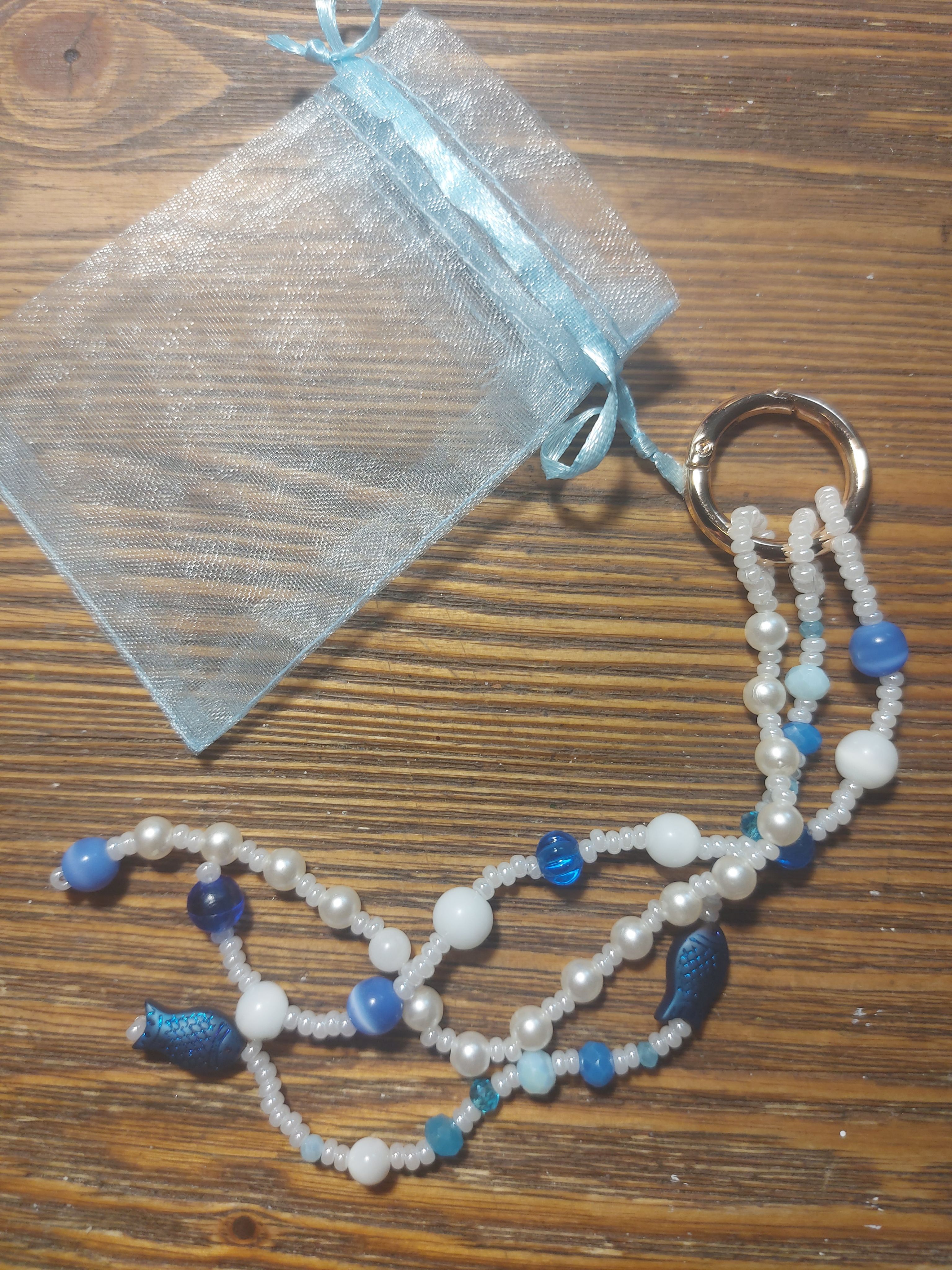 Обвес выполнен из небольших белых и голубых бусин, бисера, стекляруса и дополнен синими рыбками.