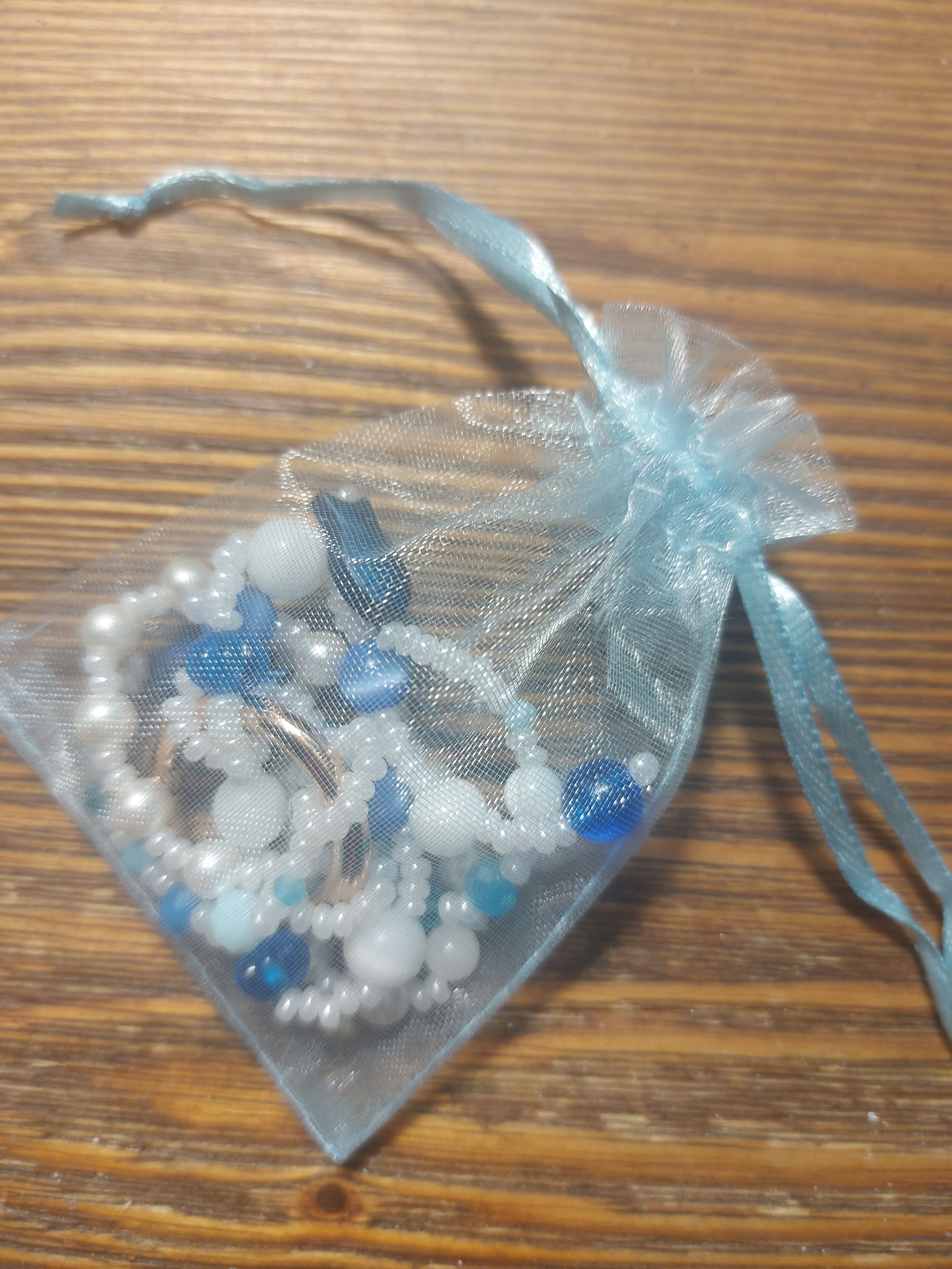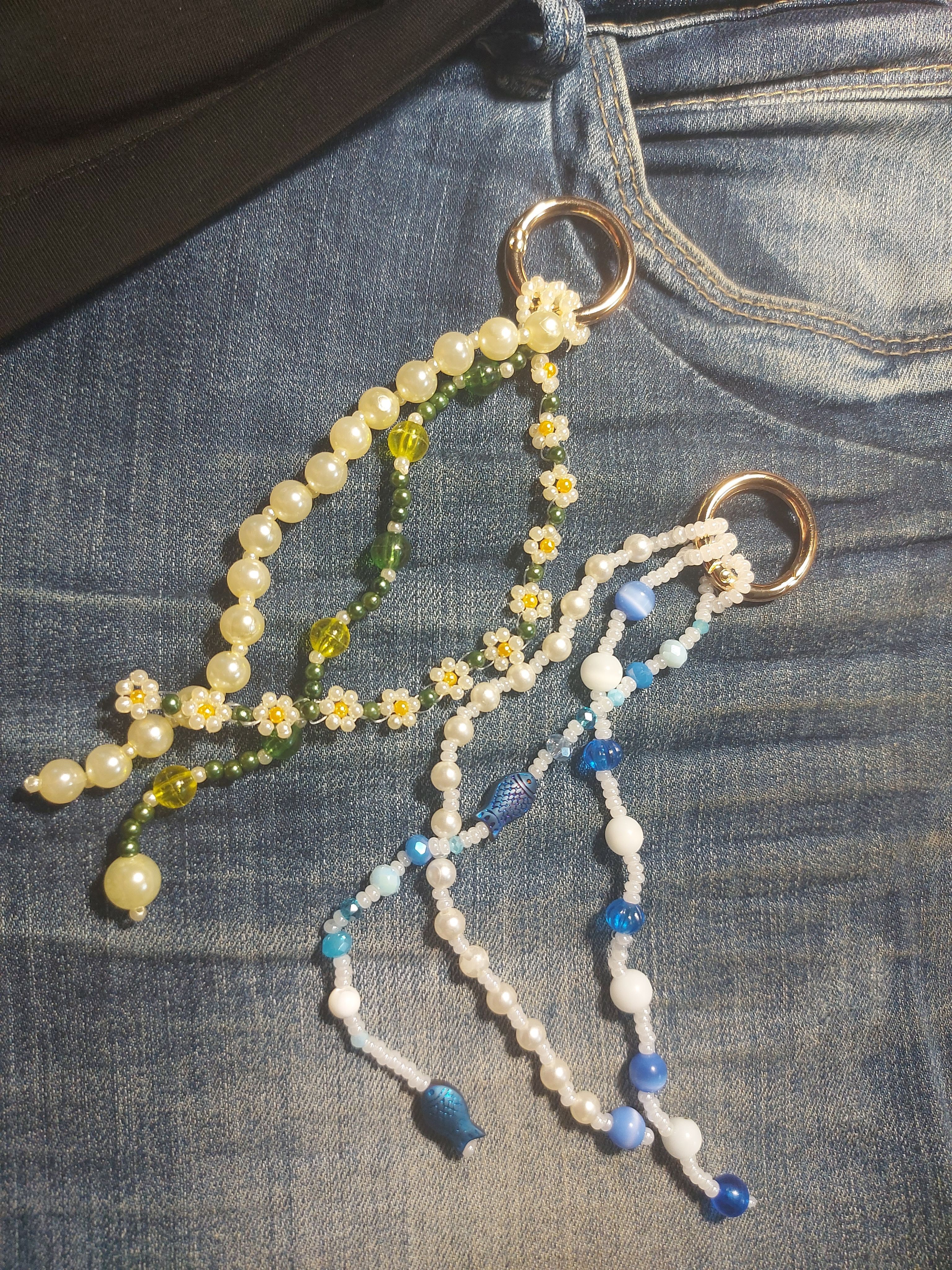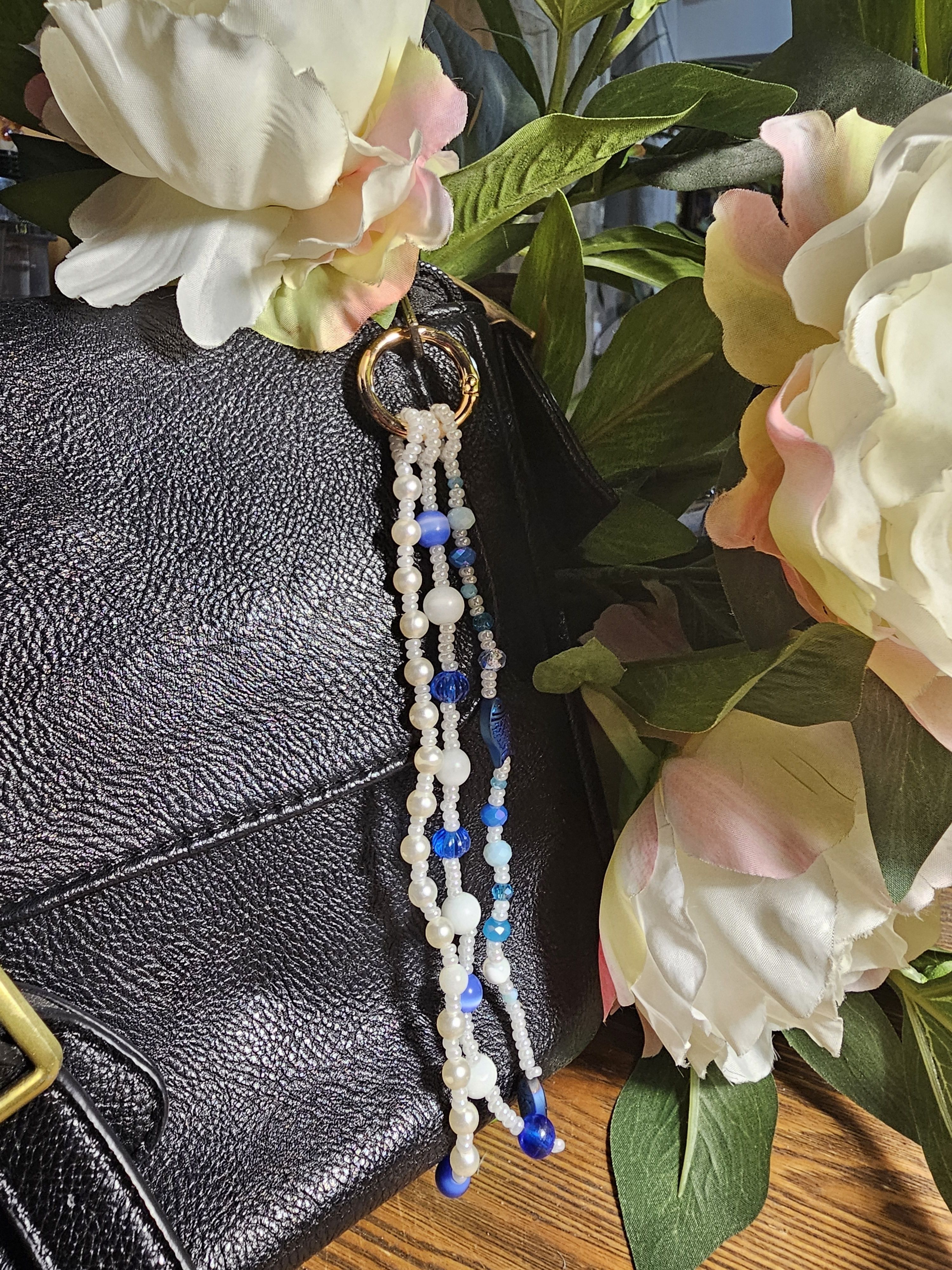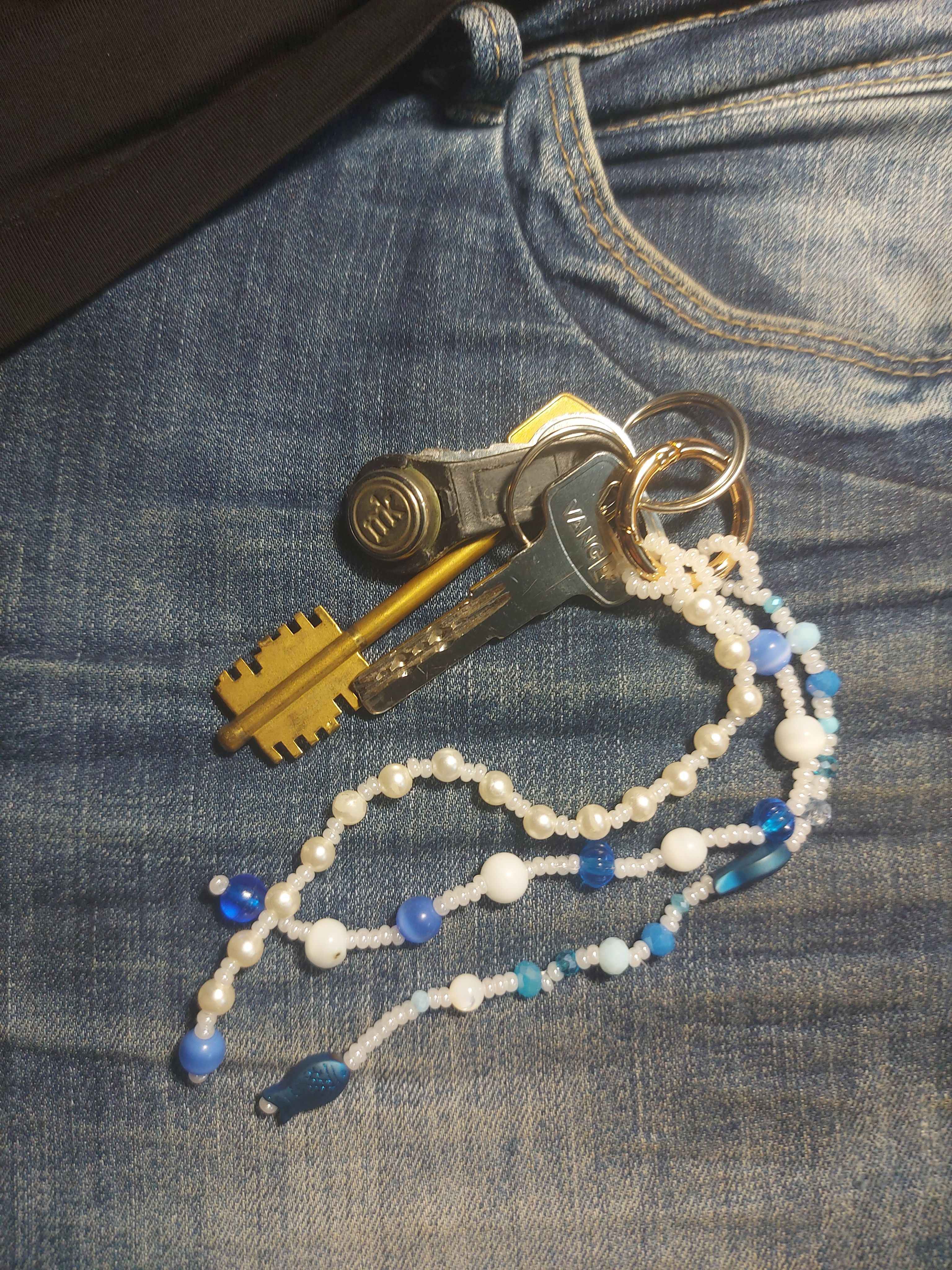 Обвес выполнен из небольших белых и голубых бусин, бисера, стекляруса и дополнен синими рыбками.