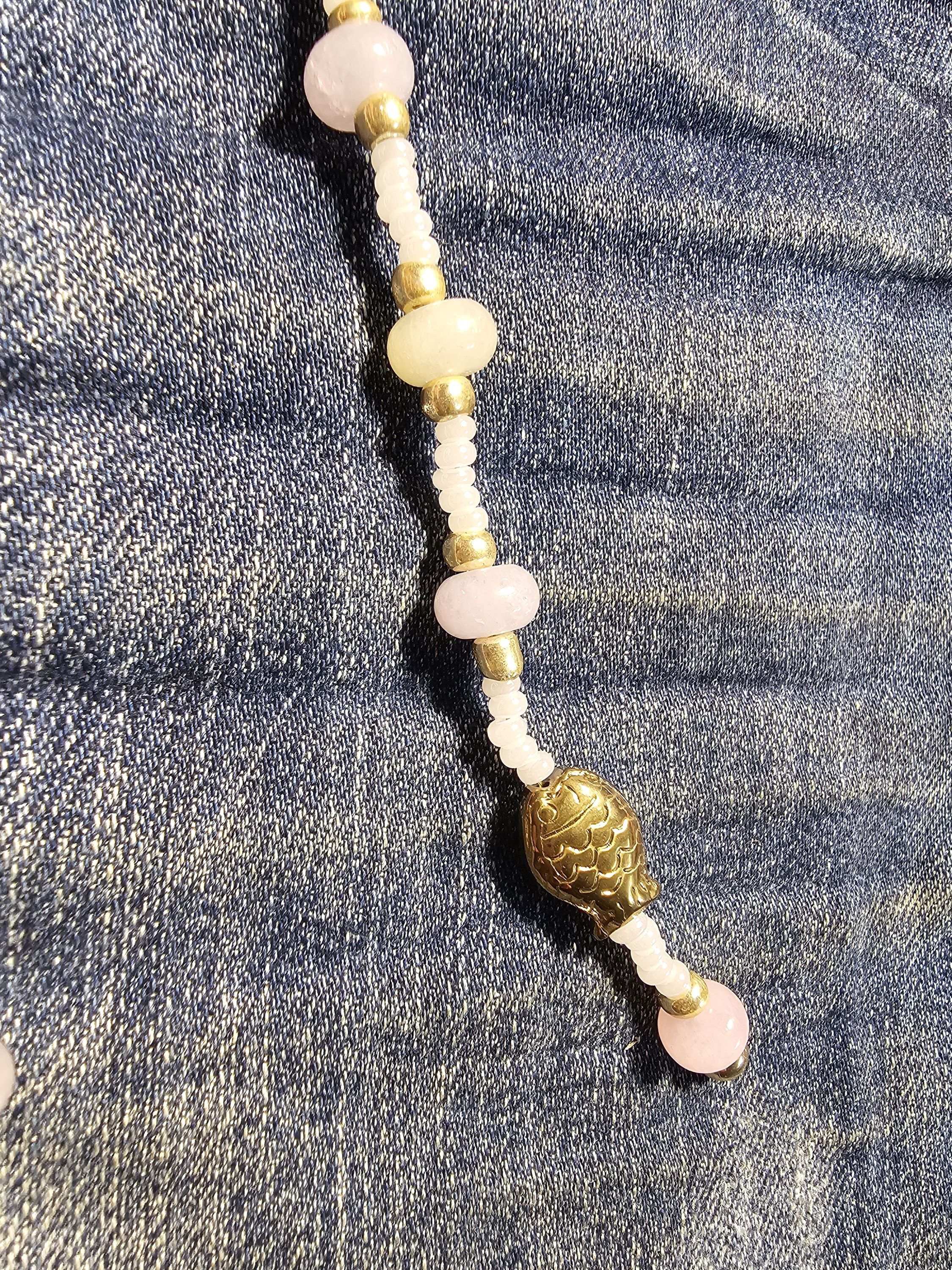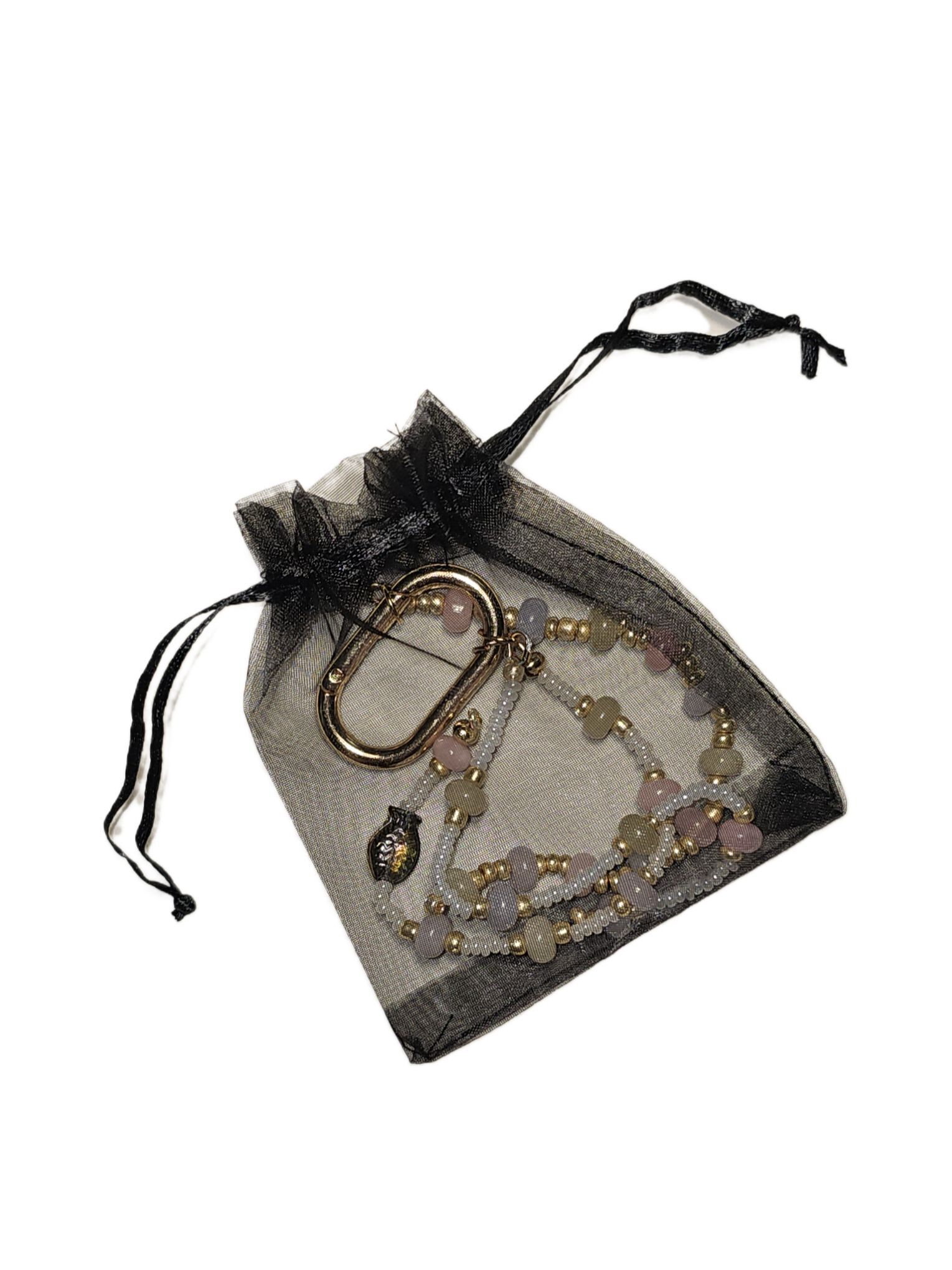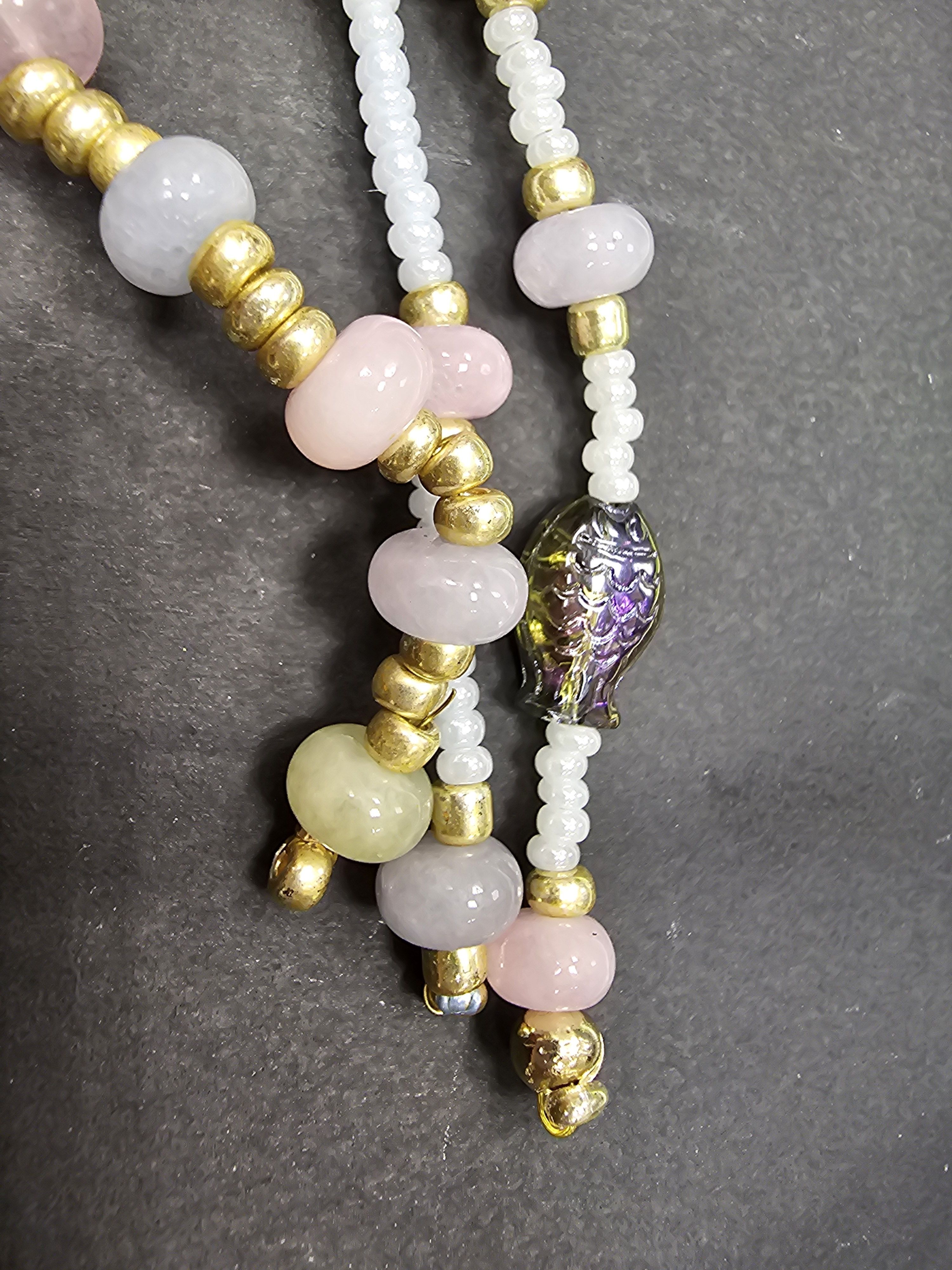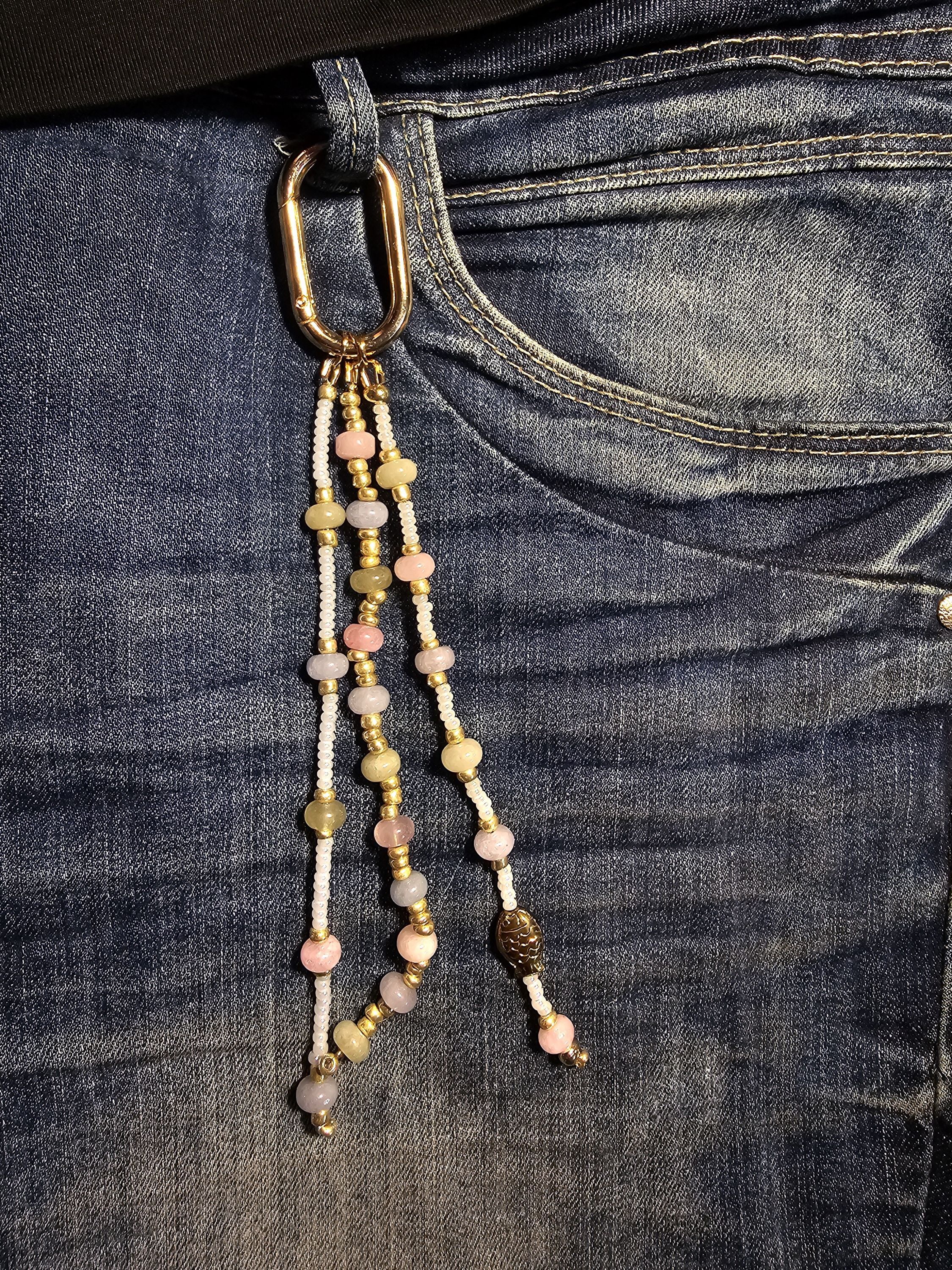 Обвес выполнен из небольших овальных розовых, зеленых и голубых бусин бериллового кварца размером 5х8 мм и крупного бисера.