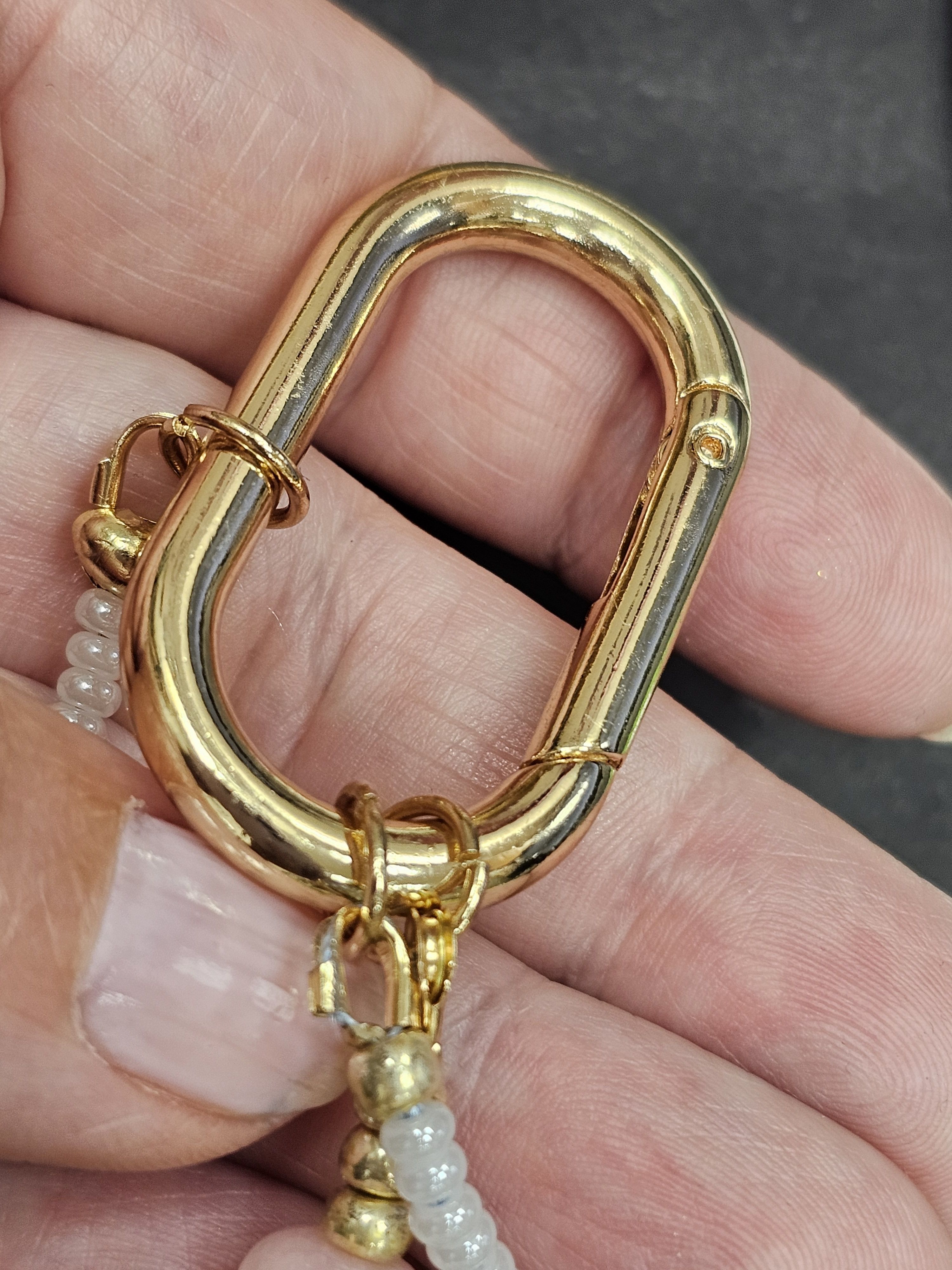 Заканчивается овал-карабином 42,5 * 24 мм, золотого цвета, для крепления к ключам или другим предметам.