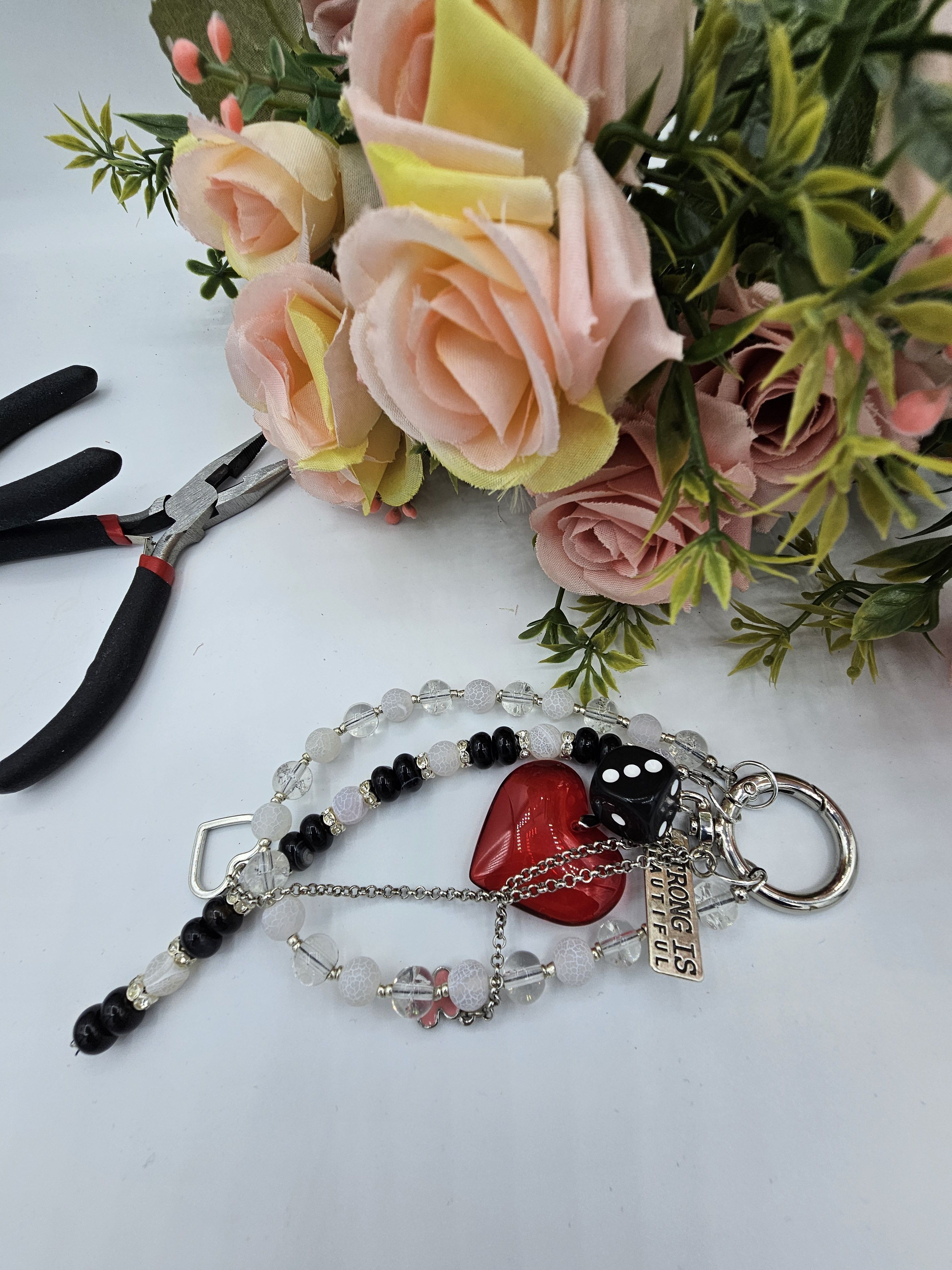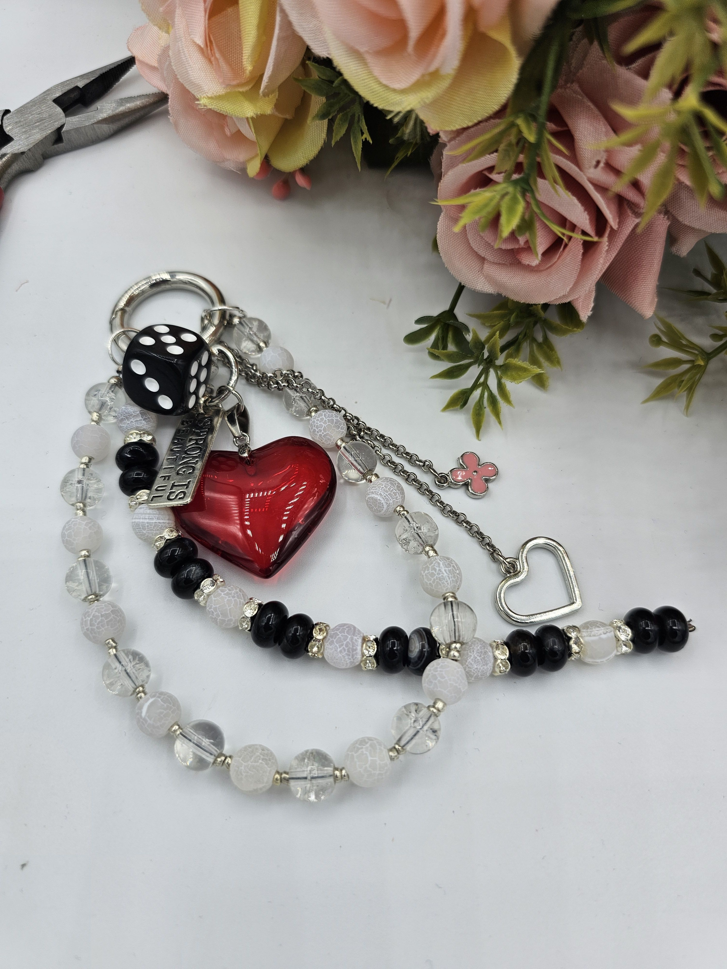 Обвес выполнен из круглых бусин белого матового Агата, черного глянцеаого Агата, бусин из стекла и крупного бисера.
