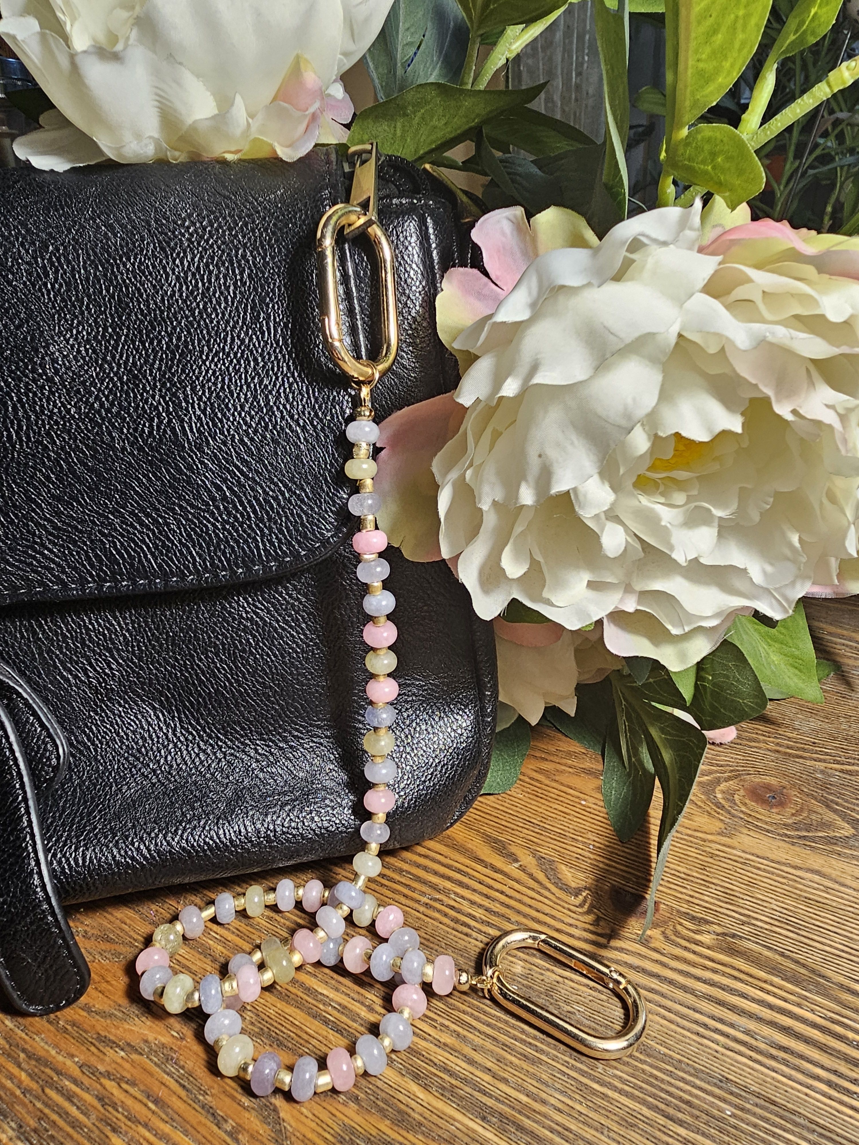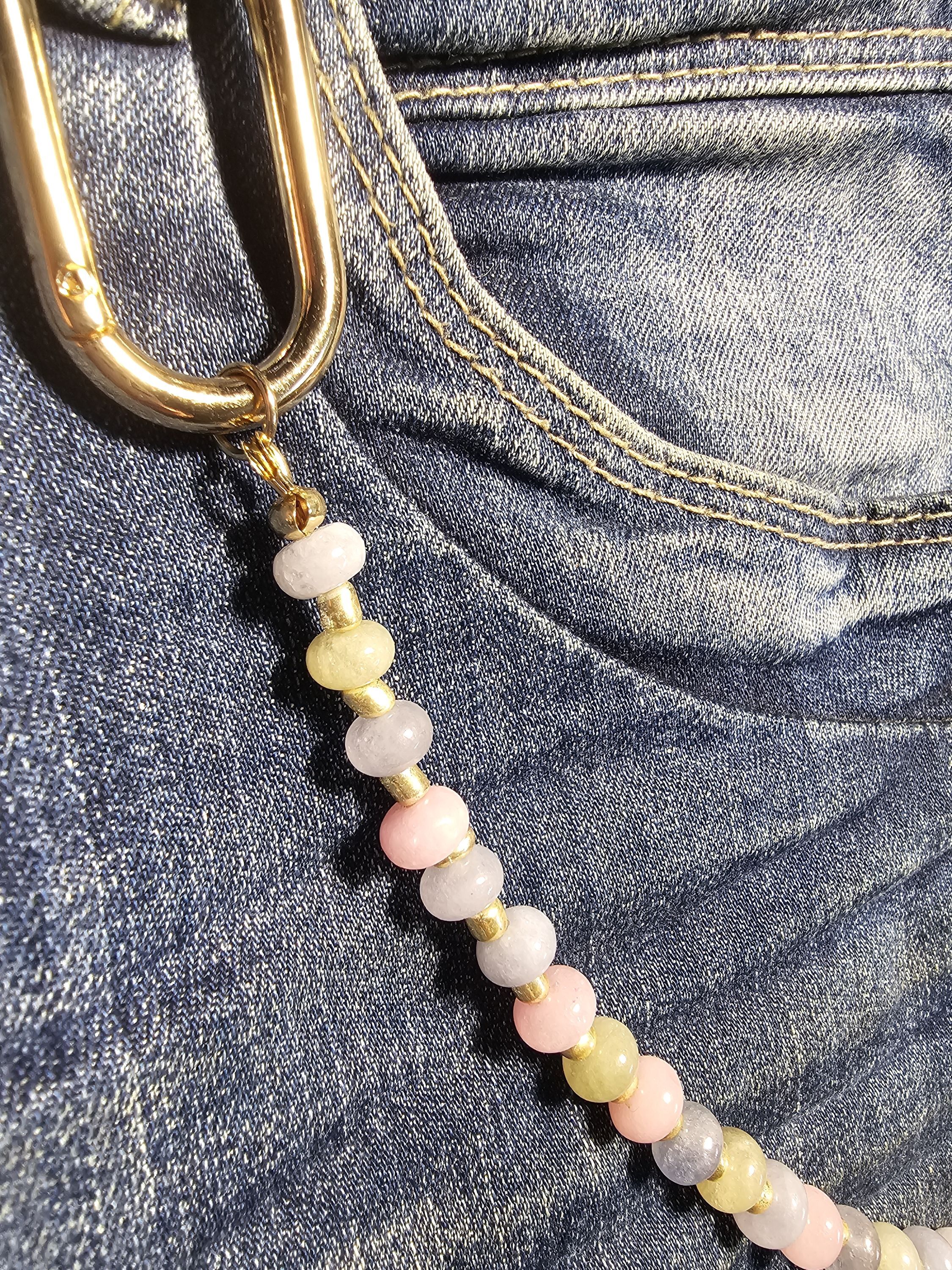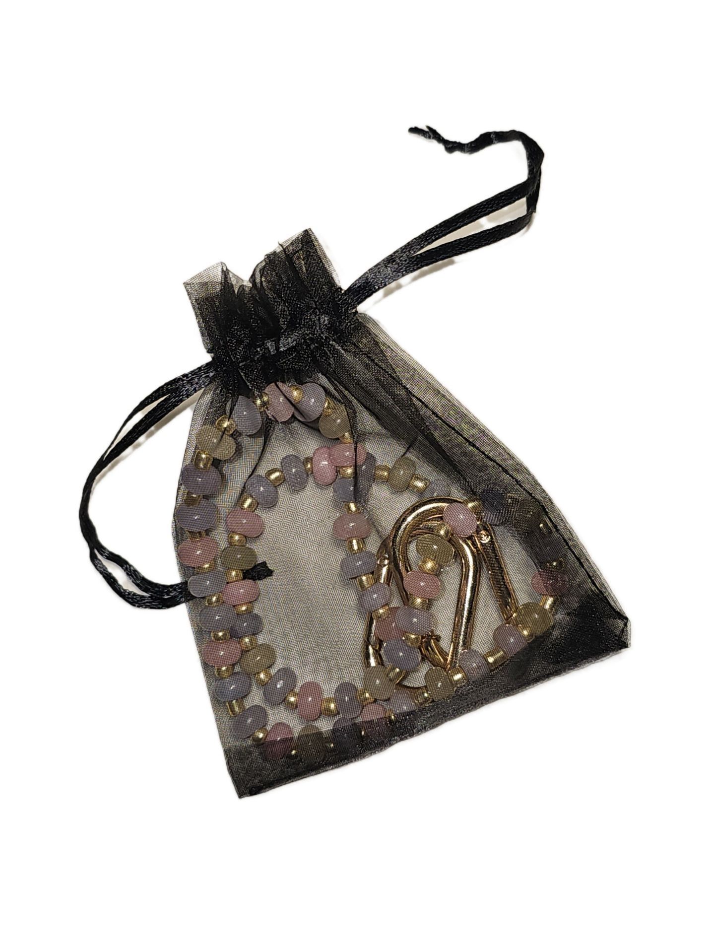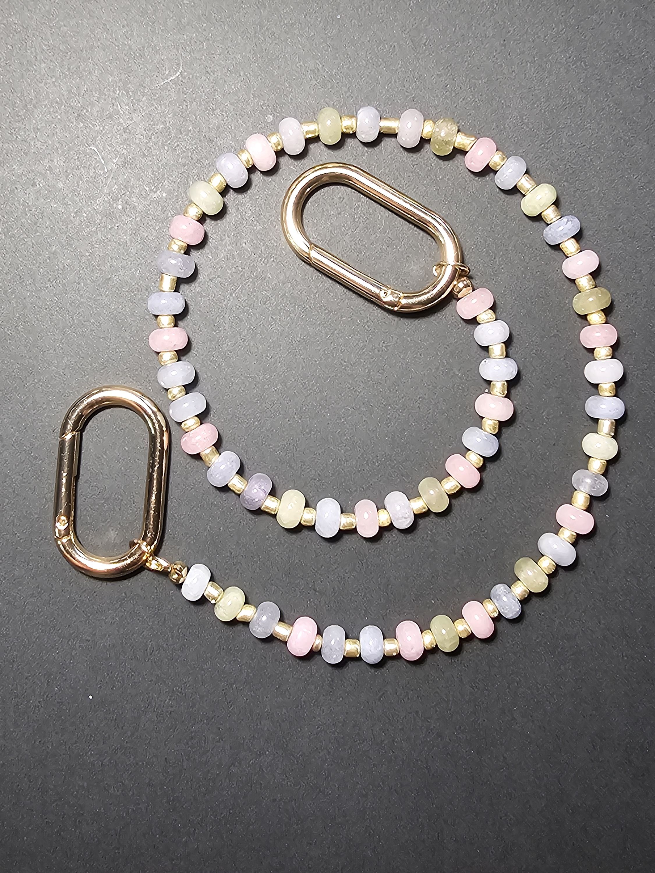 Заканчивается обвес двумя овал-карабинами 42,5 * 24 мм, золотого цвета, для крепления к сумке, одежде или другим предметам.