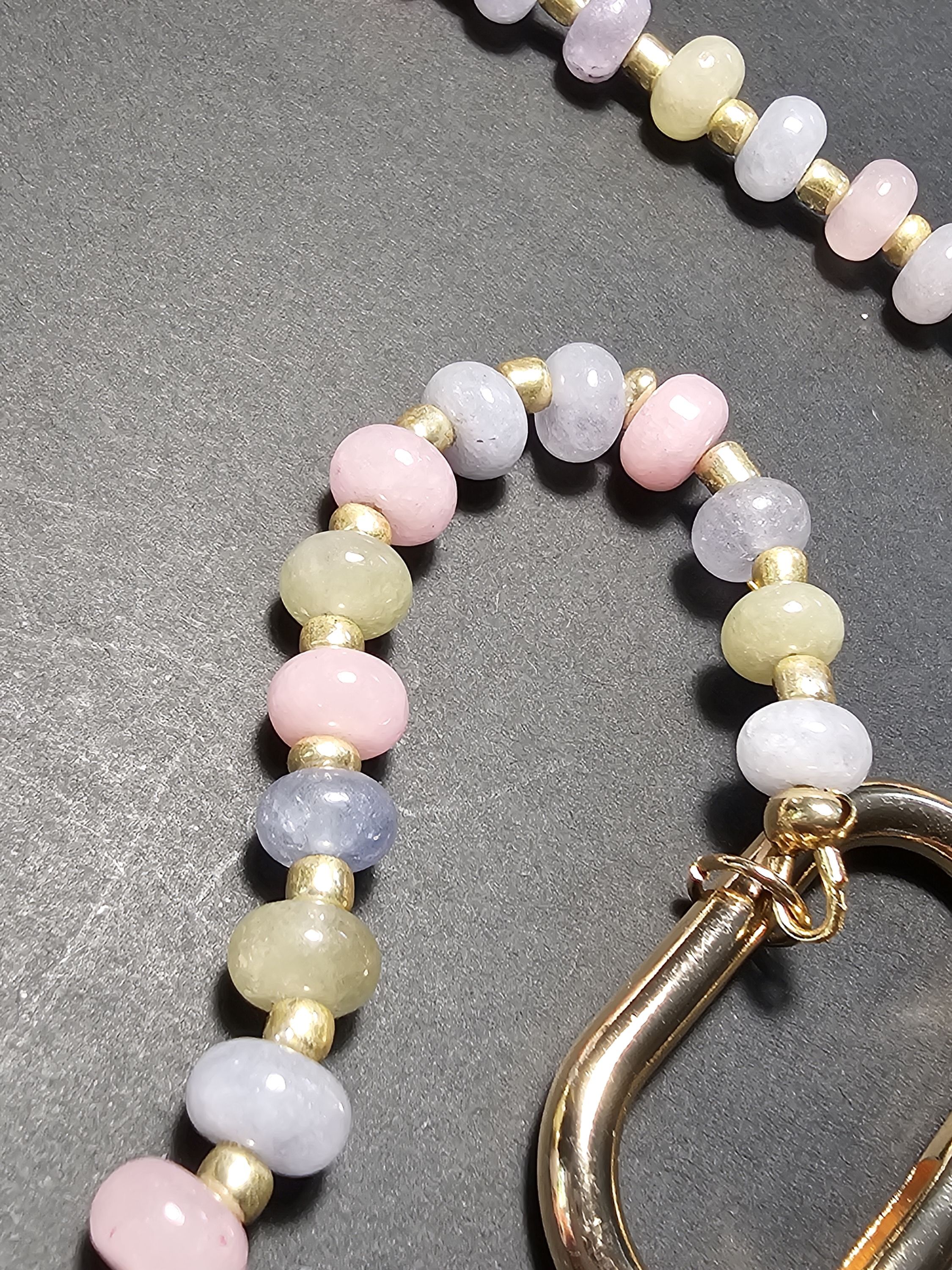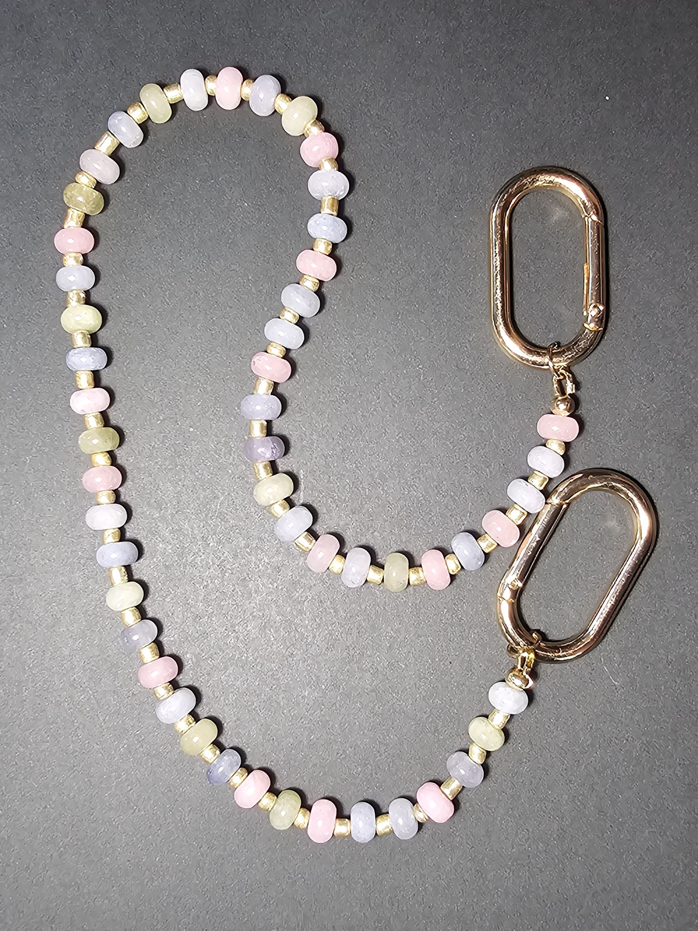 Обвес выполнен из небольших овальных розовых, зеленых и голубых бусин бериллового кварца размером 5х8 мм и крупного золотого бисера.