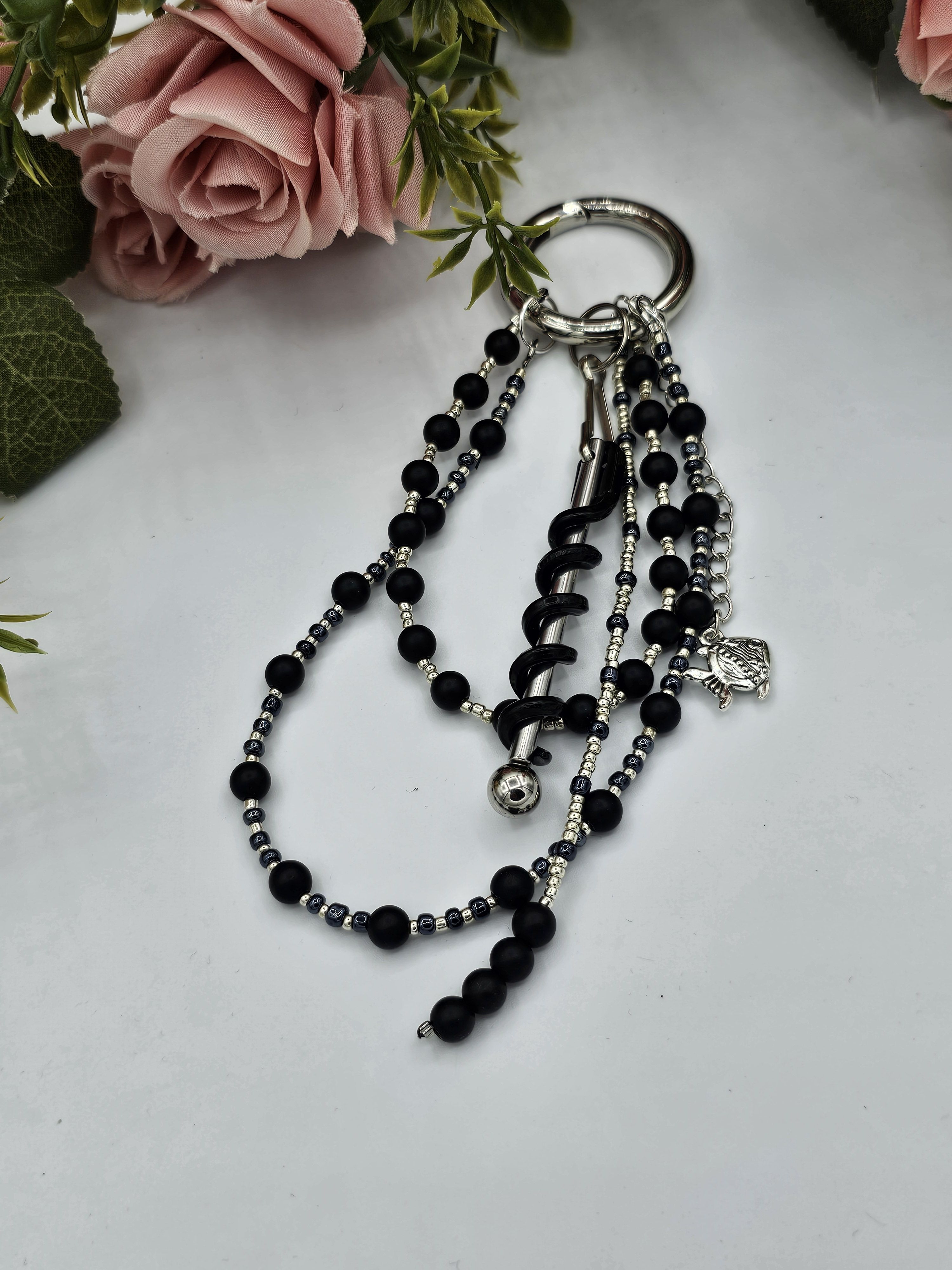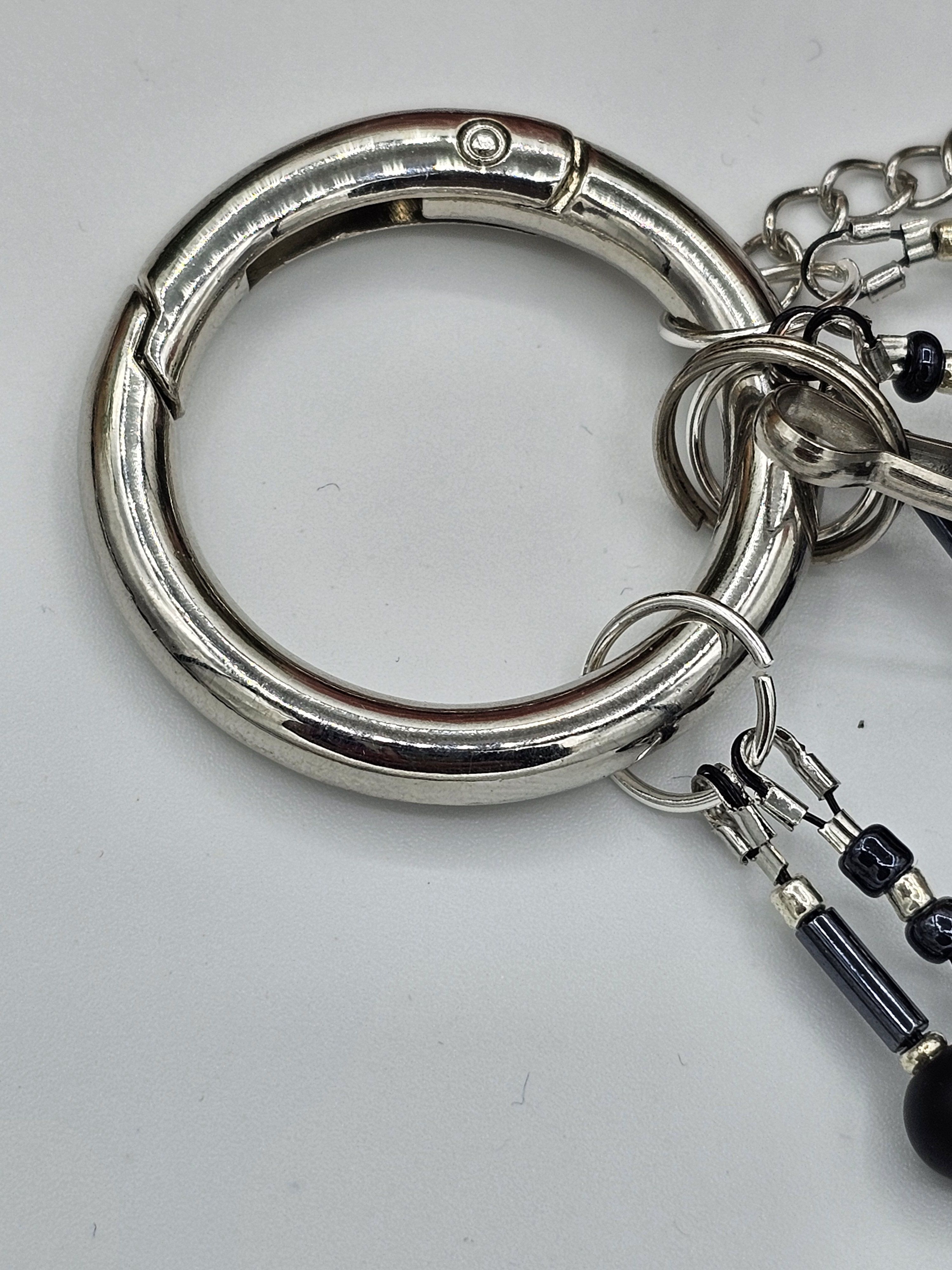 Заканчивается карабином 35 мм, серебистого цвета, для крепления к ключам или другим предметам.