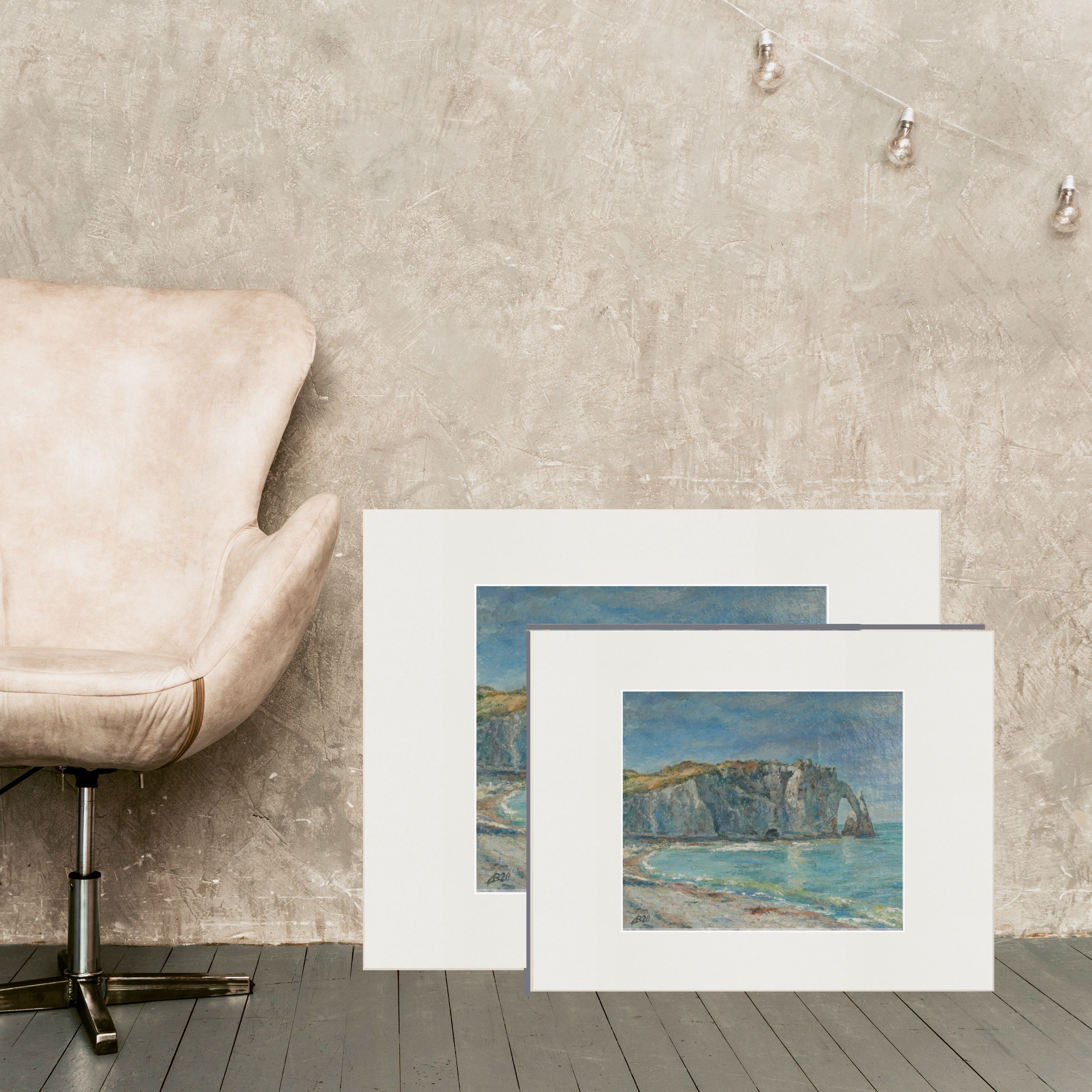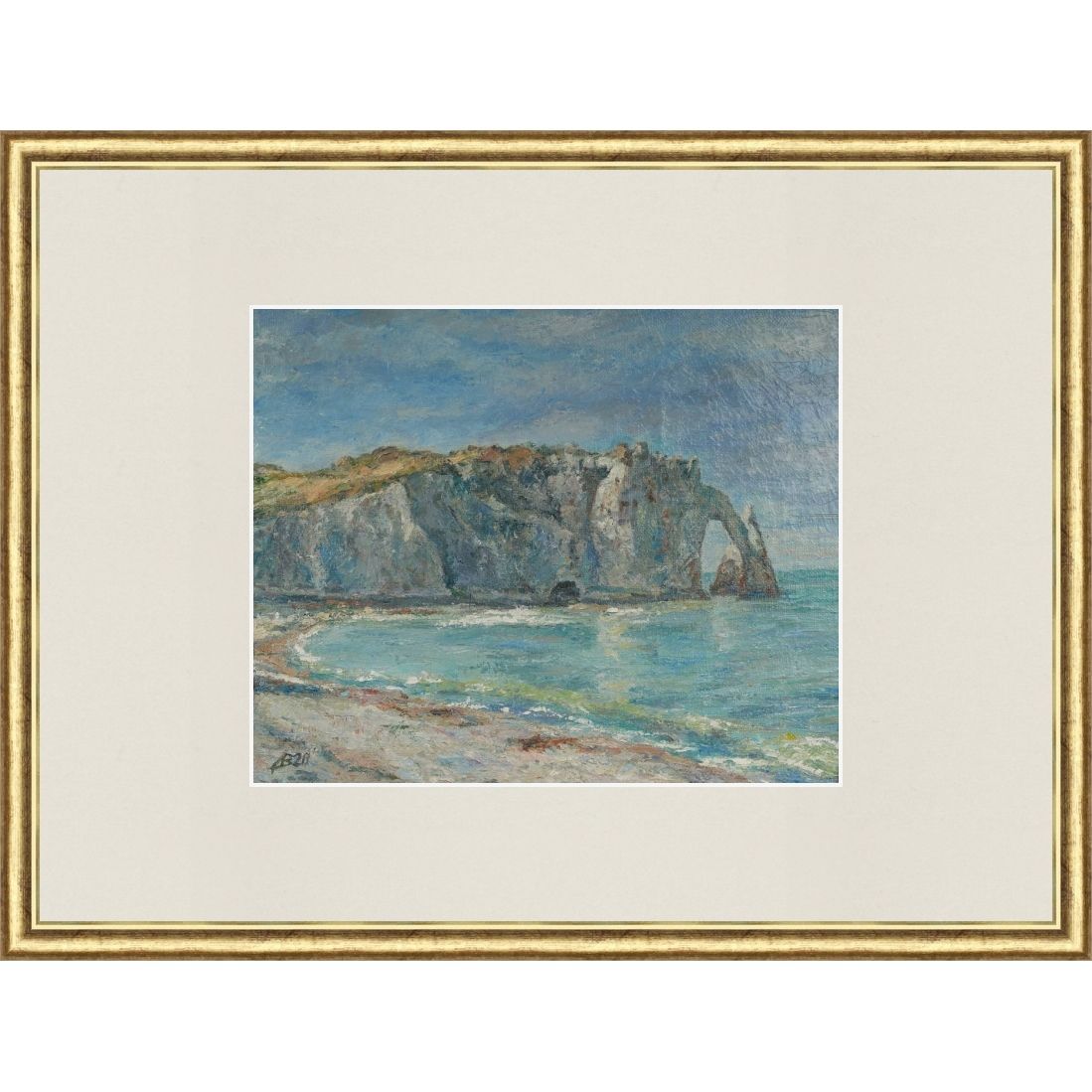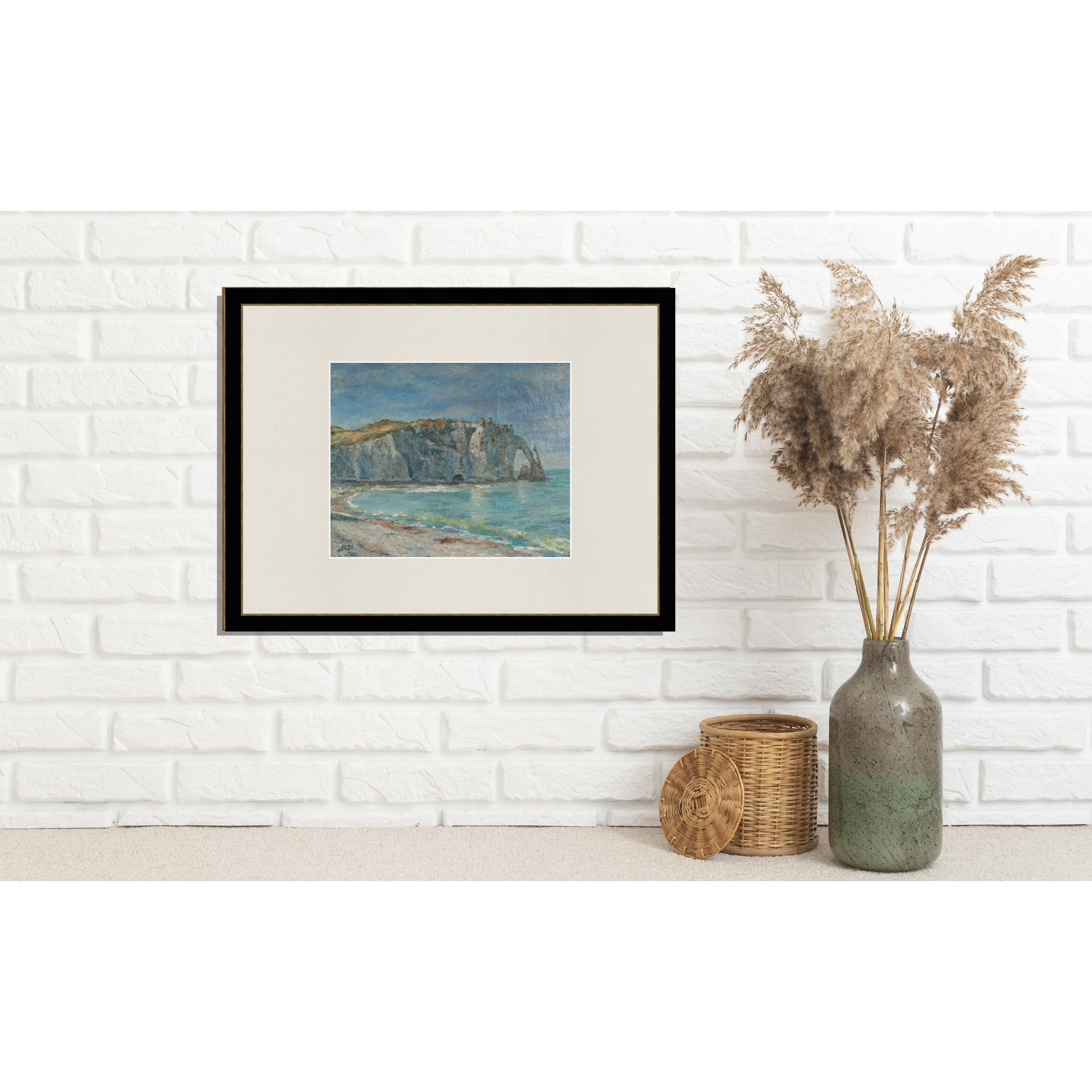 На этом постере представлена картина, на которой изображен морской пейзаж. В центре картины находится скалистый утес, уходящий в море. У подножия утеса виден небольшой пляж с волнами. Небо над морем голубое с легкими облаками. На переднем плане изображен песчаный берег с примесью морских водорослей. Весь пейзаж выполнен в мягких пастельных тонах, создавая спокойную и умиротворяющую атмосферу.