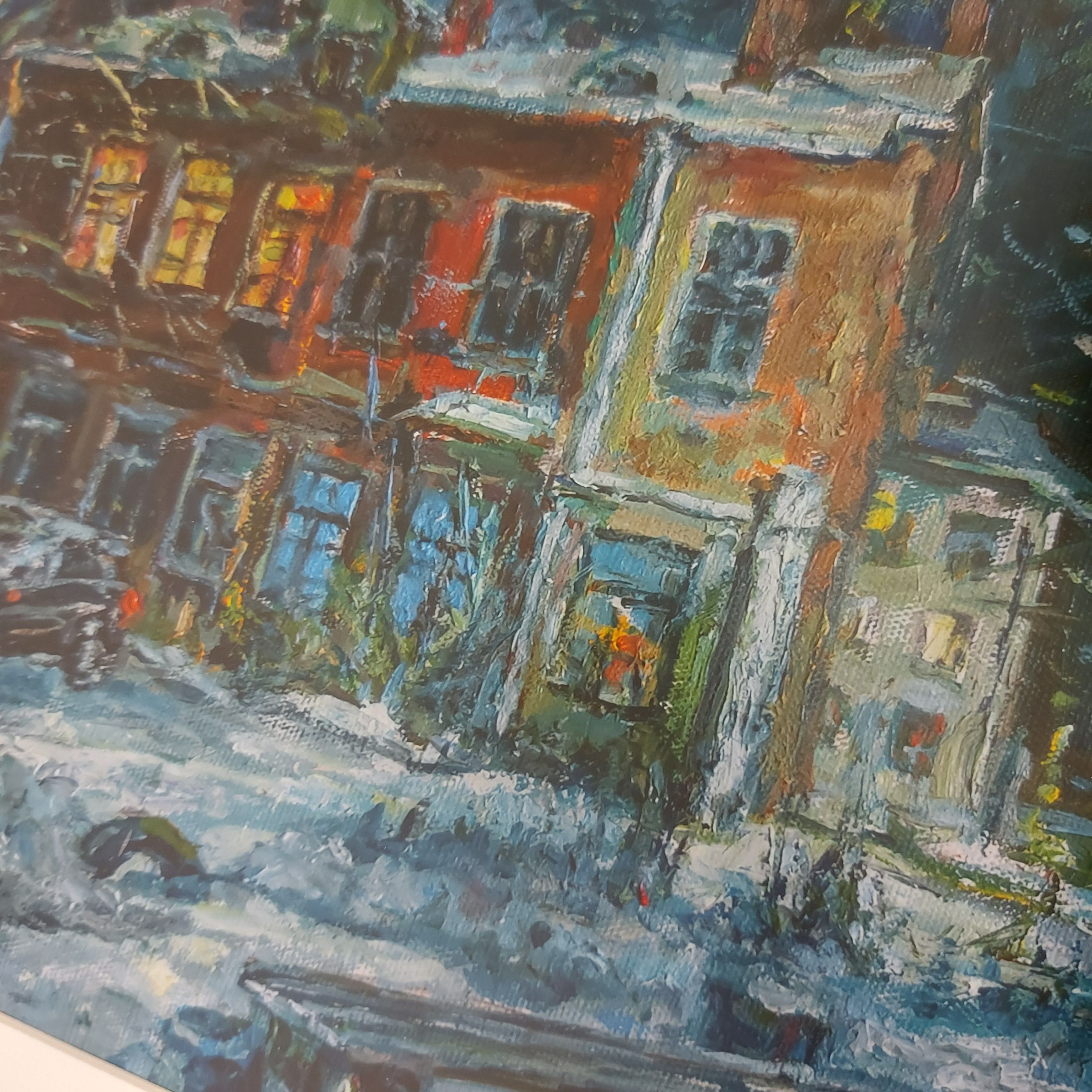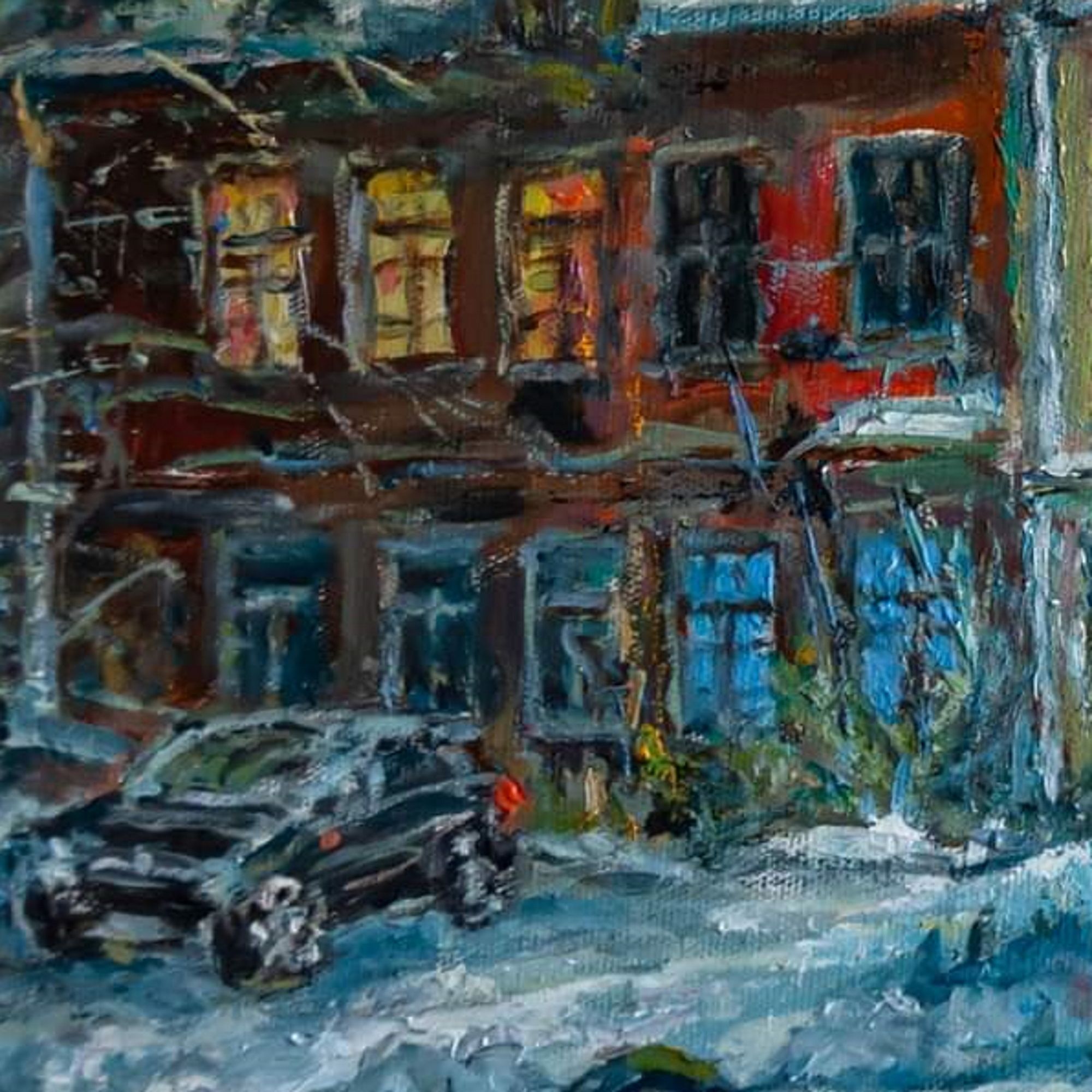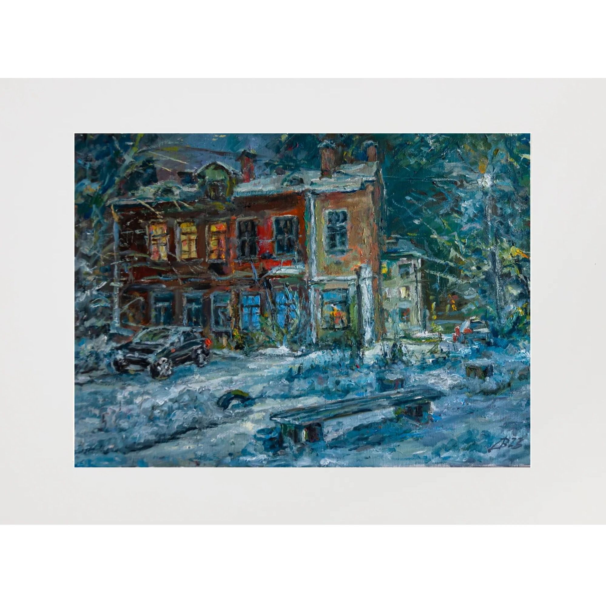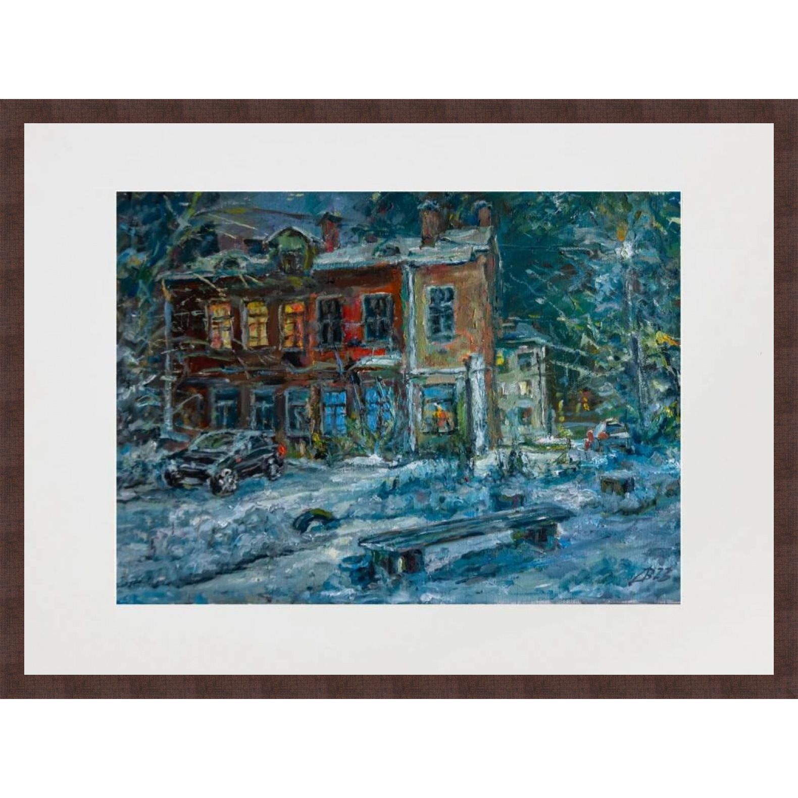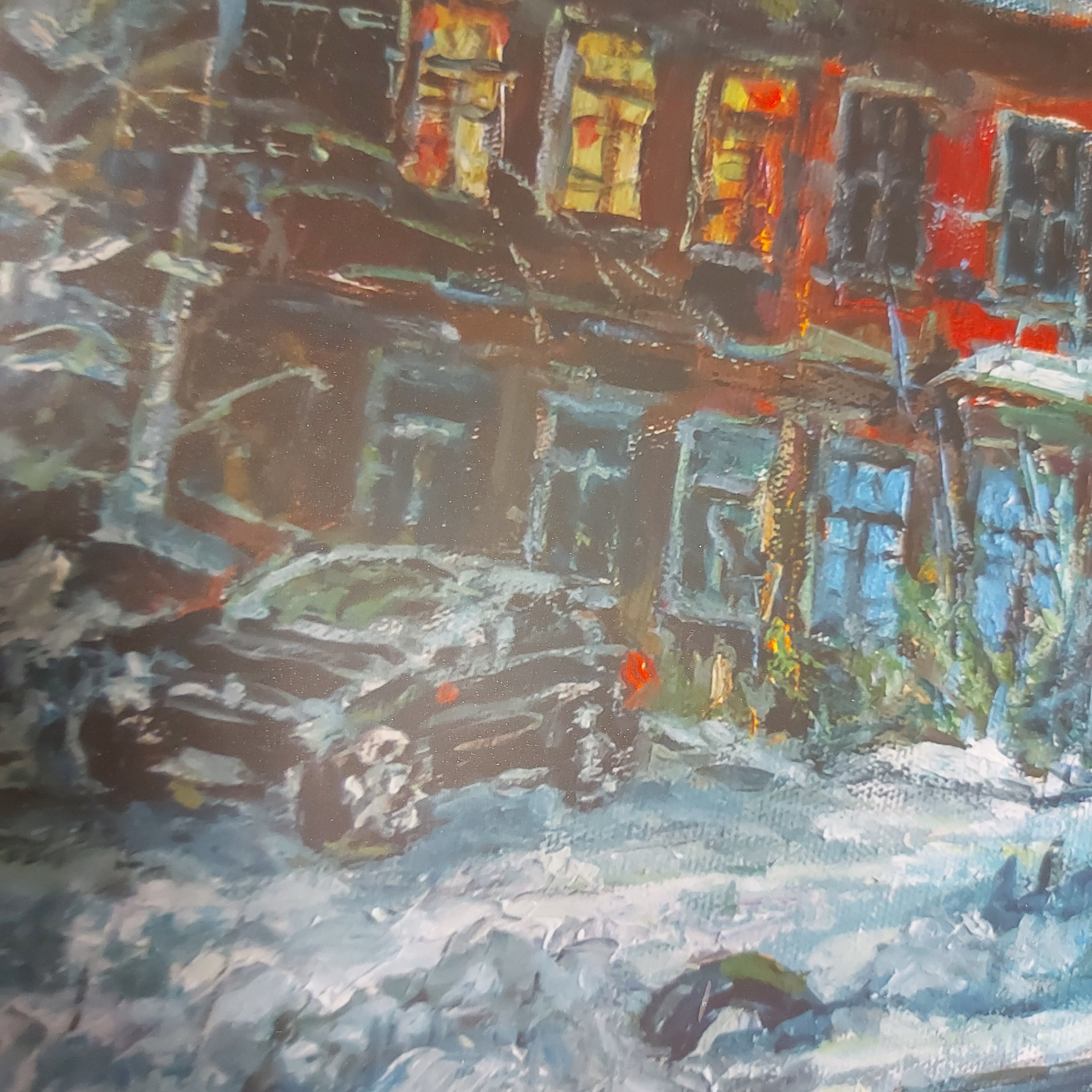 Над сценой нависают деревья, образующие темный силуэт на фоне неба, которое выполнено в голубых и синих тонах, усиливающих ощущение зимнего вечера или ночи. Возможно, улица освещается уличными фонарями, добавляющими на картину блики и световые пятна желтого и белого цветов.