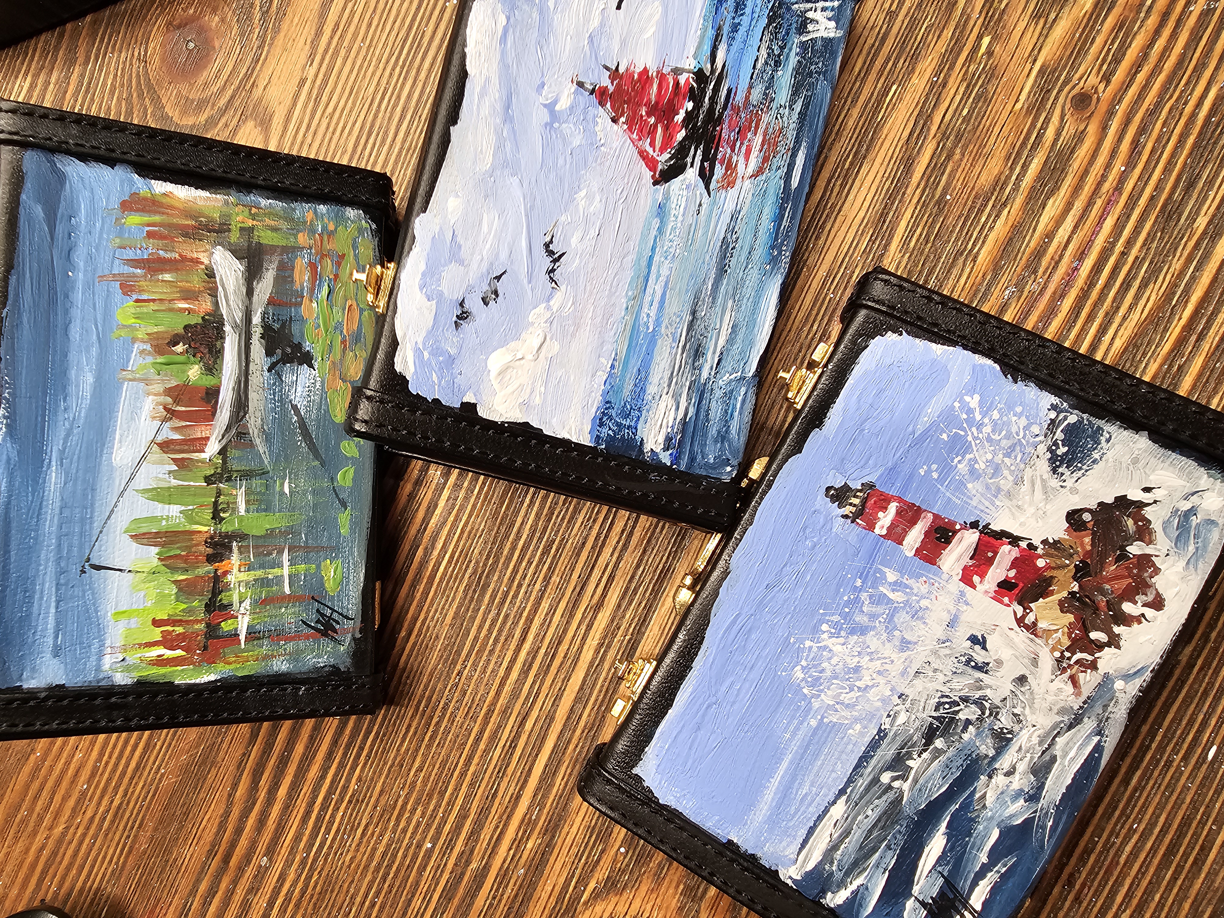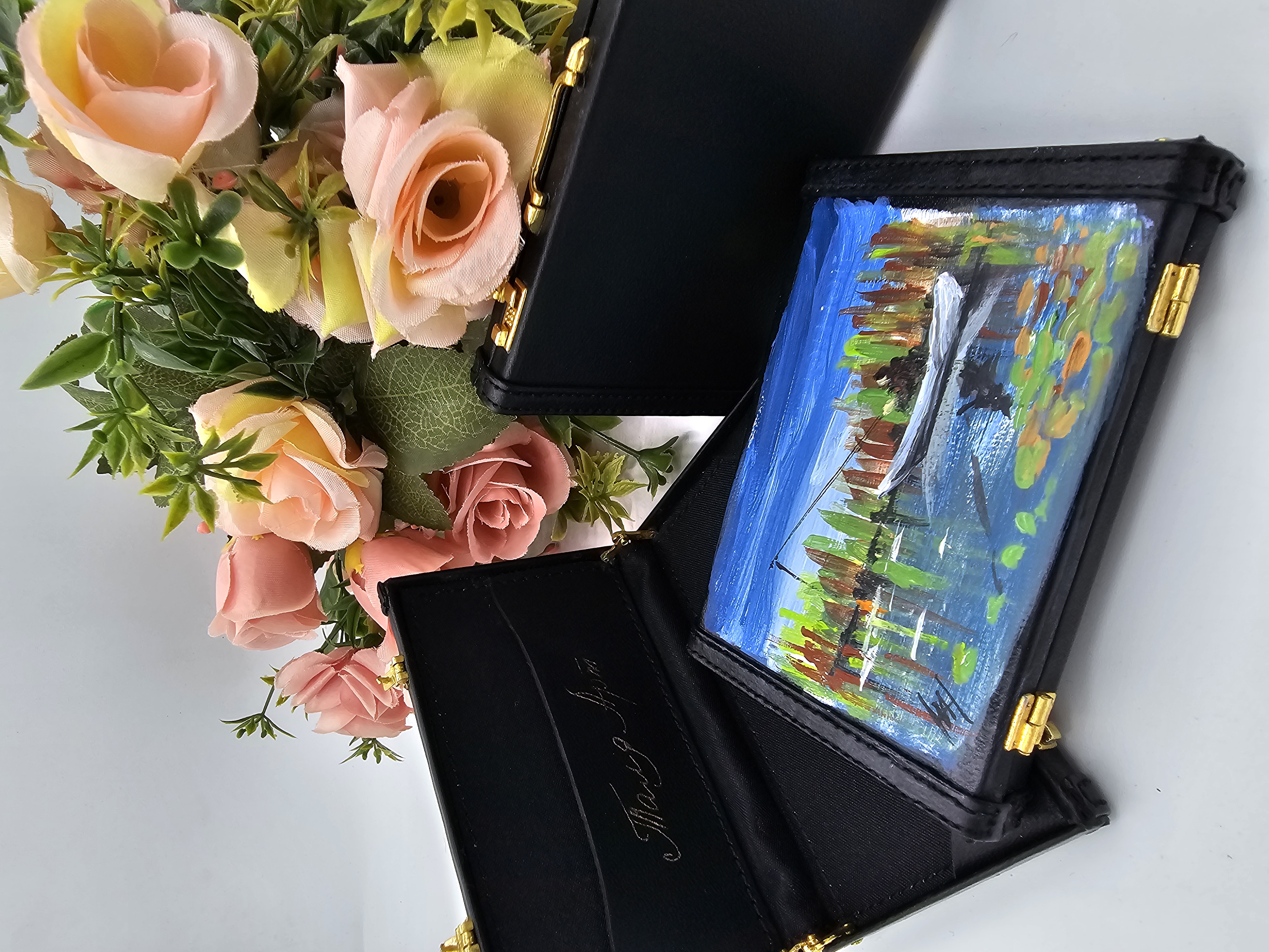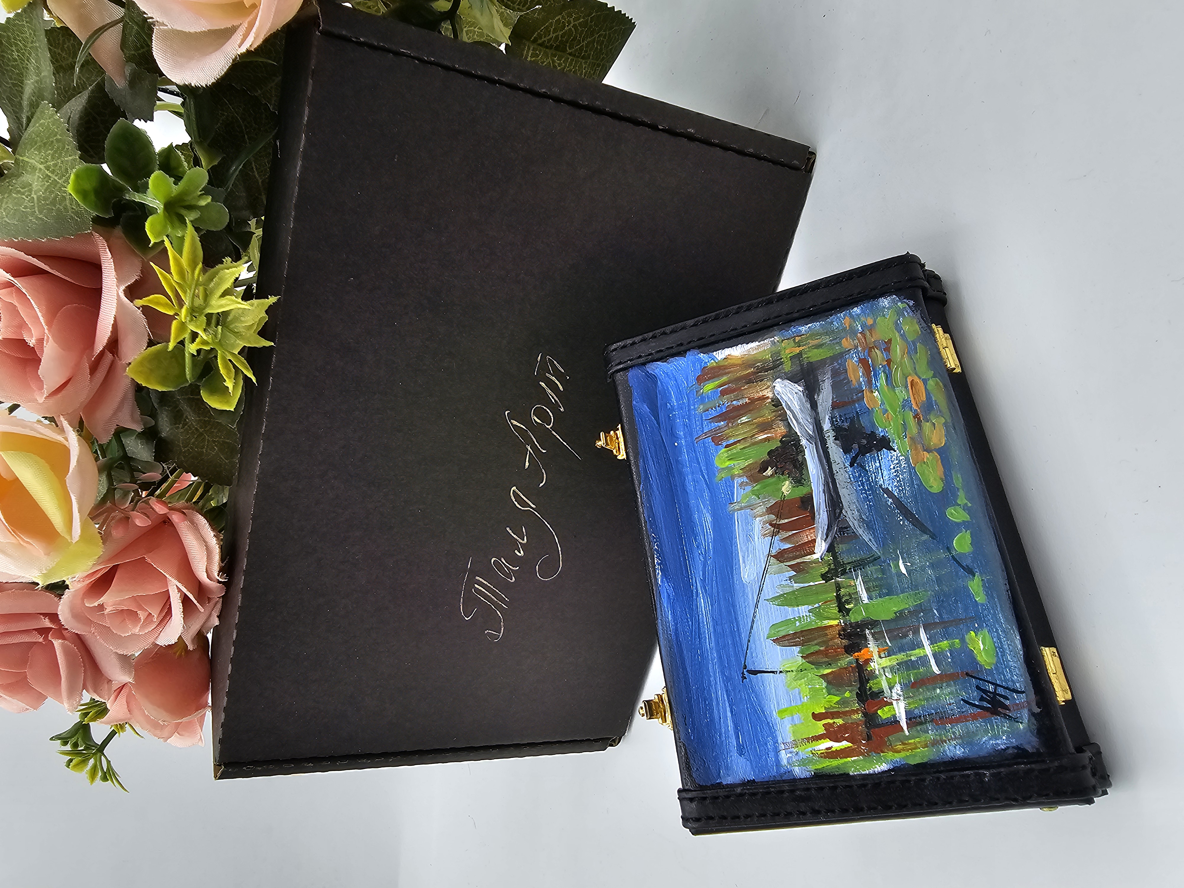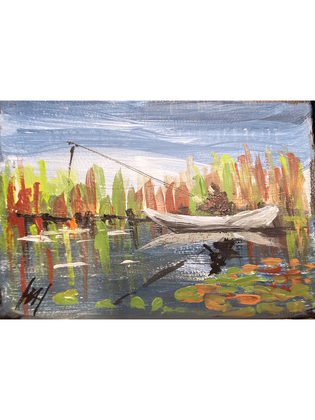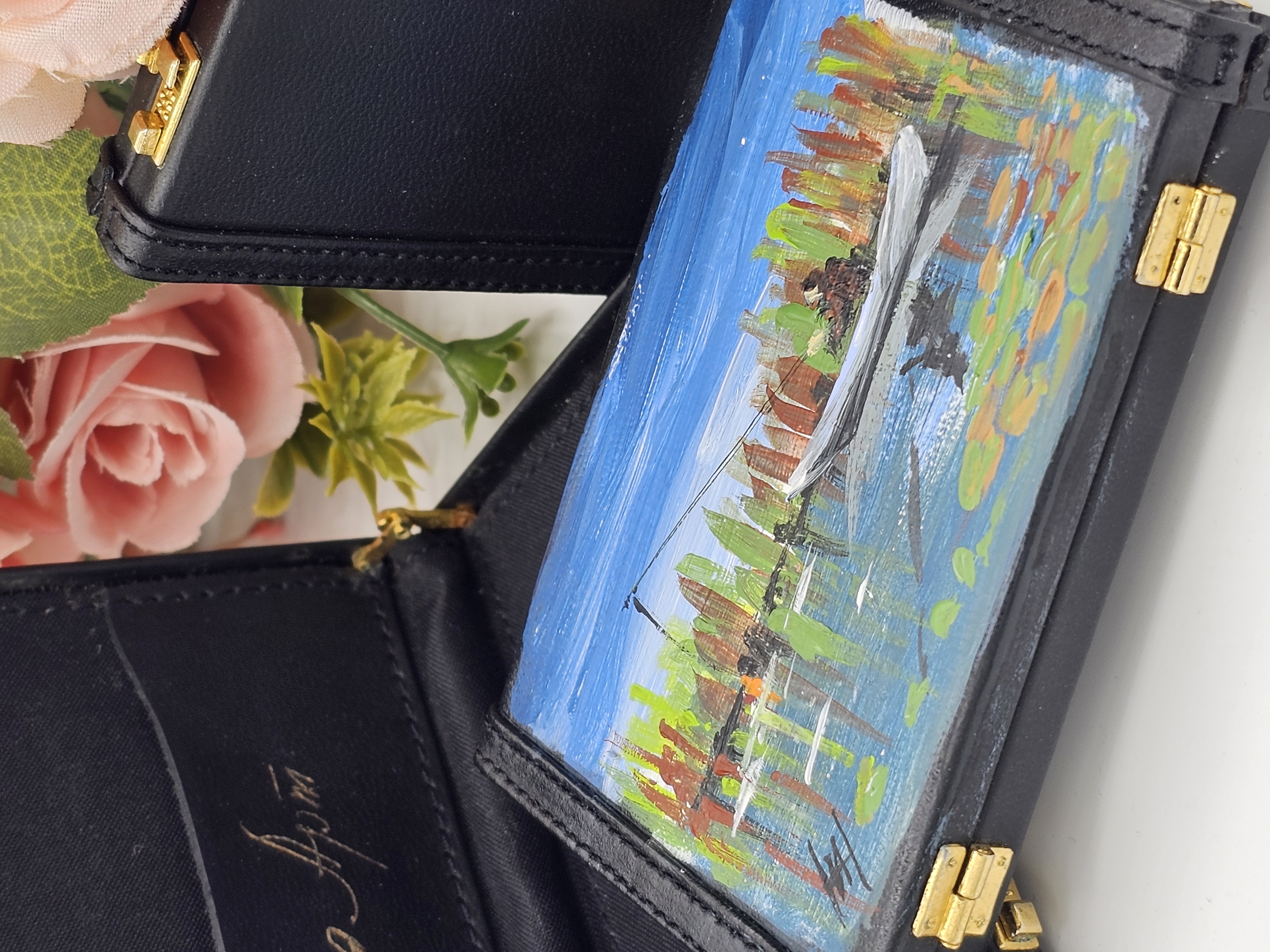 Небольшая визитница в виде кейса, для собственных визиток украшена рисунком, на котором изображена живописная сцена с человеком в лодке на водоёме. Лодка белого цвета, в ней сидит человек с удочкой, занимающийся рыбалкой. Вокруг водоёма растут высокие растения с зелёными и красными листьями, которые отражаются в воде. Вода спокойная, на её поверхности видны листья кувшинок. Небо ясное, голубое, с лёгкими облаками. Картина выполнена в ярких, насыщенных цветах, создавая атмосферу спокойствия и уединения на природе.