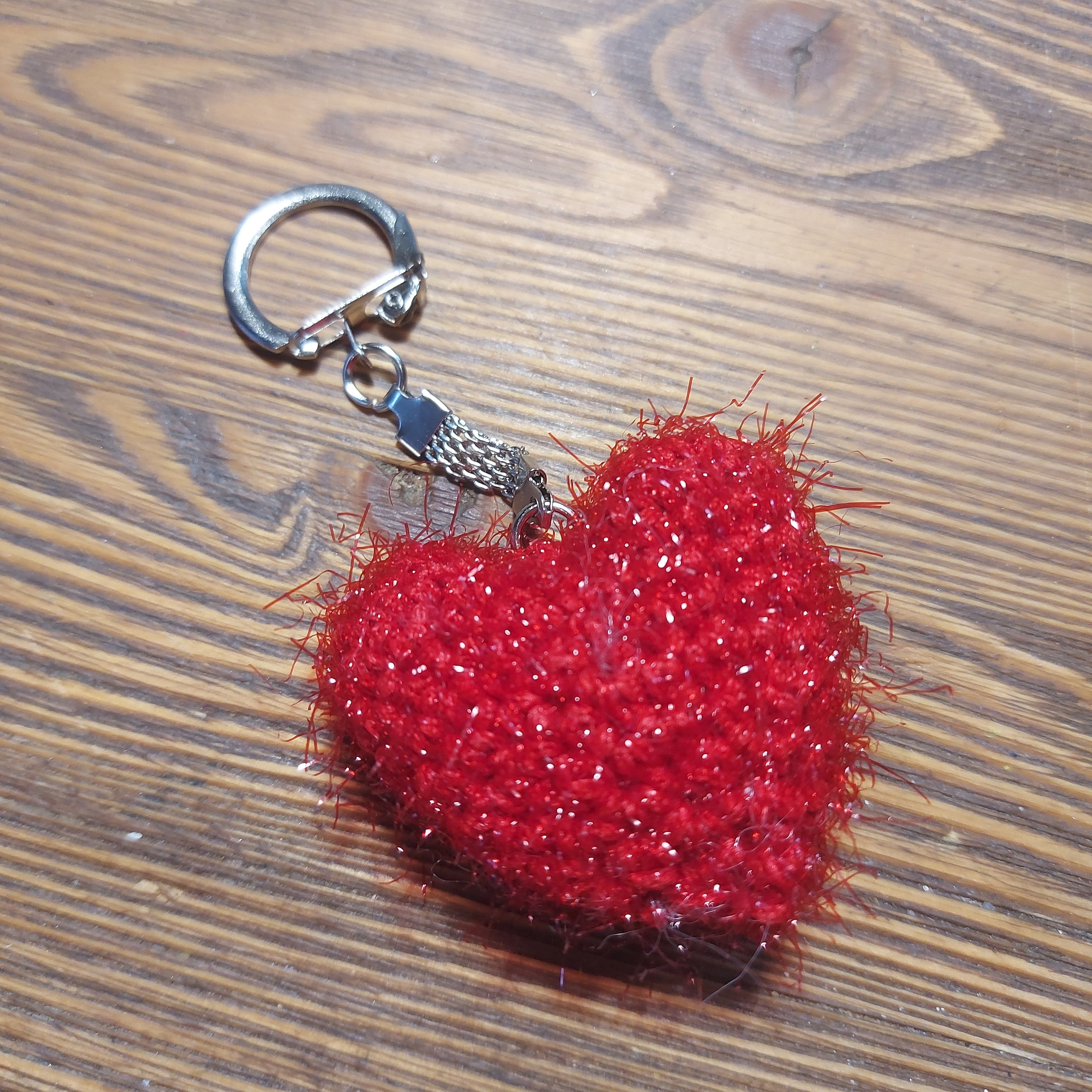Брелок выполнен в виде сердца, связанного крючком вручную. Это придает ему неповторимый и уникальный вид. Это не просто функциональный предмет, но и стильное украшение.